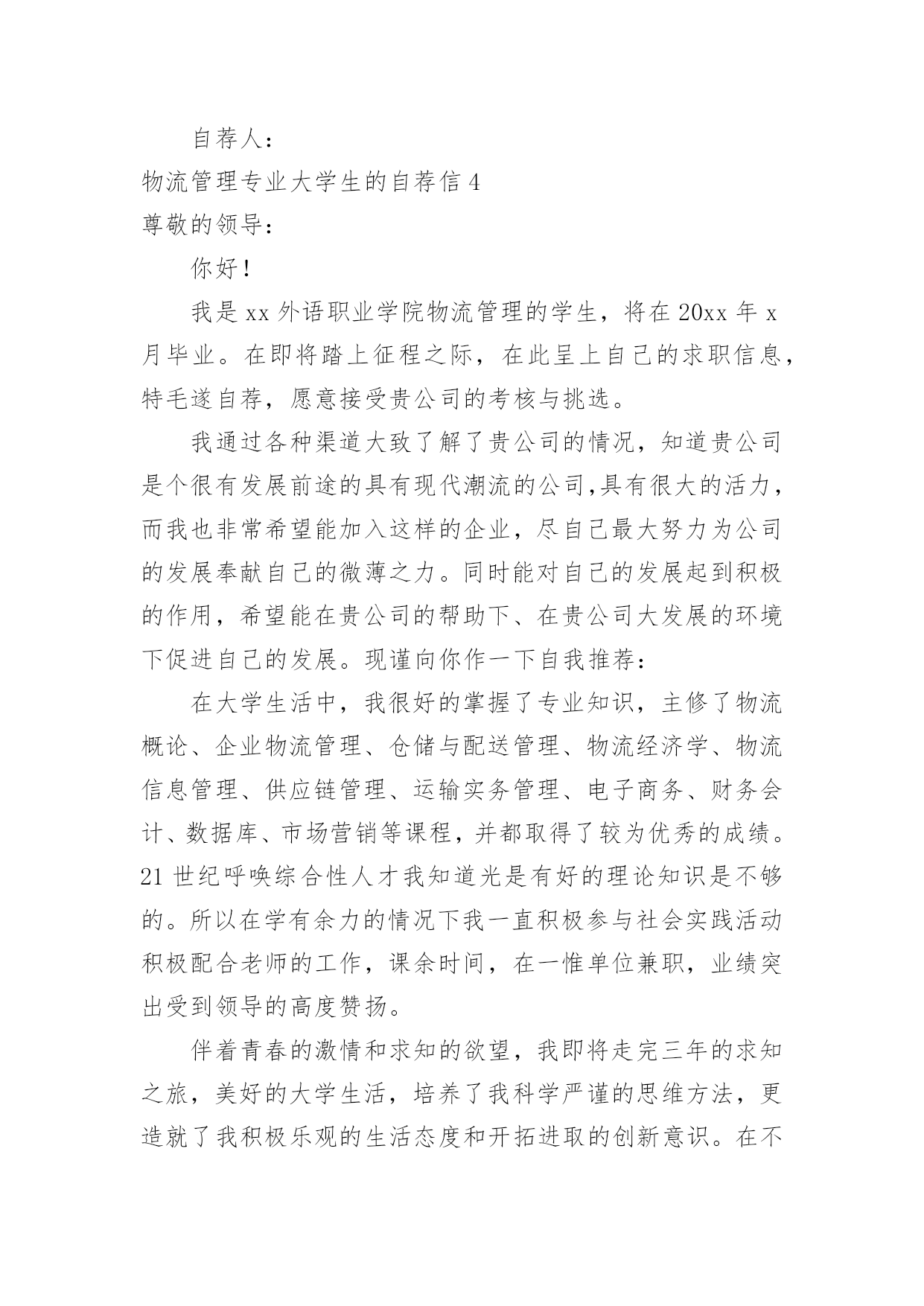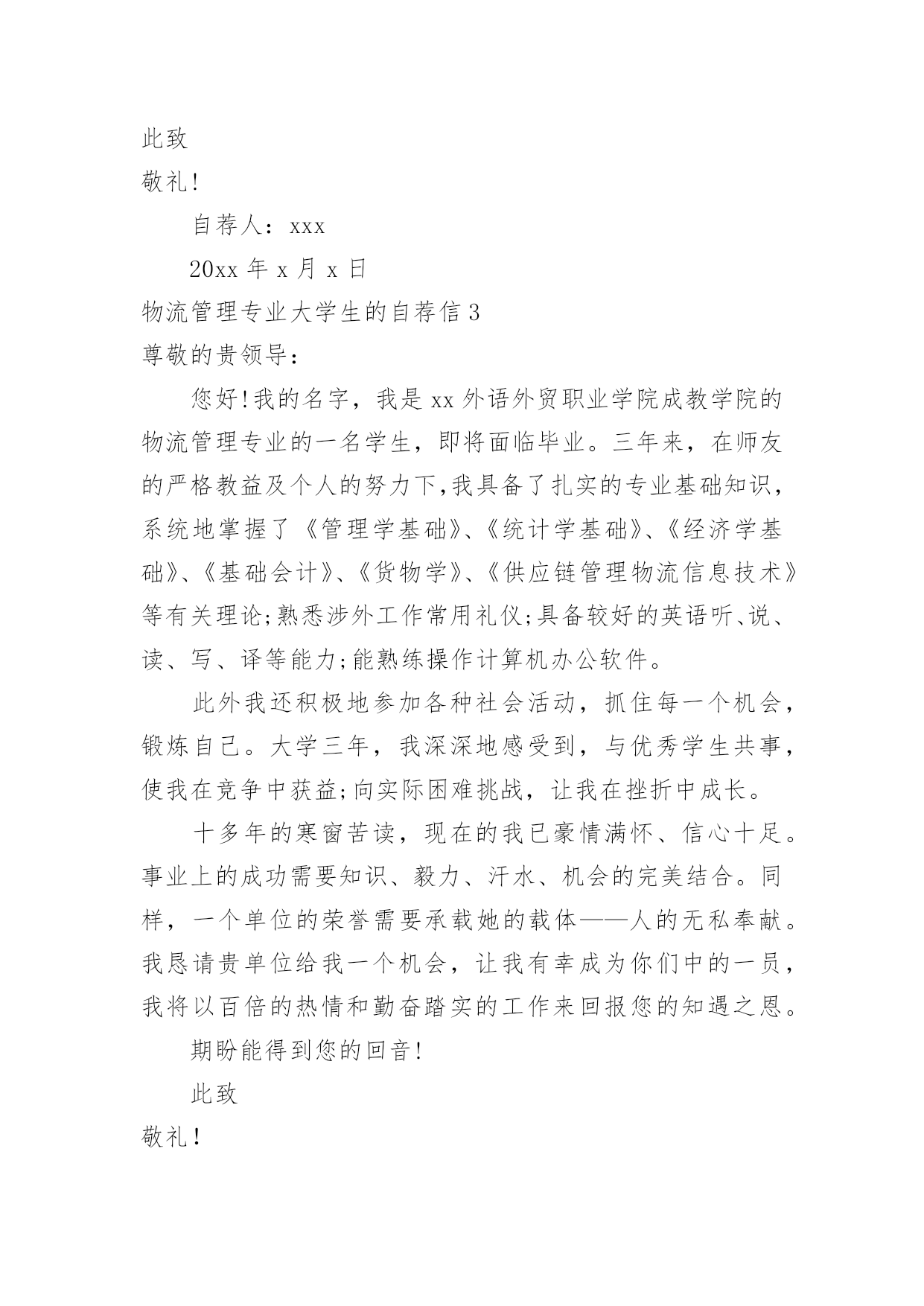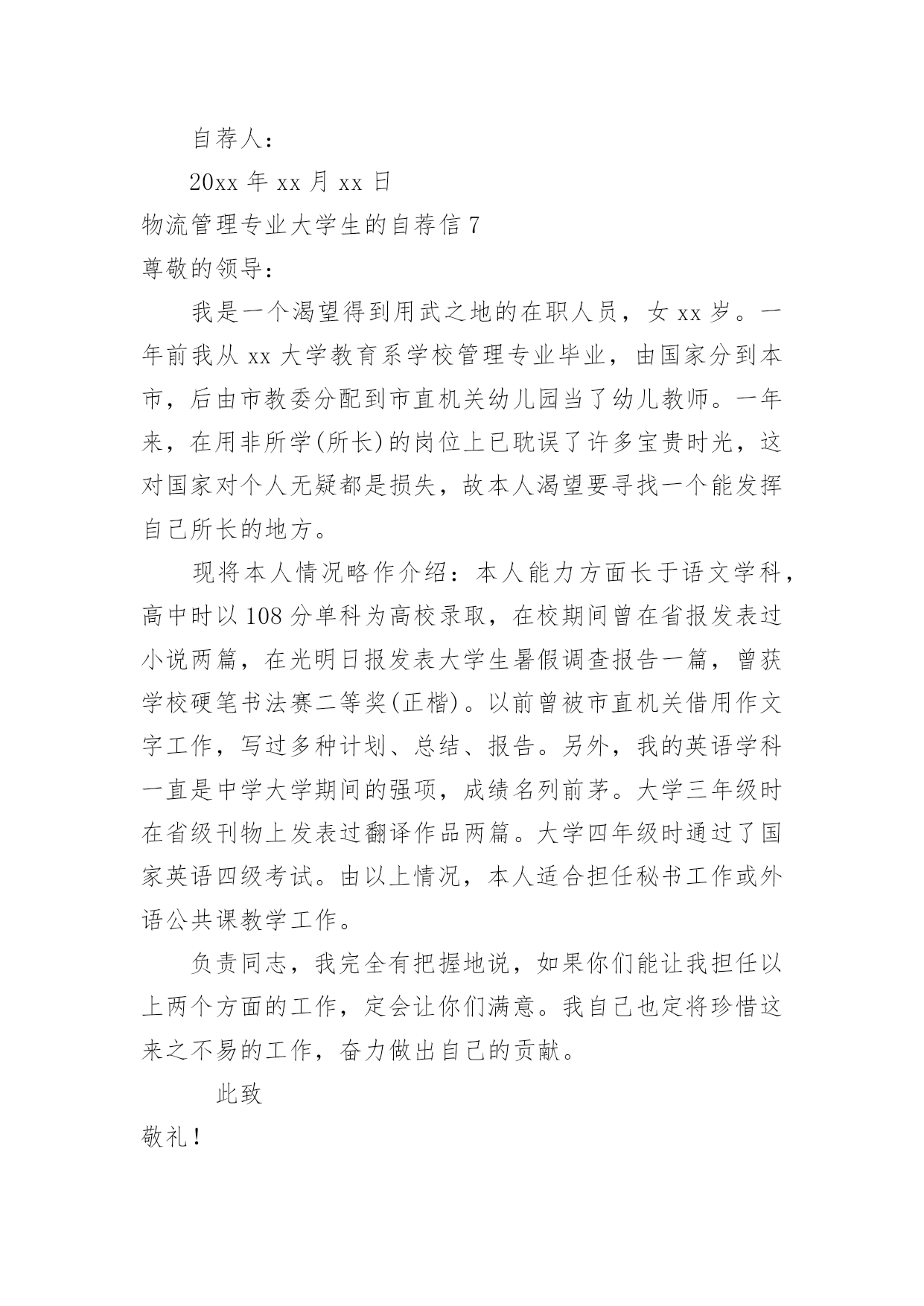 物流管理专业大学生的自荐信物流管理专业大学生的自荐信我们眼下的社会,自荐信出现的次数越来越多,自荐信也有着不同的类型。那么问题来了,自荐信应该怎么写?下面是小编帮大家整理的物流管理专业大学生的自荐信,希望能够帮助到大家。物流管理专业大学生的自荐信1尊敬的领导:您好!首先请允许我向您致以真诚的问候及良好的祝愿,非常感谢您在百忙之中垂读我的自荐信。当您亲手打开这份自荐信的那一刻,也许将会是对我人生的旅程起着决定性的一刻。我叫林玉峰,就读于江西供销商业学校物流管理专业。在校学习期间,我严格要求自己,认真遵守学校各项规章制度,集体观念强。对待学习,态度端正,刻苦努力,提高自身道德修养、行为规范,并且以社会对人才的需求为向导,努力使自己向复合型人才方向发展。在课余时间,学习计算机知识,能熟练操作办公自动化软件,并且努力培训参加了与本专业相关的技能鉴定考试及普通话水平测试,并获得二-级乙等资格证书。在校积极参加学生会,并且担任学生会秘书处秘书长一职。在班上,长期担任本班的团支部书记。具有一定的工作能力及组织协调、领导能力等。具有较强的责任心,能够吃苦耐劳、诚实、自信、敬业。学期在校内实践,培养了我较强的动手能力,我相信,我一定能行!在生活中我不断地锻炼自己,努力提高自己各方面素质和能力水平,为了让自己可以接触到不同层面的人,锻炼自己吃苦耐劳的精神,我曾多次在外做兼职。鲜花和荣誉只能代表过去,未来的社会于我完全是一个陌生的世界,更是一个充满挑战的世界。年轻的我,有的是旺盛的精力和不服输的信念,但却缺乏锻炼自我、展示自我的机会。如果没有您伯乐的眼光,我将无法施展自己所学的知识。因此,我非常希望能够成为贵公司的一员,我将以更大的热情投入到新工作环境中,为公司的发展贡献自己的绵薄之力。“惧怀逸兴思斗志,欲上青天揽日月。”给我一个机会,我还您十分满意!此致敬礼!物流管理专业大学生的自荐信2尊敬的领导:您好!感谢您在百忙之中阅读我的毕业求职自荐书,相信他不会占用你太多的时间的,您的关注将翻开我人生的新的一页。我是一名即将从xx学校药学系毕业的学生。作为一名药学专业的学生,我热爱我的专业,并未其投入巨大的热情和精力。在校期间,我努力的学习基础课,钻研专业知识,系统的学习了药理学、药剂学、药物分析、天然药化、中药学、药事管理等课程,通过学习这些知识,不仅学到了专业知识,增强了综合素质,更重要的事教会了怎么做人,培养了我严谨务实、求索创新的个人素养,为以后的职业需求打下了扎实的基础。英语能力一般,熟练的掌握计算机的一般理论与技术操作。为了使专业知识与实际工作联系紧密,暑假期间曾去医院药房见习了几周,在见习的过程中,我学会了如何发药,盘药,如何与患者交流,理论联系实际,把全心全意为人民服务牢记心中,以礼待人,热情服务,耐心解答问题,在不断的实践中增强自身素质和工作水准,让患者能够用到安全有效,稳定的药品而不断努力。作为一位刚走出校门的大学生,我认为最缺乏的是丰富的社会实践和工作经验,这或许会让您犹豫不决,但我有着青年人的热情和赤诚,希望能在更广阔的天地里展露自己的才能,我不满足于现在的水平,期望在实践中得到增强,我期望加入你们的团队,用我自己的聪明才智,来做好每一份工作,我相信经过自己的努力和奋斗,一定会有所收获。最后我希望贵公司能够聘用我,也祝贵公司蒸蒸日上,百尺竿头,希望各位领导能够对我给予认真考虑,静候您的佳音。此致敬礼!自荐人:xxx20xx年x月x日物流管理专业大学生的自荐信3尊敬的贵领导:您好!我的名字,我是xx外语外贸职业学院成教学院的物流管理专业的一名学生,即将面临毕业。三年来,在师友的严格教益及个人的努力下,我具备了扎实的专业基础知识,系统地掌握了《管理学基础》、《统计学基础》、《经济学基础》、《基础会计》、《货物学》、《供应链管理物流信息技术》等有关理论;熟悉涉外工作常用礼仪;具备较好的英语听、说、读、写、译等能力;能熟练操作计算机办公软件。此外我还积极地参加各种社会活动,抓住每一个机会,锻炼自己。大学三年,我深深地感受到,与优秀学生共事,使我在竞争中获益;向实际困难挑战,让我在挫折中成长。十多年的寒窗苦读,现在的我已豪情满怀、信心十足。事业上的成功需要知识、毅力、汗水、机会的完美结合。同样,一个单位的荣誉需要承载她的载体——人的无私奉献。我恳请贵单位给我一个机会,让我有幸成为你们中的一员,我将以百倍的热情和勤奋踏实的工作来回报您的知遇之恩。期盼能得到您的回音!此致敬礼!自荐人:物流管理专业大学生的自荐信4尊敬的领导:你好!我是xx外语职业学院物流管理的学生,将在20xx年x月毕业。在即将踏上征程之际,在此呈上自己的求职信息,特毛遂自荐,愿意接受贵公司的考核与挑选。我通过各种渠道大致了解了贵公司的情况,知道贵公司是个很有发展前途的具有