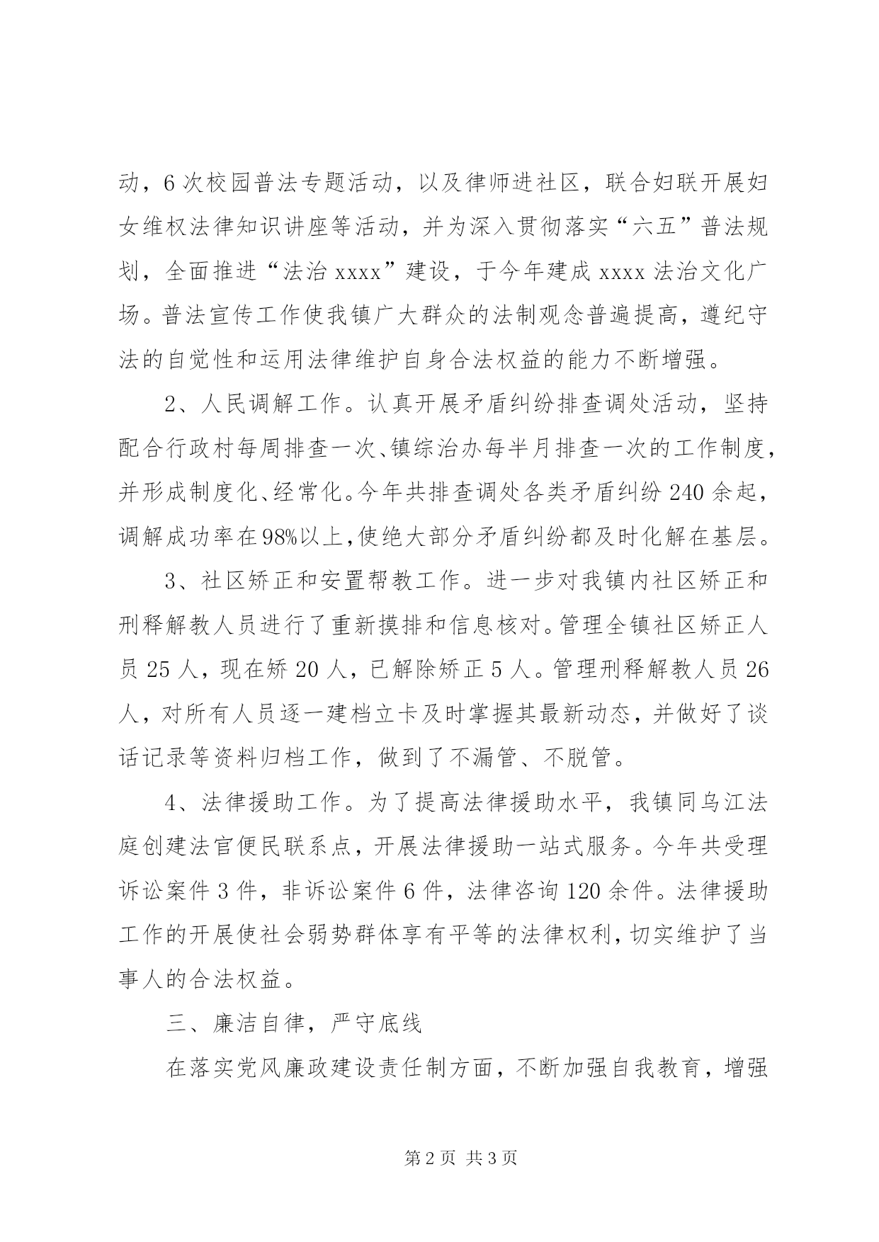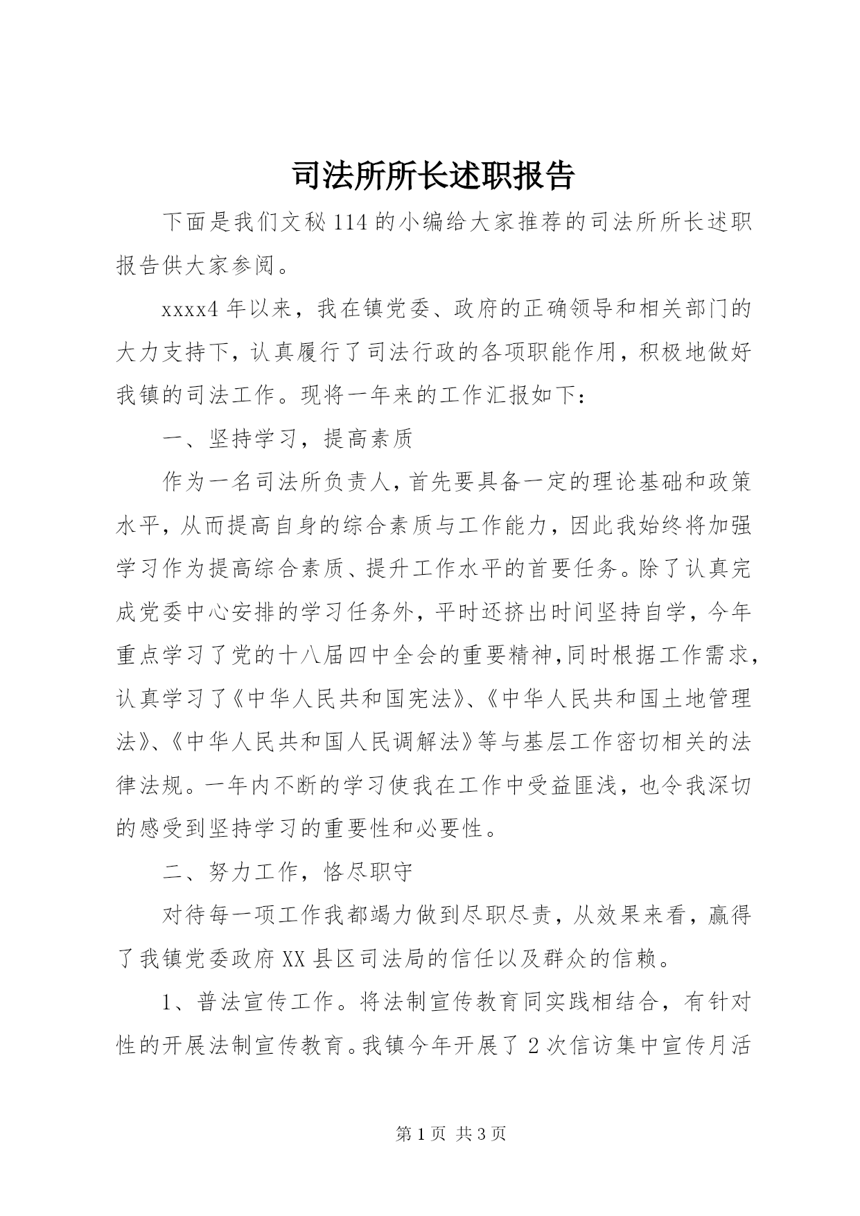 第PAGE\*Arabic\*MERGEFORMAT3页共NUMPAGES\*MERGEFORMAT3页司法所所长述职报告下面是我们文秘114的小编给大家推荐的司法所所长述职报告供大家参阅。xxxx4年以来,我在镇党委、政府的正确领导和相关部门的大力支持下,认真履行了司法行政的各项职能作用,积极地做好我镇的司法工作。现将一年来的工作汇报如下:一、坚持学习,提高素质作为一名司法所负责人,首先要具备一定的理论基础和政策水平,从而提高自身的综合素质与工作能力,因此我始终将加强学习作为提高综合素质、提升工作水平的首要任务。除了认真完成党委中心安排的学习任务外,平时还挤出时间坚持自学,今年重点学习了党的十八届四中全会的重要精神,同时根据工作需求,认真学习了《中华人民共和国宪法》、《中华人民共和国土地管理法》、《中华人民共和国人民调解法》等与基层工作密切相关的法律法规。一年内不断的学习使我在工作中受益匪浅,也令我深切的感受到坚持学习的重要性和必要性。二、努力工作,恪尽职守对待每一项工作我都竭力做到尽职尽责,从效果来看,赢得了我镇党委政府XX县区司法局的信任以及群众的信赖。1、普法宣传工作。将法制宣传教育同实践相结合,有针对性的开展法制宣传教育。我镇今年开展了2次信访集中宣传月活动,6次校园普法专题活动,以及律师进社区,联合妇联开展妇女维权法律知识讲座等活动,并为深入贯彻落实“六五”普法规划,全面推进“法治xxxx”建设,于今年建成xxxx法治文化广场。普法宣传工作使我镇广大群众的法制观念普遍提高,遵纪守法的自觉性和运用法律维护自身合法权益的能力不断增强。2、人民调解工作。认真开展矛盾纠纷排查调处活动,坚持配合行政村每周排查一次、镇综治办每半月排查一次的工作制度,并形成制度化、经常化。今年共排查调处各类矛盾纠纷240余起,调解成功率在98%以上,使绝大部分矛盾纠纷都及时化解在基层。3、社区矫正和安置帮教工作。进一步对我镇内社区矫正和刑释解教人员进行了重新摸排和信息核对。管理全镇社区矫正人员25人,现在矫20人,已解除矫正5人。管理刑释解教人员26人,对所有人员逐一建档立卡及时掌握其最新动态,并做好了谈话记录等资料归档工作,做到了不漏管、不脱管。4、法律援助工作。为了提高法律援助水平,我镇同乌江法庭创建法官便民联系点,开展法律援助一站式服务。今年共受理诉讼案件3件,非诉讼案件6件,法律咨询120余件。法律援助工作的开展使社会弱势群体享有平等的法律权利,切实维护了当事人的合法权益。三、廉洁自律,严守底线在落实党风廉政建设责任制方面,不断加强自我教育,增强自律意识,努力改造主观世界,坚持廉洁从政。认真学习《廉政准则》,时时处处严格要求自己,严守做人、处事道德底线,自觉做到自重、自省、自警、自励。四、存在的问题和今后的努力方向回顾xxxx4年的工作、学习和廉政建设情况,自身还存在一些问题。一是对理论知识学习的不够系统,不够深入。二是应对复杂局面时处理问题的能力仍需提高。针对这些问题,今后我要进一步增强学习的主动性,用科学的理论武装头脑,指导工作,在工作实践中不断提升自己的能力。