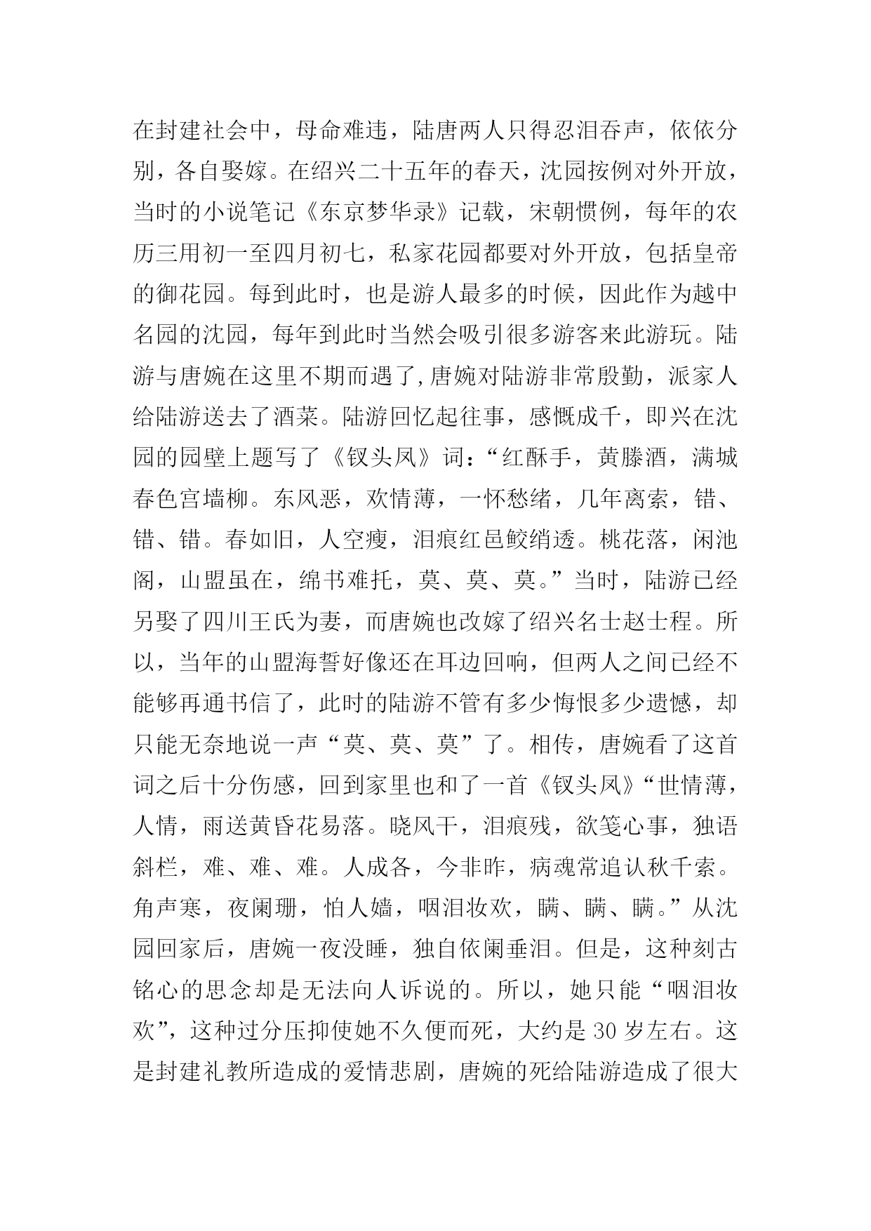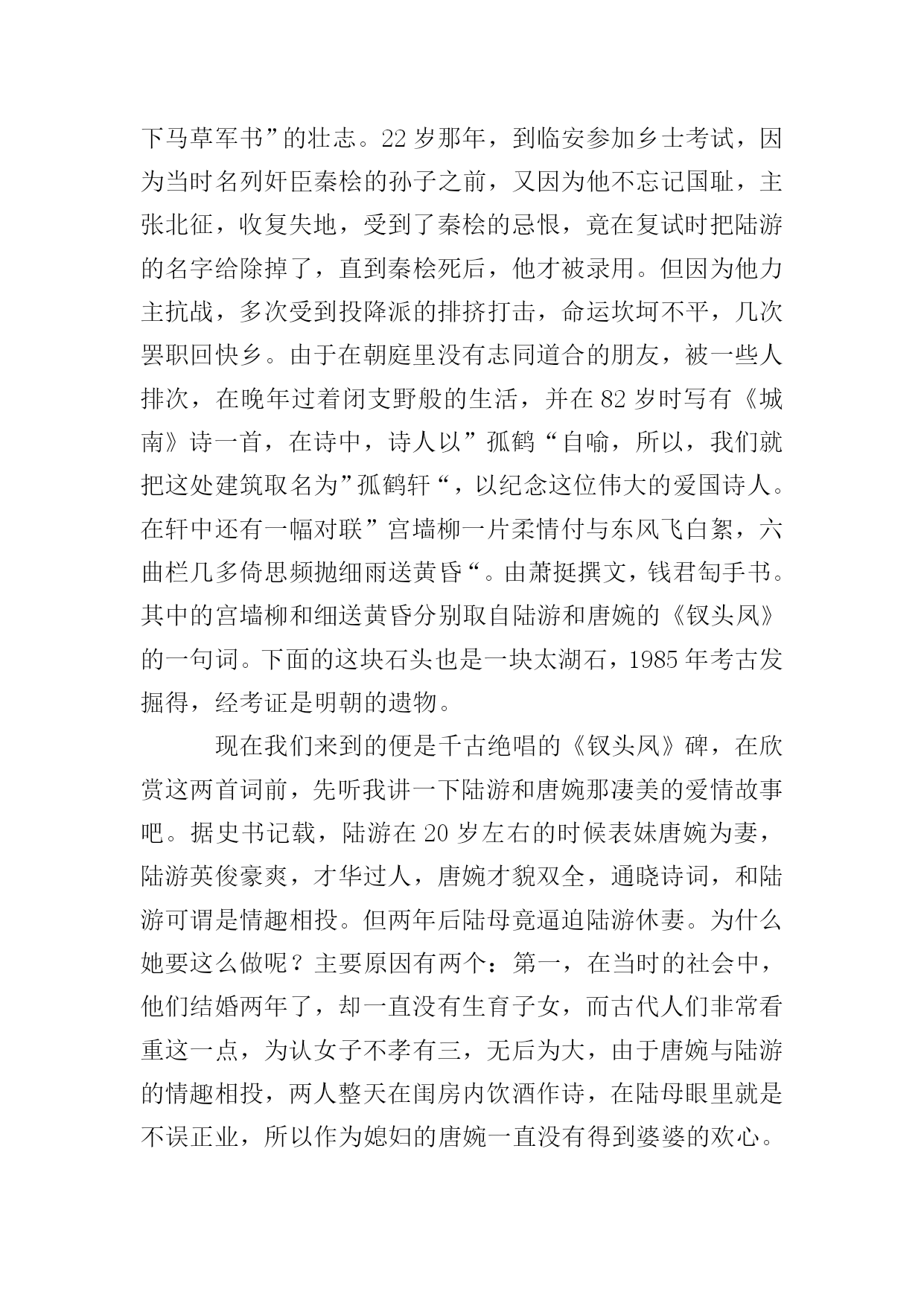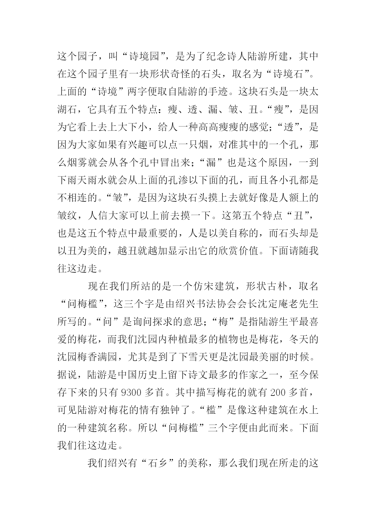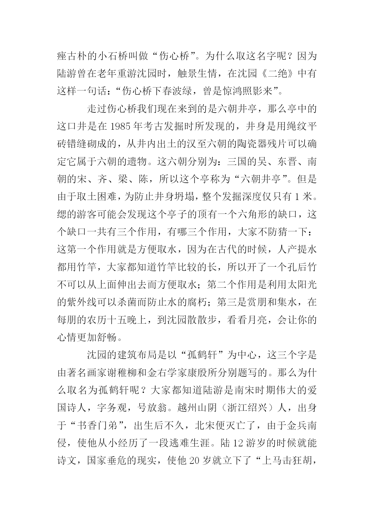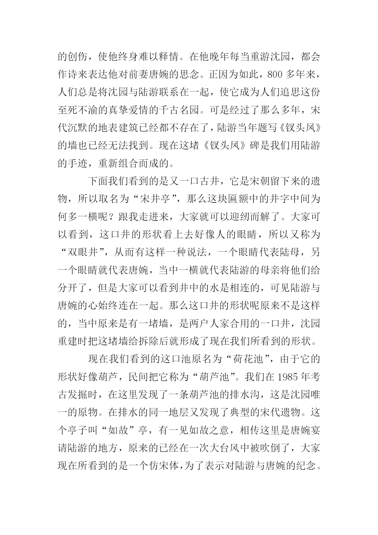 沈园旅游导游词沈园是国家5A级景区,位于绍兴市越城区春波弄,宋代著名园林,沈园至今已有800多年的历史。下面是小编整理的沈园导游词,欢迎阅读参考。沈园在宋朝面积有70多亩,园内景致怡人,是江南著名的私家园林。因为主人家姓沈,而据今也不知道名什么,所以称为“沈氏园”。大家都知道,南方的气候比较的潮湿多雨,而古建筑又大多以木结构为主,所以,在绍兴古建筑所保存的时间也比较短,宋代沈园的建筑早已经不复存在了。1963年沈园被列为浙江省重点文物保护单位。1985年,在浙江省考古所的主持下,绍兴的文物部门对沈园的遗址进行了考古探测,出了不少的六朝、唐、宋、明、清时期的遗物和遗迹,查实了原先沈园的布局和范围。我们结合沈氏后人所提供的清代沈园平面图,精心设计了修复方案。经过1987和1994年的两次扩建,沈园由原来残存的4.6亩扩展到了18.5亩,并恢复了宋代园林建筑。2000年启动了沈园的三期扩建程,使沈园的面积扩展到了57亩。沈园距今有800多年的历史了?为什么沈园历经800年而不衰呢?下面请各位游客带着这个问题,跟我一起参观这个越中的仿宋园林,整个景区由三大部分组成:沈园古迹区、东苑、南苑。下面首先请大家随我参观古迹区。现在大家所看到的这个园子,叫“诗境园”,是为了纪念诗人陆游所建,其中在这个园子里有一块形状奇怪的石头,取名为“诗境石”。上面的“诗境”两字便取自陆游的手迹。这块石头是一块太湖石,它具有五个特点:瘦、透、漏、皱、丑。“瘦”,是因为它看上去上大下小,给人一种高高瘦瘦的感觉;“透”,是因为大家如果有兴趣可以点一只烟,对准其中的一个孔,那么烟雾就会从各个孔中冒出来;“漏”也是这个原因,一到下雨天雨水就会从上面的孔渗以下面的孔,而且各小孔都是不相连的。“皱”,是因为这块石头摸上去就好像是人额上的皱纹,人信大家可以上前去摸一下。这第五个特点“丑”,也是这五个特点中最重要的,人是以美自称的,而石头却是以丑为美的,越丑就越加显示出它的欣赏价值。下面请随我往这边走。现在我们所站的是一个仿宋建筑,形状古朴,取名“问梅槛”,这三个字是由绍兴书法协会会长沈定庵老先生所写的。“问”是询问探求的意思;“梅”是指陆游生平最喜爱的梅花,而我们沈园内种植最多的植物也是梅花,冬天的沈园梅香满园,尤其是到了下雪天更是沈园最美丽的时候。据说,陆游是中国历史上留下诗文最多的作家之一,至今保存下来的只有9300多首。其中描写梅花的就有200多首,可见陆游对梅花的情有独钟了。“槛”是像这种建筑在水上的一种建筑名称。所以“问梅槛”三个字便由此而来。下面我们往这边走。我们绍兴有“石乡”的美称,那么我们现在所走的这痤古朴的小石桥叫做“伤心桥”。为什么取这名字呢?因为陆游曾在老年重游沈园时,触景生情,在沈园《二绝》中有这样一句话:“伤心桥下春波绿,曾是惊鸿照影来”。走过伤心桥我们现在来到的是六朝井亭,那么亭中的这口井是在1985年考古发掘时所发现的,井身是用绳纹平砖错缝砌成的,从井内出土的汉至六朝的陶瓷器残片可以确定它属于六朝的遗物。这六朝分别为:三国的吴、东晋、南朝的宋、齐、梁、陈,所以这个亭称为“六朝井亭”。但是由于取土困难,为防止井身坍塌,整个发掘深度仅只有1米。缌的游客可能会发现这个亭子的顶有一个六角形的缺口,这个缺口一共有三个作用,有哪三个作用,大家不防猜一下:这第一个作用就是方便取水,因为在古代的时候,人产提水都用竹竿,大家都知道竹竿比较的长,所以开了一个孔后竹不可以从上面伸出去而方便取水;第二个作用是利用太阳光的紫外线可以杀菌而防止水的腐朽;第三是赏朋和集水,在每朋的农历十五晚上,到沈园散散步,看看月亮,会让你的心情更加舒畅。沈园的建筑布局是以“孤鹤轩”为中心,这三个字是由著名画家谢稚柳和金右学家康殷所分别题写的。那么为什么取名为孤鹤轩呢?大家都知道陆游是南宋时期伟大的爱国诗人,字务观,号放翁。越州山阴(浙江绍兴)人,出身于“书香门弟”,出生后不久,北宋便灭亡了,由于金兵南侵,使他从小经历了一段逃难生涯。陆12游岁的时候就能诗文,国家垂危的现实,使他20岁就立下了“上马击狂胡,下马草军书”的壮志。22岁那年,到临安参加乡士考试,因为当时名列奸臣秦桧的孙子之前,又因为他不忘记国耻,主张北征,收复失地,受到了秦桧的忌恨,竟在复试时把陆游的名字给除掉了,直到秦桧死后,他才被录用。但因为他力主抗战,多次受到投降派的排挤打击,命运坎坷不平,几次罢职回快乡。由于在朝庭里没有志同道合的朋友,被一些人排次,在晚年过着闭支野般的生活,并在82岁时写有《城南》诗一首,在诗中,诗人以”孤鹤“自喻,所以,我们就把这处建筑取名为”孤鹤轩“,以纪念这位伟大的爱国诗人。在轩中还有一幅对联”宫墙柳一片柔情付与东风飞白絮,六曲栏几多倚思频抛细雨送黄昏“。由