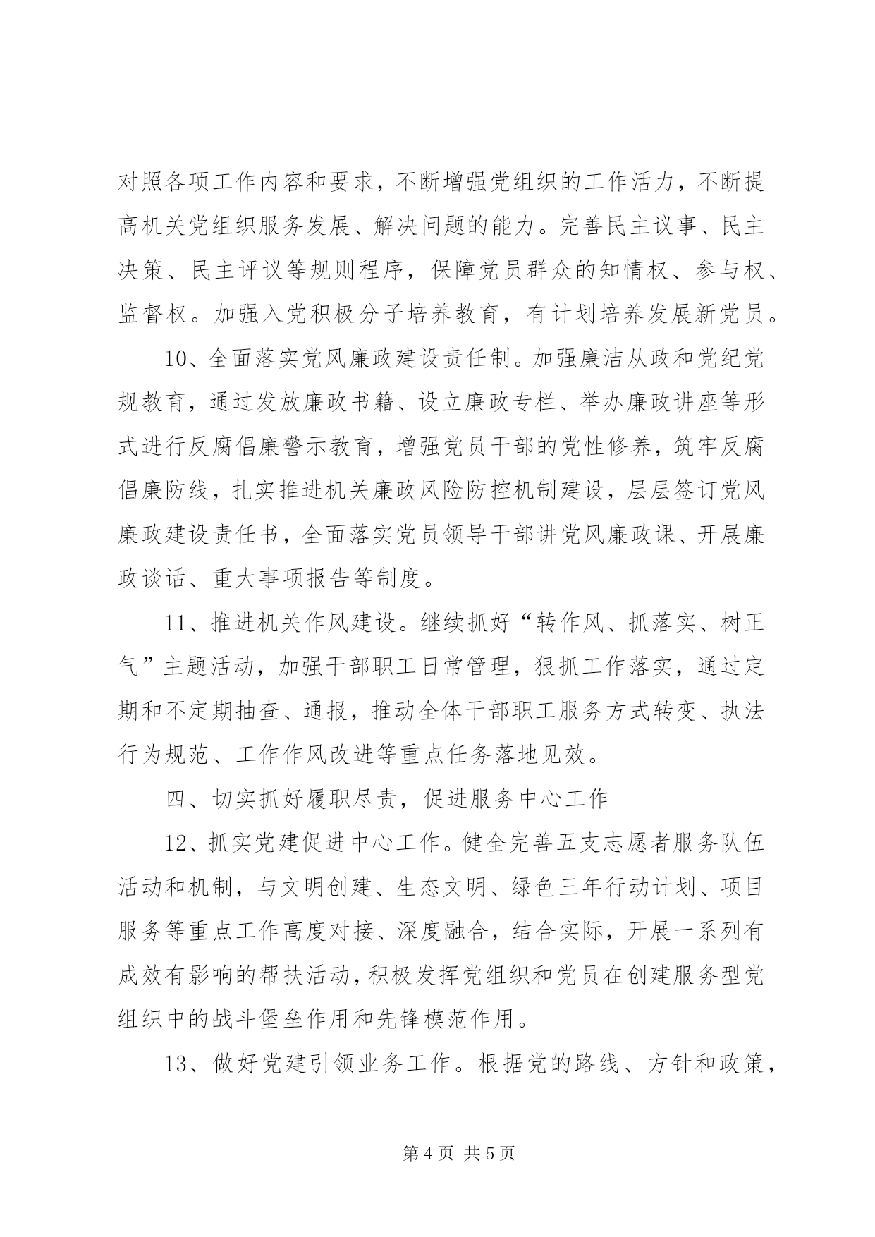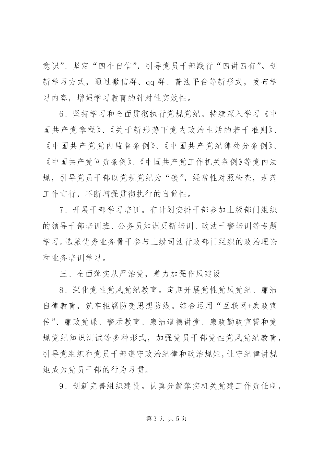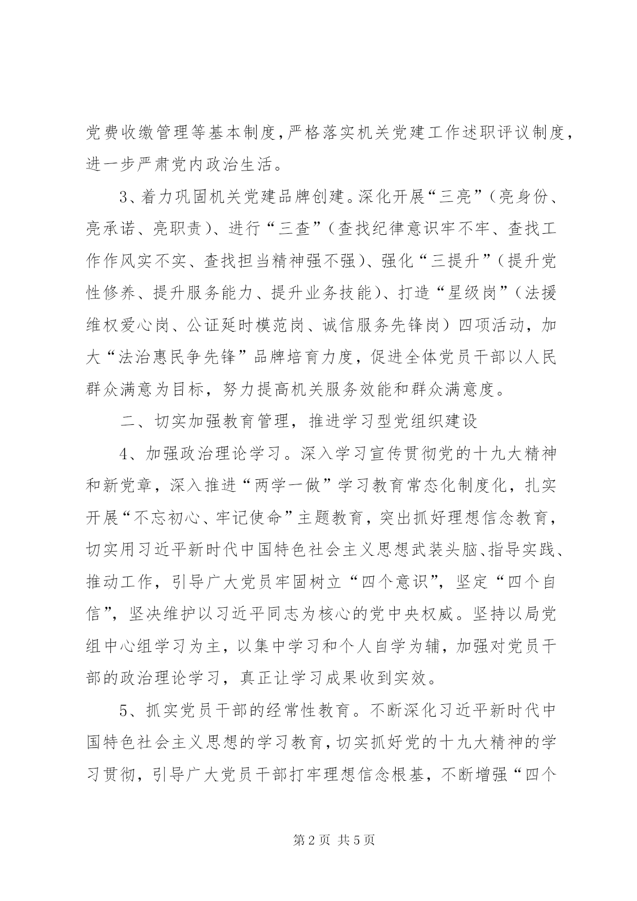 第PAGE\*Arabic\*MERGEFORMAT5页共NUMPAGES\*MERGEFORMAT5页司法局XX年机关党建工作计划2018年,全区司法行政系统基层党建工作的总体要求是:全面贯彻习近平新时代中国特色社会主义思想和党的十九大精神,切实增强“四个意识”,以抓好党的十九大精神的学习贯彻为主线,以落实全面从严治党要求为主题,以“两学一做”学习教育常态化、制度化为抓手,以严肃党内政治生活和强化党内监督为重点,全面提升新形势下基层党建工作水平,为我区司法行政干部队伍建设和司法行政事业发展提供坚强的思想、组织、作风和制度保证。一、建立健全长效机制,推动常态化制度化建设1、构建“两学一做”常态长效机制。以“两学一做”为基本内容,以“三会一课”为基本制度,推动“两学一做”学习教育融入日常、抓在经常。把严格党的组织生活制度作为“两学一做”的重要内容和抓手,认真落实党章、党内政治生活准则、民主生活会、民主评议党员、谈心谈话等制度。全面推行党支部工作纪实、支部书记“双述双评”、支部主题党日和五星级党员积分管理工作。2、强化制度建设。引导广大党员干部牢记政治使命和政治责任,严守党的六大纪律特别是政治纪律,确保党员干部始终保持政治上的清醒和坚定。修订完善并全面落实“三会一课”、组织生活会、民主生活会、民主评议党员、谈心谈话、主题党日、党费收缴管理等基本制度,严格落实机关党建工作述职评议制度,进一步严肃党内政治生活。3、着力巩固机关党建品牌创建。深化开展“三亮”(亮身份、亮承诺、亮职责)、进行“三查”(查找纪律意识牢不牢、查找工作作风实不实、查找担当精神强不强)、强化“三提升”(提升党性修养、提升服务能力、提升业务技能)、打造“星级岗”(法援维权爱心岗、公证延时模范岗、诚信服务先锋岗)四项活动,加大“法治惠民争先锋”品牌培育力度,促进全体党员干部以人民群众满意为目标,努力提高机关服务效能和群众满意度。二、切实加强教育管理,推进学习型党组织建设4、加强政治理论学习。深入学习宣传贯彻党的十九大精神和新党章,深入推进“两学一做”学习教育常态化制度化,扎实开展“不忘初心、牢记使命”主题教育,突出抓好理想信念教育,切实用习近平新时代中国特色社会主义思想武装头脑、指导实践、推动工作,引导广大党员牢固树立“四个意识”,坚定“四个自信”,坚决维护以习近平同志为核心的党中央权威。坚持以局党组中心组学习为主,以集中学习和个人自学为辅,加强对党员干部的政治理论学习,真正让学习成果收到实效。5、抓实党员干部的经常性教育。不断深化习近平新时代中国特色社会主义思想的学习教育,切实抓好党的十九大精神的学习贯彻,引导广大党员干部打牢理想信念根基,不断增强“四个意识”、坚定“四个自信”,引导党员干部践行“四讲四有”。创新学习方式,通过微信群、qq群、普法平台等新形式,发布学习内容,增强学习教育的针对性实效性。6、坚持学习和全面贯彻执行党规党纪。持续深入学习《中国共产党章程》、《关于新形势下党内政治生活的若干准则》、《中国共产党党内监督条例》、《中国共产党纪律处分条例》、《中国共产党问责条例》、《中国共产党工作机关条例》等党内法规,引导党员干部以党规党纪为“镜”,经常性对照检查,规范工作言行,不断增强贯彻执行的自觉性。7、开展干部学习培训。有计划安排干部参加上级部门组织的领导干部培训班、公务员知识更新培训、政法干警培训等专题学习。选派优秀业务骨干参与上级司法行政部门组织的政治理论和业务培训学习。三、全面落实从严治党,着力加强作风建设8、深化党性党风党纪教育。定期开展党性党风党纪、廉洁自律教育,筑牢拒腐防变思想防线。综合运用“互联网+廉政宣传”、廉政党课、警示教育、廉洁道德讲堂、廉政勤政宣誓和党规党纪知识测试等多种形式,加强党员干部党性党风党纪教育,引导党组织和党员干部遵守政治纪律和政治规矩,让守纪律讲规矩成为党员干部的行为习惯。9、创新完善组织建设。认真分解落实机关党建工作责任制,对照各项工作内容和要求,不断增强党组织的工作活力,不断提高机关党组织服务发展、解决问题的能力。完善民主议事、民主决策、民主评议等规则程序,保障党员群众的知情权、参与权、监督权。加强入党积极分子培养教育,有计划培养发展新党员。10、全面落实党风廉政建设责任制。加强廉洁从政和党纪党规教育,通过发放廉政书籍、设立廉政专栏、举办廉政讲座等形式进行反腐倡廉警示教育,增强党员干部的党性修养,筑牢反腐倡廉防线,扎实推进机关廉政风险防控机制建设,层层签订党风廉政建设责任书,全面落实党员领导干部讲党风廉政课、开展廉政谈话、重大事项报告等制度。11、推进机关作风建设。继续抓好“转作风、抓落实、树正气”主题活动,加强干部职工日常管理,狠抓工作落实,通过定期和不定期抽查、通报,推动全体干部职工服务