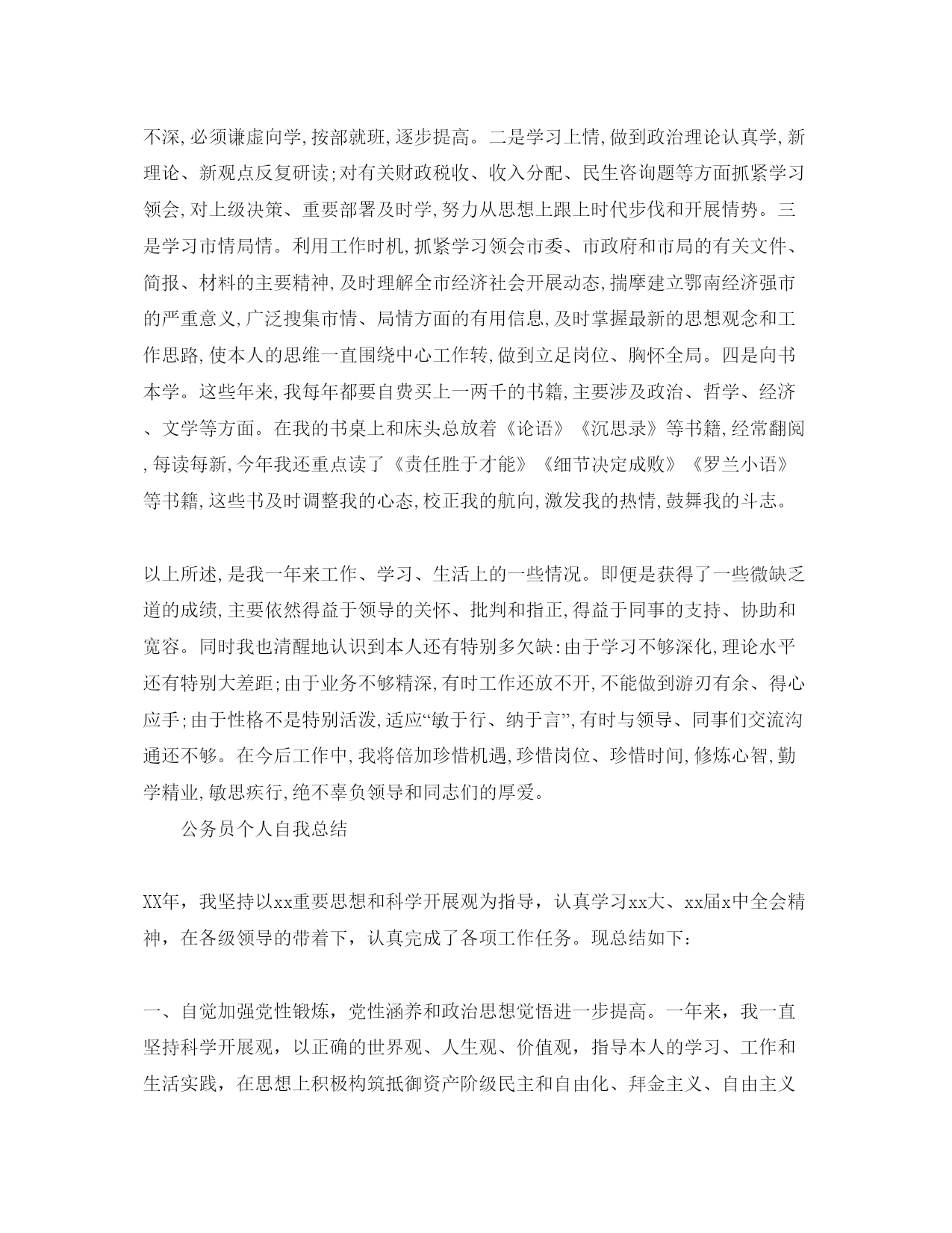 公务员个人自我参考总结公务员个人自我总结承蒙领导的关怀、教导,得益同事们的支持、协助,使我在思想上经受了考验,在工作上获得了进步,在生活上得到了磨砺。现将一年来的工作、学习、生活情况报告如下:一、调整心态,克服困难,融入新的环境。今年5月初接到市局调令时,相隔去年5月完毕上挂回通城上班正好一年时间,感受比拟忽然。由于有过两年多的借调和上挂经历,感遭到了市局办公室工作的压力,体会到了两地生活奔波劳碌的艰苦,想到乡下年迈多病的父母无人照顾,看着既要上班又要照顾小孩而常年劳累的妻子,望着年幼可爱还在上幼儿园的儿子,不由得产生畏难情绪。就在我左右为难的时候,有关领导谦虚诚意地告诫我,同事好友真心真意地鼓舞我,妻子毫不犹豫地支持我,使我特别快放下思想上的包袱和生活上的顾虑,接受了新的挑战,融入了新的环境。为了正确处理工作与生活的关系,我经常告诫本人不能贪图安逸温馨的家庭生活,不让家庭生活上的困难妨碍工作,要不断提高本人的心理承受才能,把对家人的牵挂化作勤勉工作的动力。节假日在家时妥当安排各种事务,尽到本人的责任、义务和孝心;工作的时候,全心全意、聚精会神地工作。父母、妻儿生了病,我特别少及时赶过去照顾他们。9月初,儿子生病在武汉住院做手术,我没有请一天假,而是利用双休日照看小孩后就匆匆赶到单位上班。我体会到:人的一生总要遇到特别多困难,唯有保持一种积极进取的姿势,遇到困难不退缩,迎难而上,才能得到磨砺和考验,提高生活的智慧和人生的境地。如今想来,我特别感激组织的安排和领导的信任,让我得到了磨练和洗礼,使我对工作、生活和人生有了更深的考虑和更多的领悟。二、珍惜岗位,恪尽职守,做好本职工作。市局是全市地税系统的指挥机关,市局办公室又是机关运转的枢纽,工作视野、要求、方法、强度与基层相比,有特别大差异。尽管我在办公室工作了近十年时间,也有在市局上挂的经历,但在不断开展变化的情势下,感遭到个人在思想理念、理论素养、行为方法等方面仍存在较大的差距。为此,我从头做起,充分发挥本人的主观能动性,认真负责地对待每一项工作。一是呕心沥血抓文秘。我紧紧围绕市局的中心工作,按照领导要求,全心投入,埋头苦干,加班加点,认真起草了各类领导讲话稿、工作总结、情况汇报、调研文章等综合文稿30多篇近20万字,多数文稿得到了领导和同志们的确信,其中为局领导起草的一篇文稿被《办公室业务》采纳。二是竭诚效劳抓综合。按照领导安排,配合做好各种重要会议的会务工作,认真起草各类会议材料;11月份参加了在温泉召开的全省离退休干部座谈会,会后及时撰写会议综述和会议信息,整理省局主要领导的讲话稿,被省局内部信息刊物采纳;坚持列席市局局长办公会和局务会议、参加办公室例会,会上认真做好记录,会后及时整理编写纪要,编发《局长办公会议纪要》《局务会议纪要》《办公室会议纪要》10多期,确保了上情下达。三是务务实效抓督办。在建立完善工作督办考核体系上进展了考虑和探究,对全市地税工作责任进展了细化分解,修定《督办工作规程》,起草《市局工作考核评估治理方法》和年度工作目的考核细则,促进了督办考核工作的顺利开展;按月搜集各科室工作情况,按季度搜集各单位工作小结,及时编发《工作通报》,确保了下情上达;在抓好日常工作督办的根底上,加大了网上督办力度,对局长办公会、局务会安排以及领导交办的工作事项,及时在内网发布,提高了督办工作的效率。通过有效的办文、办会和督办工作,促进了机关工作的标准、高效运转。四是潜心学习抓调研。在办公室主任的带着下,先后赴咸安、赤壁、通山、通城等地调研,与基层单位代表座谈,广泛听取他们介绍纳税效劳、税收征管、效能建立、行政执法等方面的实践经历,征求基层单位对做好今后工作的意见和建议。通过深化调查研究,搜集了大量鲜活的第一手材料,在起草内部参阅效劳领导决策的同时,为撰写工作总结、工作思路提供了可靠根据。五是积极配合抓协调,及时完成了领导交办的其他工作。另外,今年前4个月我在通城工作期间,负责政策法规股的工作,坚持统筹安排,在带头抓好业务学习的同时,认真督导基层分局落实各项税收政策,协助分管领导及时协调与保险、残联、水利、环保等部门的关系,较好地标准了车船税保险代收和残保金、水资源、排污费的代征工作;组织启动了标准执法年活动,严把税收执法监视关口,不断标准税收执法行为;在做好本职工作同时,服从县局领导安排,参与起草了多项重要文件和材料。一年来,通过经常与各级领导接触,与基层的同志们打交道,我感遭到了领导严谨的工作作风,理解到了一些基层同志的真知灼见,体会到了许多基层干部的真情实感,让我遭到了深深教育和感染,我唯有见贤思齐,以能者为师,不断学习如何站在全局角度考虑咨询题、如何站在更高层次谋篇规划、如何开展深层次调研的方法,才能不断修正错误、取长补短、开阔思路、提高自我。