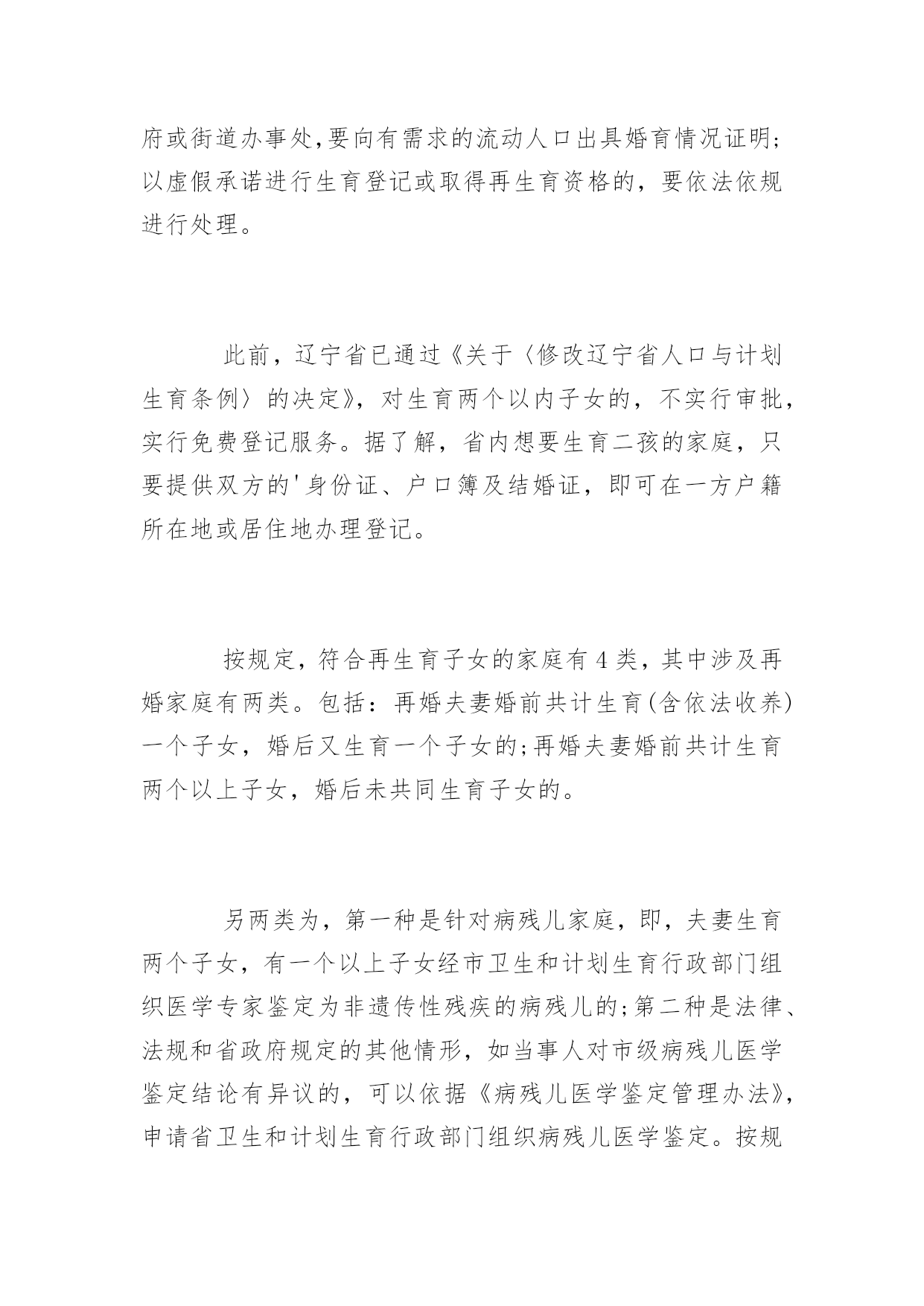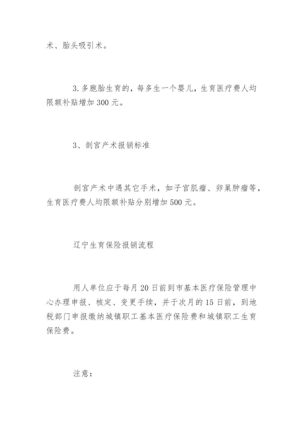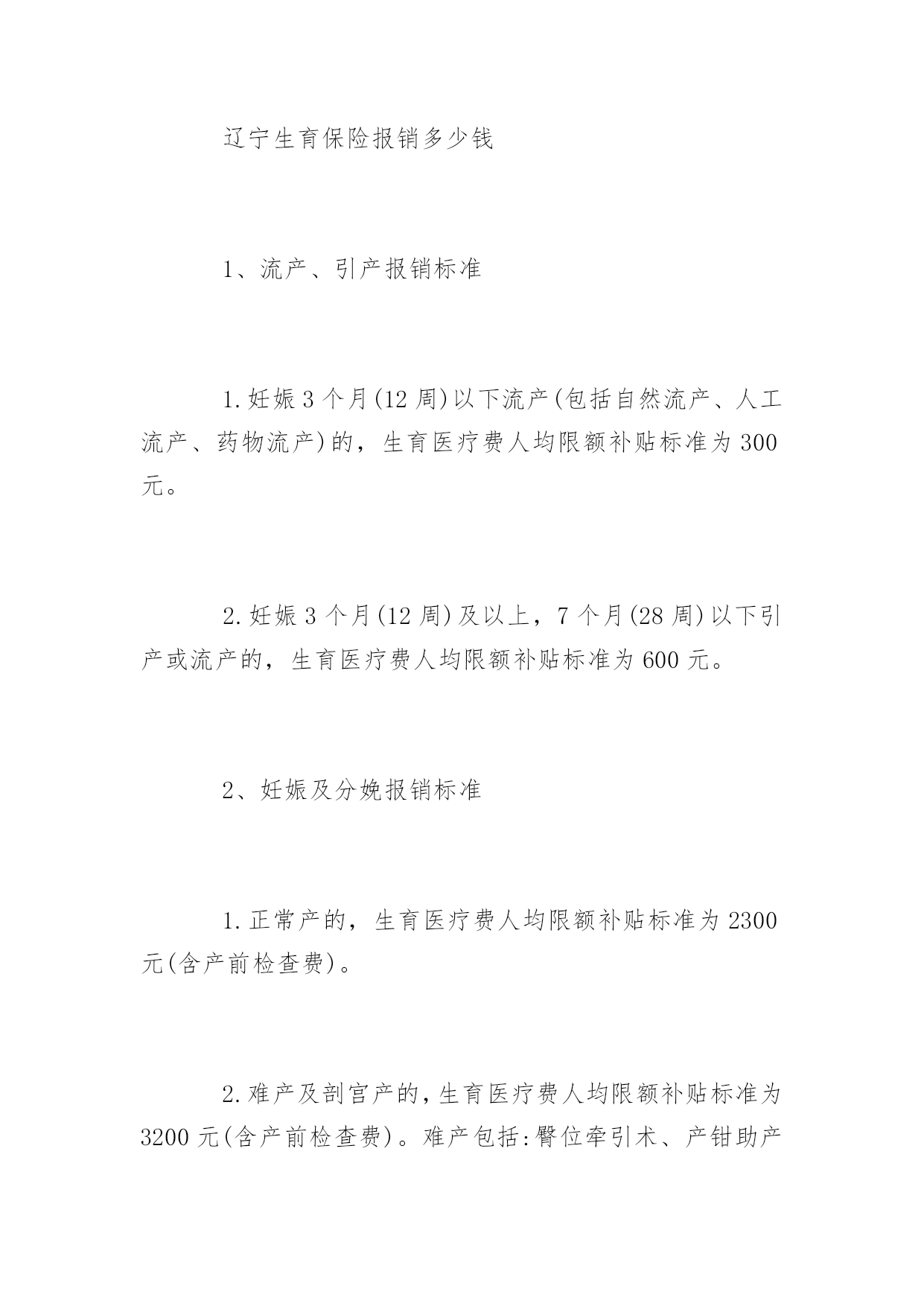 辽宁省生育保险报销条件辽宁省生育保险报销条件生育保险的报销需要满足一定的条件,那么辽宁省生育保险报销的条件是怎样的呢?今天我们就一起来看看相关内容吧!辽宁省生育保险报销条件1、生育或施行计划生育手术时的所在单位按照规定参加并履行了缴费义务,且为其缴纳生育保险费累计满3个月的企业职工。2、生育或施行计划生育手术符合国家计划生育政策的职工。3、以上条件须同时具备。辽宁生育保险报销多少钱1、流产、引产报销标准1.妊娠3个月(12周)以下流产(包括自然流产、人工流产、药物流产)的,生育医疗费人均限额补贴标准为300元。2.妊娠3个月(12周)及以上,7个月(28周)以下引产或流产的,生育医疗费人均限额补贴标准为600元。2、妊娠及分娩报销标准1.正常产的,生育医疗费人均限额补贴标准为2300元(含产前检查费)。2.难产及剖宫产的,生育医疗费人均限额补贴标准为3200元(含产前检查费)。难产包括:臀位牵引术、产钳助产术、胎头吸引术。3.多胞胎生育的,每多生一个婴儿,生育医疗费人均限额补贴增加300元。3、剖宫产术报销标准剖宫产术中遇其它手术,如子宫肌瘤、卵巢肿瘤等,生育医疗费人均限额补贴分别增加500元。辽宁生育保险报销流程用人单位应于每月20日前到市基本医疗保险管理中心办理申报、核定、变更手续,并于次月的15日前,到地税部门申报缴纳城镇职工基本医疗保险费和城镇职工生育保险费。注意:1.新建单位在批准成立或取得营业执照后30日内,到市基本医疗保险管理中心办理参保登记和申报核定手续。2.用人单位不按规定缴纳生育保险费的,生育保险经办机构从次月起停止该单位参保人员的生育保险待遇(同时停止该单位参保人员的基本医疗保险待遇),并由地方税务机关责令限期缴纳;逾期仍不缴纳的,除补缴欠缴数额外,从欠缴之日起,按日加收2‰的滞纳金。3.沈阳市生育保险采取与基本医疗保险捆绑缴费的方式,在申报核定工作方面与基本医疗保险保持一致,参保单位在办理基本医疗保险各项业务的同时生育保险的各项业务也随之变动,参保单位不用另行办理。办理费用:免费办理时限:30天延伸阅读:辽宁省生育登记和再生育审批的有关规定对个人婚育情况一时难以核实的,15个工作日办结。5月12日,记者从省卫计委获悉,《辽宁省生育登记服务和再生育审批的有关规定》经向社会公开征求意见后近日正式印发。按规定,家庭生育二孩只需要申请登记不再进行审批。相关负责人表示,办理一孩或二孩生育登记服务,材料齐全,且符合要求的,即时办结;个人婚育情况一时难以核实的,15个工作日完成信息审核并办结。据了解,《辽宁省生育登记服务和再生育审批的有关规定》明确了登记对象、登记时限、登记内容、登记方式、登记材料和登记程序。同时,规定提出了实行首接责任制、提供免费代理服务、实行限时办结、实行一次性告知等便民措施。按规定,受理流动人口生育登记的乡镇人民政府或街道办事处,要向其户籍地反馈登记信息;户籍地乡镇人民政府或街道办事处,要向有需求的流动人口出具婚育情况证明;以虚假承诺进行生育登记或取得再生育资格的,要依法依规进行处理。此前,辽宁省已通过《关于〈修改辽宁省人口与计划生育条例〉的决定》,对生育两个以内子女的,不实行审批,实行免费登记服务。据了解,省内想要生育二孩的家庭,只要提供双方的'身份证、户口簿及结婚证,即可在一方户籍所在地或居住地办理登记。按规定,符合再生育子女的家庭有4类,其中涉及再婚家庭有两类。包括:再婚夫妻婚前共计生育(含依法收养)一个子女,婚后又生育一个子女的;再婚夫妻婚前共计生育两个以上子女,婚后未共同生育子女的。另两类为,第一种是针对病残儿家庭,即,夫妻生育两个子女,有一个以上子女经市卫生和计划生育行政部门组织医学专家鉴定为非遗传性残疾的病残儿的;第二种是法律、法规和省政府规定的其他情形,如当事人对市级病残儿医学鉴定结论有异议的,可以依据《病残儿医学鉴定管理办法》,申请省卫生和计划生育行政部门组织病残儿医学鉴定。按规定,依法收养的孤儿、残疾儿、弃婴不计算为生育子女数,而送养的子女计算为生育子女数。生育保险是国家通过立法,在怀孕和分娩的妇女劳动者暂时中断劳动时,由国家和社会提供医疗服务、生育津贴和产假的一种社会保险制度,国家或社会对生育的职工给予必要的经济补偿和医疗保健的社会保险制度。我国生育保险待遇主要包括两项。一是生育津贴,二是生育医疗待遇。人社部《生育保险办法(征求意见稿)》从2012年11月20日起面向社会公开征求意见。意见稿明确,生育险待遇将不再限户籍,单位不缴生育险须掏生育费。生育保险是通过国家立法规定,在劳动者因生育子女而导致劳动力暂时中断时,由国家和社会及时给予物质帮助的一项社会保险制度。我国生育保险待遇主要包括两项。