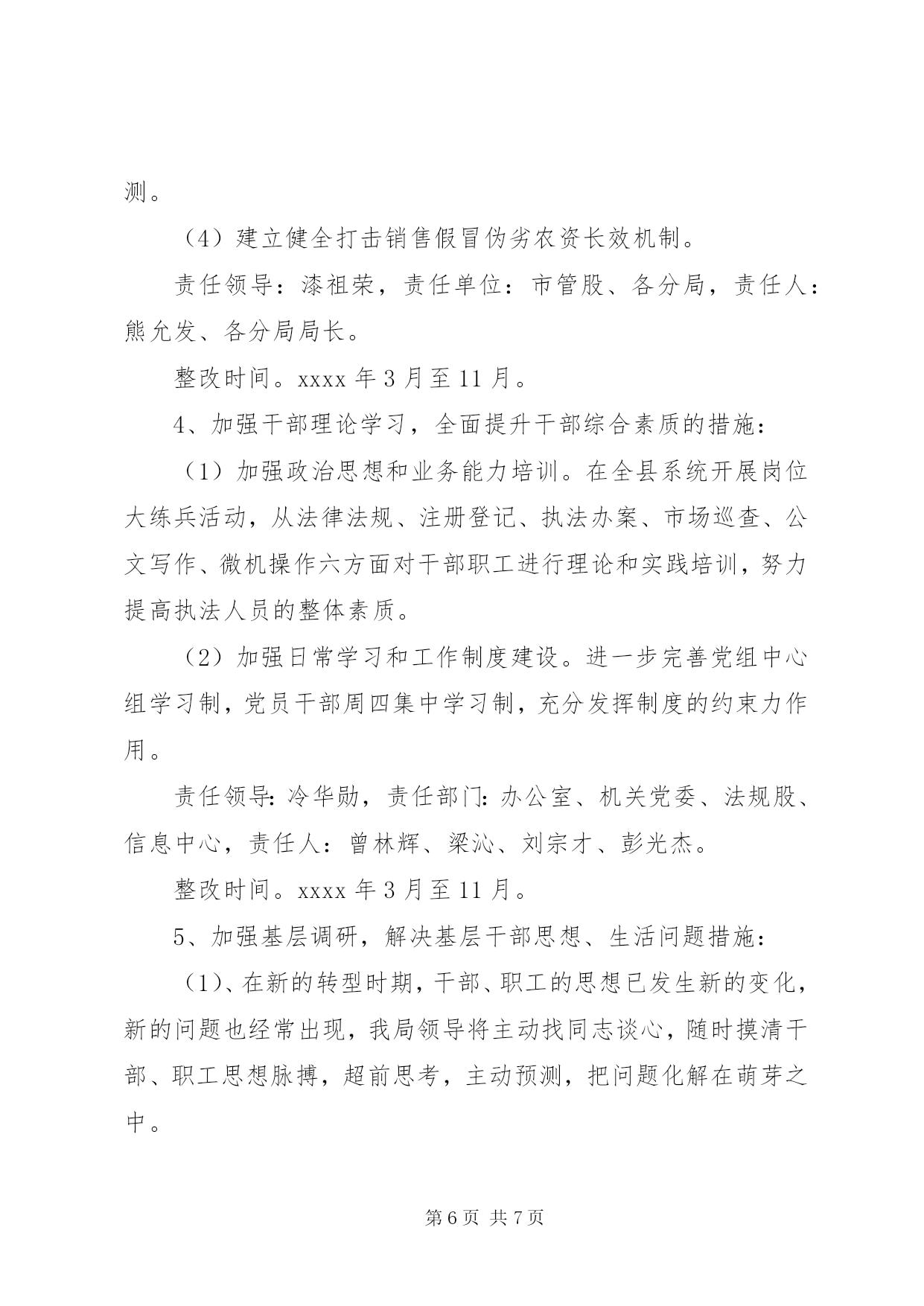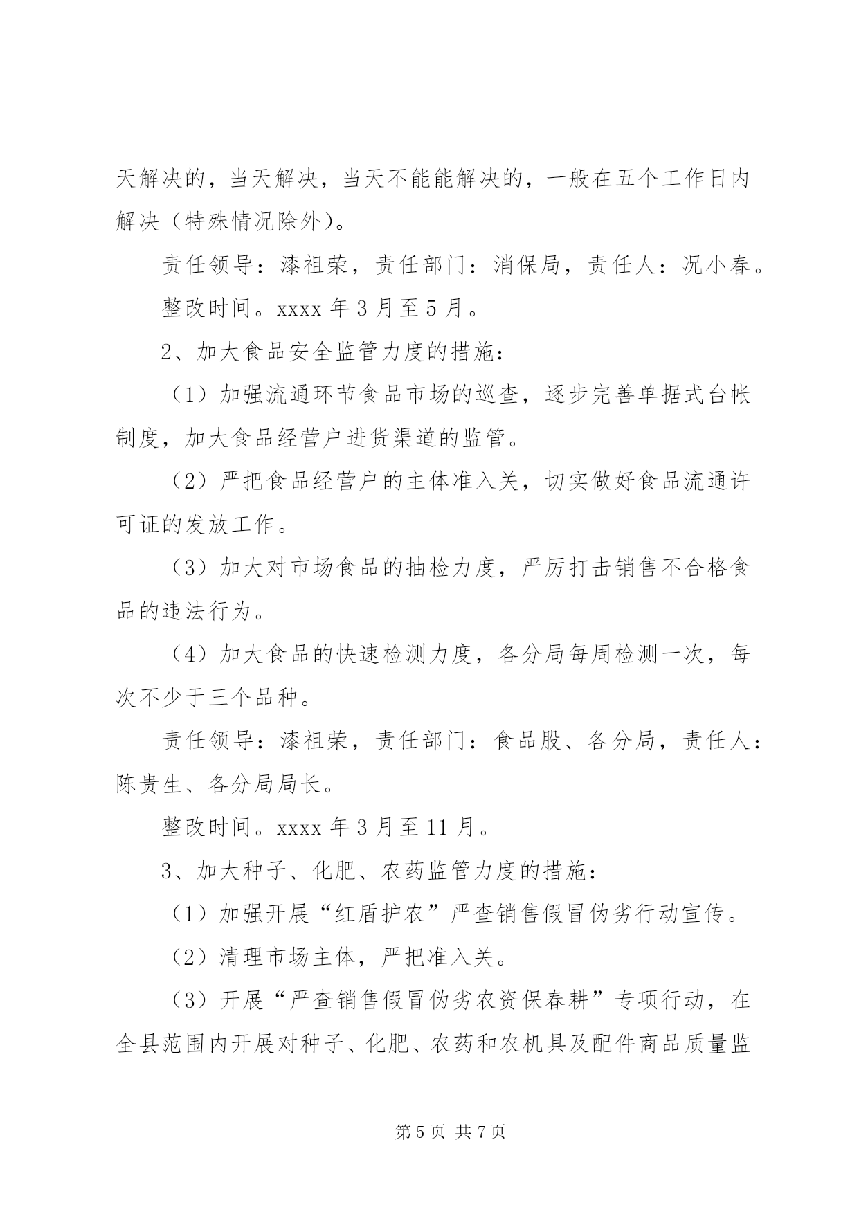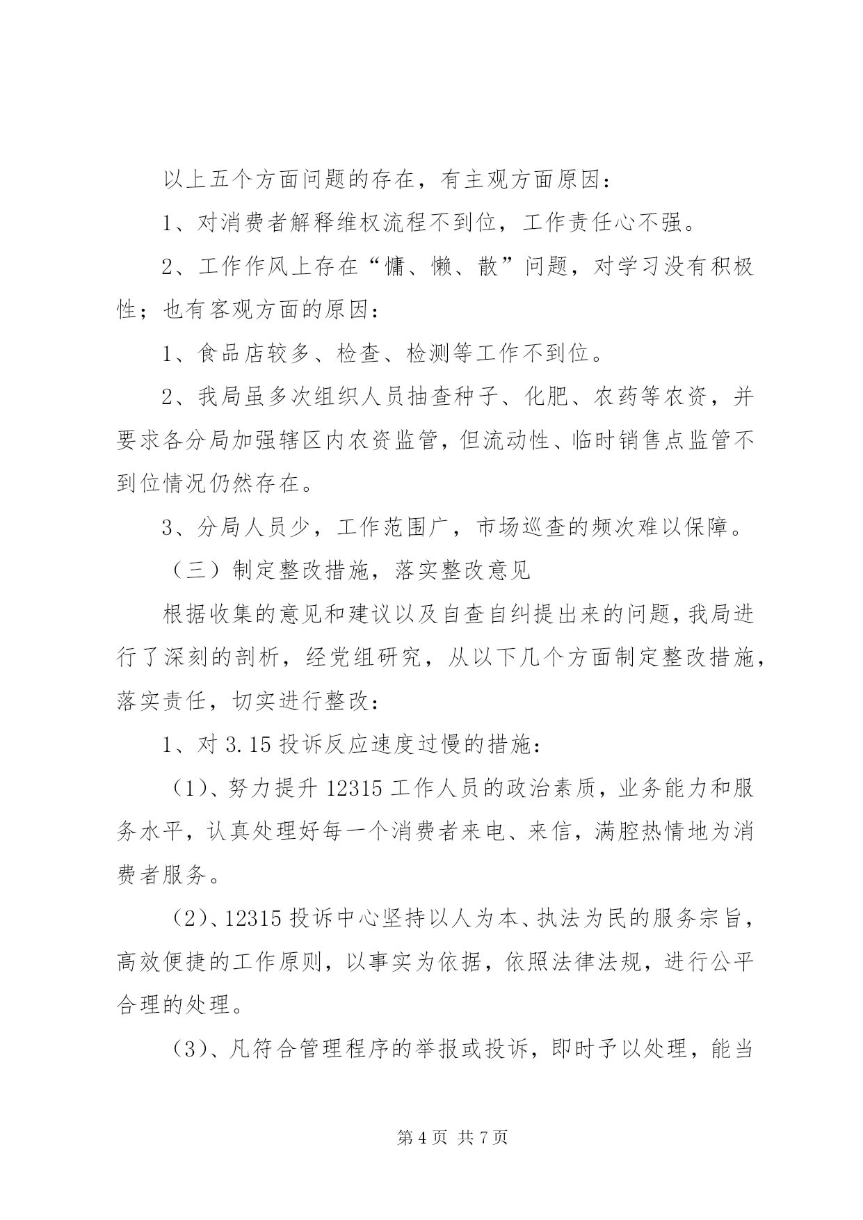 第PAGE\*Arabic\*MERGEFORMAT7页共NUMPAGES\*MERGEFORMAT7页工商局自查自纠整改报告按照市局工作部署,结合《xxxx县工商局集中整治影响发展环境的干部作风突出问题活动实施方案》,集中整治影响发展环境的干部作风突出问题活动从xxxx年x月16日起进入自查自纠阶段。我局坚持“存在什么问题就整改什么问题”的方针,通过自我查找、社会各界代表提建议,认真对照影响发展环境的干部作风五个方面、20种突出问题,查找本单位在工作中存在的不足,并对存在的问题进行了深刻的剖析,制定和完善了相关措施。现将有关工作情况汇报如下:一、开展自查自纠,认真梳理问题(一)加强领导,强化部署为进一步推动全县工商系统集中整治干部作风活动的深入开展,县局党组高度重视,多次召开党组会议研究部署自查自纠阶段各项工作,制订了《xxxx县工商局自查自纠阶段工作方案》,由分管领导抓好各项工作的落实。(二)广泛征求意见xxxx年4月12日,我局分别在县局机关、潭山、棠浦、xxxx三个分局召开了有市局领导、当地党政领导、县纪委XX县区效能办领导、人大代表、政协委员、个私业主代表、被处罚对象、工商特邀监督员、新闻媒体参加的干部述职述廉大会,广泛的征求社会各界对工商部门的意见、建议,向社会发放征求意见120份,发放自查表20份。同时,县局多次组织人员到分局和机关各单位进行督查并公布了我局的投诉电话和电子信箱。围绕以下5个方面广泛征求意见,认真进行查找问题:1、工作作风上“庸、懒、散”,2、领导作风上的“假、浮、蛮”,3、在公务活动中“私、奢、贪”,4、行政审批中低效率,5、中介机构及从业人员乱作为。收回征求意见表120份,收集整理意见和建议5条。(三)召开专题会议,认真开展自查各分局、机关各单位及工作人员自觉对照上级集中整治活动要求和本局《方案》,从思想、作风和表现等方面认真进行自查,找准、认清各自存在的突出问题。全系统每位在职人员都撰写了自查自纠材料,县局、各分局分别开辟自查自纠阶段专栏。县局于xxxx年5月7日召开了机关全体人员、分局长自查自纠专题会议。县局班子成员、机关各单位负责人在会上认真查摆自身在工作、思想、作风方面存在的问题,分析存在问题原因,并明确了整改方向,制定了整改措施。(四)结合实际开展“五查五比五看”。开展了以“查宗旨观点,查工作态度,查服务效能,查落实能力,查工作成效,比党性意识,比奉献精神,比工作效率,比社会评价,比工作业绩,看理想信念是否坚定,看工作作风是否踏实,看服务意识是否强烈,看群众反映是否满意,看工作任务是否落实”为主要内容的“五查五比五看”活动。通过开展“五查五比五看”活动,在全局营造比学赶超,xxxx争优的良好氛围,以一流的作风、一流的服务、争创一流的业绩,树一流的形象。开展一次以“变作风,树形象,争进位,再xxxx,明确我该做什么,能做什么,怎么去做”为主题开展大讨论,找差距,寻原因,添措施,定目标,通过大讨论活动,搅动干部思想,激发工作热情,激发发展潜力。二、制定整改措施,落实整改责任(一)对干部自查自纠,以及面向各界收集的意见和建议认真进行了梳理和汇总,共有以下五个方面:1、对3.15投诉反应速度过慢;2、加大食品安全监管力度;3、加大种子、化肥、农药监管力度。4、理论学习不系统、全面,对新形势下的新知识,新要求,新方法掌握不够。5、深入基层了解情况,调查研究少,和基层工作人员谈心少,思想政治工作不够经常化、具体化。(二)存在问题的原因以上五个方面问题的存在,有主观方面原因:1、对消费者解释维权流程不到位,工作责任心不强。2、工作作风上存在“慵、懒、散”问题,对学习没有积极性;也有客观方面的原因:1、食品店较多、检查、检测等工作不到位。2、我局虽多次组织人员抽查种子、化肥、农药等农资,并要求各分局加强辖区内农资监管,但流动性、临时销售点监管不到位情况仍然存在。3、分局人员少,工作范围广,市场巡查的频次难以保障。(三)制定整改措施,落实整改意见根据收集的意见和建议以及自查自纠提出来的问题,我局进行了深刻的剖析,经党组研究,从以下几个方面制定整改措施,落实责任,切实进行整改:1、对3.15投诉反应速度过慢的措施:(1)、努力提升12315工作人员的政治素质,业务能力和服务水平,认真处理好每一个消费者来电、来信,满腔热情地为消费者服务。(2)、12315投诉中心坚持以人为本、执法为民的服务宗旨,高效便捷的工作原则,以事实为依据,依照法律法规,进行公平合理的处理。(3)、凡符合管理程序的举报或投诉,即时予以处理,能当天解决的,当天解决,当天不能能解决的,一般在五个工作日内解决(特殊情况除外)。责任领导:漆祖荣,责任部门:消保局,责任人:况小春。整改时间。xxxx年3月至5月。2、