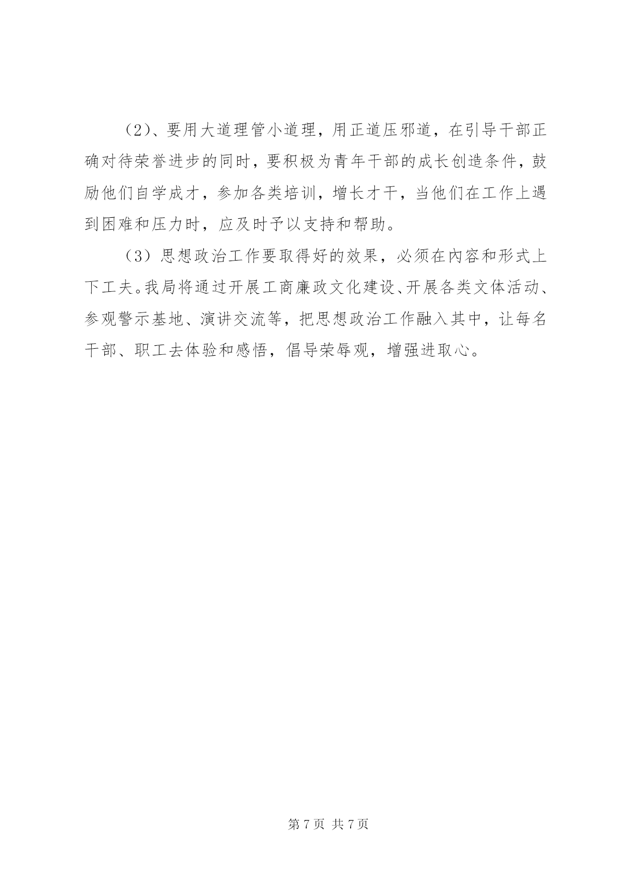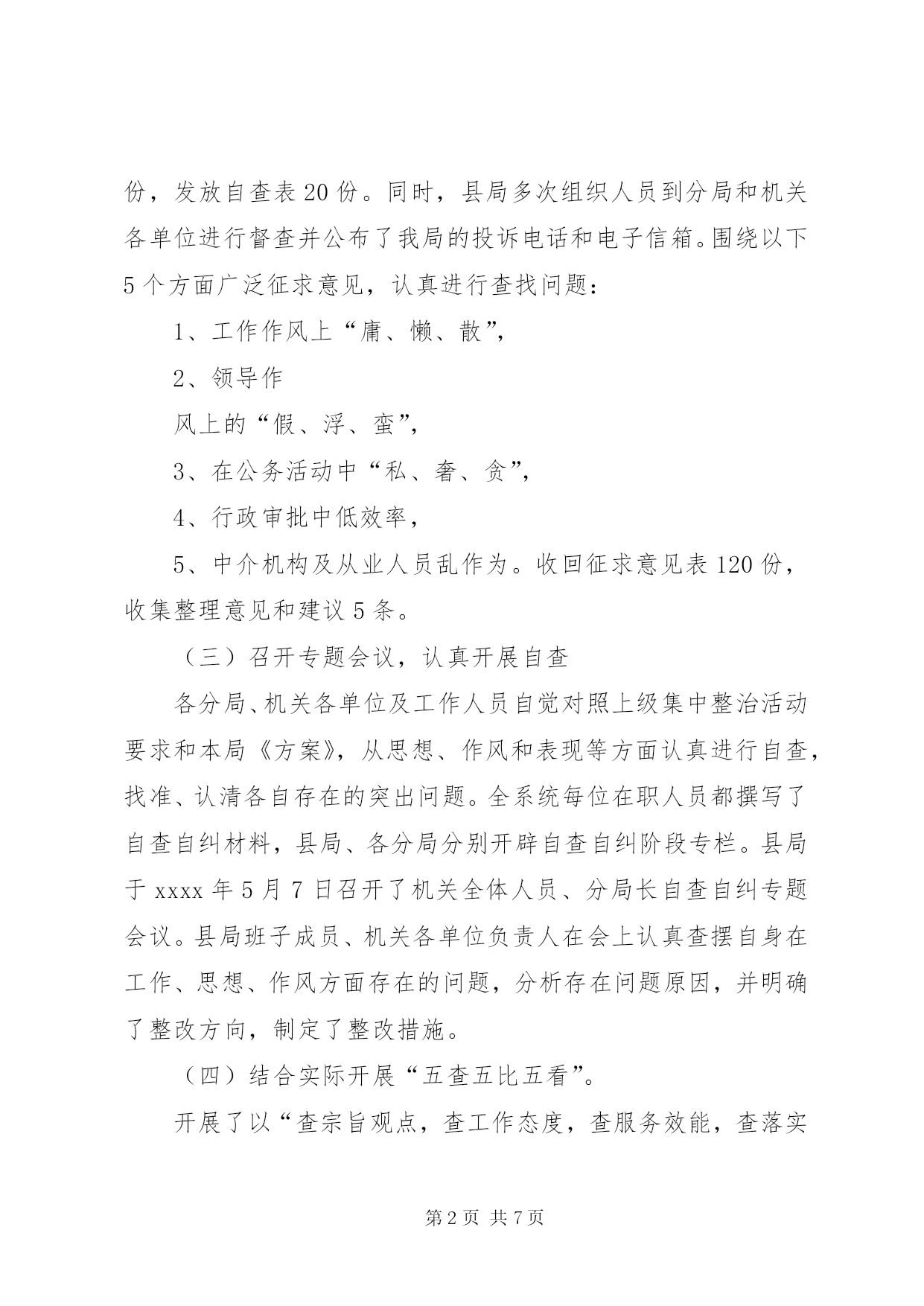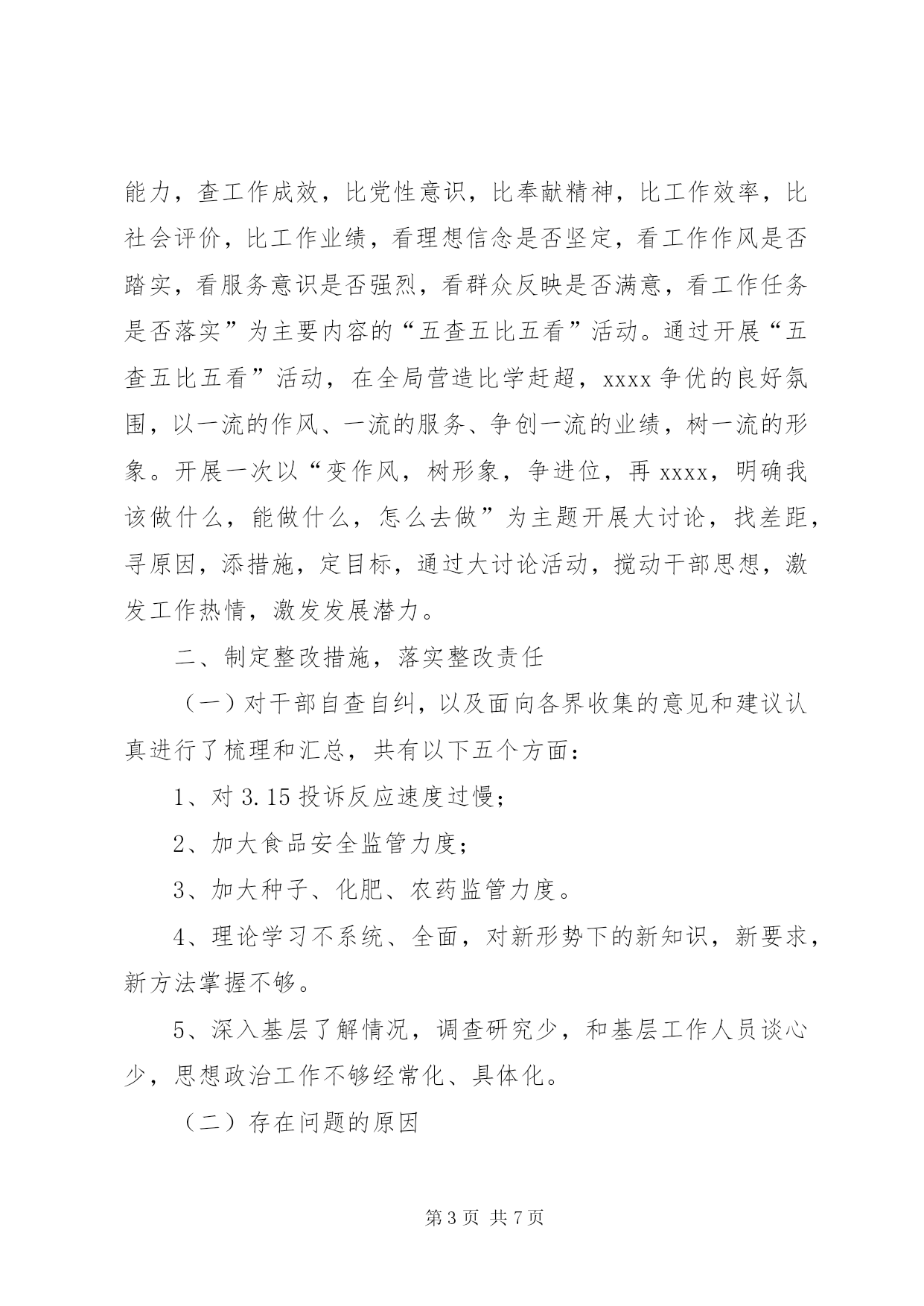 第PAGE\*Arabic\*MERGEFORMAT7页共NUMPAGES\*MERGEFORMAT7页工商局自查自纠整改报告按照市局工作部署,结合《xxxx县工商局集中整治影响发展环境的干部作风突出问题活动实施方案》,集中整治影响发展环境的干部作风突出问题活动从xxxx年x月16日起进入自查自纠阶段。我局坚持“存在什么问题就整改什么问题”的方针,通过自我查找、社会各界代表提建议,认真对照影响发展环境的干部作风五个方面、20种突出问题,查找本单位在工作中存在的不足,并对存在的问题进行了深刻的剖析,制定和完善了相关措施。现将有关工作情况汇报如下:一、开展自查自纠,认真梳理问题(一)加强领导,强化部署为进一步推动全县工商系统集中整治干部作风活动的深入开展,县局党组高度重视,多次召开党组会议研究部署自查自纠阶段各项工作,制订了《xxxx县工商局自查自纠阶段工作方案》,由分管领导抓好各项工作的落实。(二)广泛征求意见xxxx年4月12日,我局分别在县局机关、潭山、棠浦、xxxx三个分局召开了有市局领导、当地党政领导、县纪委XX县区效能办领导、人大代表、政协委员、个私业主代表、被处罚对象、工商特邀监督员、新闻媒体参加的干部述职述廉大会,广泛的征求社会各界对工商部门的意见、建议,向社会发放征求意见120份,发放自查表20份。同时,县局多次组织人员到分局和机关各单位进行督查并公布了我局的投诉电话和电子信箱。围绕以下5个方面广泛征求意见,认真进行查找问题:1、工作作风上“庸、懒、散”,2、领导作风上的“假、浮、蛮”,3、在公务活动中“私、奢、贪”,4、行政审批中低效率,5、中介机构及从业人员乱作为。收回征求意见表120份,收集整理意见和建议5条。(三)召开专题会议,认真开展自查各分局、机关各单位及工作人员自觉对照上级集中整治活动要求和本局《方案》,从思想、作风和表现等方面认真进行自查,找准、认清各自存在的突出问题。全系统每位在职人员都撰写了自查自纠材料,县局、各分局分别开辟自查自纠阶段专栏。县局于xxxx年5月7日召开了机关全体人员、分局长自查自纠专题会议。县局班子成员、机关各单位负责人在会上认真查摆自身在工作、思想、作风方面存在的问题,分析存在问题原因,并明确了整改方向,制定了整改措施。(四)结合实际开展“五查五比五看”。开展了以“查宗旨观点,查工作态度,查服务效能,查落实能力,查工作成效,比党性意识,比奉献精神,比工作效率,比社会评价,比工作业绩,看理想信念是否坚定,看工作作风是否踏实,看服务意识是否强烈,看群众反映是否满意,看工作任务是否落实”为主要内容的“五查五比五看”活动。通过开展“五查五比五看”活动,在全局营造比学赶超,xxxx争优的良好氛围,以一流的作风、一流的服务、争创一流的业绩,树一流的形象。开展一次以“变作风,树形象,争进位,再xxxx,明确我该做什么,能做什么,怎么去做”为主题开展大讨论,找差距,寻原因,添措施,定目标,通过大讨论活动,搅动干部思想,激发工作热情,激发发展潜力。二、制定整改措施,落实整改责任(一)对干部自查自纠,以及面向各界收集的意见和建议认真进行了梳理和汇总,共有以下五个方面:1、对3.15投诉反应速度过慢;2、加大食品安全监管力度;3、加大种子、化肥、农药监管力度。4、理论学习不系统、全面,对新形势下的新知识,新要求,新方法掌握不够。5、深入基层了解情况,调查研究少,和基层工作人员谈心少,思想政治工作不够经常化、具体化。(二)存在问题的原因以上五个方面问题的存在,有主观方面原因:1、对消费者解释维权流程不到位,工作责任心不强。2、工作作风上存在“慵、懒、散”问题,对学习没有积极性;也有客观方面的原因:1、食品店较多、检查、检测等工作不到位。2、我局虽多次组织人员抽查种子、化肥、农药等农资,并要求各分局加强辖区内农资监管,但流动性、临时销售点监管不到位情况仍然存在。3、分局人员少,工作范围广,市场巡查的频次难以保障。(三)制定整改措施,落实整改意见根据收集的意见和建议以及自查自纠提出来的问题,我局进行了深刻的剖析,经党组研究,从以下几个方面制定整改措施,落实责任,切实进行整改:1、对3.15投诉反应速度过慢的措施:(1)、努力提升12315工作人员的政治素质,业务能力和服务水平,认真处理好每一个消费者来电、来信,满腔热情地为消费者服务。(2)、12315投诉中心坚持以人为本、执法为民的服务宗旨,高效便捷的工作原则,以事实为依据,依照法律法规,进行公平合理的处理。(3)、凡符合管理程序的举报或投诉,即时予以处理,能当天解决的,当天解决,当天不能能解决的,一般在五个工作日内解决(特殊情况除外)。责任领导:漆祖荣,责任部门:消保局,责任人:况小春。整改时间。xxxx年3月至5月。2、