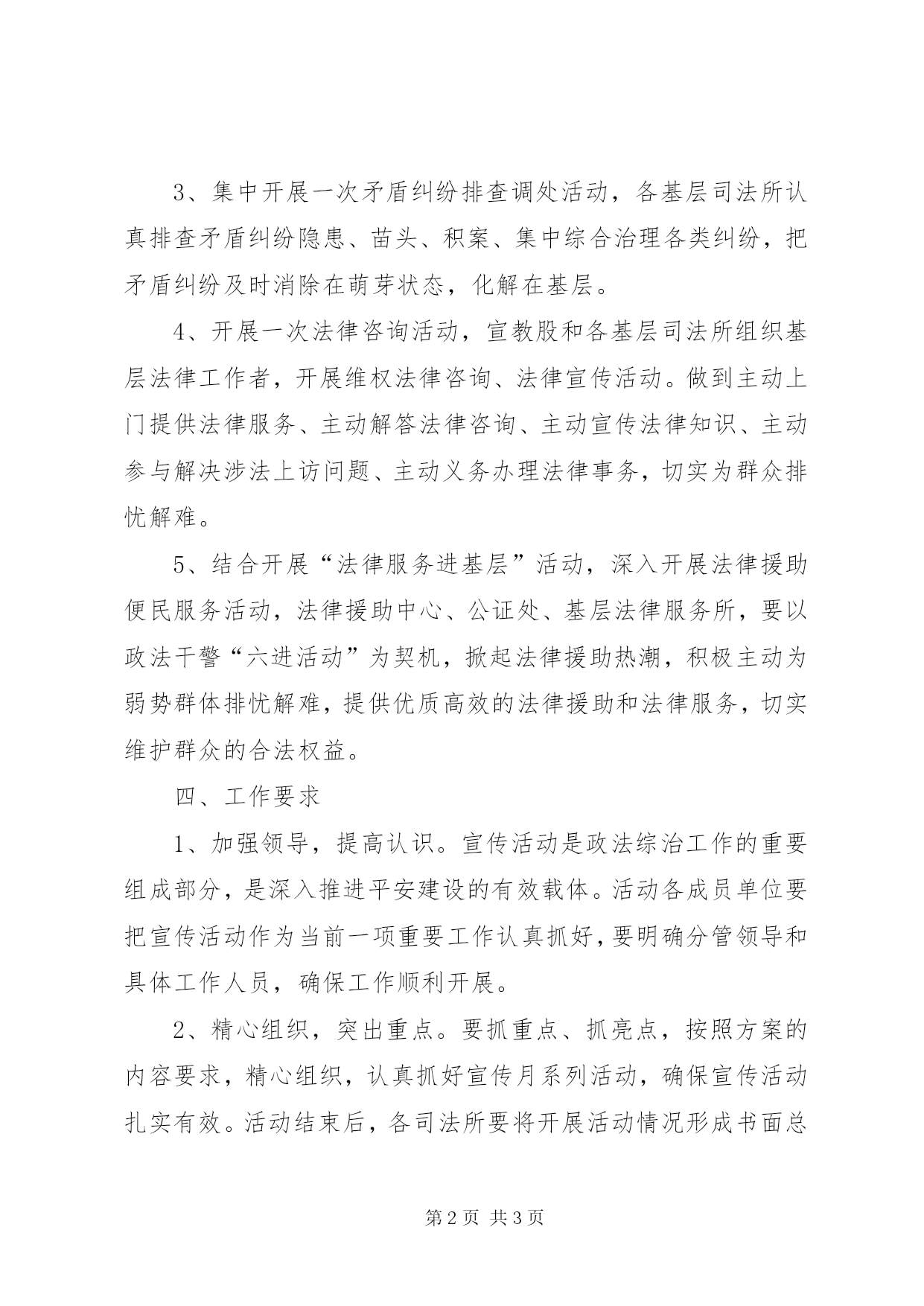 第PAGE\*Arabic\*MERGEFORMAT3页共NUMPAGES\*MERGEFORMAT3页司法局开展六进活动实施方案一、组织领导为加强对政法干警“六进活动”的组织领导,成立司法局“六进活动”领导小组,党组书记、局长任组长,副局长任副组长,局政治处、宣教股、基层股、各基层司法所、法援中心、公证处为领导小组成员单位。下设活动领导小组办公室,由基层股股长兼办公室主任,具体负责活动的组织、协调和督查。二、工作目标进一步加强乡村、社区、单位、学校、特殊人群和困难群众法律服务工作的制度、机制建设;构建比较完善的法律服务网络;进一补提高全局政法干警为民意识和服务意识;司法行政工作的服务领域不断向基层延伸,人民群众多层次、全方位的法律服务需求得到进一步满足。三、活动安排1、结合开展法律“六进”活动,各基层司法所要深入乡村、社区、单位、企业、学校、特殊人群和困难群众,认真开展一次《人民调解法》法律宣传活动,结合《人民调解法》宣传月,努力营造浓厚的法制宣传氛围和社会治安综合治理声势。2、组织举办法制讲座。基层司法所组织法制宣讲队,深入乡村、社区、中小学上一次法制课,提高村(居)民法律素质和抵制邪教的能力。3、集中开展一次矛盾纠纷排查调处活动,各基层司法所认真排查矛盾纠纷隐患、苗头、积案、集中综合治理各类纠纷,把矛盾纠纷及时消除在萌芽状态,化解在基层。4、开展一次法律咨询活动,宣教股和各基层司法所组织基层法律工作者,开展维权法律咨询、法律宣传活动。做到主动上门提供法律服务、主动解答法律咨询、主动宣传法律知识、主动参与解决涉法上访问题、主动义务办理法律事务,切实为群众排忧解难。5、结合开展“法律服务进基层”活动,深入开展法律援助便民服务活动,法律援助中心、公证处、基层法律服务所,要以政法干警“六进活动”为契机,掀起法律援助热潮,积极主动为弱势群体排忧解难,提供优质高效的法律援助和法律服务,切实维护群众的合法权益。四、工作要求1、加强领导,提高认识。宣传活动是政法综治工作的重要组成部分,是深入推进平安建设的有效载体。活动各成员单位要把宣传活动作为当前一项重要工作认真抓好,要明确分管领导和具体工作人员,确保工作顺利开展。2、精心组织,突出重点。要抓重点、抓亮点,按照方案的内容要求,精心组织,认真抓好宣传月系列活动,确保宣传活动扎实有效。活动结束后,各司法所要将开展活动情况形成书面总结材料上报基层股(举办法制讲座、开展法律咨询附照片)。3、狠抓落实,形式多样。要推陈创新。既要广泛采用以往行之有效、群众喜闻乐见的宣传工具和宣传形式,又要与时俱进,积极创新宣传形式和方式,使法制宣传教育更加贴近群众、贴进实际,取得更好效果。要在集镇、街道群众活动比较集中的场所,采取法制图片展览、法律咨询、发放法律宣传资料等活动,宣传与群众生产、生活密切相关的法律法规。要重心下移把宣传工作的重点放到社区、农村、企业、学校等基层单位,不断强化指导管理,加大工作力度,努力使社会治安综合和平安建设的精神在广大干部群众中能够“入脑入心”,收到实效。