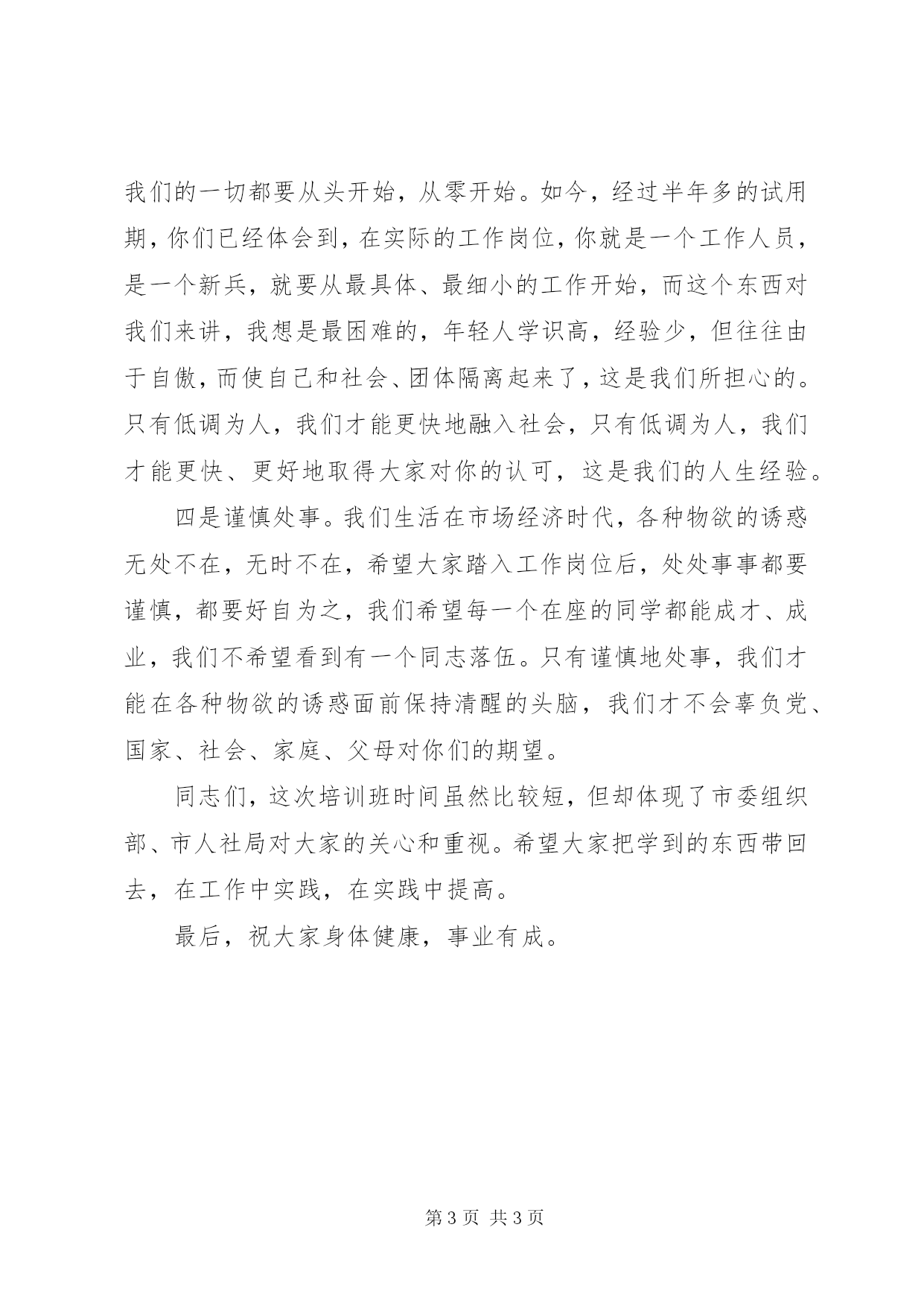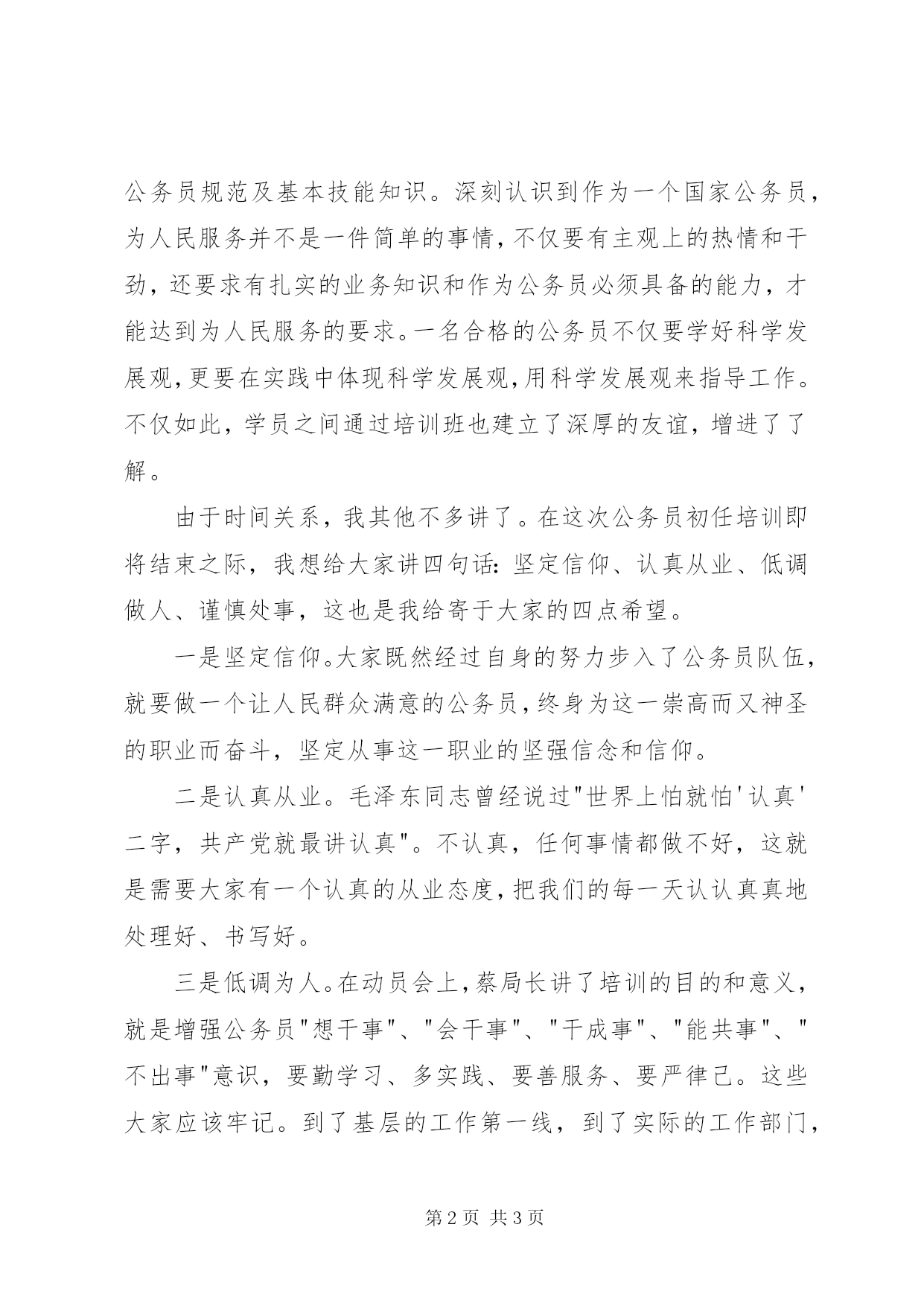 第PAGE\*Arabic\*MERGEFORMAT3页共NUMPAGES\*MERGEFORMAT3页公务员初任培训结业典礼上的讲话同志们:我们这次公务员初任培训历时3天,到今天就要结束了。在市委组织部和市人社局领导的关心下,经过有关部门的精心组织,以及在座学员的共同努力,这次公务员初任培训总体上是成功的,收益是多方面的。总的看,这次集中学习培训主要有这么几个特点:一是领导重视,组织严密。为了准备这次培训,市委组织部和市人社局已经筹划了很长时间,市委组织部和人社局领导对这次培训十分重视,从指导思想、培训内容、时间安排及考核意见等都提出了具体要求,市委党校积极安排培训课程,并组织做好备课工作。市直机关和乡镇接到通知后,能妥善处理好工作和学习的矛盾,学员们也都非常珍惜这次学习提高的机会,以饱满的热情积极参加。二是内容丰富,主题突出。这次培训,时间安排比较紧凑,课程安排了学习公务员法及公务员行为规范、社会管理创新、"十二五"规划与经济发展形势、依法行政、公文写作等等,突出提高初任公务员的能力建设这一主题,以使大家尽快完成角色的转变,适应工作的需要。三是明确责任,增进了解。短短三天的培训,来自不同岗位、不同单位的xxx名学员,系统地学习了公务员必备的理论知识和公务员规范及基本技能知识。深刻认识到作为一个国家公务员,为人民服务并不是一件简单的事情,不仅要有主观上的热情和干劲,还要求有扎实的业务知识和作为公务员必须具备的能力,才能达到为人民服务的要求。一名合格的公务员不仅要学好科学发展观,更要在实践中体现科学发展观,用科学发展观来指导工作。不仅如此,学员之间通过培训班也建立了深厚的友谊,增进了了解。由于时间关系,我其他不多讲了。在这次公务员初任培训即将结束之际,我想给大家讲四句话:坚定信仰、认真从业、低调做人、谨慎处事,这也是我给寄于大家的四点希望。一是坚定信仰。大家既然经过自身的努力步入了公务员队伍,就要做一个让人民群众满意的公务员,终身为这一崇高而又神圣的职业而奋斗,坚定从事这一职业的坚强信念和信仰。二是认真从业。毛泽东同志曾经说过"世界上怕就怕'认真'二字,共产党就最讲认真"。不认真,任何事情都做不好,这就是需要大家有一个认真的从业态度,把我们的每一天认认真真地处理好、书写好。三是低调为人。在动员会上,蔡局长讲了培训的目的和意义,就是增强公务员"想干事"、"会干事"、"干成事"、"能共事"、"不出事"意识,要勤学习、多实践、要善服务、要严律己。这些大家应该牢记。到了基层的工作第一线,到了实际的工作部门,我们的一切都要从头开始,从零开始。如今,经过半年多的试用期,你们已经体会到,在实际的工作岗位,你就是一个工作人员,是一个新兵,就要从最具体、最细小的工作开始,而这个东西对我们来讲,我想是最困难的,年轻人学识高,经验少,但往往由于自傲,而使自己和社会、团体隔离起来了,这是我们所担心的。只有低调为人,我们才能更快地融入社会,只有低调为人,我们才能更快、更好地取得大家对你的认可,这是我们的人生经验。四是谨慎处事。我们生活在市场经济时代,各种物欲的诱惑无处不在,无时不在,希望大家踏入工作岗位后,处处事事都要谨慎,都要好自为之,我们希望每一个在座的同学都能成才、成业,我们不希望看到有一个同志落伍。只有谨慎地处事,我们才能在各种物欲的诱惑面前保持清醒的头脑,我们才不会辜负党、国家、社会、家庭、父母对你们的期望。同志们,这次培训班时间虽然比较短,但却体现了市委组织部、市人社局对大家的关心和重视。希望大家把学到的东西带回去,在工作中实践,在实践中提高。最后,祝大家身体健康,事业有成。
