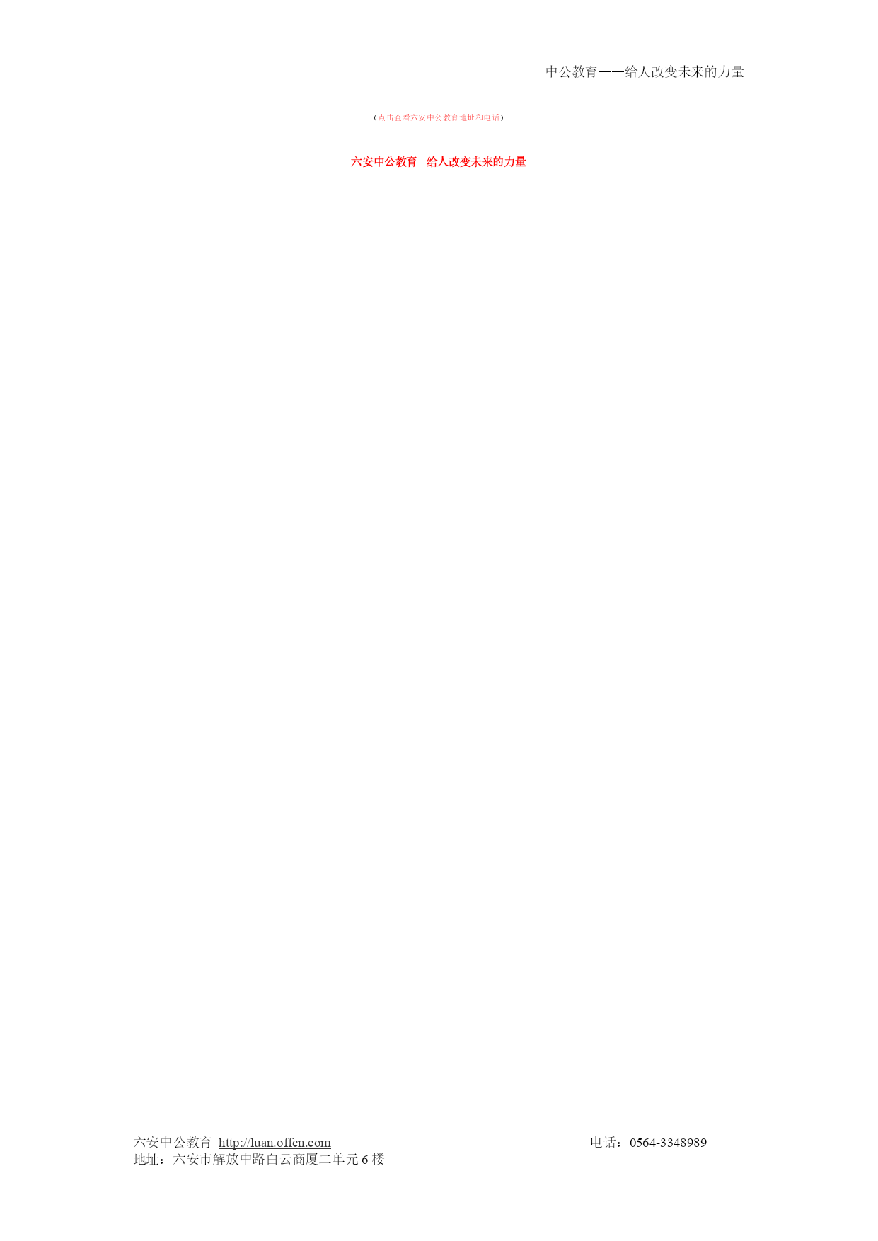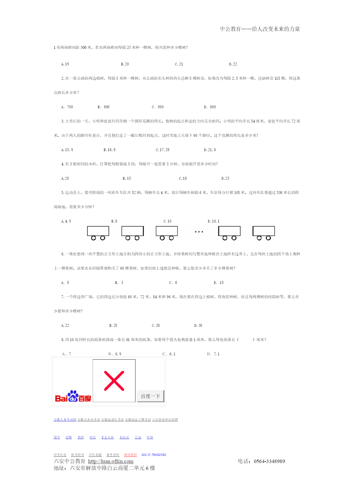 中公教育——给人改变未来的力量六安中公教育HYPERLINK"http://luan.offcn.com"http://luan.offcn.com电话:0564-3348989地址:六安市解放中路白云商厦二单元6楼1.有两座楼间距500米,若在两座楼间每隔25米种一棵树,则共需种多少棵树?A.19B.20C.21D.222.在一条公路的两边植树,每隔3米种一棵树,从公路的东头种到西头还剩5棵树苗,如果改为每隔2.5米种一棵,还缺树苗115棵,则这条公路长多少米?A.700B.800C.900D.6003.大雪后的一天,小明和爸爸共同步测一个圆形花圃的周长。他俩的起点和走的方向完全相同。小明的平均步长54厘米,爸爸平均步长72厘米。由于两人的脚印有重合,并且他们走了一圈后都回到起点,这时雪地上只留下60个脚印。这个花圃的周长是多少米?A.15.9B.16.8C.17.28D.21.64.有3根相同的木料,打算把每根锯成3段,每锯开一处需要3分钟,全部锯开需多少时间?A.20B.15C.18D.235.运动会上,接受检阅的一列彩车车队共52辆,每辆车长4米,前后每辆车相隔6米,车队每分行驶105米。这列车队要通过536米长的检阅场地,需要多少分钟?A.4.9B.8C.10D.10.16.一果农想将一块平整的正方形土地分割为四块小的正方形土地,并将果树均匀整齐地种植在土地所有边界上,且在每块土地的四个角上都种上一棵果树。该果农未经细算就购买了60棵果树,如果仍按上述想法种植,那么他至少多买了多少棵果树?A.0B.3C.6D.157.一个四边形广场,它的四边长分别是60米、72米、84米和96米,现在要在四边上植树,四角需种树,而且每两棵树的间隔相等,那么至少要种多少棵树?A.22B.25C.26D.308.用10张同样长的纸条粘接成一条长61厘米的纸条,如果每个接头处都重叠1厘米,那么每张纸条长()厘米?A.7B.6.9C.6.1D.7.1窗体顶端窗体底端HYPERLINK"http://luan.offcn.com/"\t"_blank"安徽人事考试网HYPERLINK"http://luan.offcn.com/html/anhuigongwuyuan/"\t"_blank"安徽公务员考试HYPERLINK"http://luan.offcn.com/html/xuandiaosheng/"\t"_blank"安徽选调生考试HYPERLINK"http://luan.offcn.com/html/zhengfaganjing/"\t"_blank"安徽政法干警考试HYPERLINK"http://luan.offcn.com/html/shiyedanwei/"\t"_blank"六安事业单位招聘HYPERLINK"http://luan.offcn.com/html/guojiagongwuyuan/"\o"国家公务员考试录用系统"国考HYPERLINK"http://luan.offcn.com/html/zhaojing/"\o"安徽招警考试网"招警HYPERLINK"http://luan.offcn.com/html/jiaoshi/"\o"六安教师招聘考试网"教师HYPERLINK"http://luan.offcn.com/html/cunguan/"\o"安徽大学生村官园地"村官HYPERLINK"http://luan.offcn.com/html/sanzhiyifu/"\o"六安三支一扶考试网"3支1扶HYPERLINK"http://luan.offcn.com/html/nongxinshe/"\o"安徽农村信用社招聘网"农信社HYPERLINK"http://luan.offcn.com/html/gongxuan/"\o"六安公选考试网"公选HYPERLINK"http://luan.offcn.com/html/junzhuangan/"\o"六安军转网"军转HYPERLINK"http://luan.offcn.com/html/zhaokao/"\t"_blank"招考信息HYPERLINK"http://luan.offcn.com/html/baokao/"\t"_blank"报考指导HYPERLINK"http://luan.offcn.com/html/kaoshi/"\t"_blank"历年真题HYPERLINK"http://luan.offcn.com/html/yuedu/"\t"_blank"备考资料HYPER