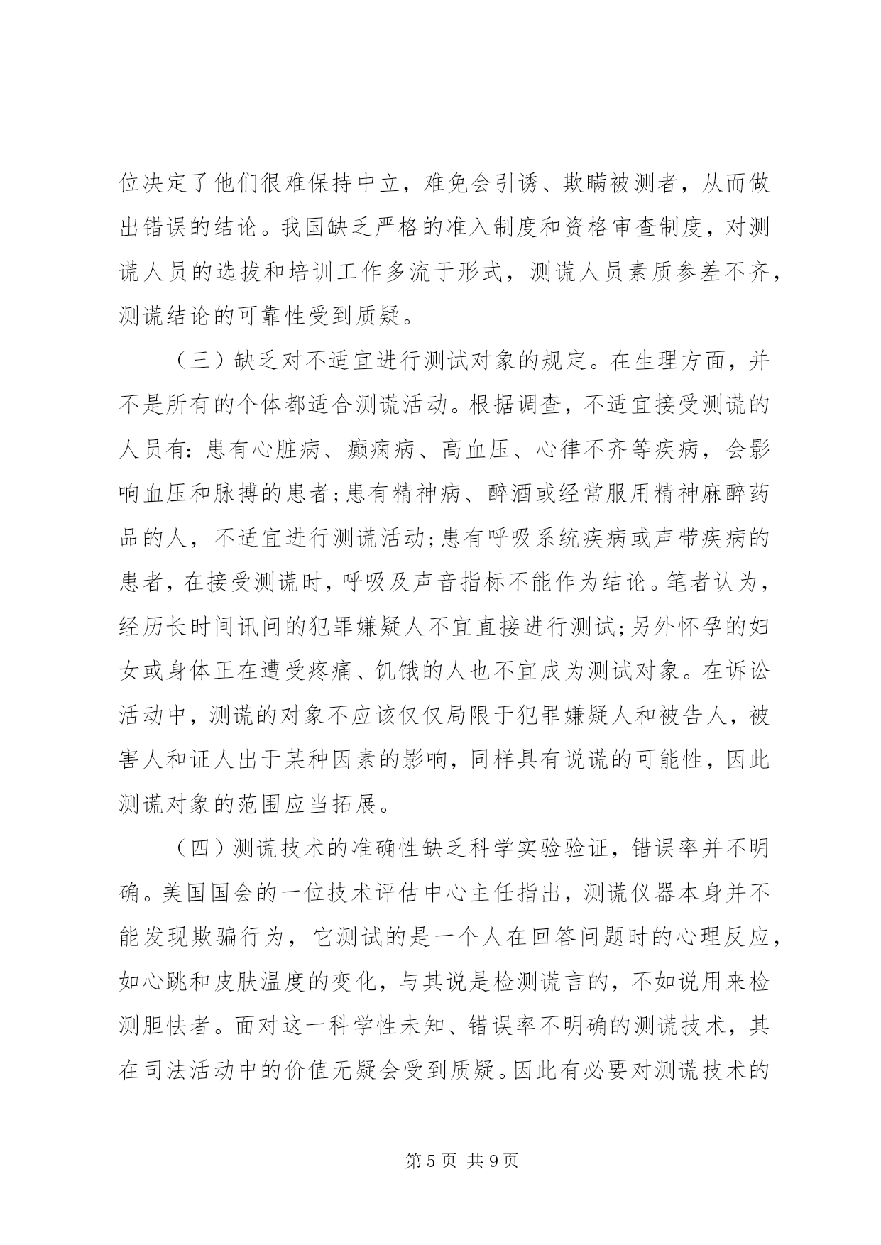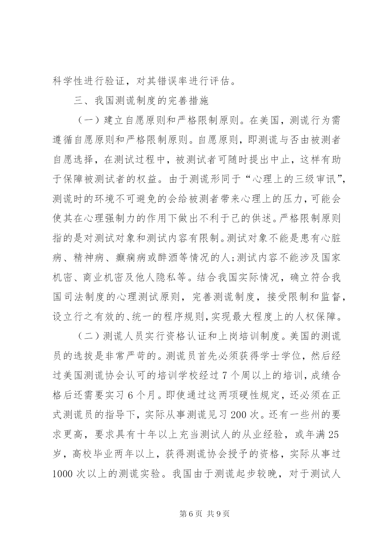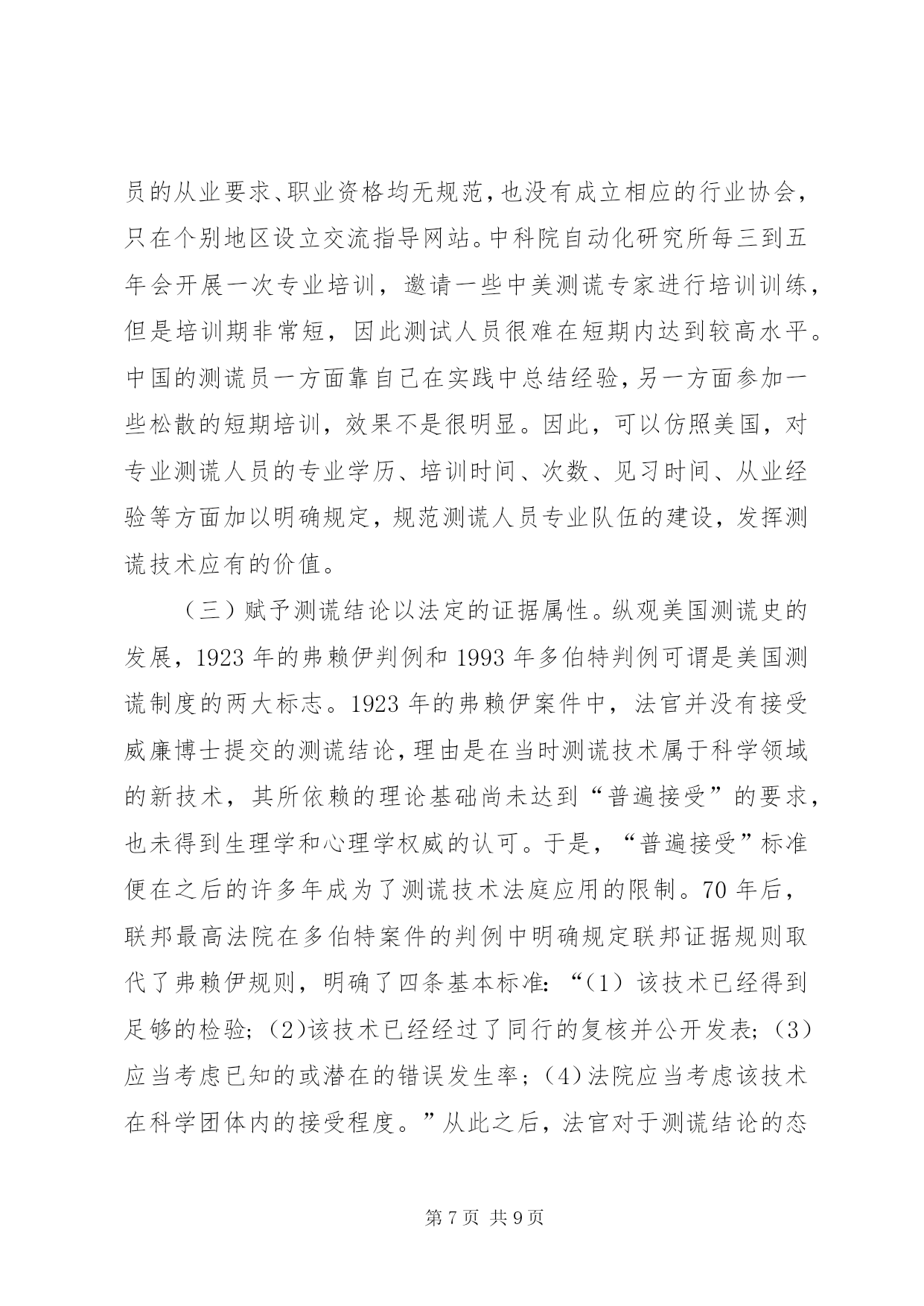 第PAGE\*Arabic\*MERGEFORMAT9页共NUMPAGES\*MERGEFORMAT9页测谎制度在司法实践的运用摘要。两院三部《非法证据排除规则》的出台和新《刑事诉讼法》的修订,都明确规定禁止以非法方式获取言辞证据,这标志着诉讼活动加强对人权的保障。如何以合法的方式获取口供,成为侦查机关和社会舆论关注的焦点。测谎技术便作为一种合法的方式被引入我国的司法实践中。然而,相比于测谎技术发达的美国而言,我国对测谎技术的适用条件、使用原则及立法规范等方面的研究不够深入,测谎技术的发展不够成熟,测谎结论的效力还有待明确。笔者希望通过对比中美两国测谎技术的起源、发展、应用范围、普及程度、法律规制等方面的异同,为完善我国的测谎制度奠定基础。关键词:测谎技术;应用规范;制度比对随着法庭科学技术的发展,传统的指纹、足迹鉴定已不能满足日益复杂的司法活动的需求。随着立法的不断完善,禁止刑讯逼供和保障人权的要求越来越强烈。测谎技术综合了医学、心理学、犯罪学、电子学、计算机科学及其他应用科学,将其引进司法活动成为取代刑讯逼供的合法手段是社会发展的必然要求。一、测谎技术测谎技术,又称心理测试技术,是在侦查讯问中获取言词证据的一种合法方式。测试人员根据案件具体情况事先设计一系列与犯罪活动“相关”和“无关”的问题,按照一定的顺序和时间间隔,逐一向被测试者提问,使其形成心理刺激,而这种心理刺激又会引起一系列生理反应,如心跳加快、血压升高、出汗、呼吸速度和容量异常等,同时用仪器记录被测试者在面对和回答每一个问题时的脉搏、呼吸、血压和皮肤电阻等生理参量,得到被测试者反应峰值数据。其中被测试者在回答与犯罪活动相关的问题时被记录的参量为“检材”,而回答无关问题时所记录的参量为“对照样本”,通过对“检材”和“样本”的比较检验,确定被测试者是否说谎。(一)测谎仪的发明。1921年,美国加利福尼亚大学医学系学生约翰X8226;拉森发明了第一台公认的测谎仪,用于记录血压和呼吸两项指标,后经改进正式应用于美国加州伯克利市警察局,这标志着测谎技术的正式确立。到了上世纪70年代美国人又发明了记录声带肌肉微颤的声析型测谎仪,90年代发明了脑电波测谎仪。我国于1981年引进第一台测谎仪──美制maRk-Ⅱ型测谎仪;1991年公安部和中国科学研究院研制成功中国第一台pg-Ⅰ型心理测试系统。紧接着公安部将测谎仪列入重点项目,后又被列入国家科技攻关项目。(二)测谎技术的发展。美国的测谎技术发展远远早于中国,制度完善。测谎技术不仅应用于犯罪调查和其他司法领域,还用于国防部及国家安全部门等国家安全领域以及政府部门、银行、保安公司的雇员录用,以此来检测职员对岗位的诚信道德。除此之外,私人测谎机构不断发展。据不完全统计,美国的州、市、县警察局一般均设有测谎室。美国目前有近万名专业测谎员服务于各类机构、部门。在我国,测谎技术主要应用于公安、检察等部门侦查办案。由于经济条件限制,只有少数经济发达地区的地市级公安机关设立了测谎室,配备有专业的测谎人员,如北京、上海、昆明等地。全国的专业测谎员仅有百余人。基层办案机关面对“高成本”的测谎仪和匮乏的专业测谎员,只能望而却步。设立有测谎室的地区,测谎技术的使用率非常低,多用于重特大或疑难案件,仅限个案使用。二、我国测谎制度存在的问题(一)缺乏行业标准和法律规范。1.测谎技术缺乏明确的行业标准。过去,我国对测谎技术长期持否定态度,认为是主观唯心主义的表现。自公安部率先引进测谎技术以来,在侦破案件中起到了巨大的作用。检察机关的反贪部门、法院也纷纷引入测谎仪为侦破和审理案件服务。但测谎技术缺乏相应的行业标准,少数地市级所设立的测谎室给自己设定有内部章程,缺乏规范与监督,不利于保障被测试者的权利,致使测谎技术至今未得到普遍认可,颇受争议。2.有关测谎结论属性的法律规定需要完善。美国曾于1923年立法禁止心理测试结果作为法庭证据使用,到1976年却又有30个州法院允许使用心理测试结果,但要求心理测试要经本人同意才能进行。目前,美国有十九个州和哥伦比亚特区命令宣布禁止使用测谎技术,其他州规定只要诉讼双方同意,测谎结果可以作为法庭证据使用。在我国,有关测谎结论的法律规定,仅限于现行有效的1999年最高检对XX省检察院《关于cps多道心理测试鉴定意见能否作为诉讼证据使用问题的批复》中规定,cps多道心理测试鉴定意见与刑事诉讼法规定的鉴定意见不同,检察院办理案件,虽然可以使用其审查、判断证据,但不能将其作为证据使用。(二)专业测谎人员数量和质量有待提高。1.我国缺乏专业的测谎人员。现在美国有近万名测谎专家,他们都经过特别专业学习和培训,具有丰富的心理学知识和实践侦查经验,为测谎结果的准确性提供了保证。我国专业的测谎人员仅有百余人,这些人员的