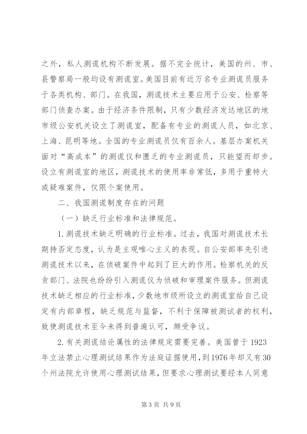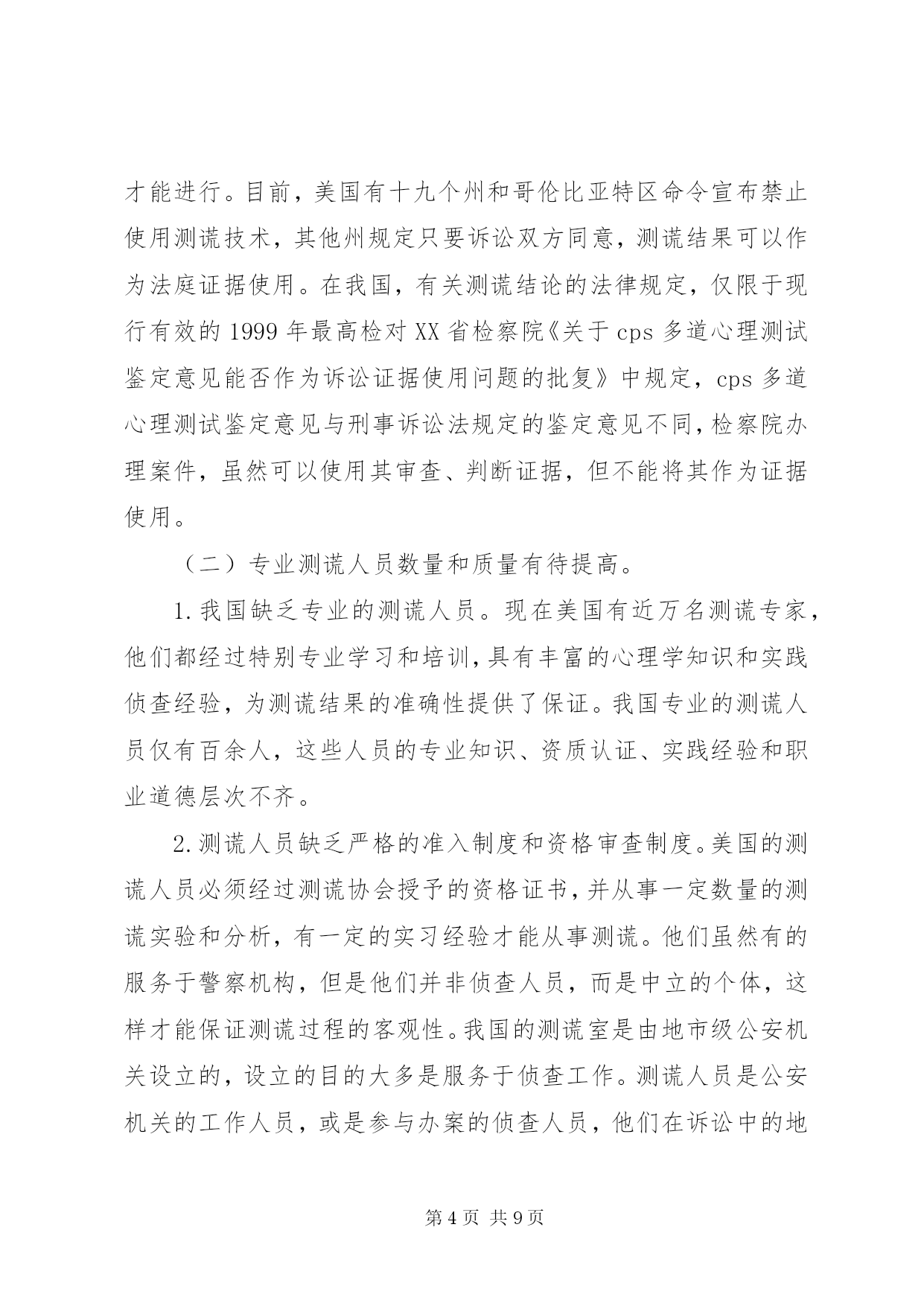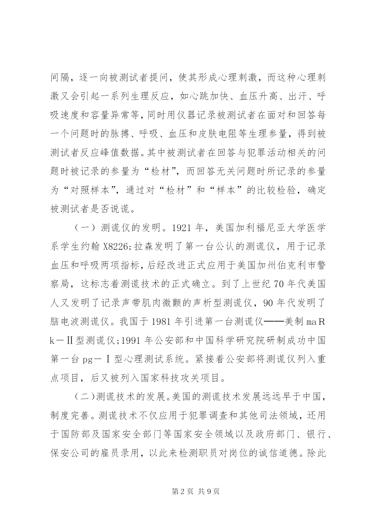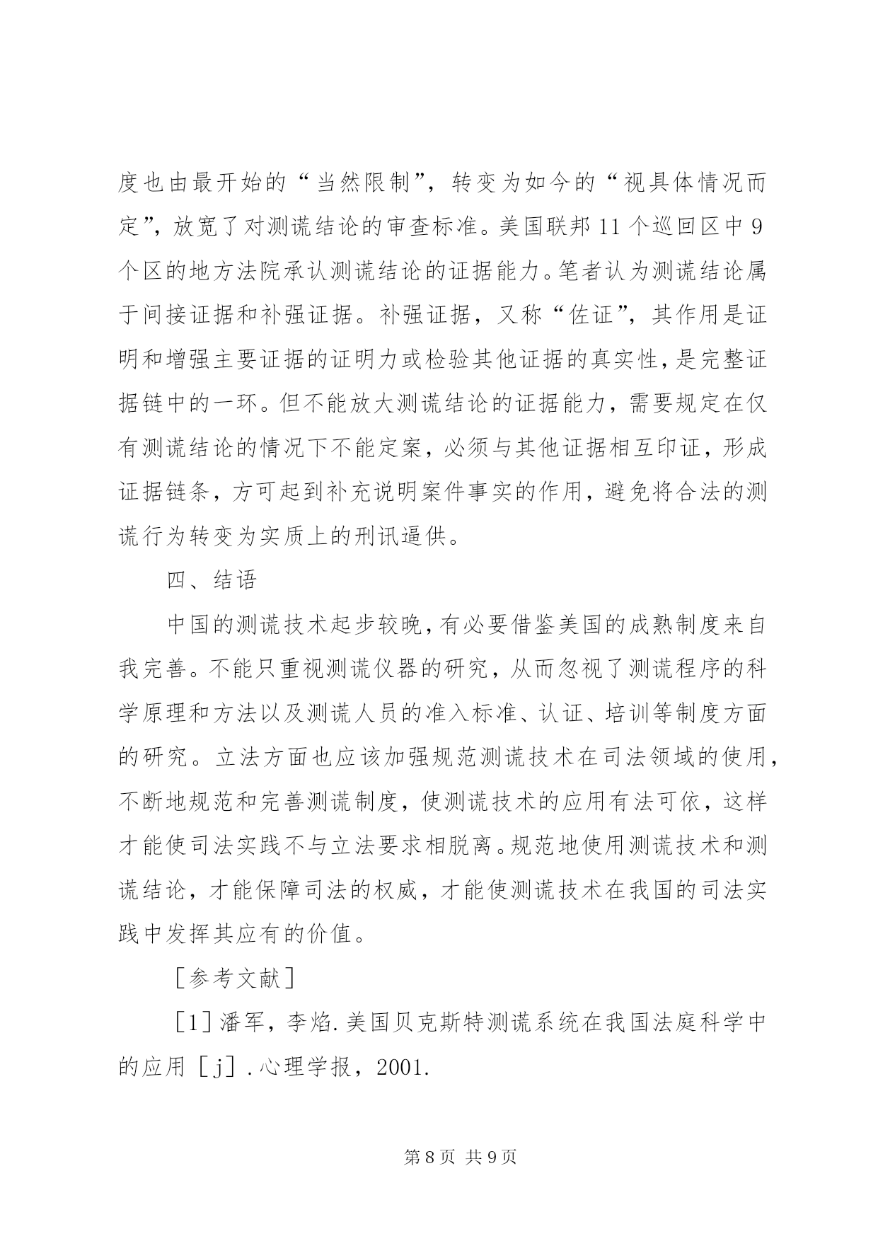 第PAGE\*Arabic\*MERGEFORMAT9页共NUMPAGES\*MERGEFORMAT9页测谎制度在司法实践的运用摘要。两院三部《非法证据排除规则》的出台和新《刑事诉讼法》的修订,都明确规定禁止以非法方式获取言辞证据,这标志着诉讼活动加强对人权的保障。如何以合法的方式获取口供,成为侦查机关和社会舆论关注的焦点。测谎技术便作为一种合法的方式被引入我国的司法实践中。然而,相比于测谎技术发达的美国而言,我国对测谎技术的适用条件、使用原则及立法规范等方面的研究不够深入,测谎技术的发展不够成熟,测谎结论的效力还有待明确。笔者希望通过对比中美两国测谎技术的起源、发展、应用范围、普及程度、法律规制等方面的异同,为完善我国的测谎制度奠定基础。关键词:测谎技术;应用规范;制度比对随着法庭科学技术的发展,传统的指纹、足迹鉴定已不能满足日益复杂的司法活动的需求。随着立法的不断完善,禁止刑讯逼供和保障人权的要求越来越强烈。测谎技术综合了医学、心理学、犯罪学、电子学、计算机科学及其他应用科学,将其引进司法活动成为取代刑讯逼供的合法手段是社会发展的必然要求。一、测谎技术测谎技术,又称心理测试技术,是在侦查讯问中获取言词证据的一种合法方式。测试人员根据案件具体情况事先设计一系列与犯罪活动“相关”和“无关”的问题,按照一定的顺序和时间间隔,逐一向被测试者提问,使其形成心理刺激,而这种心理刺激又会引起一系列生理反应,如心跳加快、血压升高、出汗、呼吸速度和容量异常等,同时用仪器记录被测试者在面对和回答每一个问题时的脉搏、呼吸、血压和皮肤电阻等生理参量,得到被测试者反应峰值数据。其中被测试者在回答与犯罪活动相关的问题时被记录的参量为“检材”,而回答无关问题时所记录的参量为“对照样本”,通过对“检材”和“样本”的比较检验,确定被测试者是否说谎。(一)测谎仪的发明。1921年,美国加利福尼亚大学医学系学生约翰X8226;拉森发明了第一台公认的测谎仪,用于记录血压和呼吸两项指标,后经改进正式应用于美国加州伯克利市警察局,这标志着测谎技术的正式确立。到了上世纪70年代美国人又发明了记录声带肌肉微颤的声析型测谎仪,90年代发明了脑电波测谎仪。我国于1981年引进第一台测谎仪──美制maRk-Ⅱ型测谎仪;1991年公安部和中国科学研究院研制成功中国第一台pg-Ⅰ型心理测试系统。紧接着公安部将测谎仪列入重点项目,后又被列入国家科技攻关项目。(二)测谎技术的发展。美国的测谎技术发展远远早于中国,制度完善。测谎技术不仅应用于犯罪调查和其他司法领域,还用于国防部及国家安全部门等国家安全领域以及政府部门、银行、保安公司的雇员录用,以此来检测职员对岗位的诚信道德。除此之外,私人测谎机构不断发展。据不完全统计,美国的州、市、县警察局一般均设有测谎室。美国目前有近万名专业测谎员服务于各类机构、部门。在我国,测谎技术主要应用于公安、检察等部门侦查办案。由于经济条件限制,只有少数经济发达地区的地市级公安机关设立了测谎室,配备有专业的测谎人员,如北京、上海、昆明等地。全国的专业测谎员仅有百余人。基层办案机关面对“高成本”的测谎仪和匮乏的专业测谎员,只能望而却步。设立有测谎室的地区,测谎技术的使用率非常低,多用于重特大或疑难案件,仅限个案使用。二、我国测谎制度存在的问题(一)缺乏行业标准和法律规范。1.测谎技术缺乏明确的行业标准。过去,我国对测谎技术长期持否定态度,认为是主观唯心主义的表现。自公安部率先引进测谎技术以来,在侦破案件中起到了巨大的作用。检察机关的反贪部门、法院也纷纷引入测谎仪为侦破和审理案件服务。但测谎技术缺乏相应的行业标准,少数地市级所设立的测谎室给自己设定有内部章程,缺乏规范与监督,不利于保障被测试者的权利,致使测谎技术至今未得到普遍认可,颇受争议。2.有关测谎结论属性的法律规定需要完善。美国曾于1923年立法禁止心理测试结果作为法庭证据使用,到1976年却又有30个州法院允许使用心理测试结果,但要求心理测试要经本人同意才能进行。目前,美国有十九个州和哥伦比亚特区命令宣布禁止使用测谎技术,其他州规定只要诉讼双方同意,测谎结果可以作为法庭证据使用。在我国,有关测谎结论的法律规定,仅限于现行有效的1999年最高检对XX省检察院《关于cps多道心理测试鉴定意见能否作为诉讼证据使用问题的批复》中规定,cps多道心理测试鉴定意见与刑事诉讼法规定的鉴定意见不同,检察院办理案件,虽然可以使用其审查、判断证据,但不能将其作为证据使用。(二)专业测谎人员数量和质量有待提高。1.我国缺乏专业的测谎人员。现在美国有近万名测谎专家,他们都经过特别专业学习和培训,具有丰富的心理学知识和实践侦查经验,为测谎结果的准确性提供了保证。我国专业的测谎人员仅有百余人,这些人员的