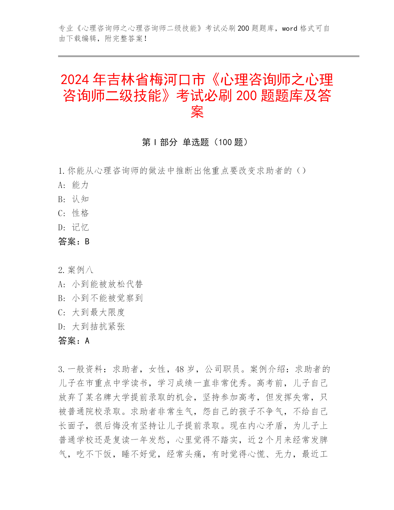 2024年吉林省梅河口市《心理咨询师之心理咨询师二级技能》考试必刷200题题库及答案