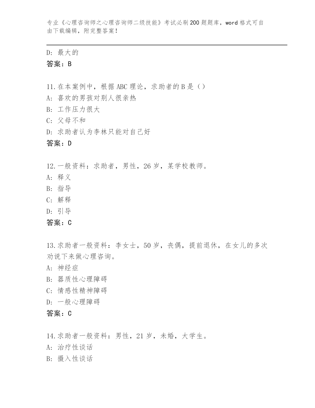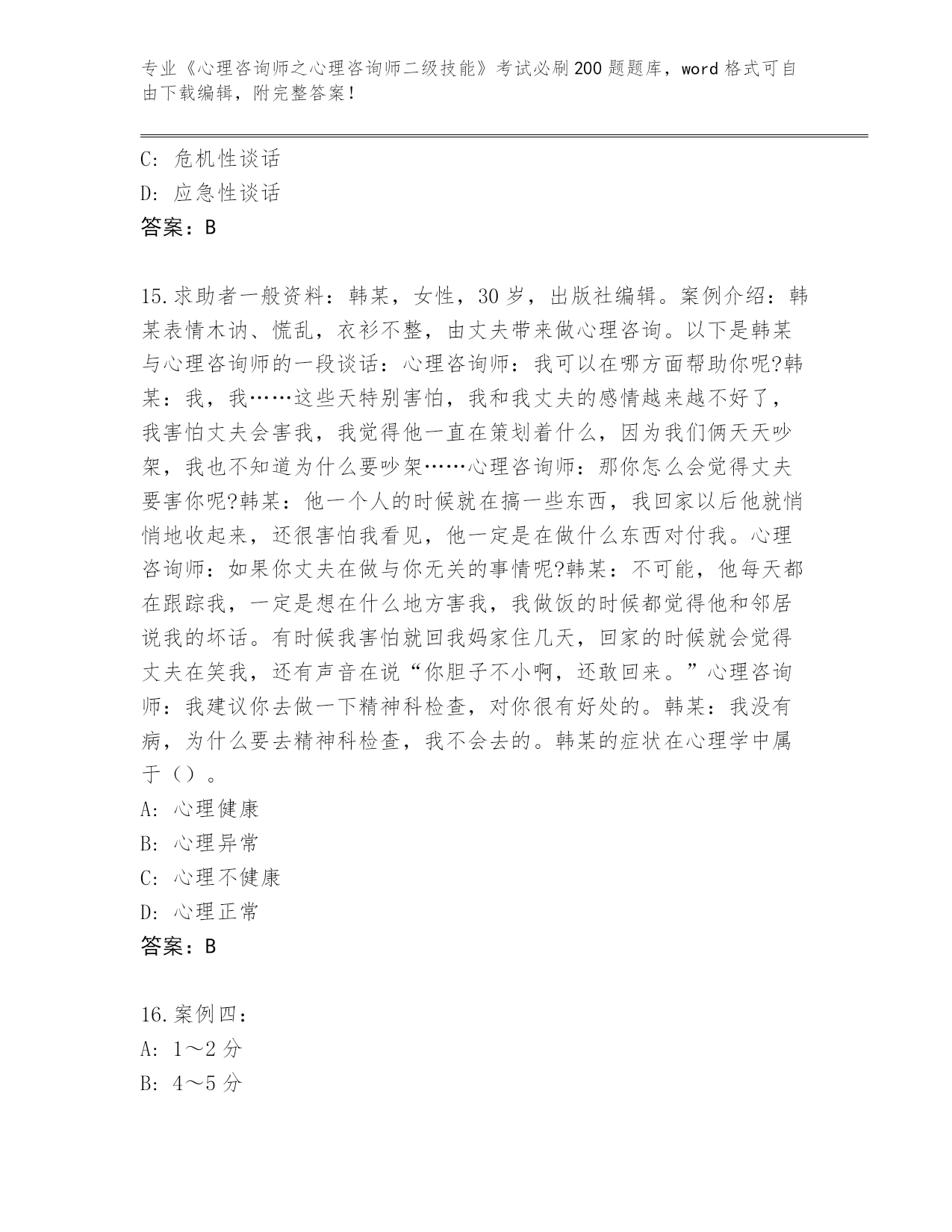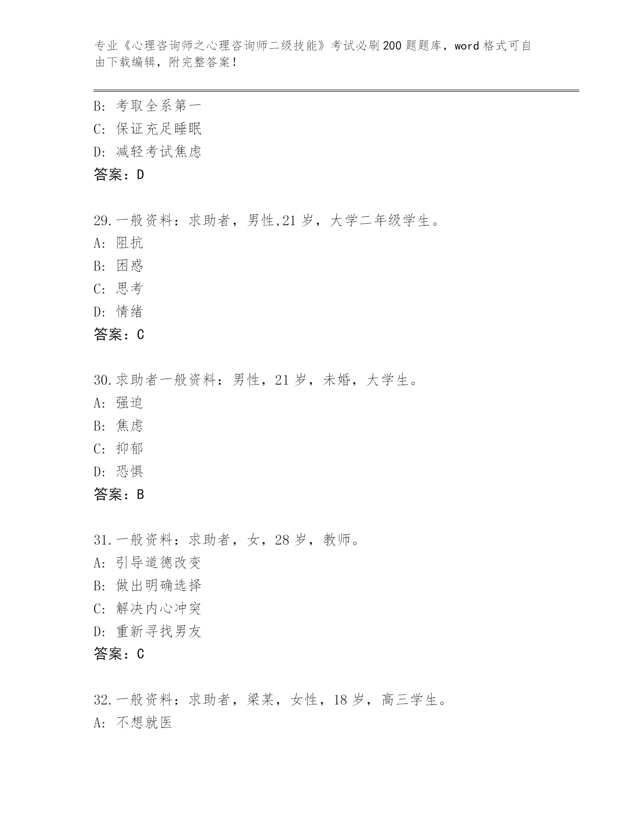 完整版吉林省梅河口市《心理咨询师之心理咨询师二级技能》考试必刷200题真题题库及答案(网校专用)