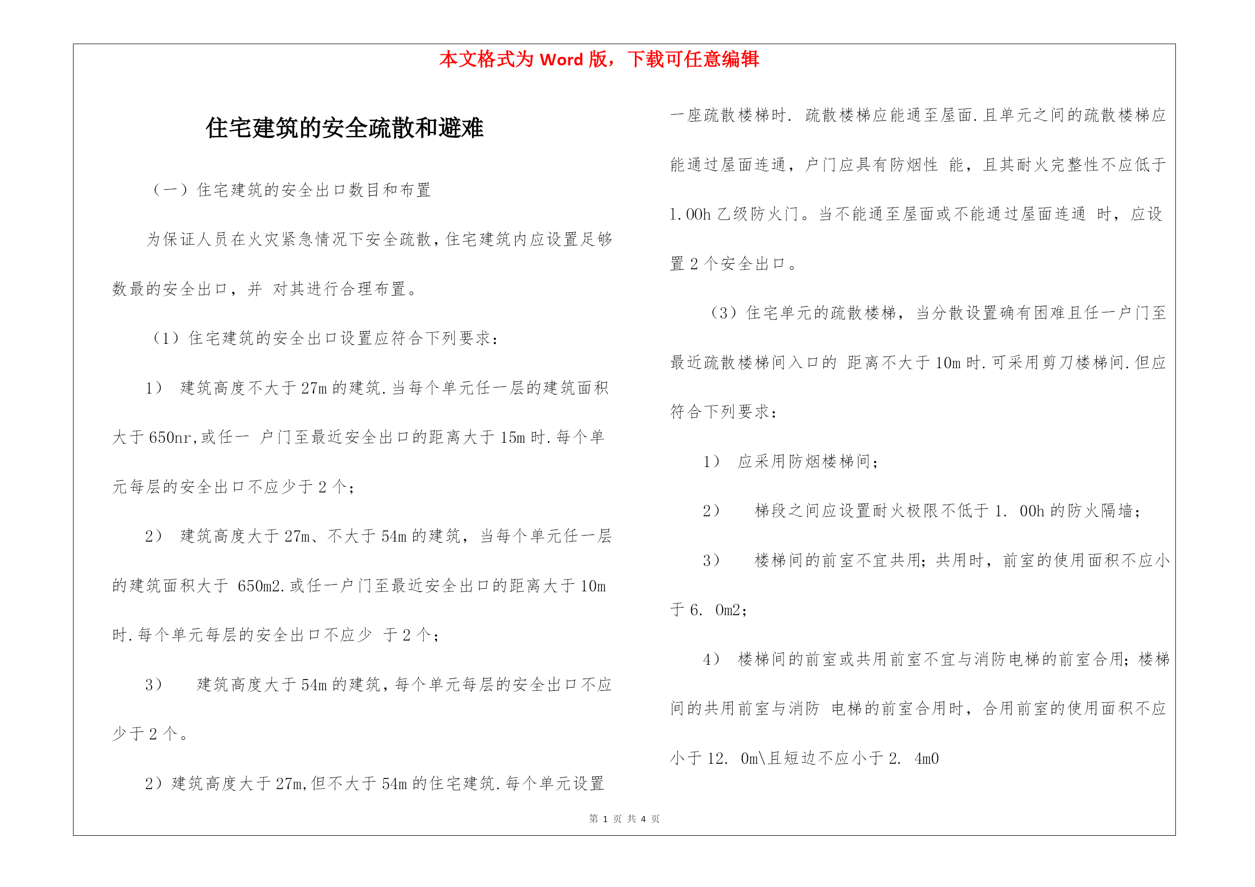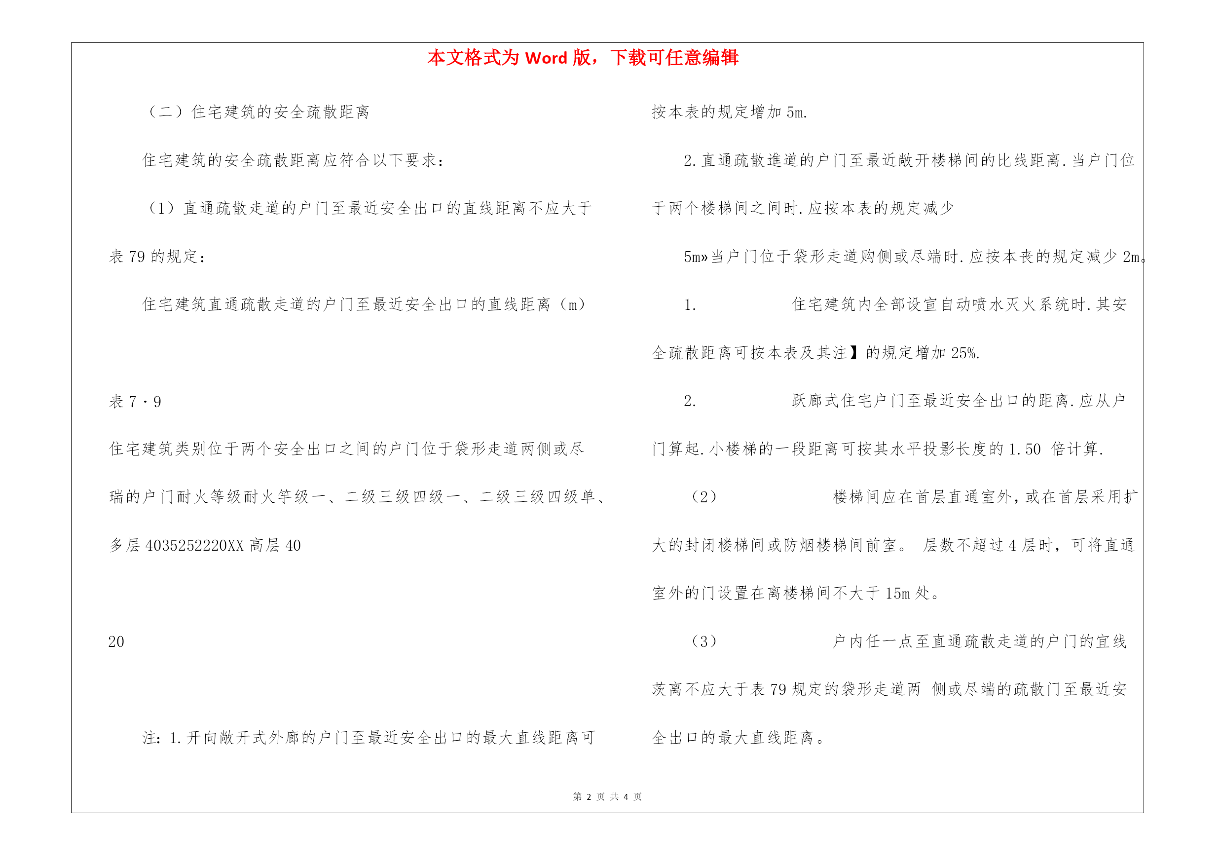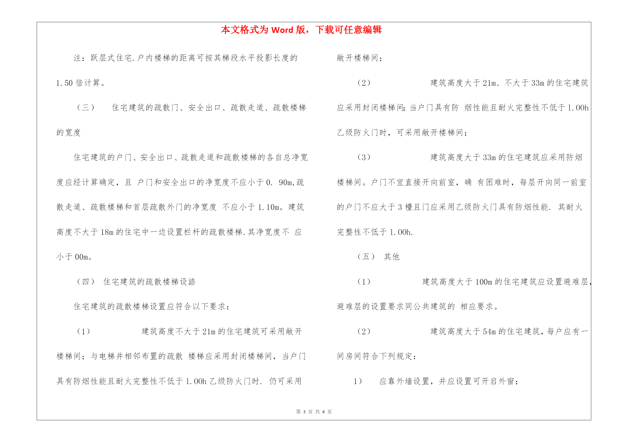 本文格式为Word版,下载可任意编辑第PAGE\*MERGEFORMAT4页共NUMPAGES\*MERGEFORMAT4页住宅建筑的安全疏散和避难(一)住宅建筑的安全出口数目和布置为保证人员在火灾紧急情况下安全疏散,住宅建筑内应设置足够数最的安全出口,并对其进行合理布置。(1)住宅建筑的安全出口设置应符合下列要求:1)建筑高度不大于27m的建筑.当每个单元任一层的建筑面积大于650nr,或任一户门至最近安全出口的距离大于15m时.每个单元每层的安全出口不应少于2个;2)建筑高度大于27m、不大于54m的建筑,当每个单元任一层的建筑面积大于650m2.或任一户门至最近安全出口的距离大于10m时.每个单元每层的安全出口不应少于2个;3)建筑高度大于54m的建筑,每个单元每层的安全岀口不应少于2个。2)建筑高度大于27m,但不大于54m的住宅建筑.每个单元设置一座疏散楼梯时.疏散楼梯应能通至屋面.且单元之间的疏散楼梯应能通过屋面连通,户门应具有防烟性能,且其耐火完整性不应低于l.OOh乙级防火门。当不能通至屋面或不能通过屋面连通时,应设置2个安全出口。(3)住宅单元的疏散楼梯,当分散设置确有困难且任一户门至最近疏散楼梯间入口的距离不大于10m时.可采用剪刀楼梯间.但应符合下列要求:1)应采用防烟楼梯间;2)梯段之间应设置耐火极限不低于1.00h的防火隔墙;3)楼梯间的前室不宜共用;共用时,前室的使用面积不应小于6.Om2;4)楼梯间的前室或共用前室不宜与消防电梯的前室合用;楼梯间的共用前室与消防电梯的前室合用时,合用前室的使用面积不应小于12.0m\且短边不应小于2.4m0(二)住宅建筑的安全疏散距离住宅建筑的安全疏散距离应符合以下要求:(1)直通疏散走道的户门至最近安全出口的直线距离不应大于表79的规定:住宅建筑直通疏散走道的户门至最近安全出口的直线距离(m)表7・9住宅建筑类别位于两个安全出口之间的户门位于袋形走道两侧或尽瑞的户门耐火等级耐火竽级一、二级三级四级一、二级三级四级单、多层4035252220XX高层4020注:1.开向敞开式外廊的户门至最近安全出口的最大直线距离可按本表的规定增加5m.2.直通疏散進道的户门至最近敞开楼梯间的比线距离.当户门位于两个楼梯间之间时.应按本表的规定减少5m»当户门位于袋形走道购侧或尽端时.应按本丧的规定减少2m。1.住宅建筑内全部设宣自动喷水灭火系统时.其安全疏散距离可按本表及其注】的規定增加25%.2.跃廊式住宅户门至最近安全出口的距离.应从户门算起.小楼梯的一段距离可按其水平投影长度的1.50倍计算.(2)楼梯间应在首层直通室外,或在首层采用扩大的封闭楼梯间或防烟楼梯间前室。层数不超过4层时,可将直通室外的门设置在离楼梯间不大于15m处。(3)户内任一点至直通疏散走道的户门的宜线茨离不应大于表79规定的袋形走道两侧或尽端的疏散门至最近安全岀口的最大直线距离。注:跃层式住宅.户内楼梯的距离可按其梯段水平投影长度的1.50倍计算。(三)住宅建筑的疏散门、安全出口、疏散走道、疏散楼梯的宽度住宅建筑的户门、安全出口、疏散走道和疏散楼梯的各自总净宽度应经计算确定,且户门和安全出口的净宽度不应小于0.90m,疏散走道、疏散楼梯和首层疏散外门的净宽度不应小于1.10m。建筑高度不大于18m的住宅中一边设置栏杆的疏散楼梯.其净宽度不应小于00m。(四)住宅建筑的疏散楼梯设誥住宅建筑的疏散楼梯设置应符合以下要求:(1)建筑高度不大于21m的住宅建筑可采用敞开楼梯间;与电梯井相邻布置的疏散楼梯应采用封闭楼梯间,当户门具有防烟性能且耐火完整性不低于l.OOh乙级防火门时.仍可采用敞开楼梯间;(2)建筑高度大于21m、不大于33m的住宅建筑应采用封闭楼梯间;当户门具有防烟性能且耐火完整性不低于l.OOh乙级防火门时,可采用敞开楼梯间;(3)建筑高度大于33m的住宅建筑应采用防烟楼梯间。户门不宜直接开向前室,确有困难时,每层开向同一前室的户门不应大于3檯且门应采用乙级防火门具有防烟性能.其耐火完整性不低于l.OOh.(五)其他(1)建筑高度大于100m的住宅建筑应设置避难层,避难层的设置要求同公共建筑的相应要求。(2)建筑高度大于54m的住宅建筑,每户应有一间房间符合下列规定:1)应靠外墙设置,并应设置可开启外窗;2)内、外墙体的耐火极限不应低于l.OOh,该房间门应采用乙级防火门具有防烟性能.其耐火完整性不宜低于l.OOh,外窗的耐火完整性不宜低于l.OOh。