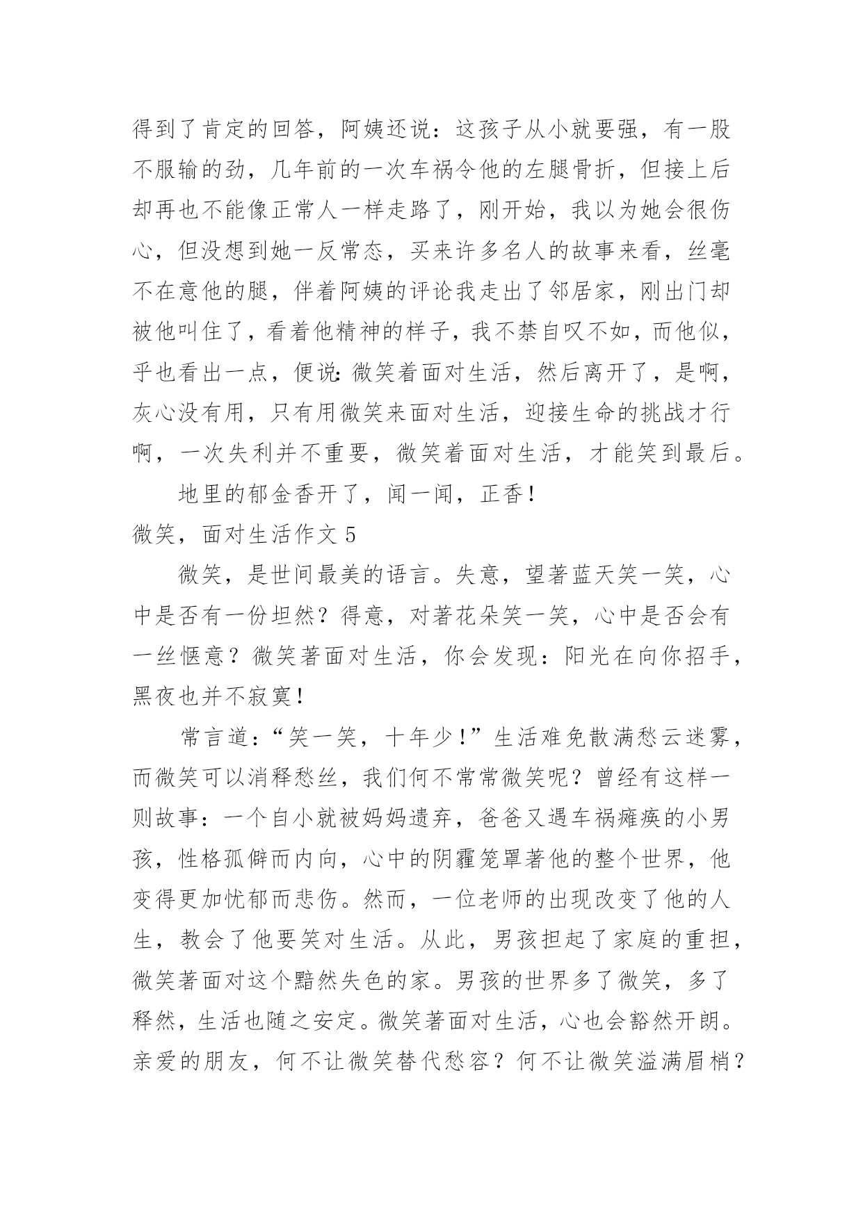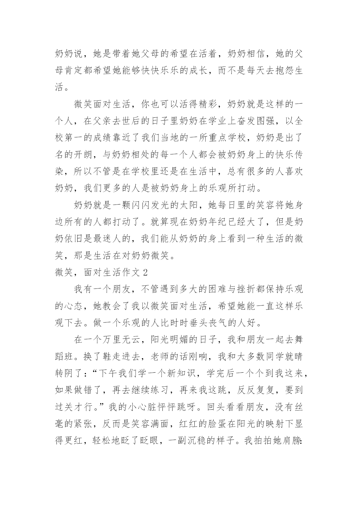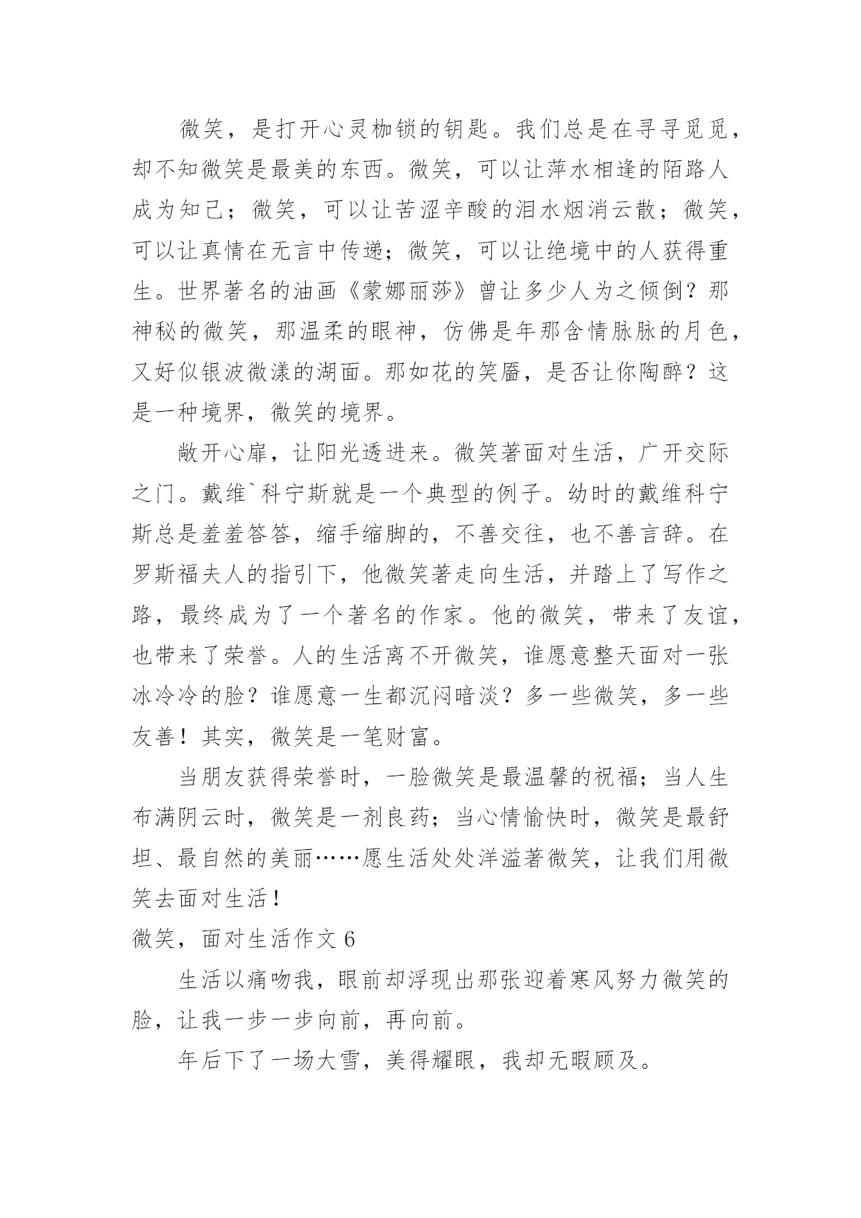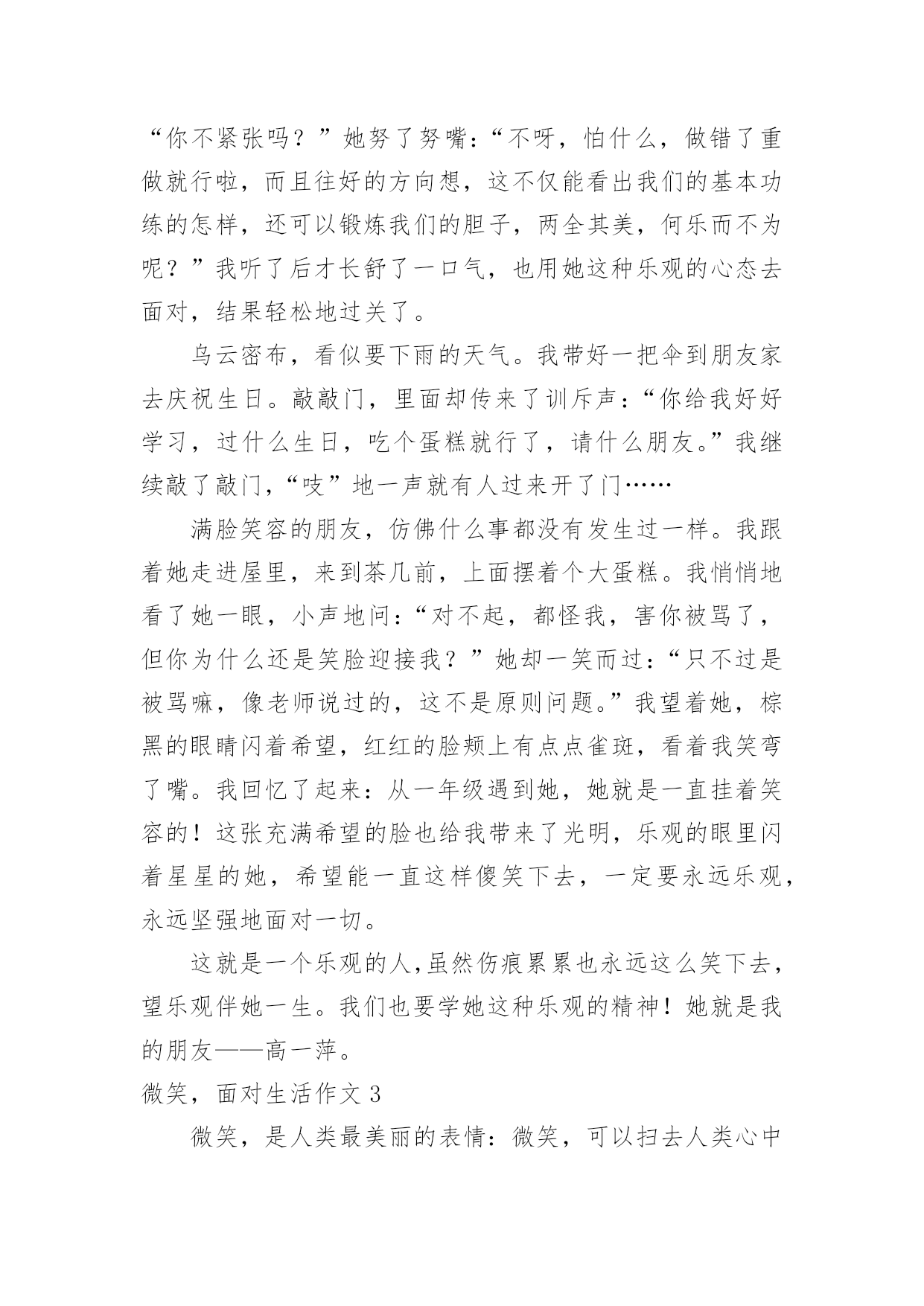 微笑,面对生活作文微笑,面对生活作文在日常的学习、工作、生活中,许多人都有过写作文的经历,对作文都不陌生吧,作文是由文字组成,经过人的思想考虑,通过语言组织来表达一个主题意义的文体。还是对作文一筹莫展吗?以下是小编收集整理的微笑,面对生活作文,仅供参考,欢迎大家阅读。微笑,面对生活作文1微笑面对生活,生活才会微笑面对我们。我们的生活中不仅有快乐,同样有许多悲伤的事情,面对快乐,我们自然以微笑面对,可是在面对我们生活中的困难时,我们要懂得坚强,不要悲观失望,我们仍旧要微笑面对我们生活中的一切困苦。我的奶奶天生就是一个积极乐观的人,可是奶奶的一生过得并不是很好,听爷爷说过奶奶很小的时候就失去了母亲,可是还没有等到奶奶长大,在奶奶十一二岁的时候,奶奶的父亲也离奶奶而去,接下的日子里,奶奶的生活过得如何可想而知。但是尽管如此,在这样多灾多难的生活中,奶奶还是没有失去对生活的希望,奶奶每天都微笑着面对着生活,奶奶说,生活其实对她很好,小时候虽然失去了母亲,但是父亲待她很好,失去父亲后,可家里的那些亲戚们也都对她很好,奶奶说,她是带着她父母的希望在活着,奶奶相信,她的父母肯定都希望她能够快快乐乐的成长,而不是每天去抱怨生活。微笑面对生活,你也可以活得精彩,奶奶就是这样的一个人,在父亲去世后的日子里奶奶在学业上奋发图强,以全校第一的成绩靠近了我们当地的一所重点学校,奶奶是出了名的开朗,与奶奶相处的每一个人都会被奶奶身上的快乐传染,所以不管是在学校里还是在生活中,总有很多的人喜欢奶奶,我们更多的人是被奶奶身上的乐观所打动。奶奶就是一颗闪闪发光的太阳,她每日里的笑容将她身边所有的人都打动了。就算现在奶奶年纪已经大了,但是奶奶依旧是最迷人的,我们能从奶奶的身上看到一种生活的微笑,那是生活在对奶奶微笑。微笑,面对生活作文2我有一个朋友,不管遇到多大的困难与挫折都保持乐观的心态,她教会了我以微笑面对生活,希望她能一直这样乐观下去。做一个乐观的人比时时垂头丧气的人好。在一个万里无云,阳光明媚的日子,我和朋友一起去舞蹈班。换了鞋走进去,老师的话刚响,我和大多数同学就晴转阴了:“下午我们学一个新知识,学完后一个个到我这来,如果做错了,再去继续练习,再来我这跳,反反复复,要到过关才行。”我的小心脏怦怦跳呀。回头看看朋友,没有丝毫的紧张,反而是笑容满面,红红的脸蛋在阳光的映射下显得更红,轻松地眨了眨眼,一副沉稳的样子。我拍拍她肩膀:“你不紧张吗?”她努了努嘴:“不呀,怕什么,做错了重做就行啦,而且往好的方向想,这不仅能看出我们的基本功练的怎样,还可以锻炼我们的胆子,两全其美,何乐而不为呢?”我听了后才长舒了一口气,也用她这种乐观的心态去面对,结果轻松地过关了。乌云密布,看似要下雨的天气。我带好一把伞到朋友家去庆祝生日。敲敲门,里面却传来了训斥声:“你给我好好学习,过什么生日,吃个蛋糕就行了,请什么朋友。”我继续敲了敲门,“吱”地一声就有人过来开了门……满脸笑容的朋友,仿佛什么事都没有发生过一样。我跟着她走进屋里,来到茶几前,上面摆着个大蛋糕。我悄悄地看了她一眼,小声地问:“对不起,都怪我,害你被骂了,但你为什么还是笑脸迎接我?”她却一笑而过:“只不过是被骂嘛,像老师说过的,这不是原则问题。”我望着她,棕黑的眼睛闪着希望,红红的脸颊上有点点雀斑,看着我笑弯了嘴。我回忆了起来:从一年级遇到她,她就是一直挂着笑容的!这张充满希望的脸也给我带来了光明,乐观的眼里闪着星星的她,希望能一直这样傻笑下去,一定要永远乐观,永远坚强地面对一切。这就是一个乐观的人,虽然伤痕累累也永远这么笑下去,望乐观伴她一生。我们也要学她这种乐观的精神!她就是我的朋友——高一萍。微笑,面对生活作文3微笑,是人类最美丽的表情:微笑,可以扫去人类心中的阴霾;微笑,可以让人感受幸福。如画般的童年在欢声笑语中度过,如诗般的年华在微笑中度过,微笑是生活的源泉,没有了微笑,生活还会多姿多彩吗?微笑,是生活的食粮。老师、亲人信任的微笑,朋友友情的微笑,陌生人和蔼可亲的微笑都可以牵动着你的心。你站在考场上,小鹿调皮地在你心中砰砰乱跳时,老师微笑地对你说:“相信自己,你能行!”或许,就是这个甜蜜的信任的微笑,这句温馨的话语,使你放下了沉重的包袱,带着满腹信心,轻松上阵。有人说:“要笑着面对生活,用新的眼光看待生活,用新的思想追求生活”。这句话妙极了。是啊,我们要有乐观的态度,不能与悲观常伴。生活是七色板,其中蕴涵着追梦的艰辛,成功的喜悦,挫折的苦痛,孤独的寂寞,这些都需要用微笑去面对。当你遇到挫折时,倘若只懂得退缩,只会被挫折击退,而没有勇于去面对,那么,你将会尝到挫折的苦痛,你应当微笑地面对挫折,勇敢地同它搏斗,战胜它,踩在它的头上,做它的主人,才是正确的。当你尝到孤独的寂寞时,或许是因为你和朋友发生了些许