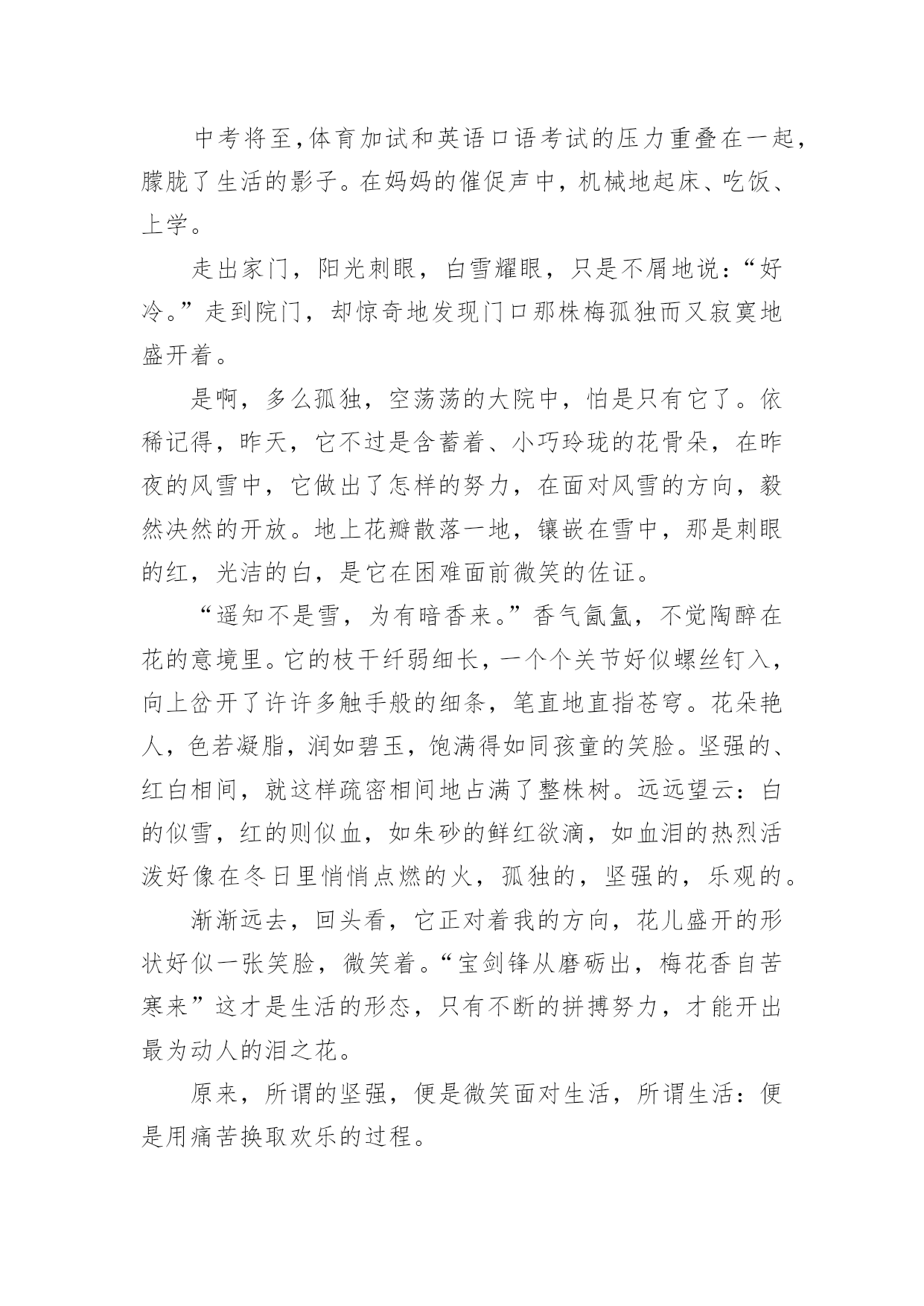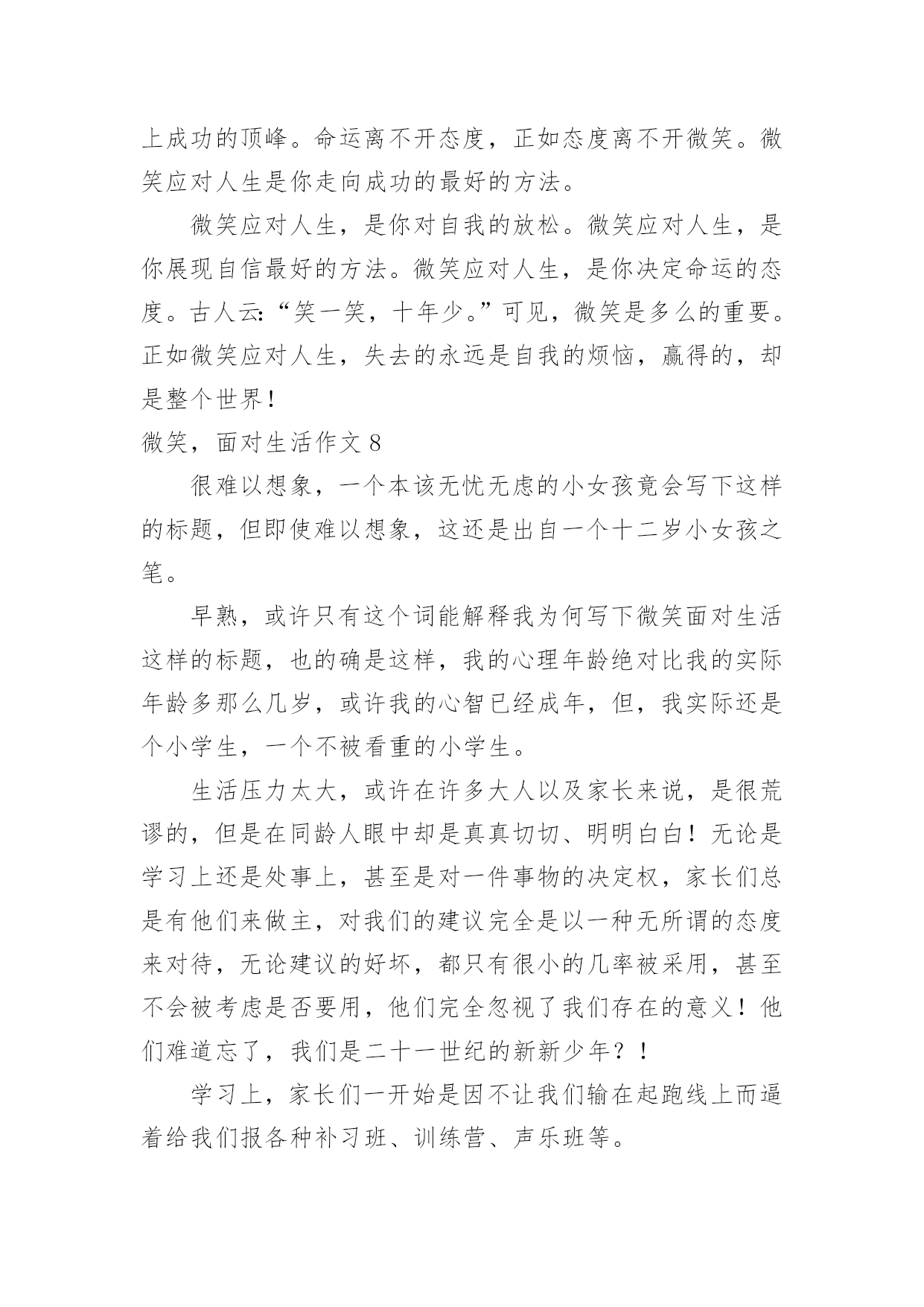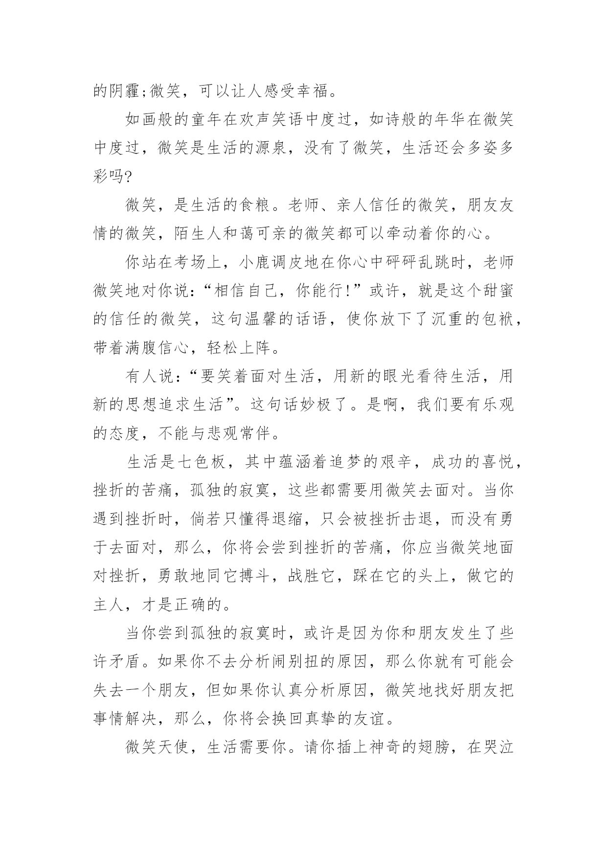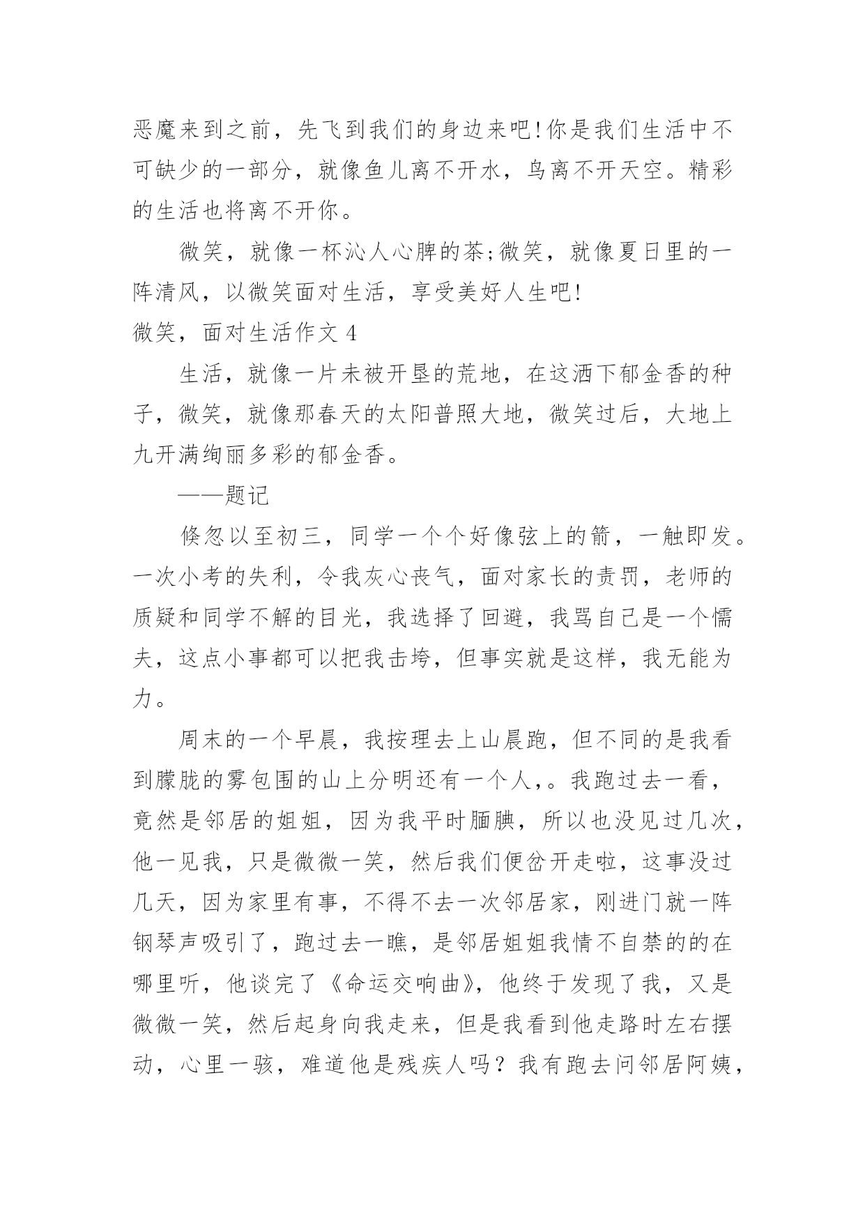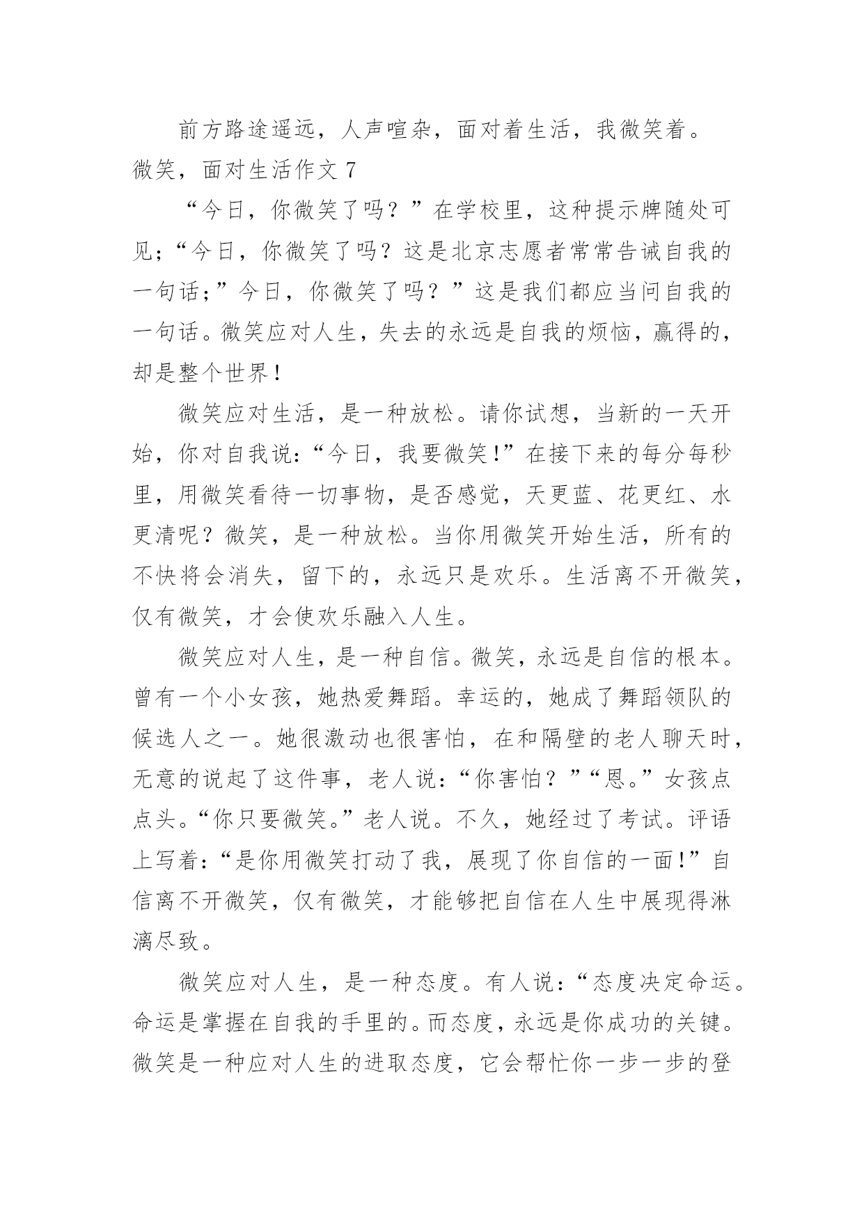 微笑,面对生活作文微笑,面对生活作文在日常的学习、工作、生活中,许多人都有过写作文的经历,对作文都不陌生吧,作文是由文字组成,经过人的思想考虑,通过语言组织来表达一个主题意义的文体。还是对作文一筹莫展吗?以下是小编收集整理的微笑,面对生活作文,仅供参考,欢迎大家阅读。微笑,面对生活作文1微笑面对生活,生活才会微笑面对我们。我们的生活中不仅有快乐,同样有许多悲伤的事情,面对快乐,我们自然以微笑面对,可是在面对我们生活中的困难时,我们要懂得坚强,不要悲观失望,我们仍旧要微笑面对我们生活中的一切困苦。我的奶奶天生就是一个积极乐观的人,可是奶奶的一生过得并不是很好,听爷爷说过奶奶很小的时候就失去了母亲,可是还没有等到奶奶长大,在奶奶十一二岁的时候,奶奶的父亲也离奶奶而去,接下的日子里,奶奶的生活过得如何可想而知。但是尽管如此,在这样多灾多难的生活中,奶奶还是没有失去对生活的希望,奶奶每天都微笑着面对着生活,奶奶说,生活其实对她很好,小时候虽然失去了母亲,但是父亲待她很好,失去父亲后,可家里的那些亲戚们也都对她很好,奶奶说,她是带着她父母的希望在活着,奶奶相信,她的父母肯定都希望她能够快快乐乐的成长,而不是每天去抱怨生活。微笑面对生活,你也可以活得精彩,奶奶就是这样的一个人,在父亲去世后的日子里奶奶在学业上奋发图强,以全校第一的成绩靠近了我们当地的一所重点学校,奶奶是出了名的开朗,与奶奶相处的每一个人都会被奶奶身上的快乐传染,所以不管是在学校里还是在生活中,总有很多的人喜欢奶奶,我们更多的人是被奶奶身上的乐观所打动。奶奶就是一颗闪闪发光的太阳,她每日里的笑容将她身边所有的人都打动了。就算现在奶奶年纪已经大了,但是奶奶依旧是最迷人的,我们能从奶奶的身上看到一种生活的微笑,那是生活在对奶奶微笑。微笑,面对生活作文2我有一个朋友,不管遇到多大的困难与挫折都保持乐观的心态,她教会了我以微笑面对生活,希望她能一直这样乐观下去。做一个乐观的人比时时垂头丧气的人好。在一个万里无云,阳光明媚的日子,我和朋友一起去舞蹈班。换了鞋走进去,老师的话刚响,我和大多数同学就晴转阴了:“下午我们学一个新知识,学完后一个个到我这来,如果做错了,再去继续练习,再来我这跳,反反复复,要到过关才行。”我的小心脏怦怦跳呀。回头看看朋友,没有丝毫的紧张,反而是笑容满面,红红的脸蛋在阳光的映射下显得更红,轻松地眨了眨眼,一副沉稳的样子。我拍拍她肩膀:“你不紧张吗?”她努了努嘴:“不呀,怕什么,做错了重做就行啦,而且往好的方向想,这不仅能看出我们的基本功练的怎样,还可以锻炼我们的胆子,两全其美,何乐而不为呢?”我听了后才长舒了一口气,也用她这种乐观的心态去面对,结果轻松地过关了。乌云密布,看似要下雨的天气。我带好一把伞到朋友家去庆祝生日。敲敲门,里面却传来了训斥声:“你给我好好学习,过什么生日,吃个蛋糕就行了,请什么朋友。”我继续敲了敲门,“吱”地一声就有人过来开了门……满脸笑容的朋友,仿佛什么事都没有发生过一样。我跟着她走进屋里,来到茶几前,上面摆着个大蛋糕。我悄悄地看了她一眼,小声地问:“对不起,都怪我,害你被骂了,但你为什么还是笑脸迎接我?”她却一笑而过:“只不过是被骂嘛,像老师说过的,这不是原则问题。”我望着她,棕黑的眼睛闪着希望,红红的脸颊上有点点雀斑,看着我笑弯了嘴。我回忆了起来:从一年级遇到她,她就是一直挂着笑容的!这张充满希望的脸也给我带来了光明,乐观的眼里闪着星星的她,希望能一直这样傻笑下去,一定要永远乐观,永远坚强地面对一切。这就是一个乐观的人,虽然伤痕累累也永远这么笑下去,望乐观伴她一生。我们也要学她这种乐观的精神!她就是我的朋友——高一萍。微笑,面对生活作文3微笑,是人类最美丽的表情:微笑,可以扫去人类心中的阴霾;微笑,可以让人感受幸福。如画般的童年在欢声笑语中度过,如诗般的年华在微笑中度过,微笑是生活的源泉,没有了微笑,生活还会多姿多彩吗?微笑,是生活的食粮。老师、亲人信任的微笑,朋友友情的微笑,陌生人和蔼可亲的微笑都可以牵动着你的心。你站在考场上,小鹿调皮地在你心中砰砰乱跳时,老师微笑地对你说:“相信自己,你能行!”或许,就是这个甜蜜的信任的微笑,这句温馨的话语,使你放下了沉重的包袱,带着满腹信心,轻松上阵。有人说:“要笑着面对生活,用新的眼光看待生活,用新的思想追求生活”。这句话妙极了。是啊,我们要有乐观的态度,不能与悲观常伴。生活是七色板,其中蕴涵着追梦的艰辛,成功的喜悦,挫折的苦痛,孤独的寂寞,这些都需要用微笑去面对。当你遇到挫折时,倘若只懂得退缩,只会被挫折击退,而没有勇于去面对,那么,你将会尝到挫折的苦痛,你应当微笑地面对挫折,勇敢地同它搏斗,战胜它,踩在它的头上,做它的主人,才是正确的。当你尝到孤独的寂寞时,或许是因为你和朋友发生了些许