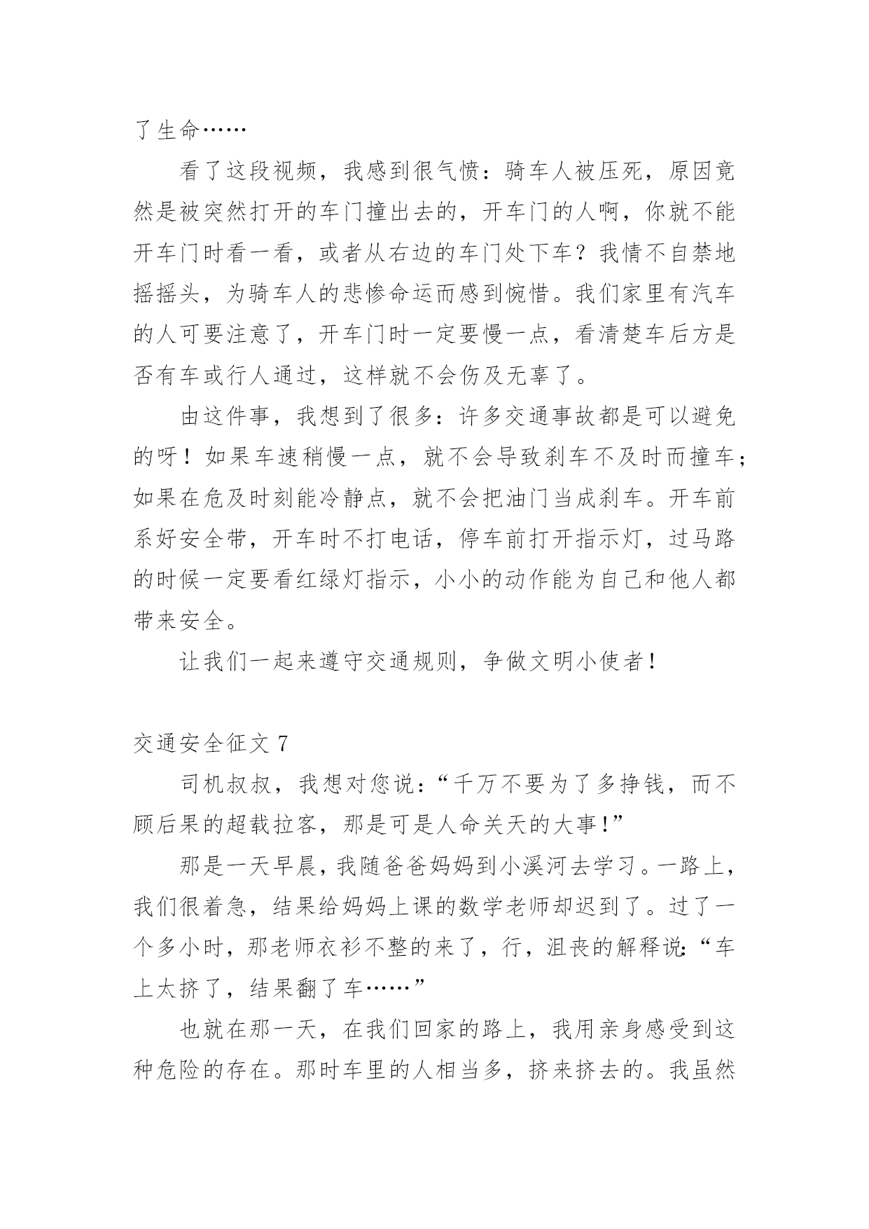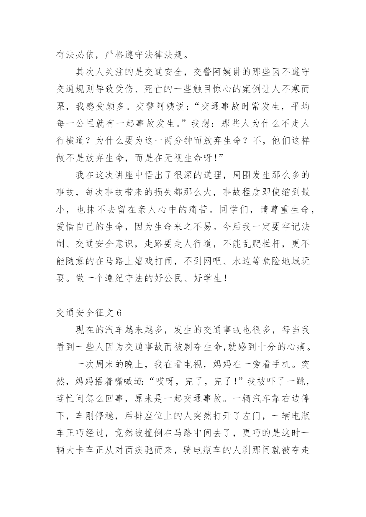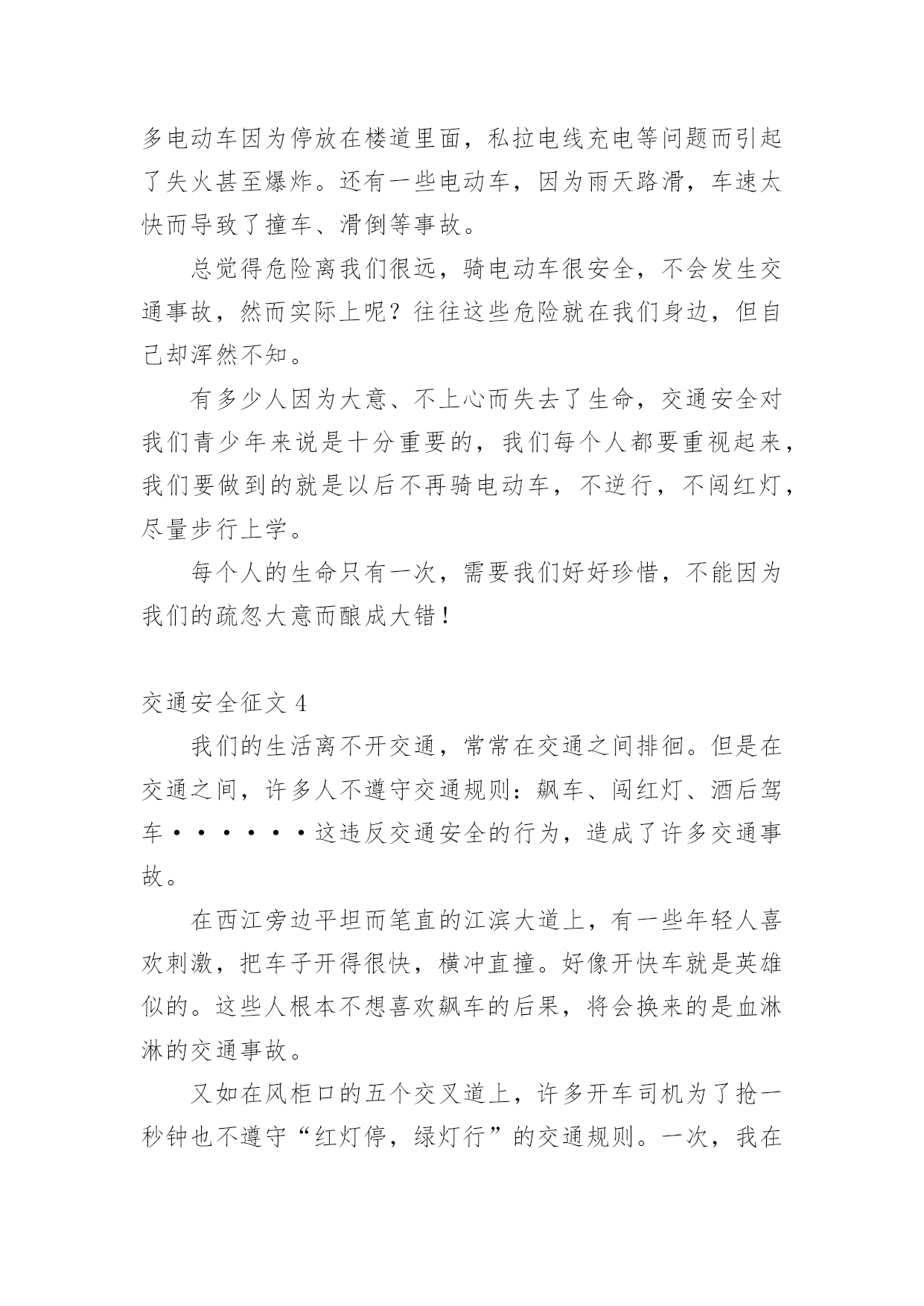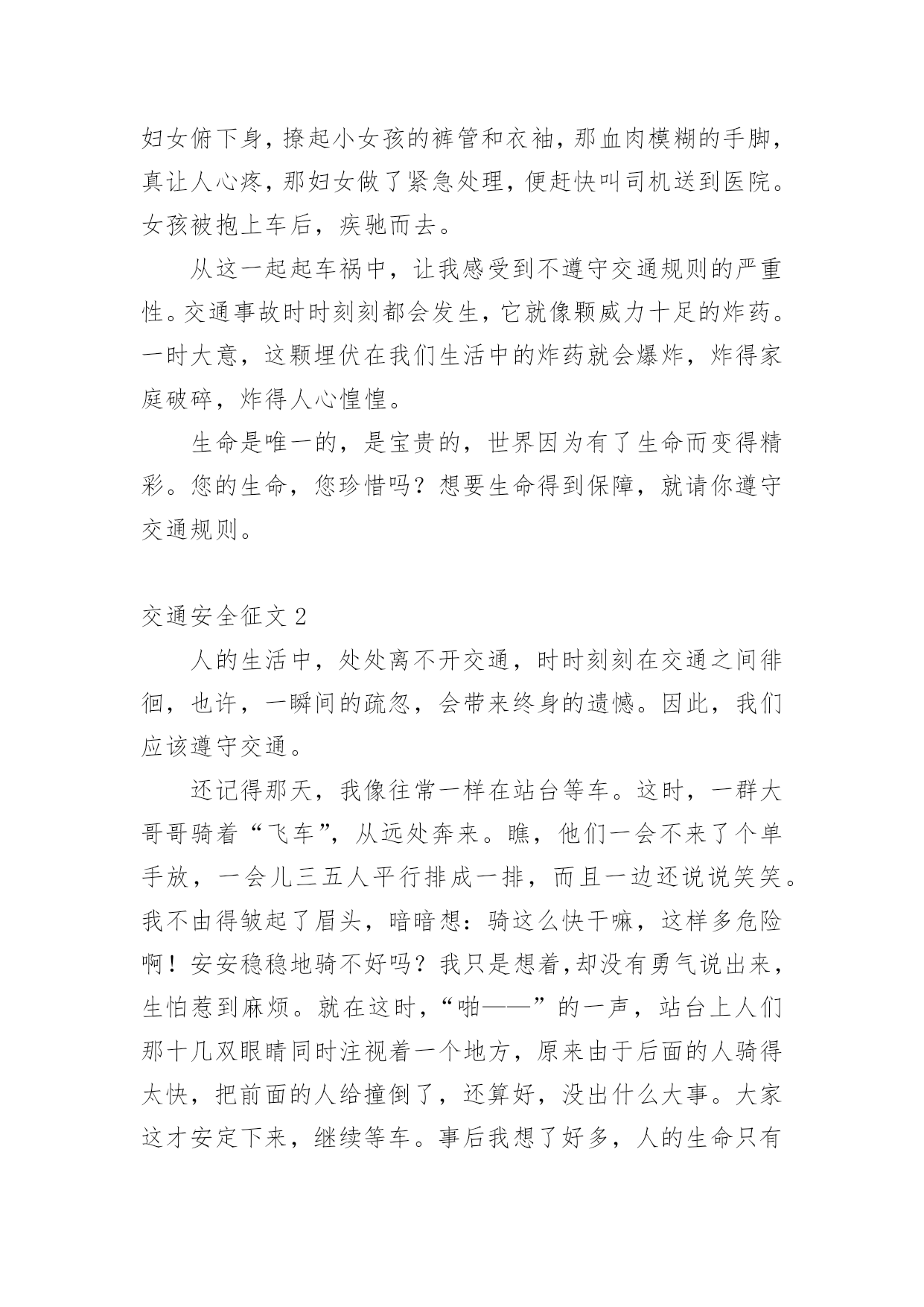 交通安全征文交通安全征文范文(通用16篇)在我们平凡的日常里,大家对征文都不陌生吧,借助征文人们可以反映客观事物、表达思想感情、传递知识信息。那么你有了解过征文吗?下面是小编收集整理的交通安全征文范文(通用16篇),欢迎大家分享。交通安全征文1随着社会的飞速发展,生活、工作的节奏也是愈来愈快,汽车成了人们的主要工具。街上的车辆逐渐增多,在你的面前疾驰而过,也许就在这时,因为您的疏忽或是违规,会给交通带来不便,也会让你的心灵蒙上一层阴影。汽车给我们带来的灾祸数不胜数,马路上上演的悲剧真是一幕又一幕。为什么会这样呢?那都是因为人们不遵守交通规则。记得去年就有一次,我与家人在广场四周散步。忽然,一辆白色面包车与一辆摩托车相撞上了。听路人说才知道,原来是摩托车车主在朋友的酒宴上喝多了,大醉酩酊骑着的骑着摩托车乱窜,不时还逆道行驶。正在这时,就撞上了那辆面包车摩托车车主抢救不成功,死亡了,而面包车车头有些凹陷,车主并无大碍。还有一次一个年轻的司机不遵守交通规则,撞倒了一个小女孩。那小女孩脸色苍白,胸脯急促的起伏着,过了好一会儿,才“哇”地哭了起来,年轻司机慌了,旁边一位中年妇女俯下身,撩起小女孩的裤管和衣袖,那血肉模糊的手脚,真让人心疼,那妇女做了紧急处理,便赶快叫司机送到医院。女孩被抱上车后,疾驰而去。从这一起起车祸中,让我感受到不遵守交通规则的严重性。交通事故时时刻刻都会发生,它就像颗威力十足的炸药。一时大意,这颗埋伏在我们生活中的炸药就会爆炸,炸得家庭破碎,炸得人心惶惶。生命是唯一的,是宝贵的,世界因为有了生命而变得精彩。您的生命,您珍惜吗?想要生命得到保障,就请你遵守交通规则。交通安全征文2人的生活中,处处离不开交通,时时刻刻在交通之间徘徊,也许,一瞬间的疏忽,会带来终身的遗憾。因此,我们应该遵守交通。还记得那天,我像往常一样在站台等车。这时,一群大哥哥骑着“飞车”,从远处奔来。瞧,他们一会不来了个单手放,一会儿三五人平行排成一排,而且一边还说说笑笑。我不由得皱起了眉头,暗暗想:骑这么快干嘛,这样多危险啊!安安稳稳地骑不好吗?我只是想着,却没有勇气说出来,生怕惹到麻烦。就在这时,“啪——”的一声,站台上人们那十几双眼睛同时注视着一个地方,原来由于后面的人骑得太快,把前面的人给撞倒了,还算好,没出什么大事。大家这才安定下来,继续等车。事后我想了好多,人的生命只有一次,一旦失去,就不再拥有了,如果大家能深深铭刻,不要为了自己的所求而去违反交通规则,那么可以避免多少灾难。俗话说:车祸猛于虎。一次次的惨剧都在向人们敲起警钟,不要为了快几秒,而失去你一生的时间!我还记得,在一个炎热的夏天的早晨,爸爸正开着车,忽然间的一刹那,由于一辆小汽车不守交通安全,撞在了我身旁的小汽车,我顿时吓了一大跳:车头被撞得惨不忍睹。我们要遵守交通规则,安全行驶,才能避免这些事故的发生,健康成长。交通安全征文3关于交通安全问题,学校很是重视,不止一遍的强调,不让同学们骑电动车上学,不逆行,不闯红灯……学校为此,以前还让我们写过保证书。每年因为电动车所出的安全事故已经不在少数,而且不仅仅是电动车,三轮,四轮也占较大的比例,可是很多同学却依旧不把安全放在心上。前不久规定的四轮电动车必须上牌照才能上路后,昨天各个工作群,小区群又发了通知,所有两轮电动车也必须上牌照,车主要佩戴头盔才可以上路。是有点突然,但是这毕竟是为了大家的安全。继续说交通安全问题,下午的班会就是关于此主题。谢老师让我们观看了两个关于电动车事故的视频,视频中,许多电动车因为停放在楼道里面,私拉电线充电等问题而引起了失火甚至爆炸。还有一些电动车,因为雨天路滑,车速太快而导致了撞车、滑倒等事故。总觉得危险离我们很远,骑电动车很安全,不会发生交通事故,然而实际上呢?往往这些危险就在我们身边,但自己却浑然不知。有多少人因为大意、不上心而失去了生命,交通安全对我们青少年来说是十分重要的,我们每个人都要重视起来,我们要做到的就是以后不再骑电动车,不逆行,不闯红灯,尽量步行上学。每个人的生命只有一次,需要我们好好珍惜,不能因为我们的疏忽大意而酿成大错!交通安全征文4我们的生活离不开交通,常常在交通之间排徊。但是在交通之间,许多人不遵守交通规则:飙车、闯红灯、酒后驾车······这违反交通安全的行为,造成了许多交通事故。在西江旁边平坦而笔直的江滨大道上,有一些年轻人喜欢刺激,把车子开得很快,横冲直撞。好像开快车就是英雄似的。这些人根本不想喜欢飙车的后果,将会换来的是血淋淋的交通事故。又如在风柜口的五个交叉道上,许多开车司机为了抢一秒钟也不遵守“红灯停,绿灯行”的交通规则。一次,我在风柜口过斑马线。人行道的绿灯亮了,我刚迈出一步,突然,一辆“别克”汽车开着大喇叭冲向路口。我吓得心惊胆颤,赶紧网里多了回去。这真所谓是