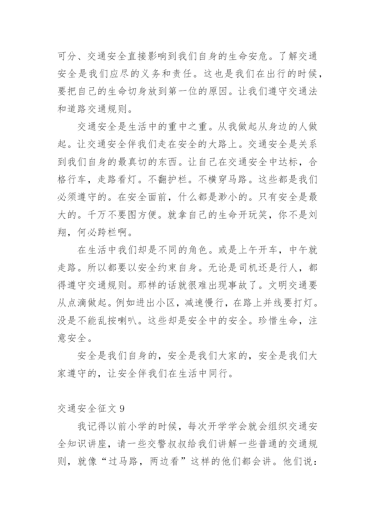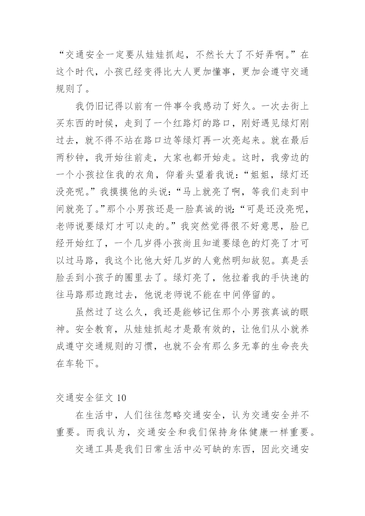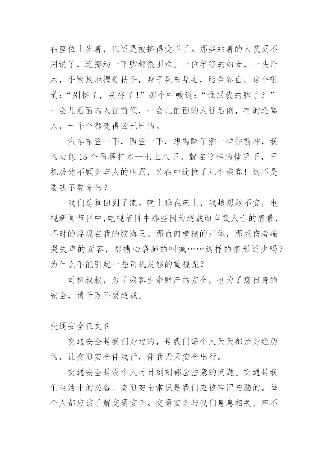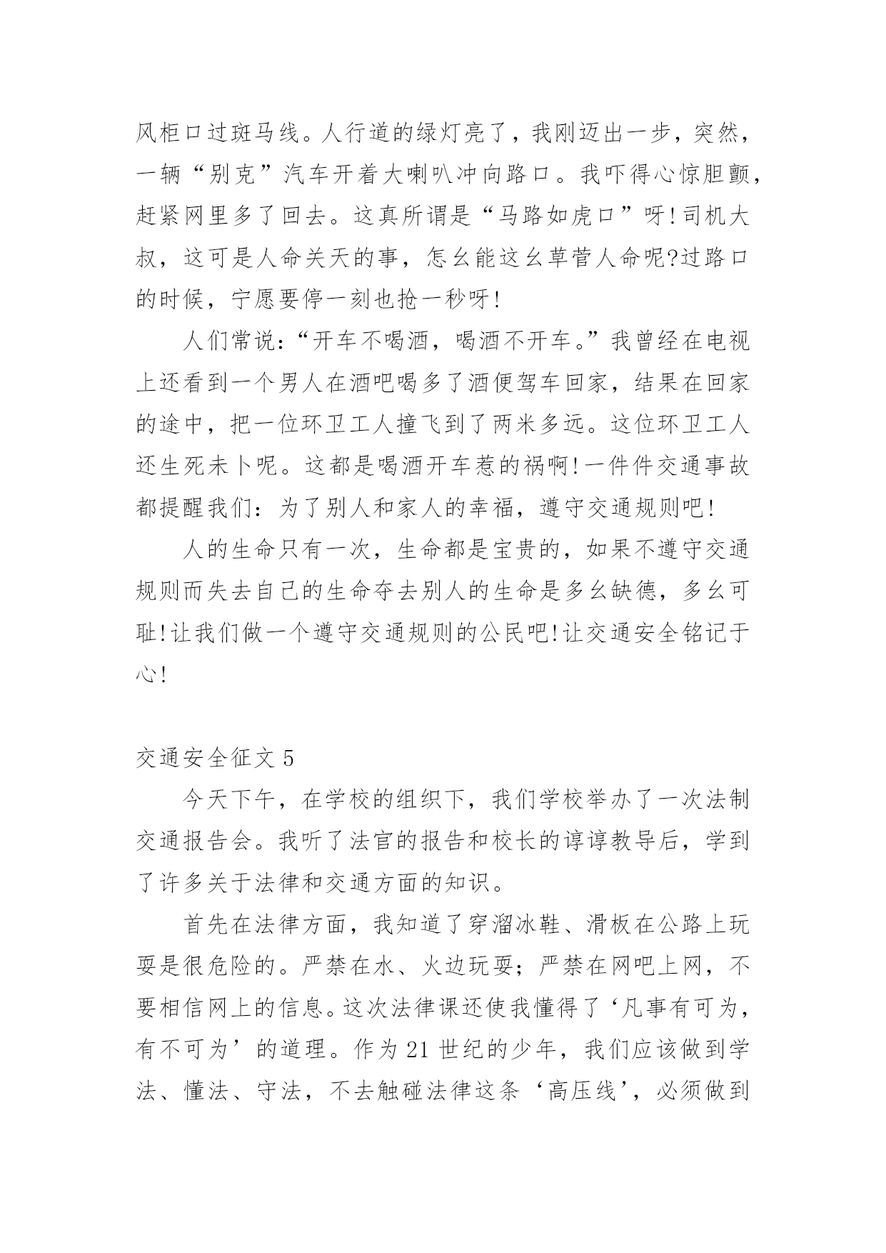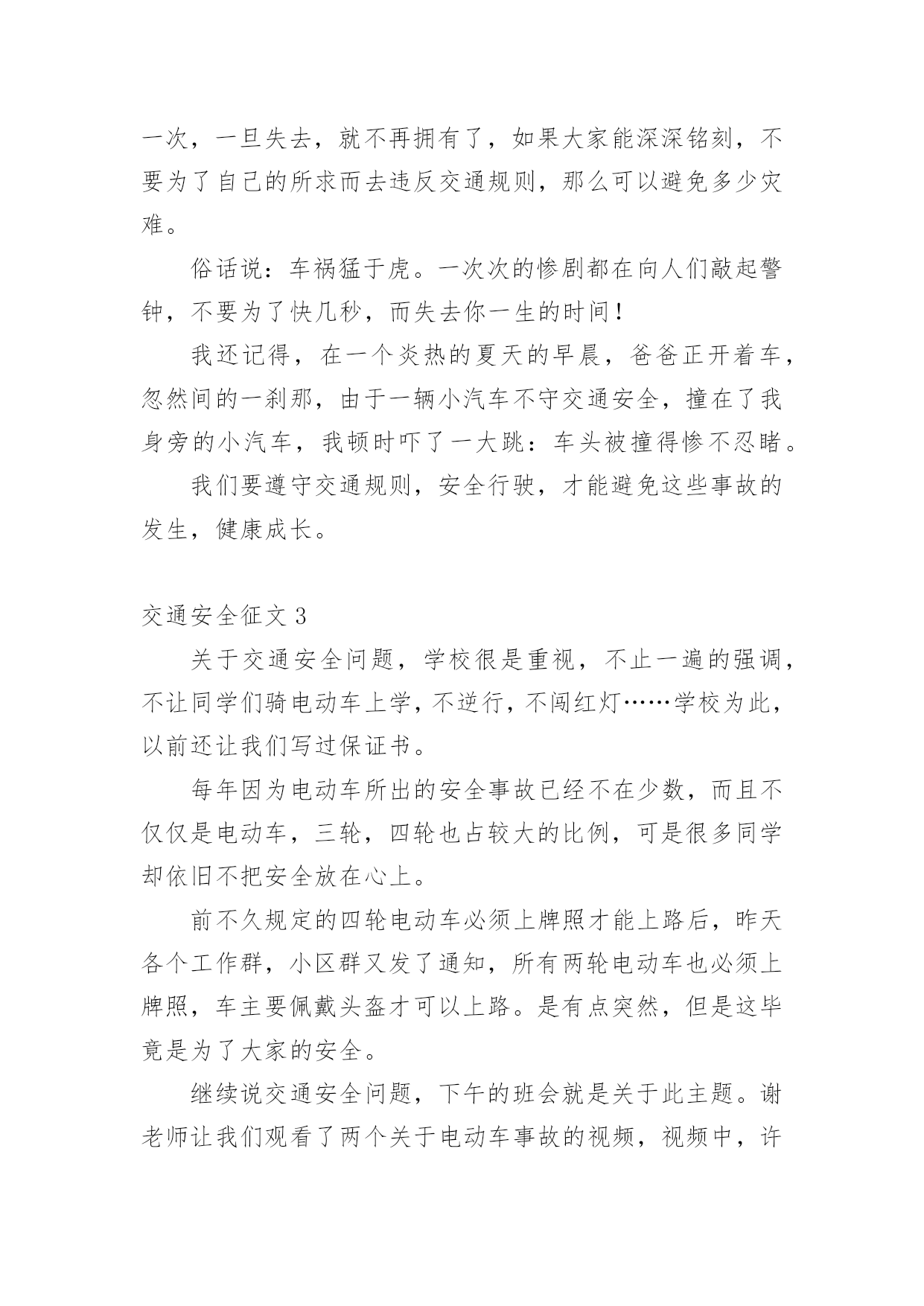 交通安全征文交通安全征文范文(通用16篇)在我们平凡的日常里,大家对征文都不陌生吧,借助征文人们可以反映客观事物、表达思想感情、传递知识信息。那么你有了解过征文吗?下面是小编收集整理的交通安全征文范文(通用16篇),欢迎大家分享。交通安全征文1随着社会的飞速发展,生活、工作的节奏也是愈来愈快,汽车成了人们的主要工具。街上的车辆逐渐增多,在你的面前疾驰而过,也许就在这时,因为您的疏忽或是违规,会给交通带来不便,也会让你的心灵蒙上一层阴影。汽车给我们带来的灾祸数不胜数,马路上上演的悲剧真是一幕又一幕。为什么会这样呢?那都是因为人们不遵守交通规则。记得去年就有一次,我与家人在广场四周散步。忽然,一辆白色面包车与一辆摩托车相撞上了。听路人说才知道,原来是摩托车车主在朋友的酒宴上喝多了,大醉酩酊骑着的骑着摩托车乱窜,不时还逆道行驶。正在这时,就撞上了那辆面包车摩托车车主抢救不成功,死亡了,而面包车车头有些凹陷,车主并无大碍。还有一次一个年轻的司机不遵守交通规则,撞倒了一个小女孩。那小女孩脸色苍白,胸脯急促的起伏着,过了好一会儿,才“哇”地哭了起来,年轻司机慌了,旁边一位中年妇女俯下身,撩起小女孩的裤管和衣袖,那血肉模糊的手脚,真让人心疼,那妇女做了紧急处理,便赶快叫司机送到医院。女孩被抱上车后,疾驰而去。从这一起起车祸中,让我感受到不遵守交通规则的严重性。交通事故时时刻刻都会发生,它就像颗威力十足的炸药。一时大意,这颗埋伏在我们生活中的炸药就会爆炸,炸得家庭破碎,炸得人心惶惶。生命是唯一的,是宝贵的,世界因为有了生命而变得精彩。您的生命,您珍惜吗?想要生命得到保障,就请你遵守交通规则。交通安全征文2人的生活中,处处离不开交通,时时刻刻在交通之间徘徊,也许,一瞬间的疏忽,会带来终身的遗憾。因此,我们应该遵守交通。还记得那天,我像往常一样在站台等车。这时,一群大哥哥骑着“飞车”,从远处奔来。瞧,他们一会不来了个单手放,一会儿三五人平行排成一排,而且一边还说说笑笑。我不由得皱起了眉头,暗暗想:骑这么快干嘛,这样多危险啊!安安稳稳地骑不好吗?我只是想着,却没有勇气说出来,生怕惹到麻烦。就在这时,“啪——”的一声,站台上人们那十几双眼睛同时注视着一个地方,原来由于后面的人骑得太快,把前面的人给撞倒了,还算好,没出什么大事。大家这才安定下来,继续等车。事后我想了好多,人的生命只有一次,一旦失去,就不再拥有了,如果大家能深深铭刻,不要为了自己的所求而去违反交通规则,那么可以避免多少灾难。俗话说:车祸猛于虎。一次次的惨剧都在向人们敲起警钟,不要为了快几秒,而失去你一生的时间!我还记得,在一个炎热的夏天的早晨,爸爸正开着车,忽然间的一刹那,由于一辆小汽车不守交通安全,撞在了我身旁的小汽车,我顿时吓了一大跳:车头被撞得惨不忍睹。我们要遵守交通规则,安全行驶,才能避免这些事故的发生,健康成长。交通安全征文3关于交通安全问题,学校很是重视,不止一遍的强调,不让同学们骑电动车上学,不逆行,不闯红灯……学校为此,以前还让我们写过保证书。每年因为电动车所出的安全事故已经不在少数,而且不仅仅是电动车,三轮,四轮也占较大的比例,可是很多同学却依旧不把安全放在心上。前不久规定的四轮电动车必须上牌照才能上路后,昨天各个工作群,小区群又发了通知,所有两轮电动车也必须上牌照,车主要佩戴头盔才可以上路。是有点突然,但是这毕竟是为了大家的安全。继续说交通安全问题,下午的班会就是关于此主题。谢老师让我们观看了两个关于电动车事故的视频,视频中,许多电动车因为停放在楼道里面,私拉电线充电等问题而引起了失火甚至爆炸。还有一些电动车,因为雨天路滑,车速太快而导致了撞车、滑倒等事故。总觉得危险离我们很远,骑电动车很安全,不会发生交通事故,然而实际上呢?往往这些危险就在我们身边,但自己却浑然不知。有多少人因为大意、不上心而失去了生命,交通安全对我们青少年来说是十分重要的,我们每个人都要重视起来,我们要做到的就是以后不再骑电动车,不逆行,不闯红灯,尽量步行上学。每个人的生命只有一次,需要我们好好珍惜,不能因为我们的疏忽大意而酿成大错!交通安全征文4我们的生活离不开交通,常常在交通之间排徊。但是在交通之间,许多人不遵守交通规则:飙车、闯红灯、酒后驾车······这违反交通安全的行为,造成了许多交通事故。在西江旁边平坦而笔直的江滨大道上,有一些年轻人喜欢刺激,把车子开得很快,横冲直撞。好像开快车就是英雄似的。这些人根本不想喜欢飙车的后果,将会换来的是血淋淋的交通事故。又如在风柜口的五个交叉道上,许多开车司机为了抢一秒钟也不遵守“红灯停,绿灯行”的交通规则。一次,我在风柜口过斑马线。人行道的绿灯亮了,我刚迈出一步,突然,一辆“别克”汽车开着大喇叭冲向路口。我吓得心惊胆颤,赶紧网里多了回去。这真所谓是