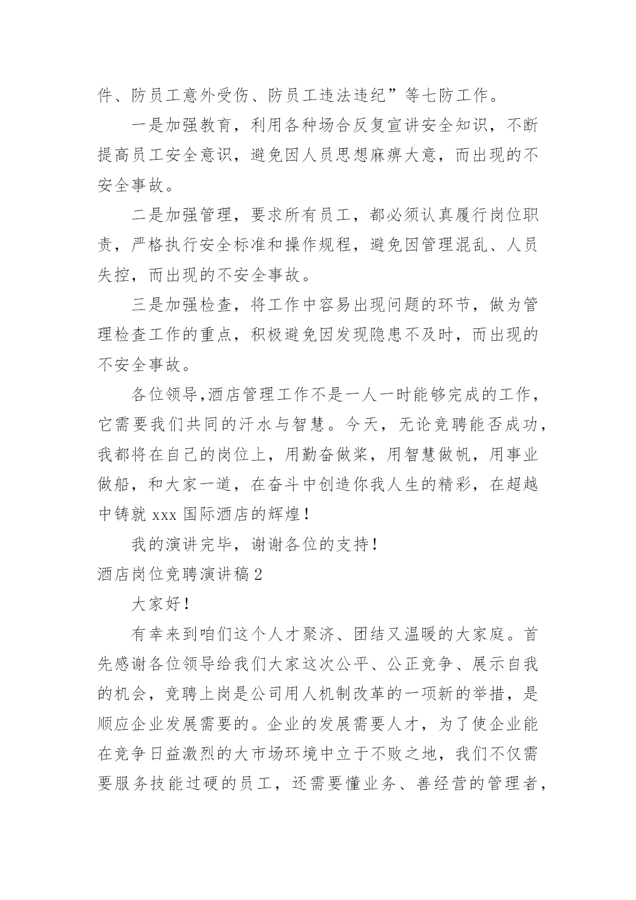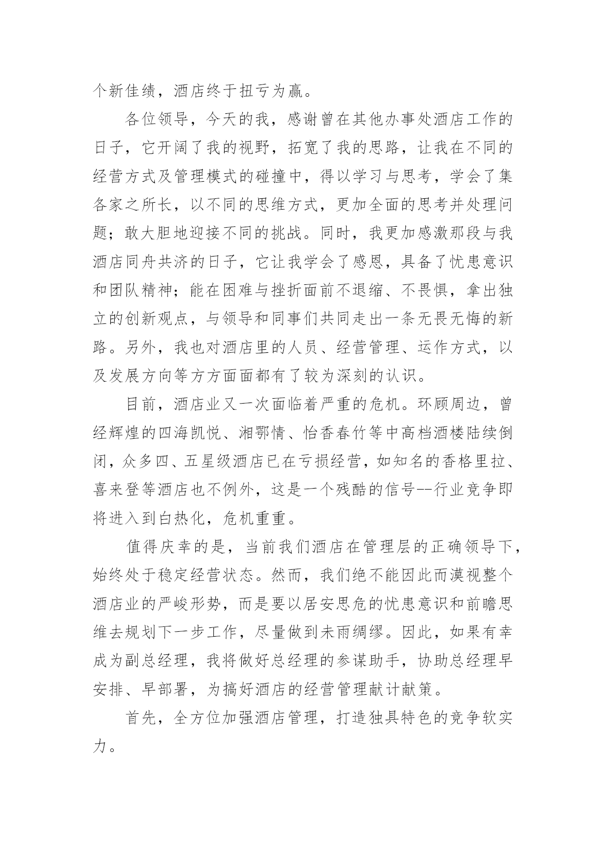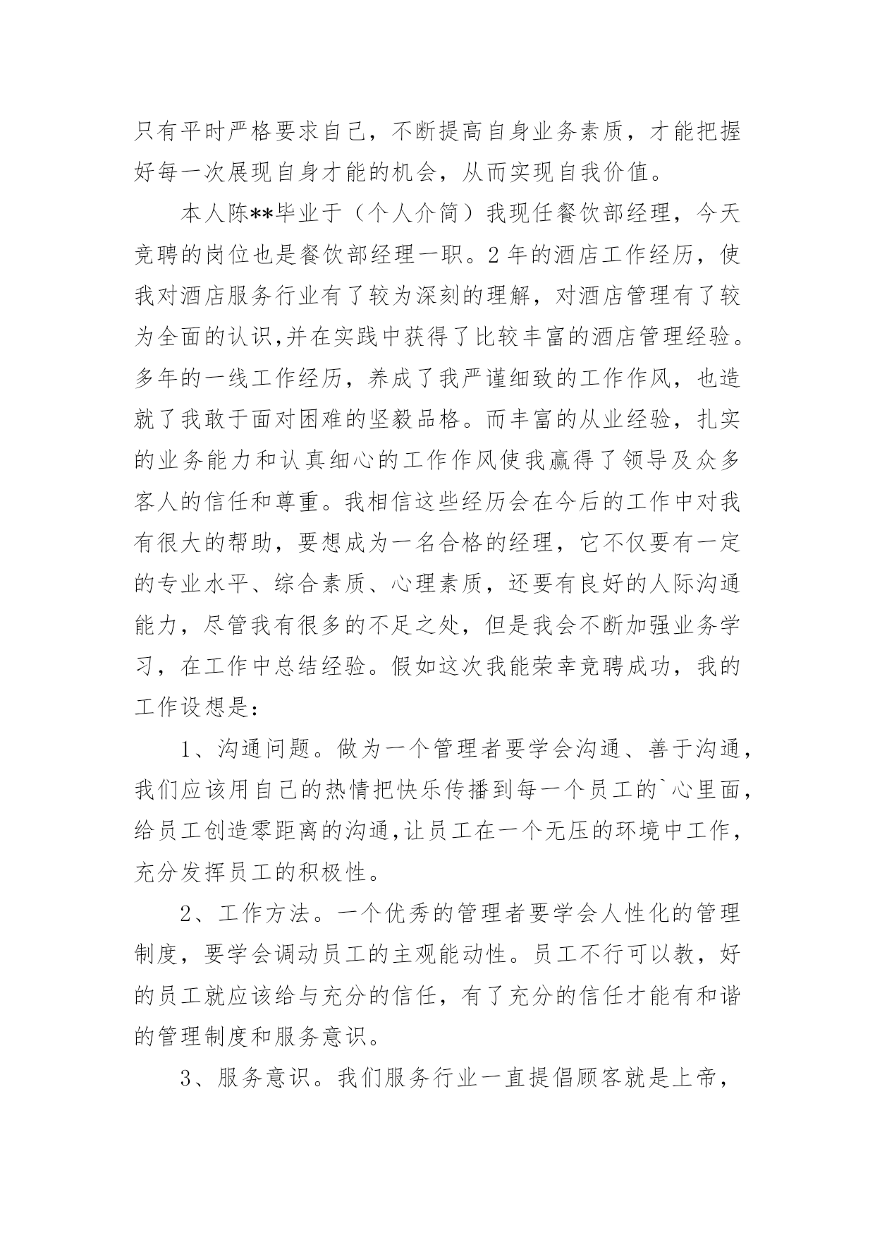 酒店岗位竞聘演讲稿演讲稿可以提高演讲人的自信心,有助发言人更好地展现自己。在现实社会中,越来越多人会去使用演讲稿,那么你有了解过演讲稿吗?以下是小编收集整理的酒店岗位竞聘演讲稿,欢迎大家分享。酒店岗位竞聘演讲稿1大家好。我叫xx,今年35岁。我非常喜欢这样一句话:“眉毛上的汗水,眉毛下的泪水,你总要选择一样!”作为年轻人,一个有理想、有信念的年轻人,我希望能在副总经理的岗位上,和大家一道,为推动xxx国际酒店的发展竭尽全力。有人说,经历是人生最宝贵的财富。确实,我感谢14年的工作经历,因为它带给我机会,帮助我进步,促进我成长。怎能忘记,那是在20xx年,年轻的我步入社会,带着干事创业的梦想走进北京安徽大厦,从餐饮部服务员、前厅部接待员到销售部主管,我一步步走上了酒店管理岗位,一点点了解了酒店业的运作模式,熟悉了酒店业服务理念,并具备了一定的酒店服务与销售能力。20xx年4月,我有幸成为北京吉林大厦销售部的一员。由于个人业绩突出,三个月后,即被破格提拔为酒店中层干部,任销售部经理助理。期间,我怀着对大厦的热爱,和对领导的感恩之心努力工作,创造了个人业绩每月、年均为部门xxx的佳绩。我的销售能力、服务水平,以及管理、沟通、协调、组织与综合管理能力,均得到了酒店领导和员工的认可。当时,我真的以为我事业的支点会一直架在吉林大厦这座平台上。然而,由于种种客观原因,一年后,我不得不带着深深的遗憾离开了吉林大厦。此后不久,亚洲金融危机爆发,很多行业受到了沉重的打击,我们酒店新开业便逢此危机,可以说是雪上加霜。当时,酒店不仅不能全额开出工资,而且工资还不能准月发放。有众多在开业时聘任的管理人员陆续离职,酒店进入了低谷期。当时,我的月收入比在贵州时要少50%,但是在我心中,与大厦同舟共济的信念却格外坚定。为了早日度过难关,我坚持在办党组和酒店领导的带领下开展工作,根据以往的工作经验和关系,有计划地一步步拓展业务,一个个建立客户群体,在销售策略和手段上也推出了一系列的营销政策方案。日常工作中,我带领部门员工风雨无阻地外出跑客户、扫楼。终于,我们的付出赢得了客户的认可,很快,建立了约1100家新的协议和会议客户群体,为酒店在金融危机后迅速复苏奠定了坚实的基础。当年,我的部门被评为办事处先进窗口,我被评选为办事处先进个人。此后,我带领团队做好总经理、主管领导的参谋助手,在酒店做好“龙头”部门的表率作用,主动搞好跟兄弟部门的合作关系,务实本职工作,在20xx至20xx年创造了一个个新佳绩,酒店终于扭亏为赢。各位领导,今天的我,感谢曾在其他办事处酒店工作的日子,它开阔了我的视野,拓宽了我的思路,让我在不同的经营方式及管理模式的碰撞中,得以学习与思考,学会了集各家之所长,以不同的思维方式,更加全面的思考并处理问题;敢大胆地迎接不同的挑战。同时,我更加感激那段与我酒店同舟共济的日子,它让我学会了感恩,具备了忧患意识和团队精神;能在困难与挫折面前不退缩、不畏惧,拿出独立的创新观点,与领导和同事们共同走出一条无畏无悔的新路。另外,我也对酒店里的人员、经营管理、运作方式,以及发展方向等方方面面都有了较为深刻的认识。目前,酒店业又一次面临着严重的危机。环顾周边,曾经辉煌的四海凯悦、湘鄂情、怡香春竹等中高档酒楼陆续倒闭,众多四、五星级酒店已在亏损经营,如知名的香格里拉、喜来登等酒店也不例外,这是一个残酷的信号--行业竞争即将进入到白热化,危机重重。值得庆幸的是,当前我们酒店在管理层的正确领导下,始终处于稳定经营状态。然而,我们绝不能因此而漠视整个酒店业的严峻形势,而是要以居安思危的忧患意识和前瞻思维去规划下一步工作,尽量做到未雨绸缪。因此,如果有幸成为副总经理,我将做好总经理的参谋助手,协助总经理早安排、早部署,为搞好酒店的经营管理献计献策。首先,全方位加强酒店管理,打造独具特色的竞争软实力。一是推进企业文化。决定一个企业形象的往往不是它的硬件设施,而是它的文化底蕴,这是企业参与竞争、抢占市场、提升效益的软实力。我上任后将协助总经理从职工角度出发,调动员工积极性,深入构建与xxx的环境、设施相配套的xxx的企业文化。二是加强员工培训,从礼节、礼貌、服务技能等方面入手,内强素质,外树形象,降低人员因流动而带来的二次培训成本,稳定基层,稳步提高酒店的经济效益。三是强化服务意识,规范服务要求,建立与我酒店规模相匹配的、完善的质量管理体系,使我们的员工、我们的服务具有与众不同的特质,并使这种特质成为我们酒店的标志,使“品牌员工,品位服务,品质企业”成为客户选择我们的理由。四是完善各部门规章制度。把规章制度的建立与完善作为工作的`重点,针对各部门的现状,梳理并优化工作流程,以完善的制度和优化的流程实现工作上的规范与高效。其次、坚持“两手抓”理念,强化创新意识,拓展营销思路。