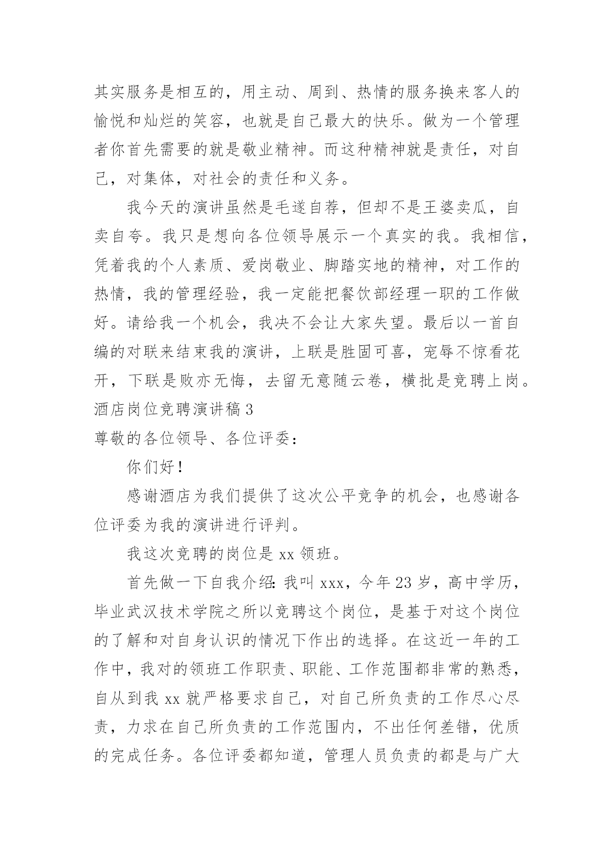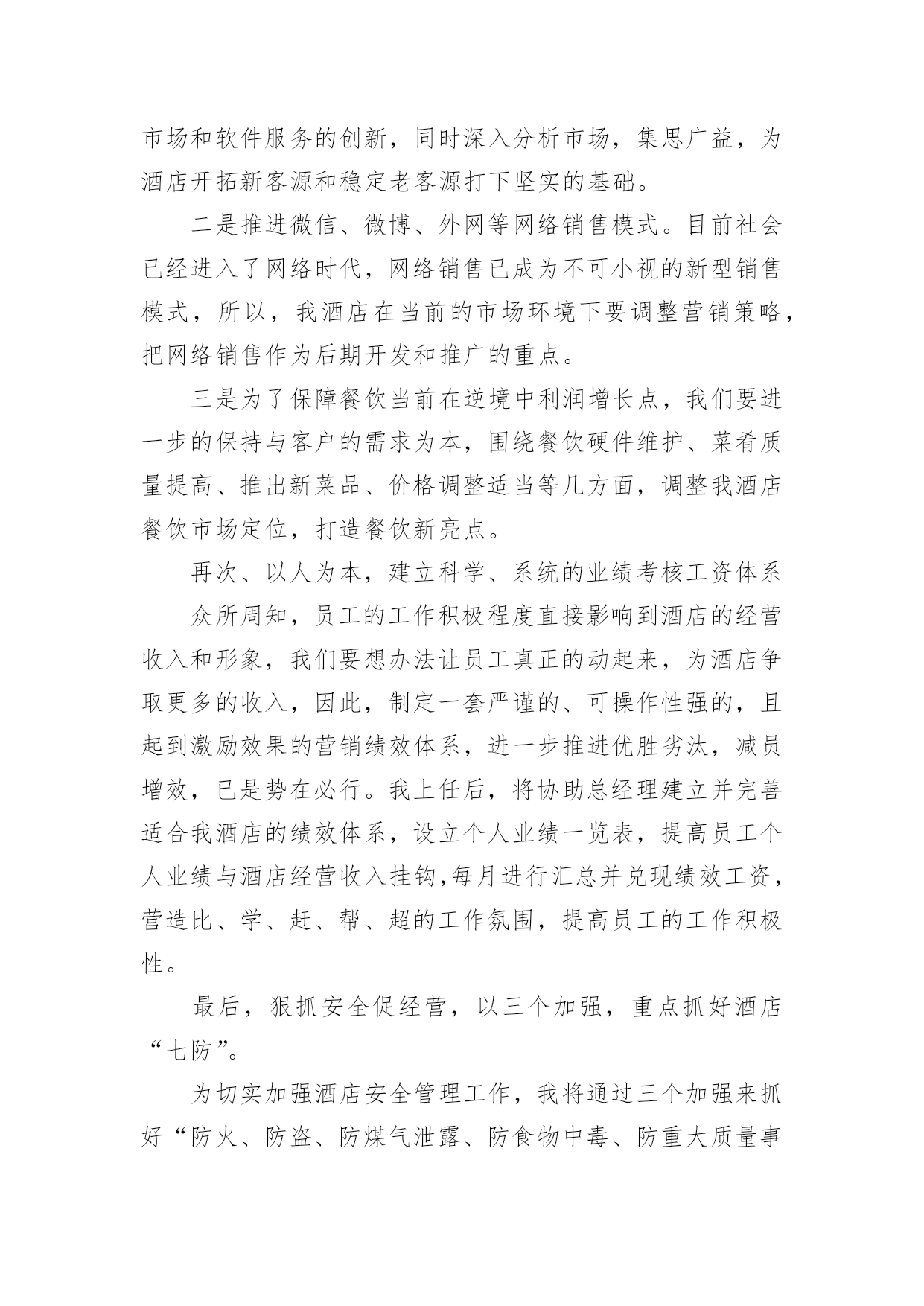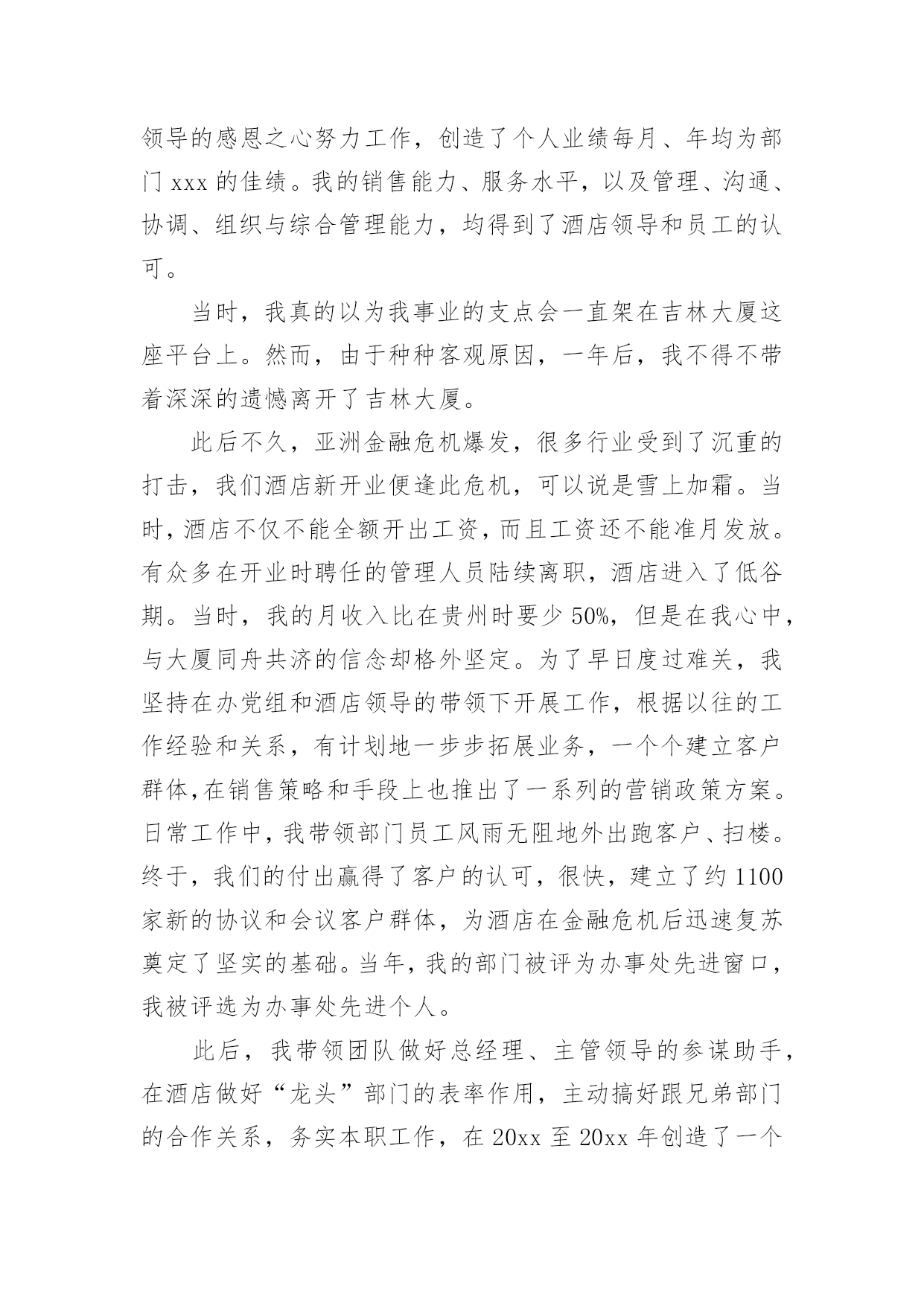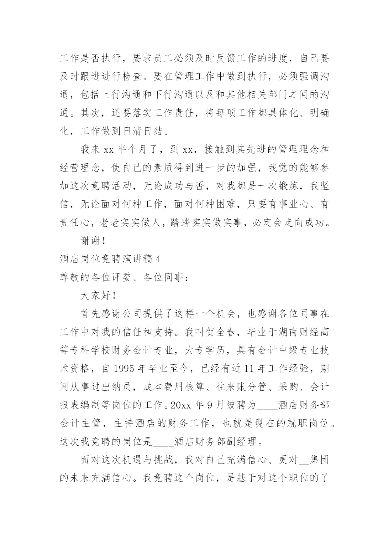 酒店岗位竞聘演讲稿演讲稿可以提高演讲人的自信心,有助发言人更好地展现自己。在现实社会中,越来越多人会去使用演讲稿,那么你有了解过演讲稿吗?以下是小编收集整理的酒店岗位竞聘演讲稿,欢迎大家分享。酒店岗位竞聘演讲稿1大家好。我叫xx,今年35岁。我非常喜欢这样一句话:“眉毛上的汗水,眉毛下的泪水,你总要选择一样!”作为年轻人,一个有理想、有信念的年轻人,我希望能在副总经理的岗位上,和大家一道,为推动xxx国际酒店的发展竭尽全力。有人说,经历是人生最宝贵的财富。确实,我感谢14年的工作经历,因为它带给我机会,帮助我进步,促进我成长。怎能忘记,那是在20xx年,年轻的我步入社会,带着干事创业的梦想走进北京安徽大厦,从餐饮部服务员、前厅部接待员到销售部主管,我一步步走上了酒店管理岗位,一点点了解了酒店业的运作模式,熟悉了酒店业服务理念,并具备了一定的酒店服务与销售能力。20xx年4月,我有幸成为北京吉林大厦销售部的一员。由于个人业绩突出,三个月后,即被破格提拔为酒店中层干部,任销售部经理助理。期间,我怀着对大厦的热爱,和对领导的感恩之心努力工作,创造了个人业绩每月、年均为部门xxx的佳绩。我的销售能力、服务水平,以及管理、沟通、协调、组织与综合管理能力,均得到了酒店领导和员工的认可。当时,我真的以为我事业的支点会一直架在吉林大厦这座平台上。然而,由于种种客观原因,一年后,我不得不带着深深的遗憾离开了吉林大厦。此后不久,亚洲金融危机爆发,很多行业受到了沉重的打击,我们酒店新开业便逢此危机,可以说是雪上加霜。当时,酒店不仅不能全额开出工资,而且工资还不能准月发放。有众多在开业时聘任的管理人员陆续离职,酒店进入了低谷期。当时,我的月收入比在贵州时要少50%,但是在我心中,与大厦同舟共济的信念却格外坚定。为了早日度过难关,我坚持在办党组和酒店领导的带领下开展工作,根据以往的工作经验和关系,有计划地一步步拓展业务,一个个建立客户群体,在销售策略和手段上也推出了一系列的营销政策方案。日常工作中,我带领部门员工风雨无阻地外出跑客户、扫楼。终于,我们的付出赢得了客户的认可,很快,建立了约1100家新的协议和会议客户群体,为酒店在金融危机后迅速复苏奠定了坚实的基础。当年,我的部门被评为办事处先进窗口,我被评选为办事处先进个人。此后,我带领团队做好总经理、主管领导的参谋助手,在酒店做好“龙头”部门的表率作用,主动搞好跟兄弟部门的合作关系,务实本职工作,在20xx至20xx年创造了一个个新佳绩,酒店终于扭亏为赢。各位领导,今天的我,感谢曾在其他办事处酒店工作的日子,它开阔了我的视野,拓宽了我的思路,让我在不同的经营方式及管理模式的碰撞中,得以学习与思考,学会了集各家之所长,以不同的思维方式,更加全面的思考并处理问题;敢大胆地迎接不同的挑战。同时,我更加感激那段与我酒店同舟共济的日子,它让我学会了感恩,具备了忧患意识和团队精神;能在困难与挫折面前不退缩、不畏惧,拿出独立的创新观点,与领导和同事们共同走出一条无畏无悔的新路。另外,我也对酒店里的人员、经营管理、运作方式,以及发展方向等方方面面都有了较为深刻的认识。目前,酒店业又一次面临着严重的危机。环顾周边,曾经辉煌的四海凯悦、湘鄂情、怡香春竹等中高档酒楼陆续倒闭,众多四、五星级酒店已在亏损经营,如知名的香格里拉、喜来登等酒店也不例外,这是一个残酷的信号--行业竞争即将进入到白热化,危机重重。值得庆幸的是,当前我们酒店在管理层的正确领导下,始终处于稳定经营状态。然而,我们绝不能因此而漠视整个酒店业的严峻形势,而是要以居安思危的忧患意识和前瞻思维去规划下一步工作,尽量做到未雨绸缪。因此,如果有幸成为副总经理,我将做好总经理的参谋助手,协助总经理早安排、早部署,为搞好酒店的经营管理献计献策。首先,全方位加强酒店管理,打造独具特色的竞争软实力。一是推进企业文化。决定一个企业形象的往往不是它的硬件设施,而是它的文化底蕴,这是企业参与竞争、抢占市场、提升效益的软实力。我上任后将协助总经理从职工角度出发,调动员工积极性,深入构建与xxx的环境、设施相配套的xxx的企业文化。二是加强员工培训,从礼节、礼貌、服务技能等方面入手,内强素质,外树形象,降低人员因流动而带来的二次培训成本,稳定基层,稳步提高酒店的经济效益。三是强化服务意识,规范服务要求,建立与我酒店规模相匹配的、完善的质量管理体系,使我们的员工、我们的服务具有与众不同的特质,并使这种特质成为我们酒店的标志,使“品牌员工,品位服务,品质企业”成为客户选择我们的理由。四是完善各部门规章制度。把规章制度的建立与完善作为工作的`重点,针对各部门的现状,梳理并优化工作流程,以完善的制度和优化的流程实现工作上的规范与高效。其次、坚持“两手抓”理念,强化创新意识,拓展营销思路。