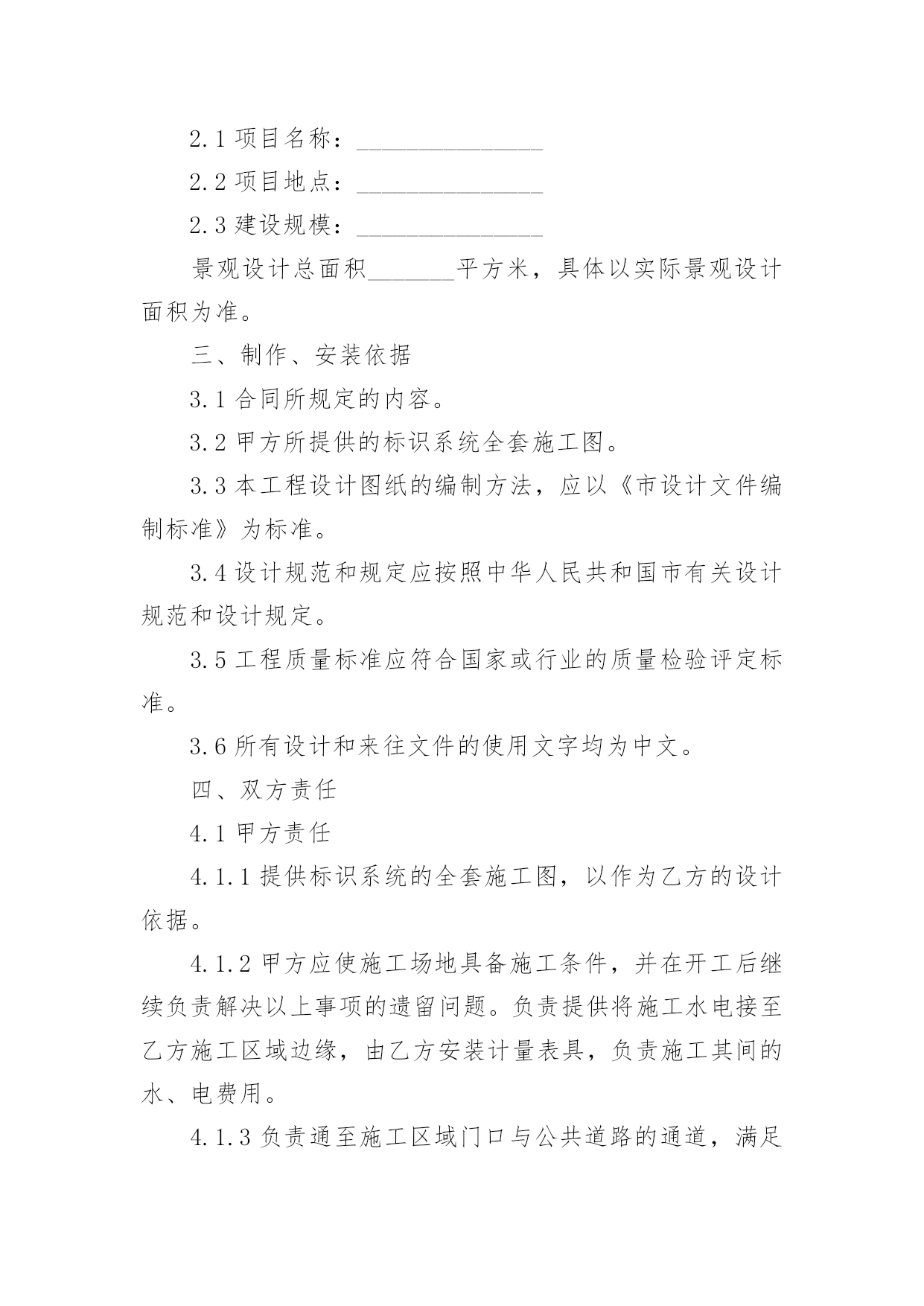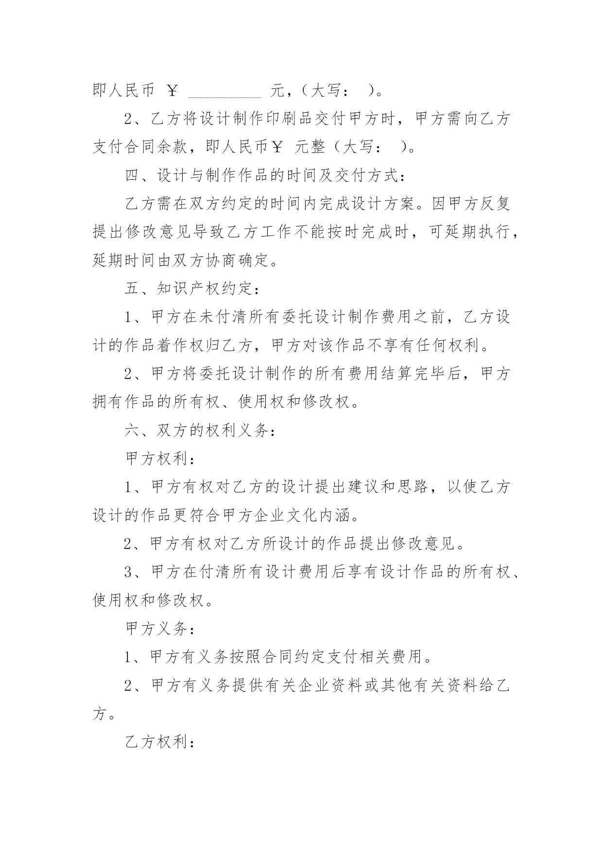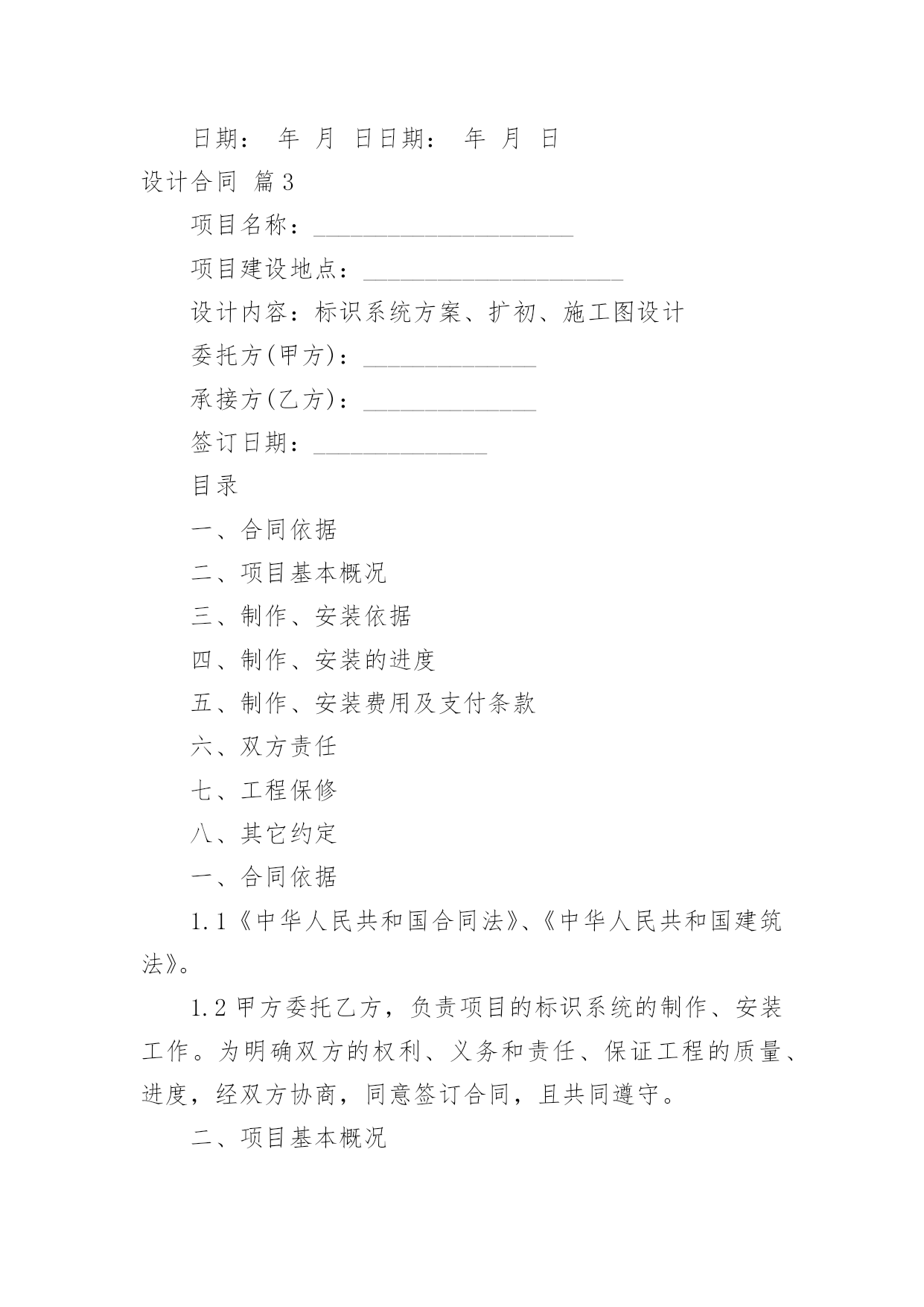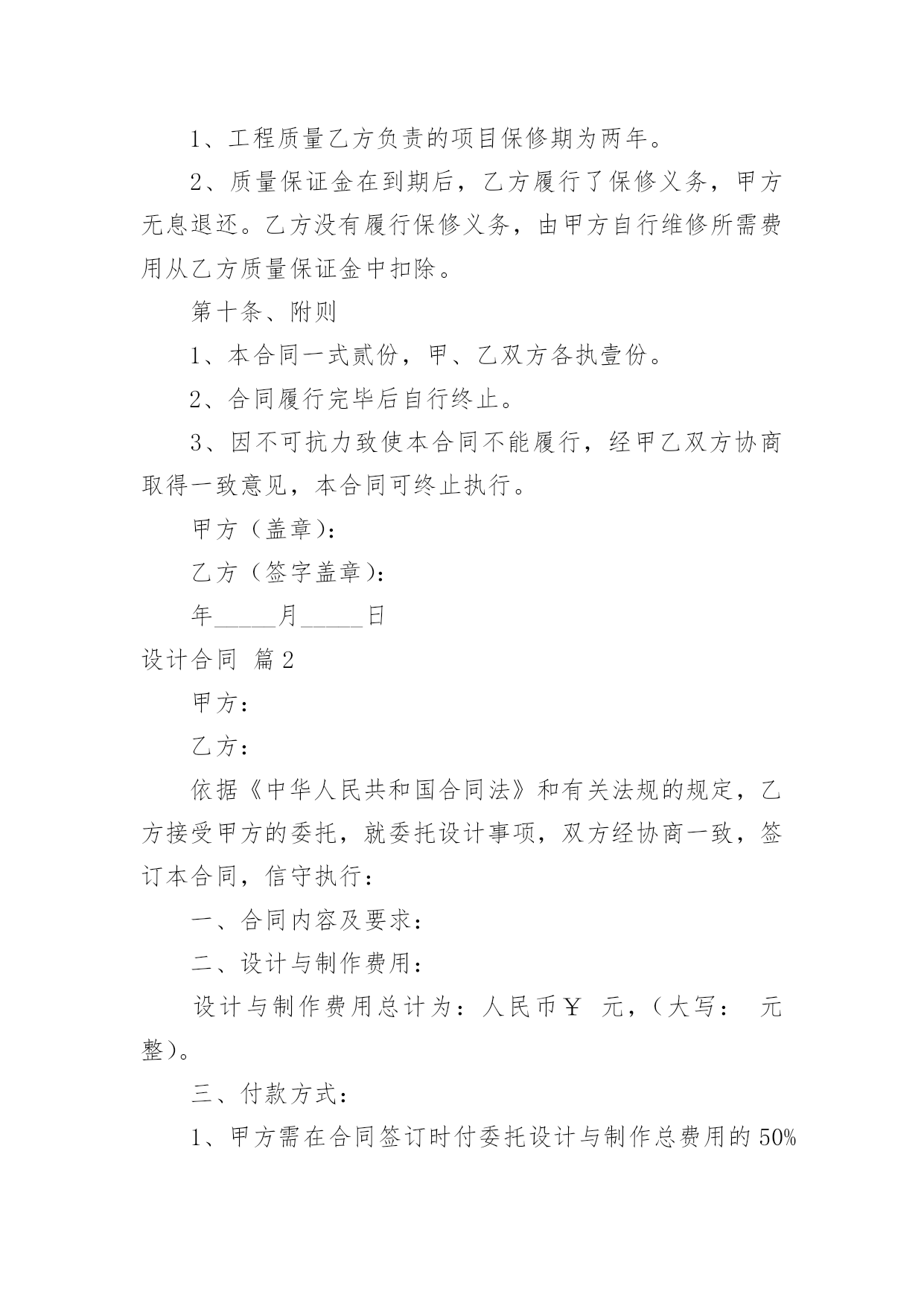 设计合同设计合同模板集合9篇随着人们法律意识的建立,合同在生活中的使用越来越广泛,签订合同能够较为有效的约束违约行为。合同有不同的类型,当然也有不同的目的,以下是小编精心整理的设计合同9篇,希望能够帮助到大家。设计合同篇1发包方(以下简称甲方):承包方(以下简称乙方):依照《中华人民共和国合同法》及其它相关法律、法规的规定,结合甲乙方双方的特点,甲、乙双方在平等、自愿、协商一致的基础上,就乙方承包甲方的装饰工程(以下简称工程)的有关事宜,达成如下协议:第一条、工程概况1、工程地点:建筑面积:_____㎡;2、工程名称:3、工程内容及做法(见:装饰工程设计图纸及装修项目预算书)。4、工程承包方式,双方商定采取下列第(1)种承包方式:(1)乙方包工、包装修预算书内的材料;(2)乙方包工不包料,甲方包全部材料;5、工程期限_____天;(工程量增减变化或设计变更另算)_____开工日期_____年_____月_____日。_____竣工日期_____年_____月_____日。6、总合同价款:本合同按装修预算书确定的单价按实际收方决算。第二条、甲方责任和义务1、开工前,尽可能为乙方入场施工创造条件;2、提供施工期间的水源、电源;3、对工程质量和施工进度的监督、材料进场的验收,组织工程竣工验收。4、按进度支付工程款。第三条、乙方责任和义务1、做好施工计划安排,服从甲方的监督与管理。严格遵守甲方的各项管理制度,克服施工中各种困难,严格执行安全施工操作规范及质量标准,按期保质完成工程。2、乙方自行承担施工期间的安全事故责任和相关保险费用。3、采购材料清单、施工方案细节不明确、拨付工程款、需要甲方协调工程的有关事宜,提前两天向甲方报告。4、每道工序完工后,必须报经甲方验收,验收合格后方可进行下一道工序的施工,验收不合格而耽误了工期,由乙方自行负责。5、严格执行本市有关施工现场管理的规定,不得损坏已经完工的其它工程成品,做好已完工成品的保护工作。不得扰民及污染环境,保证施工现场的整洁,工程完工后负责清扫施工现场。6、甲方提供水源、电源,乙方自己搭接,自己解决施工用线、用管。第四条、工程变更及项目增减工程项目或施工方式如需变更,双方应协商一致,签订书面变更协议或项目增减书,同时调整相关费用及工期。第五条、工程延误对以下原因造成竣工日期延误,经甲方书面确认,工期相应顺延:1、工程量增减变化、设计变更。2、不可抗力(停水、停电不计算工期)。3、甲方同意工期顺延的其它情况;第六条、质量标准1、地砖无空鼓,不积水;2、墙砖粘接牢固,不脱落;3、地沟流水干净,不积水。4、防水密室,不漏水。第七条、工程款支付方式1、开工十日后,根据乙方完成工作量,乙方对已完工成品报甲方验收合格后,拨付工程款_____。2、结算方式:全部工程完工后,26日经甲乙双方初步验收合格后,甲方再拨付_____。在十五个工作日内办理完工程验收和结算手续。十五日内扣除总工程款的_____%作为质量保证金后,其余款项一次结清。质量保证金在保修期到期后,乙方履行了保修义务,甲方无息退还。第八条、违约责任1、合同双方当事人中的任一方未履行合同的约定或违反国家法律、法规及有关政策规定,受到罚款或给对方造成经济损失均由责任方承担责任,并赔偿给对方造成的经济损失。2、乙方采购、使用未经甲方验收的材料,或施工工艺不合格,甲方有权要求乙方无条件整改返工,并承担返工造成的损失。乙方的施工的工艺、工期进度明显达不到甲方要求,甲方有权减少乙方承包项目或终止合同,由此造成的损失由乙方承担。未办理验收交付手续,工程成品被损坏,由乙方负责。3、由于乙方原因致使工期延误,每延误一天向甲方支付违约金_____元;4、甲方逾期支付工程款或不按合同约定办理验收手续,每延误一天向乙方支付违约金_____元;5、因乙方责任造成质量问题或不能按期完工,损失由乙方承担;6、本合同一经甲、乙双方签字(盖章)后即生效,因一方原因违约造成合同无法履行时,该方应及时通知另一方,违约方向对方支付违约金计币壹万元整_____元,并办理合同终止手续。如双方无法协商一致,请仲裁机构协调解决。第九条、工程保修1、工程质量乙方负责的项目保修期为两年。2、质量保证金在到期后,乙方履行了保修义务,甲方无息退还。乙方没有履行保修义务,由甲方自行维修所需费用从乙方质量保证金中扣除。第十条、附则1、本合同一式贰份,甲、乙双方各执壹份。2、合同履行完毕后自行终止。3、因不可抗力致使本合同不能履行,经甲乙双方协商取得一致意见,本合同可终止执行。甲方(盖章):乙方(签字盖章):年_____月_____日设计合同篇2甲方:乙方:依据《中华人民共和国合同法》和有关法规的规定,乙方接受甲方的委托,就委托设计事项,双方经协商一致,签订本合同,信守执行:一、合同内容及要