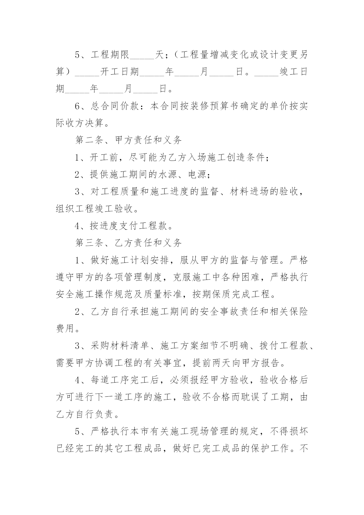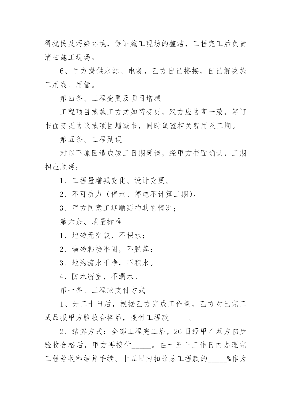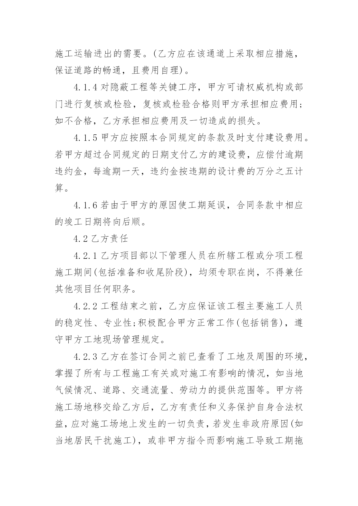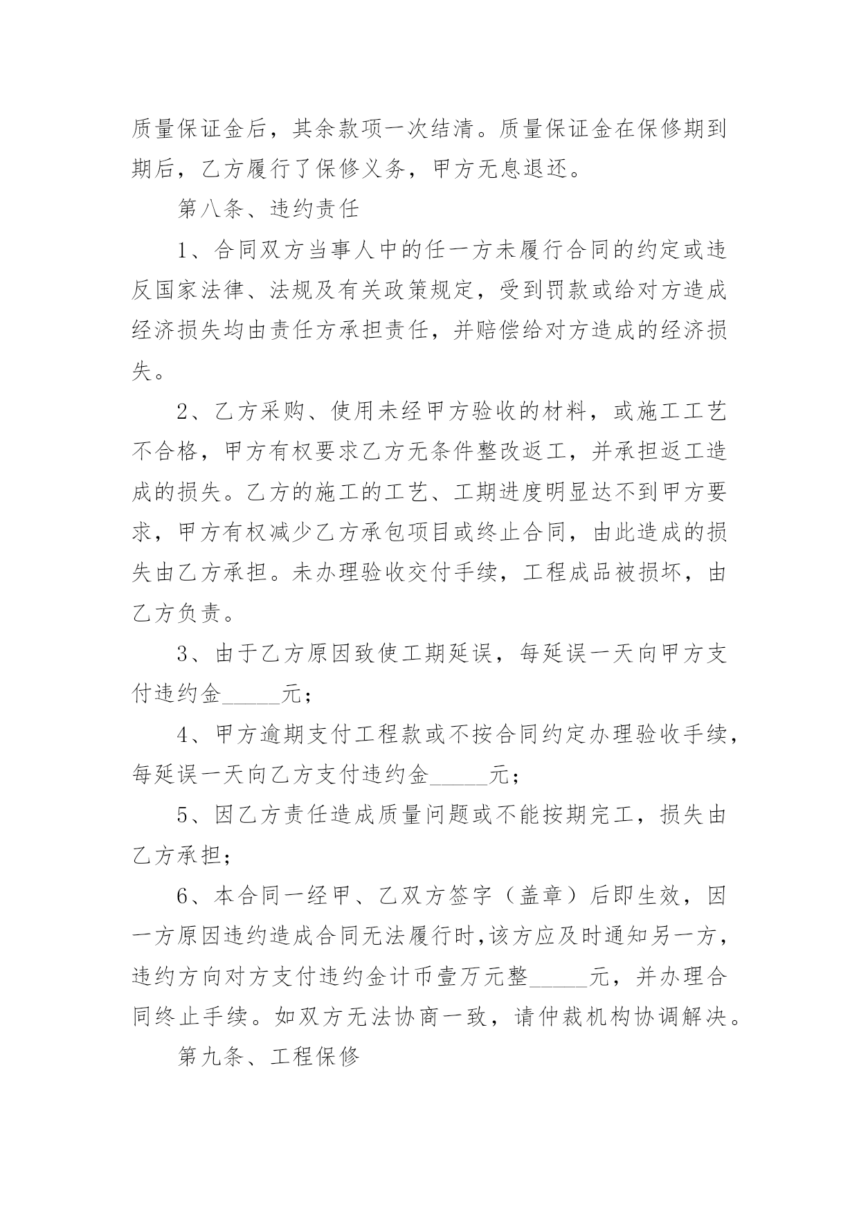 设计合同设计合同模板集合9篇随着人们法律意识的建立,合同在生活中的使用越来越广泛,签订合同能够较为有效的约束违约行为。合同有不同的类型,当然也有不同的目的,以下是小编精心整理的设计合同9篇,希望能够帮助到大家。设计合同篇1发包方(以下简称甲方):承包方(以下简称乙方):依照《中华人民共和国合同法》及其它相关法律、法规的规定,结合甲乙方双方的特点,甲、乙双方在平等、自愿、协商一致的基础上,就乙方承包甲方的装饰工程(以下简称工程)的有关事宜,达成如下协议:第一条、工程概况1、工程地点:建筑面积:_____㎡;2、工程名称:3、工程内容及做法(见:装饰工程设计图纸及装修项目预算书)。4、工程承包方式,双方商定采取下列第(1)种承包方式:(1)乙方包工、包装修预算书内的材料;(2)乙方包工不包料,甲方包全部材料;5、工程期限_____天;(工程量增减变化或设计变更另算)_____开工日期_____年_____月_____日。_____竣工日期_____年_____月_____日。6、总合同价款:本合同按装修预算书确定的单价按实际收方决算。第二条、甲方责任和义务1、开工前,尽可能为乙方入场施工创造条件;2、提供施工期间的水源、电源;3、对工程质量和施工进度的监督、材料进场的验收,组织工程竣工验收。4、按进度支付工程款。第三条、乙方责任和义务1、做好施工计划安排,服从甲方的监督与管理。严格遵守甲方的各项管理制度,克服施工中各种困难,严格执行安全施工操作规范及质量标准,按期保质完成工程。2、乙方自行承担施工期间的安全事故责任和相关保险费用。3、采购材料清单、施工方案细节不明确、拨付工程款、需要甲方协调工程的有关事宜,提前两天向甲方报告。4、每道工序完工后,必须报经甲方验收,验收合格后方可进行下一道工序的施工,验收不合格而耽误了工期,由乙方自行负责。5、严格执行本市有关施工现场管理的规定,不得损坏已经完工的其它工程成品,做好已完工成品的保护工作。不得扰民及污染环境,保证施工现场的整洁,工程完工后负责清扫施工现场。6、甲方提供水源、电源,乙方自己搭接,自己解决施工用线、用管。第四条、工程变更及项目增减工程项目或施工方式如需变更,双方应协商一致,签订书面变更协议或项目增减书,同时调整相关费用及工期。第五条、工程延误对以下原因造成竣工日期延误,经甲方书面确认,工期相应顺延:1、工程量增减变化、设计变更。2、不可抗力(停水、停电不计算工期)。3、甲方同意工期顺延的其它情况;第六条、质量标准1、地砖无空鼓,不积水;2、墙砖粘接牢固,不脱落;3、地沟流水干净,不积水。4、防水密室,不漏水。第七条、工程款支付方式1、开工十日后,根据乙方完成工作量,乙方对已完工成品报甲方验收合格后,拨付工程款_____。2、结算方式:全部工程完工后,26日经甲乙双方初步验收合格后,甲方再拨付_____。在十五个工作日内办理完工程验收和结算手续。十五日内扣除总工程款的_____%作为质量保证金后,其余款项一次结清。质量保证金在保修期到期后,乙方履行了保修义务,甲方无息退还。第八条、违约责任1、合同双方当事人中的任一方未履行合同的约定或违反国家法律、法规及有关政策规定,受到罚款或给对方造成经济损失均由责任方承担责任,并赔偿给对方造成的经济损失。2、乙方采购、使用未经甲方验收的材料,或施工工艺不合格,甲方有权要求乙方无条件整改返工,并承担返工造成的损失。乙方的施工的工艺、工期进度明显达不到甲方要求,甲方有权减少乙方承包项目或终止合同,由此造成的损失由乙方承担。未办理验收交付手续,工程成品被损坏,由乙方负责。3、由于乙方原因致使工期延误,每延误一天向甲方支付违约金_____元;4、甲方逾期支付工程款或不按合同约定办理验收手续,每延误一天向乙方支付违约金_____元;5、因乙方责任造成质量问题或不能按期完工,损失由乙方承担;6、本合同一经甲、乙双方签字(盖章)后即生效,因一方原因违约造成合同无法履行时,该方应及时通知另一方,违约方向对方支付违约金计币壹万元整_____元,并办理合同终止手续。如双方无法协商一致,请仲裁机构协调解决。第九条、工程保修1、工程质量乙方负责的项目保修期为两年。2、质量保证金在到期后,乙方履行了保修义务,甲方无息退还。乙方没有履行保修义务,由甲方自行维修所需费用从乙方质量保证金中扣除。第十条、附则1、本合同一式贰份,甲、乙双方各执壹份。2、合同履行完毕后自行终止。3、因不可抗力致使本合同不能履行,经甲乙双方协商取得一致意见,本合同可终止执行。甲方(盖章):乙方(签字盖章):年_____月_____日设计合同篇2甲方:乙方:依据《中华人民共和国合同法》和有关法规的规定,乙方接受甲方的委托,就委托设计事项,双方经协商一致,签订本合同,信守执行:一、合同内容及要