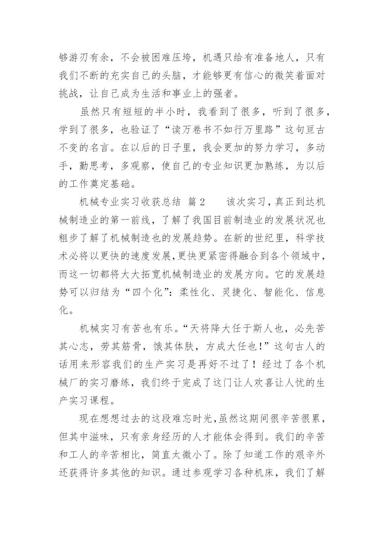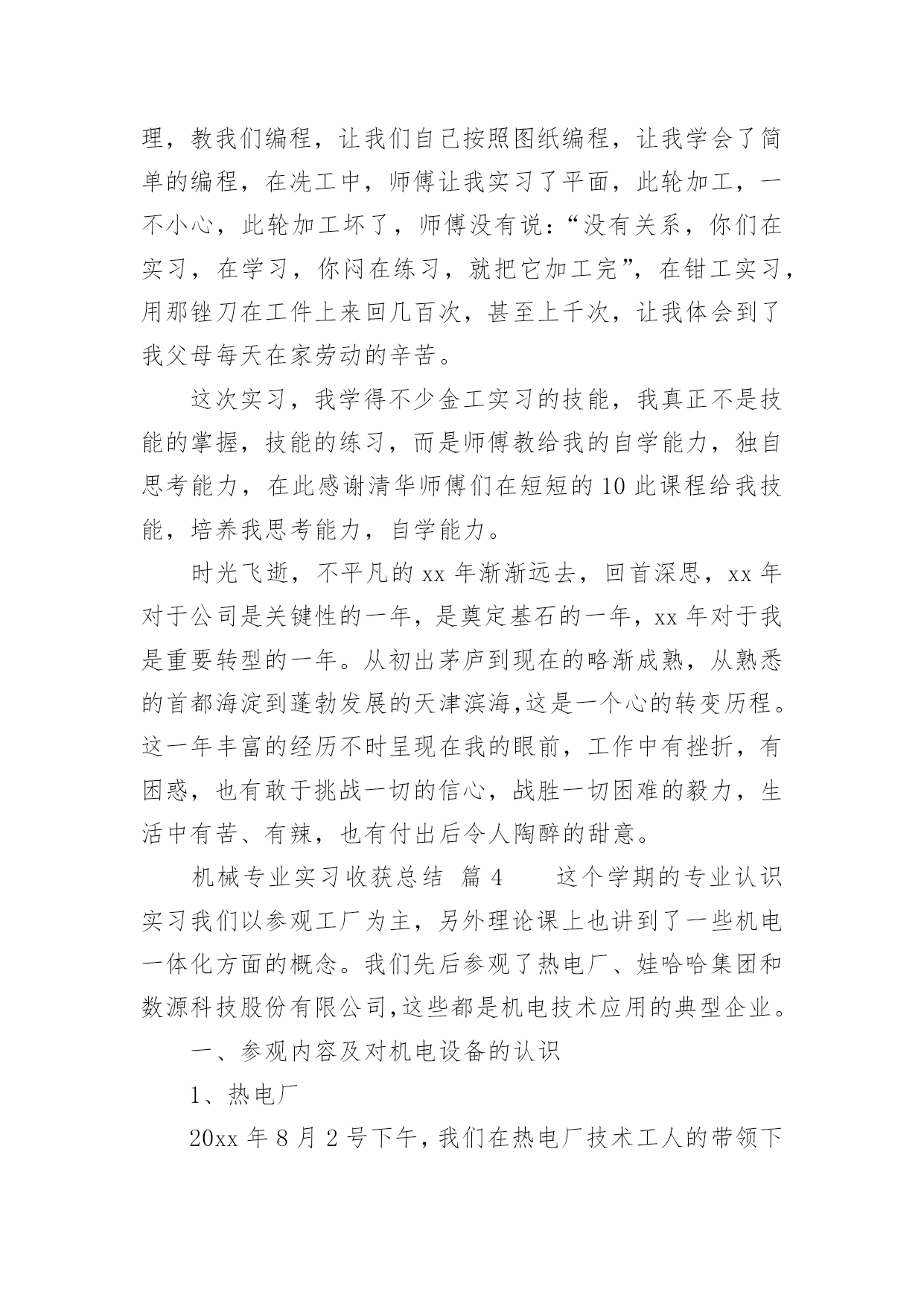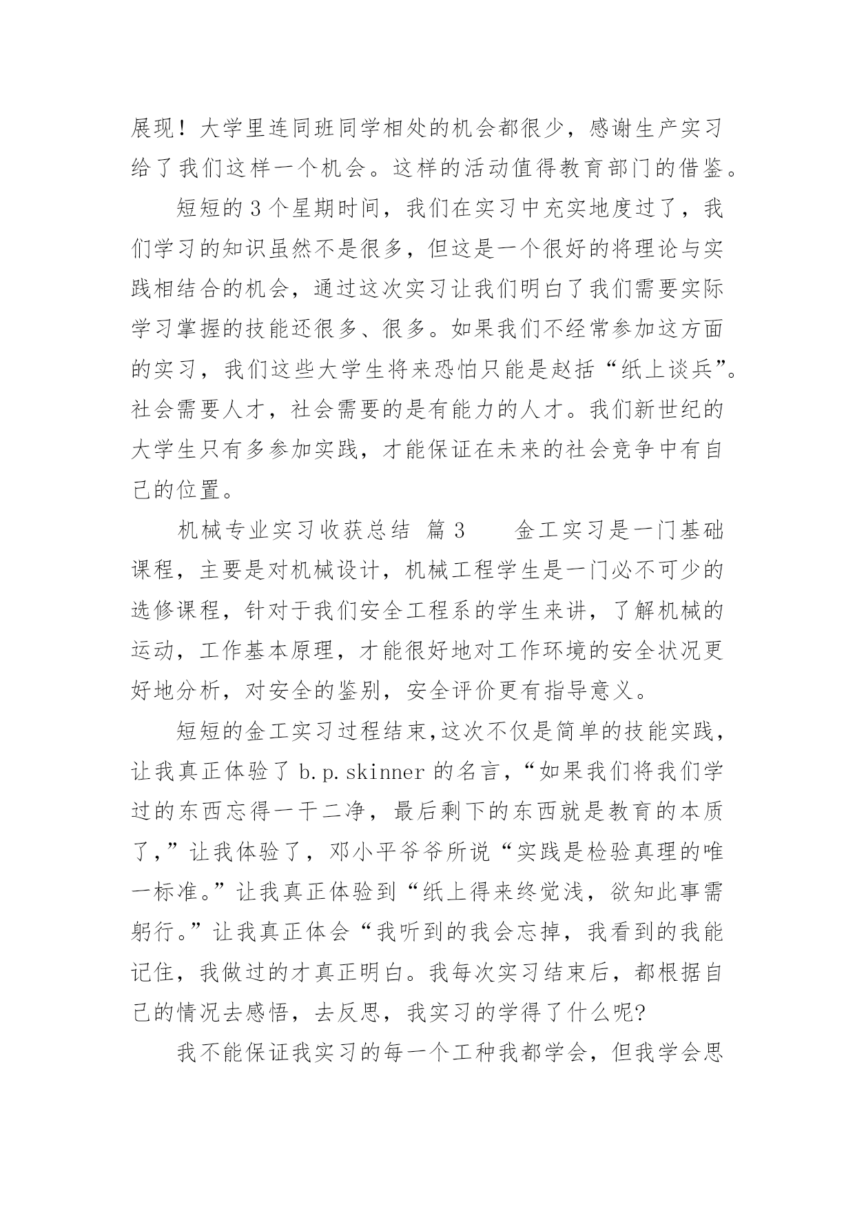 机械专业实习收获总结机械专业实习收获总结(通用14篇)转眼间一个辛苦的实习生活又结束了,我们在不断的学习中,获得了更多的进步,需要好好地写一份实习总结了。那么你知道实习总结如何写吗?以下是小编为大家整理的机械专业实习收获总结,仅供参考,大家一起来看看吧。机械专业实习收获总结篇1实习是大学本科学生学完基础课和专业基础课后进行的一次实习,让我们对自己的专业方向有了一定的预计,实际生产跟我们课本上学习到的内容还是有着较大的差别的。理论和实际并不是完全相同的,不能够把书本上的知识照搬、照抄到生产中来,这样不仅有时达不到理论效果,有时甚至会造成很大的经济损失和资源浪费。书本知识比较系统化、理想化,而实际生产因受工厂资金、政策法规、人员配置等方面的影响,很难把专业的理论知识落实透彻。但是一旦运用,就会有很好的效益效果。通过实习将理论与实践结合起来,其中包括各种设备的实物勘察和设备操作步骤以及注意事项。还有各工序实际上的流程。这些大都和书本上相同,通过对机械设备的之间观察,弥补了理论的不足之处,加深了对知识的记忆。很快我们就要步入社会大课堂,面临着择业和就业的问题,这样我们就很需要在专业方面有比较深刻地认识,掌握专业上所需要的一切知识,这样在今后的工作中,我们处理起问题才能够游刃有余,不会被困难压垮,机遇只给有准备地人,只有我们不断的充实自己的头脑,才能够更有信心的微笑着面对挑战,让自己成为生活和事业上的强者。虽然只有短短的半小时,我看到了很多,听到了很多,学到了很多,也验证了“读万卷书不如行万里路”这句亘古不变的名言。在以后的日子里,我会更加的努力学习,多动手,勤思考,多观察,使自己的专业知识更加熟练,为以后的工作奠定基础。机械专业实习收获总结篇2该次实习,真正到达机械制造业的第一前线,了解了我国目前制造业的发展状况也粗步了解了机械制造也的发展趋势。在新的世纪里,科学技术必将以更快的速度发展,更快更紧密得融合到各个领域中,而这一切都将大大拓宽机械制造业的发展方向。它的发展趋势可以归结为“四个化”:柔性化、灵捷化、智能化、信息化。机械实习有苦也有乐。“天将降大任于斯人也,必先苦其心志,劳其筋骨,饿其体肤,方成大任也!”这句古人的话用来形容我们的生产实习是再好不过了!经过了各个机械厂的实习磨练,我们终于完成了这门让人欢喜让人忧的生产实习课程。现在想想过去的这段难忘时光,虽然这期间很辛苦很累,但其中滋味,只有亲身经历的人才能体会得到。我们的辛苦和工人的辛苦相比,简直太微小了。除了知道工作的艰辛外还获得许多其他的知识。通过参观学习各种机床,我们了解了许多机械生产操作的原理和过程,通过进厂参观实习和与工人师傅交流,知道各个工艺的加工方法,生产目的,生产程序及产品供求情况。在这期间我分析了几道简单典型零件的加工工艺,对机械产品生产方法和技术路线的选择,工艺条件的确定以及流程的编制原则有了更加深刻的认识。对车间内设备的摆放和管理也有了初步的认识。还有以前的那些陌生的专业名词现在听来都是那么熟悉亲切!虽然我们中的很多人将来不会从事这些工作,甚至连接触它们的可能性都没有,但是生产实习给我们带来的那些经验与感想,却是对我们每一个人的工作学习生活来说都是一笔价值连城的财富。生产实习的作用与影响,就像那句话“有些东西你可能现在没有感觉到它的价值,但最后还是会的,每个人都有这样一个过程!”同样让我认识到车间相对来说也是一个纪律严明的集体场所,有着严明的制度和作息时间安排。车间安全是必须受到重视的,因为车间是一个运做整体,一条生产线上的任一个环节出了问题就会影响到整个生产的正常进行。实习生活全面检验了我各方面的能力:学习、生活、心理、身体、思想等等。就像是一块试金石,检验我能否将所学理论知识用到实践中去。一起实习的同学也让我受益匪浅。毫无私心的帮助,真诚的相互鼓励加油,分工合作,一起分享知识增长带来的喜悦,生产实习更像是一个集体活动,拉近我们彼此的距离,填补了曾经存在的隔阂,集体主义的魅力得到了彻彻底底的展现!大学里连同班同学相处的机会都很少,感谢生产实习给了我们这样一个机会。这样的活动值得教育部门的借鉴。短短的3个星期时间,我们在实习中充实地度过了,我们学习的知识虽然不是很多,但这是一个很好的将理论与实践相结合的机会,通过这次实习让我们明白了我们需要实际学习掌握的技能还很多、很多。如果我们不经常参加这方面的实习,我们这些大学生将来恐怕只能是赵括“纸上谈兵”。社会需要人才,社会需要的是有能力的人才。我们新世纪的大学生只有多参加实践,才能保证在未来的社会竞争中有自己的位置。机械专业实习收获总结篇3金工实习是一门基础课程,主要是对机械设计,机械工程学生是一门必不可少的选修课程,针对于我们安全工程系的学生来讲,了解机械的运动,工作基本原理,才能很好地对工作环境的安全状