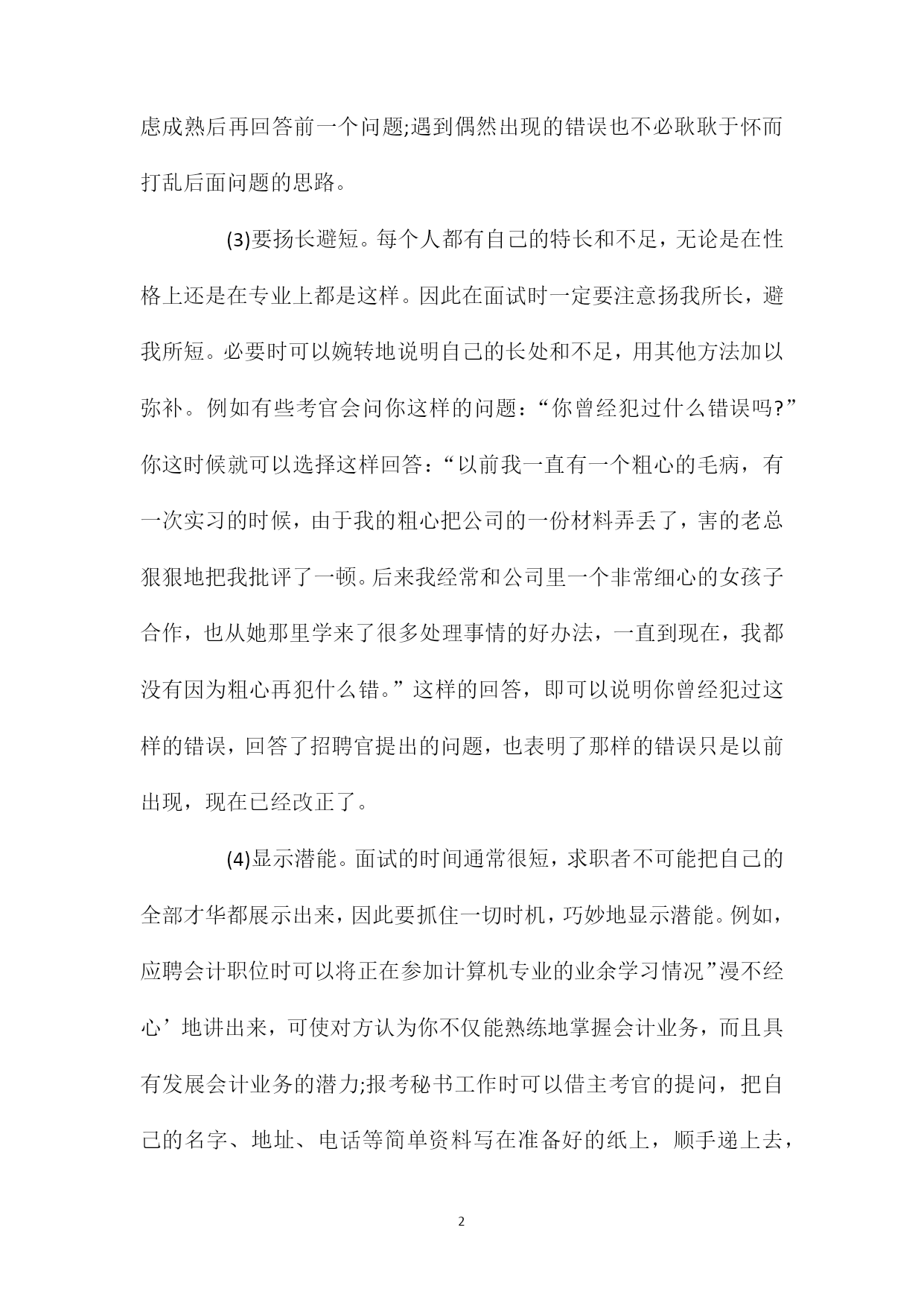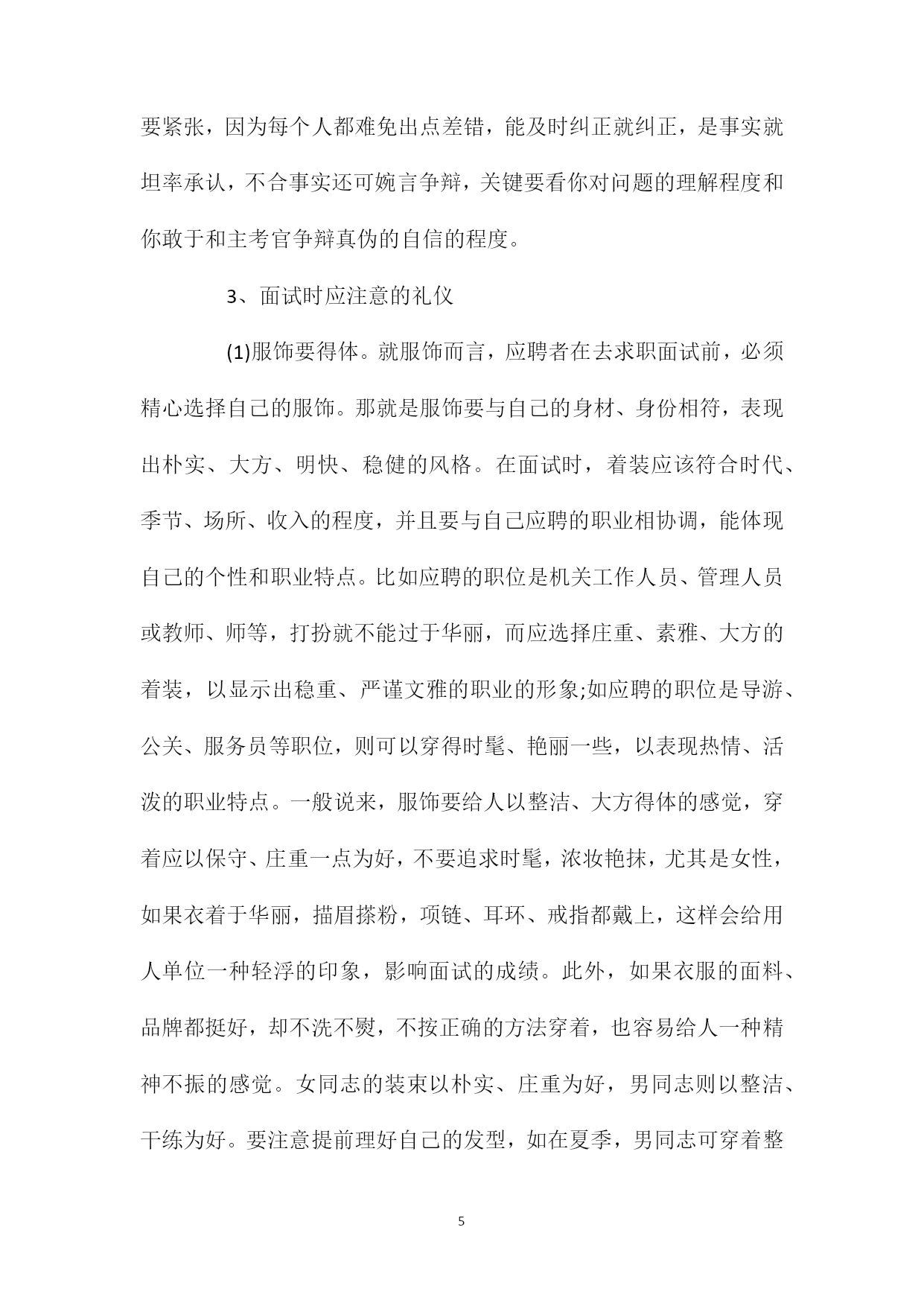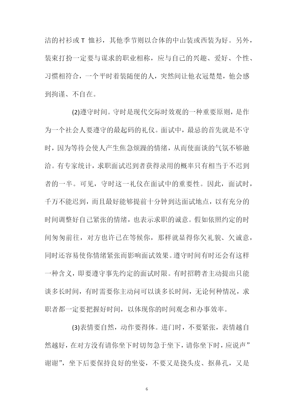 PAGEPAGE11公务员面试技巧和注意事项公务员面试技巧和注意事项:1、基本注意事项(1)要谦虚谨慎。面试和面谈的区别之一就是面试时对方往往是多数人,其中不乏专家、学者,求职者在回答一些比较有深度的问题时,切不可不懂装懂,不明白的地方就要虚心请教或坦白说不懂,这样才会给用人单位留下诚实的好印象。(2)要机智应变。当求职者一人面对众多考官时,心理压力很大,面试的成败大多取决于求职者是否能机智果断,随机应变,能当场把自己的各种聪明才智发挥出来。首先,要注意分析面试类型,如果是主导式,你就应该把目标集中投向主考官,认真礼貌地回答问题;如果是答辩式,你则应把目光投向提问者,切不可只关注甲方而冷待乙方;果是集体式面试,分配给每个求职者的时间很短,事先准备的材料可能用不上,这时最好的方法是根据考官的提问在脑海里重新组合材料,言简意赅地作答,切忌长篇大论。其次要避免尴尬场面,在回答问题时常遇到这些情况:未听清问题便回答,听清了问题自己一时不能作答,回答时出现错误或不知怎么回答的问题时,可能使你处于尴尬的境地。避免尴尬的技巧是:对未听清的问题可以请求对方重复一遍或解释一下;一时回答不出可以请求考官提下一个问题,等考虑成熟后再回答前一个问题;遇到偶然出现的错误也不必耿耿于怀而打乱后面问题的思路。(3)要扬长避短。每个人都有自己的特长和不足,无论是在性格上还是在专业上都是这样。因此在面试时一定要注意扬我所长,避我所短。必要时可以婉转地说明自己的长处和不足,用其他方法加以弥补。例如有些考官会问你这样的问题:“你曾经犯过什么错误吗?”你这时候就可以选择这样回答:“以前我一直有一个粗心的毛病,有一次实习的时候,由于我的粗心把公司的一份材料弄丢了,害的老总狠狠地把我批评了一顿。后来我经常和公司里一个非常细心的女孩子合作,也从她那里学来了很多处理事情的好办法,一直到现在,我都没有因为粗心再犯什么错。”这样的回答,即可以说明你曾经犯过这样的错误,回答了招聘官提出的问题,也表明了那样的错误只是以前出现,现在已经改正了。(4)显示潜能。面试的时间通常很短,求职者不可能把自己的全部才华都展示出来,因此要抓住一切时机,巧妙地显示潜能。例如,应聘会计职位时可以将正在参加计算机专业的业余学习情况”漫不经心’地讲出来,可使对方认为你不仅能熟练地掌握会计业务,而且具有发展会计业务的潜力;报考秘书工作时可以借主考官的提问,把自己的名字、地址、电话等简单资料写在准备好的纸上,顺手递上去,以显示自己写一手漂亮字体的能力等。显示潜能时要实事求是、简短、自然、巧妙,否则也会弄巧成拙。2、面试时如何消除紧张感由于面试成功与否关系到求职者的前途,所以大学生面试时往往容易产生紧张情绪,有的大学生可能还由于过度紧张导致面试失败。所以紧张感在面试中是常见的。紧张是应考者在考官面前精神过度集中的一种心理状态,初次参加面试的人都会有紧张感觉,慌慌张张、粗心大意、说东忘西、词不达意的情况是常见的。那么怎样才能在面试时克服、消除紧张呢?(1)要保持”平常心”。在竞争面前,人人都会紧张,这是一个普遍的规律,面试时你紧张,别人也会紧张,这是客观存在的,要接受这一客观事实。这时你不妨坦率地承认自己紧张,也许会求得理解。同时要进行自我暗示,提醒自己镇静下来,常用的方法是或大声讲话,把面对的考官当熟人对待;或掌握讲话的节奏,”慢慢道来”;或握紧双拳、闭目片刻,先听后讲;或调侃两三句等等,都有助于消除紧张。(2)不要把成败看得太重。”胜败乃兵家常事”要这样提醒自己,如果这次不成,还有下一次机会;这个单位不聘用,还有下一个单位面试的机会等着自己;即使求职不成,也不是说你一无所获,你可以在分析这次面试过程中的失败,总结经验,得出宝贵的面试经验,以新的姿态迎接下一次的面试。在面试时不要老想着面试结果,要把注意力放在谈话和回答问题上,这样就会大大消除你的紧张感。(3)不要把考官看得过于神秘。并非所有的考官都是经验丰富的专业人才,可能在陌生人面前也会紧张,认识到这一点就用不着对考官过于畏惧,精神也会自然放松下来。(4)要准备充分。实践证明,面试时准备得越充分,紧张程度就越小。考官提出的问题你都会,还紧张什么?”知识就是力量”,知识也会增加胆量。面试前除了进行道德、知识、技能、心理准备外,还要了解和熟悉求职的常识、技巧、基本礼节,必要时同学之间可模拟考场,事先多次演练,互相指出不足,相互帮助、相互模仿,到面试时紧张程度就会减少。(5)要增强自信心。面试时应聘者往往要接受多方的提问,迎接多方的目光,这是造成紧张的客观原因之一。这时你不妨将目光盯住主考官的脑门,用余光注视周围,既可增强自信心又能消除紧张感;在面试过程中,考官们可能交头接耳,小声议论,这是很正常的,不要把它当