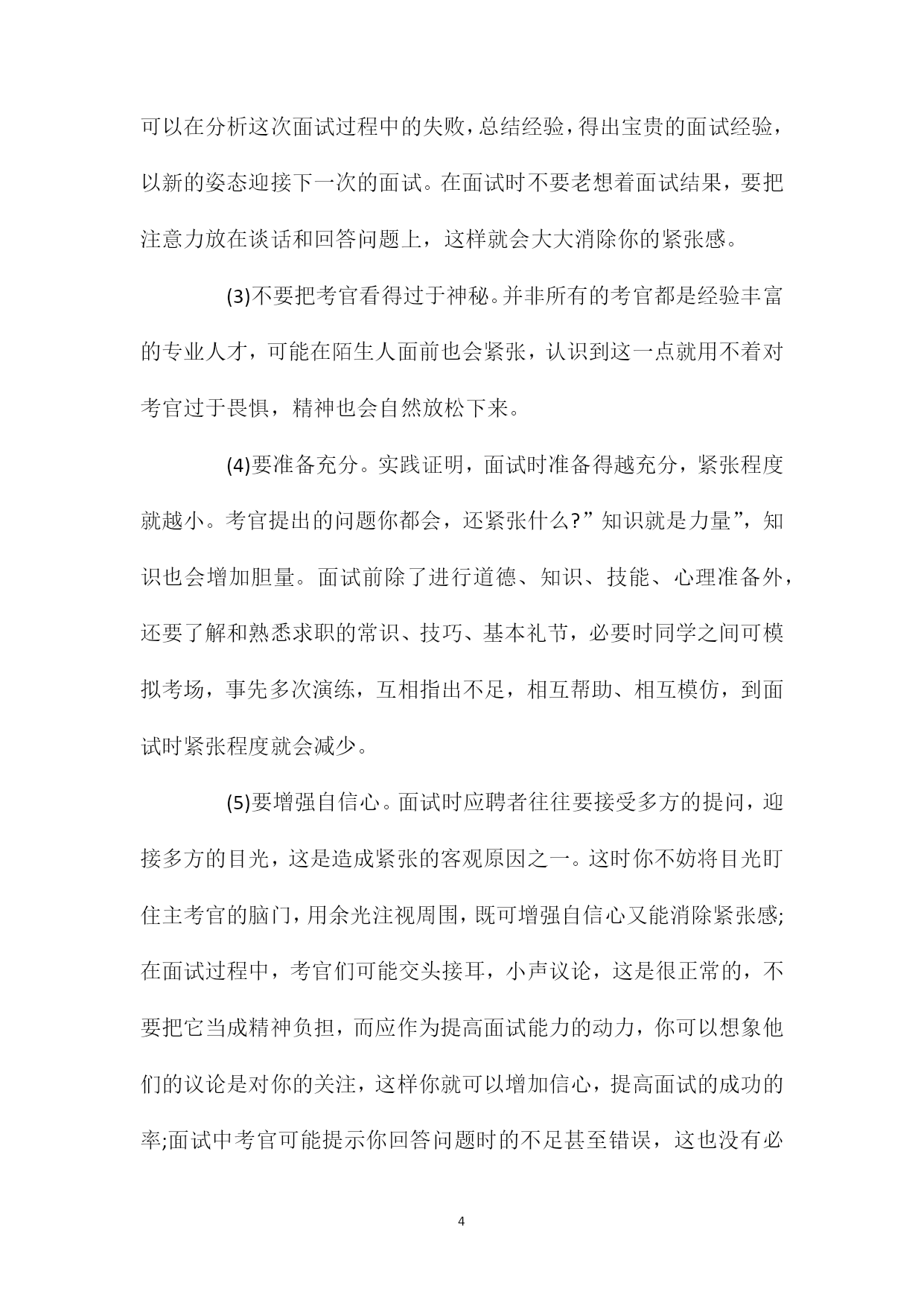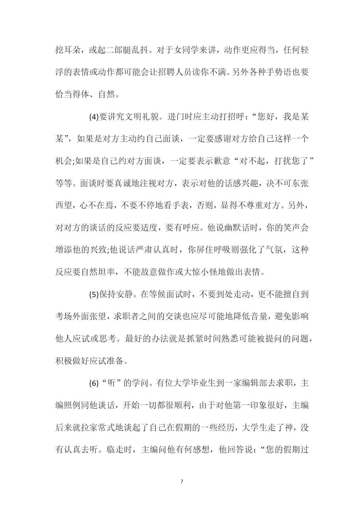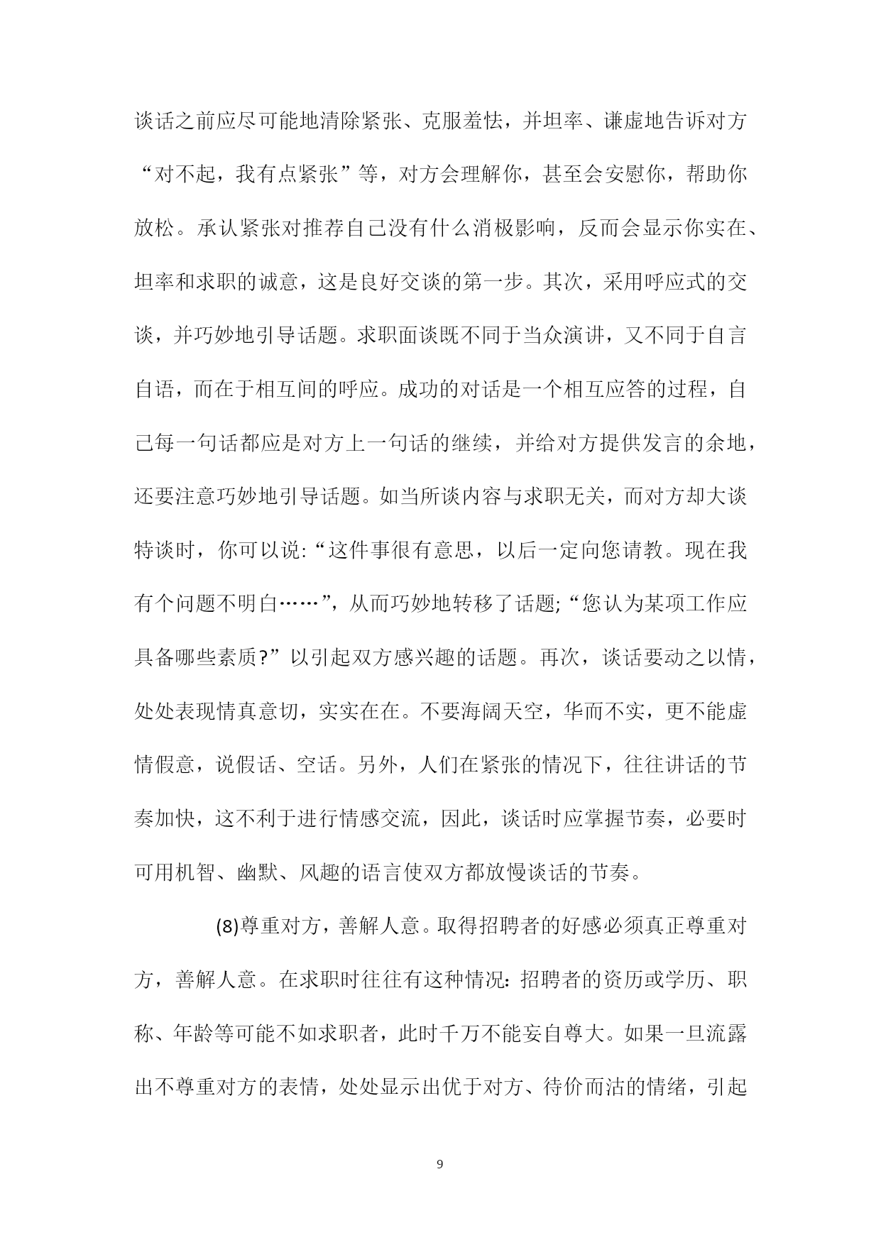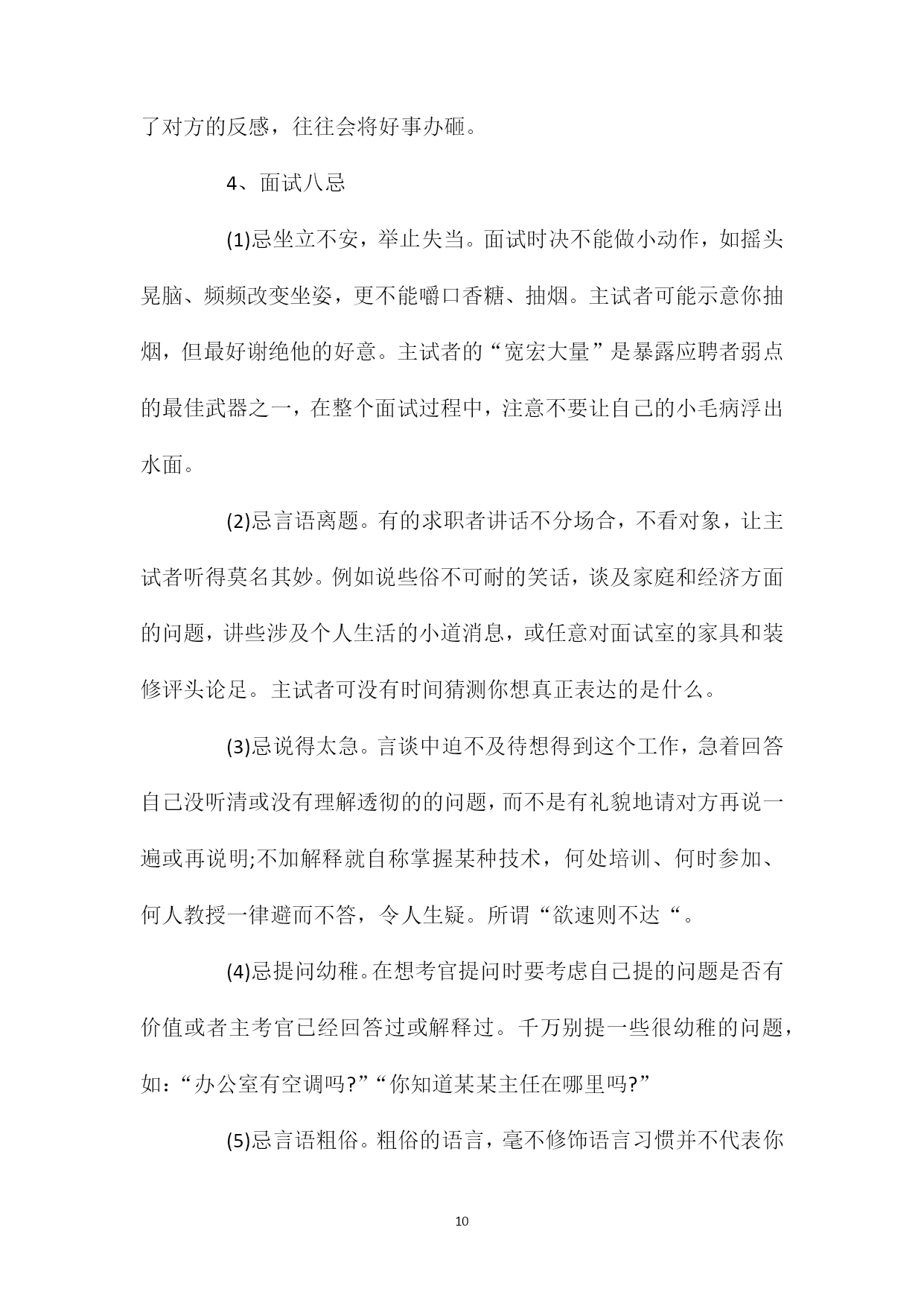 PAGEPAGE11公务员面试技巧和注意事项公务员面试技巧和注意事项:1、基本注意事项(1)要谦虚谨慎。面试和面谈的区别之一就是面试时对方往往是多数人,其中不乏专家、学者,求职者在回答一些比较有深度的问题时,切不可不懂装懂,不明白的地方就要虚心请教或坦白说不懂,这样才会给用人单位留下诚实的好印象。(2)要机智应变。当求职者一人面对众多考官时,心理压力很大,面试的成败大多取决于求职者是否能机智果断,随机应变,能当场把自己的各种聪明才智发挥出来。首先,要注意分析面试类型,如果是主导式,你就应该把目标集中投向主考官,认真礼貌地回答问题;如果是答辩式,你则应把目光投向提问者,切不可只关注甲方而冷待乙方;果是集体式面试,分配给每个求职者的时间很短,事先准备的材料可能用不上,这时最好的方法是根据考官的提问在脑海里重新组合材料,言简意赅地作答,切忌长篇大论。其次要避免尴尬场面,在回答问题时常遇到这些情况:未听清问题便回答,听清了问题自己一时不能作答,回答时出现错误或不知怎么回答的问题时,可能使你处于尴尬的境地。避免尴尬的技巧是:对未听清的问题可以请求对方重复一遍或解释一下;一时回答不出可以请求考官提下一个问题,等考虑成熟后再回答前一个问题;遇到偶然出现的错误也不必耿耿于怀而打乱后面问题的思路。(3)要扬长避短。每个人都有自己的特长和不足,无论是在性格上还是在专业上都是这样。因此在面试时一定要注意扬我所长,避我所短。必要时可以婉转地说明自己的长处和不足,用其他方法加以弥补。例如有些考官会问你这样的问题:“你曾经犯过什么错误吗?”你这时候就可以选择这样回答:“以前我一直有一个粗心的毛病,有一次实习的时候,由于我的粗心把公司的一份材料弄丢了,害的老总狠狠地把我批评了一顿。后来我经常和公司里一个非常细心的女孩子合作,也从她那里学来了很多处理事情的好办法,一直到现在,我都没有因为粗心再犯什么错。”这样的回答,即可以说明你曾经犯过这样的错误,回答了招聘官提出的问题,也表明了那样的错误只是以前出现,现在已经改正了。(4)显示潜能。面试的时间通常很短,求职者不可能把自己的全部才华都展示出来,因此要抓住一切时机,巧妙地显示潜能。例如,应聘会计职位时可以将正在参加计算机专业的业余学习情况”漫不经心’地讲出来,可使对方认为你不仅能熟练地掌握会计业务,而且具有发展会计业务的潜力;报考秘书工作时可以借主考官的提问,把自己的名字、地址、电话等简单资料写在准备好的纸上,顺手递上去,以显示自己写一手漂亮字体的能力等。显示潜能时要实事求是、简短、自然、巧妙,否则也会弄巧成拙。2、面试时如何消除紧张感由于面试成功与否关系到求职者的前途,所以大学生面试时往往容易产生紧张情绪,有的大学生可能还由于过度紧张导致面试失败。所以紧张感在面试中是常见的。紧张是应考者在考官面前精神过度集中的一种心理状态,初次参加面试的人都会有紧张感觉,慌慌张张、粗心大意、说东忘西、词不达意的情况是常见的。那么怎样才能在面试时克服、消除紧张呢?(1)要保持”平常心”。在竞争面前,人人都会紧张,这是一个普遍的规律,面试时你紧张,别人也会紧张,这是客观存在的,要接受这一客观事实。这时你不妨坦率地承认自己紧张,也许会求得理解。同时要进行自我暗示,提醒自己镇静下来,常用的方法是或大声讲话,把面对的考官当熟人对待;或掌握讲话的节奏,”慢慢道来”;或握紧双拳、闭目片刻,先听后讲;或调侃两三句等等,都有助于消除紧张。(2)不要把成败看得太重。”胜败乃兵家常事”要这样提醒自己,如果这次不成,还有下一次机会;这个单位不聘用,还有下一个单位面试的机会等着自己;即使求职不成,也不是说你一无所获,你可以在分析这次面试过程中的失败,总结经验,得出宝贵的面试经验,以新的姿态迎接下一次的面试。在面试时不要老想着面试结果,要把注意力放在谈话和回答问题上,这样就会大大消除你的紧张感。(3)不要把考官看得过于神秘。并非所有的考官都是经验丰富的专业人才,可能在陌生人面前也会紧张,认识到这一点就用不着对考官过于畏惧,精神也会自然放松下来。(4)要准备充分。实践证明,面试时准备得越充分,紧张程度就越小。考官提出的问题你都会,还紧张什么?”知识就是力量”,知识也会增加胆量。面试前除了进行道德、知识、技能、心理准备外,还要了解和熟悉求职的常识、技巧、基本礼节,必要时同学之间可模拟考场,事先多次演练,互相指出不足,相互帮助、相互模仿,到面试时紧张程度就会减少。(5)要增强自信心。面试时应聘者往往要接受多方的提问,迎接多方的目光,这是造成紧张的客观原因之一。这时你不妨将目光盯住主考官的脑门,用余光注视周围,既可增强自信心又能消除紧张感;在面试过程中,考官们可能交头接耳,小声议论,这是很正常的,不要把它当