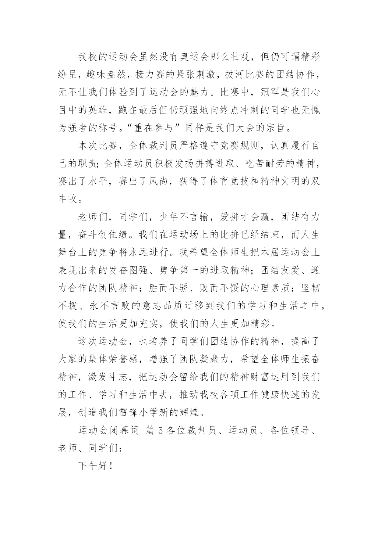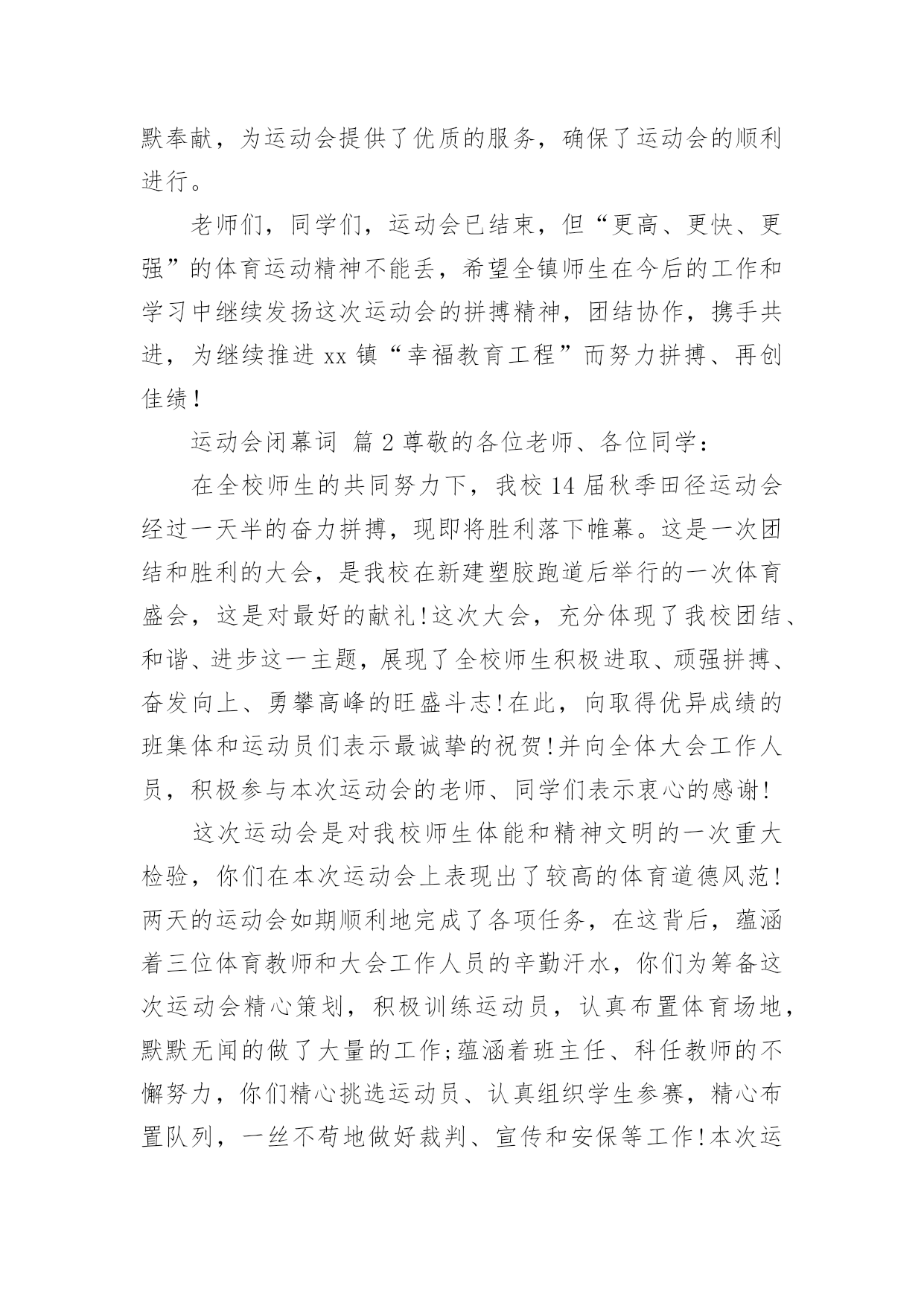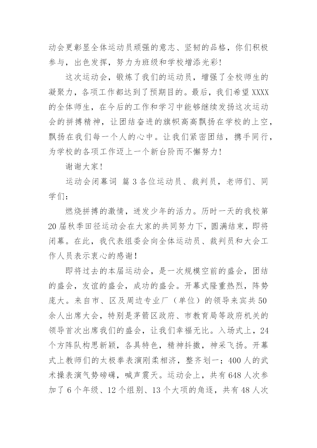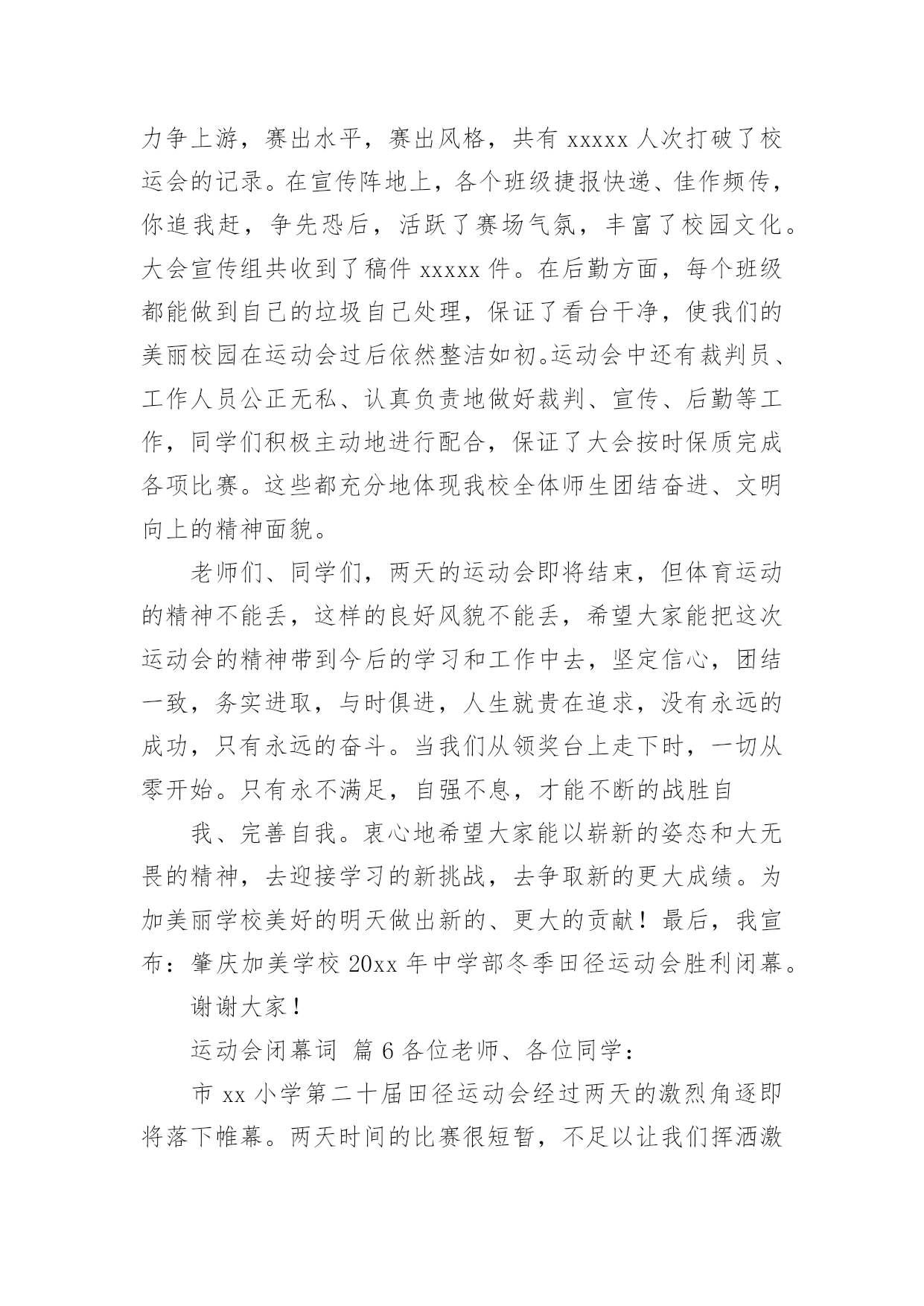 运动会闭幕词运动会闭幕词(通用23篇)运动会是展现团结友爱的运动风采的,那运动会结束后的闭幕词怎么说呢?下面是小编收集整理的相关内容,希望可以帮助到您!运动会闭幕词篇1各位领导、各位来宾、老师们、同学们:xx镇20xx年“幸福教育杯”中小学春季田径运动会,在组委会的精心组织下,经过全体工作人员、裁判员的辛勤工作和全体运动员的奋力拼搏,圆满地完成了预定的各项比赛任务,顺利落下了帷幕。在此,我代表xx镇教育办公室,向在运动会上取得优异成绩的同学和获奖的单位表示热烈的祝贺!向为这次运动会做出不懈努力的大会工作人员、裁判员、教练员和运动员表示衷心的感谢!本次运动会上,全镇师生表现出了良好的体育道德风范和集体主义精神。全镇师生团结协作、挥洒激情。中心小学、初级中学和200多名教师展演的集体操、广场舞,既表现了我镇全体师生积极昂扬的精神风貌,也象征了我镇教育工作改革创新、永争第一的工作作风;赛场上运动员精神饱满,发扬“更高、更快、更强”的体育运动精神,奋力拼搏,屡创佳绩;赛场下同学们摇旗呐喊,加油鼓劲,体现了团队精神;全体裁判员严格执行竞赛规则,认真履行自己的裁判职责,维护了比赛的公平、公正;后勤工作人员恪尽职守,默默奉献,为运动会提供了优质的服务,确保了运动会的顺利进行。老师们,同学们,运动会已结束,但“更高、更快、更强”的体育运动精神不能丢,希望全镇师生在今后的工作和学习中继续发扬这次运动会的拼搏精神,团结协作,携手共进,为继续推进xx镇“幸福教育工程”而努力拼搏、再创佳绩!运动会闭幕词篇2尊敬的各位老师、各位同学:在全校师生的共同努力下,我校14届秋季田径运动会经过一天半的奋力拼搏,现即将胜利落下帷幕。这是一次团结和胜利的大会,是我校在新建塑胶跑道后举行的一次体育盛会,这是对最好的献礼!这次大会,充分体现了我校团结、和谐、进步这一主题,展现了全校师生积极进取、顽强拼搏、奋发向上、勇攀高峰的旺盛斗志!在此,向取得优异成绩的班集体和运动员们表示最诚挚的祝贺!并向全体大会工作人员,积极参与本次运动会的老师、同学们表示衷心的感谢!这次运动会是对我校师生体能和精神文明的一次重大检验,你们在本次运动会上表现出了较高的体育道德风范!两天的运动会如期顺利地完成了各项任务,在这背后,蕴涵着三位体育教师和大会工作人员的辛勤汗水,你们为筹备这次运动会精心策划,积极训练运动员,认真布置体育场地,默默无闻的做了大量的工作;蕴涵着班主任、科任教师的不懈努力,你们精心挑选运动员、认真组织学生参赛,精心布置队列,一丝不苟地做好裁判、宣传和安保等工作!本次运动会更彰显全体运动员顽强的意志、坚韧的品格,你们积极参与,出色发挥,努力为班级和学校增添光彩!这次运动会,锻炼了我们的运动员,增强了全校师生的凝聚力,各项工作都达到了预期目的。最后,我们希望XXXX的全体师生,在今后的工作和学习中能够继续发扬这次运动会的拼搏精神,让团结奋进的旗帜高高飘扬在学校的上空,飘扬在我们每一个人的心中。让我们紧密团结,携手同行,为学校的各项工作迈上一个新台阶而不懈努力!谢谢大家!运动会闭幕词篇3各位运动员、裁判员,老师们、同学们:燃烧拼搏的激情,迸发少年的活力。历时一天的我校第20届秋季田径运动会在大家的共同努力下,圆满结束,即将闭幕。在此,我代表组委会向全体运动员、裁判员和大会工作人员表示衷心的感谢!即将过去的本届运动会,是一次规模空前的盛会,团结的盛会,友谊的盛会,成功的盛会。开幕式隆重热烈,阵势庞大。来自市、区及周边专业厂(单位)的领导来宾共50余人出席大会,特别是茅箭区政府、市教育局等政府机关的领导首次出席我们的盛会,让我们幸福无比。入场式上,24个方阵队构思新颖,各具特色,精神抖擞,神采飞扬。开幕式上教师们的太极拳表演刚柔相济,整齐划一;400人的武术操表演气势磅礴,喊声震天。运动会上,共有648人次参加了6个年级、12个组别、13个大项的角逐,共有48人次获得第一名,共有6个班级获得团体总分第一名,24个班级获得精神文明奖。从入场到表演,从表演到竞赛,从竞赛到总分,环环相扣,衔接自然,行云流水,充分展示了52小学师生绚烂的风采,赢得了与会领导和家长的高度评价,大家以实际行动为伟大祖国60周年华诞和我校建校38周年献上了一份厚重的大礼。回顾本届运动会,我们深深地被每一位运动员感动着。运动会前,运动员们刻苦训练,反复磨练。运动会中,他们秉承“更高、更快、更强”的奥林匹克精神,奋勇争先,顽强拼搏。他们在跑道上画上了一道道美丽的彩虹,他们在运动场上谱写着一个个跳动的音符,他们在我们的心头镌刻了一个个永不磨灭的记忆,是他们让52小学的形象更加亮丽,是他们让永不言弃、拼搏不止的运动精神永远闪耀!回顾本届运动会,我们深深地被每一位裁判员和大会工作人员感动着。他们头顶太阳,却一丝不苟,耐心
