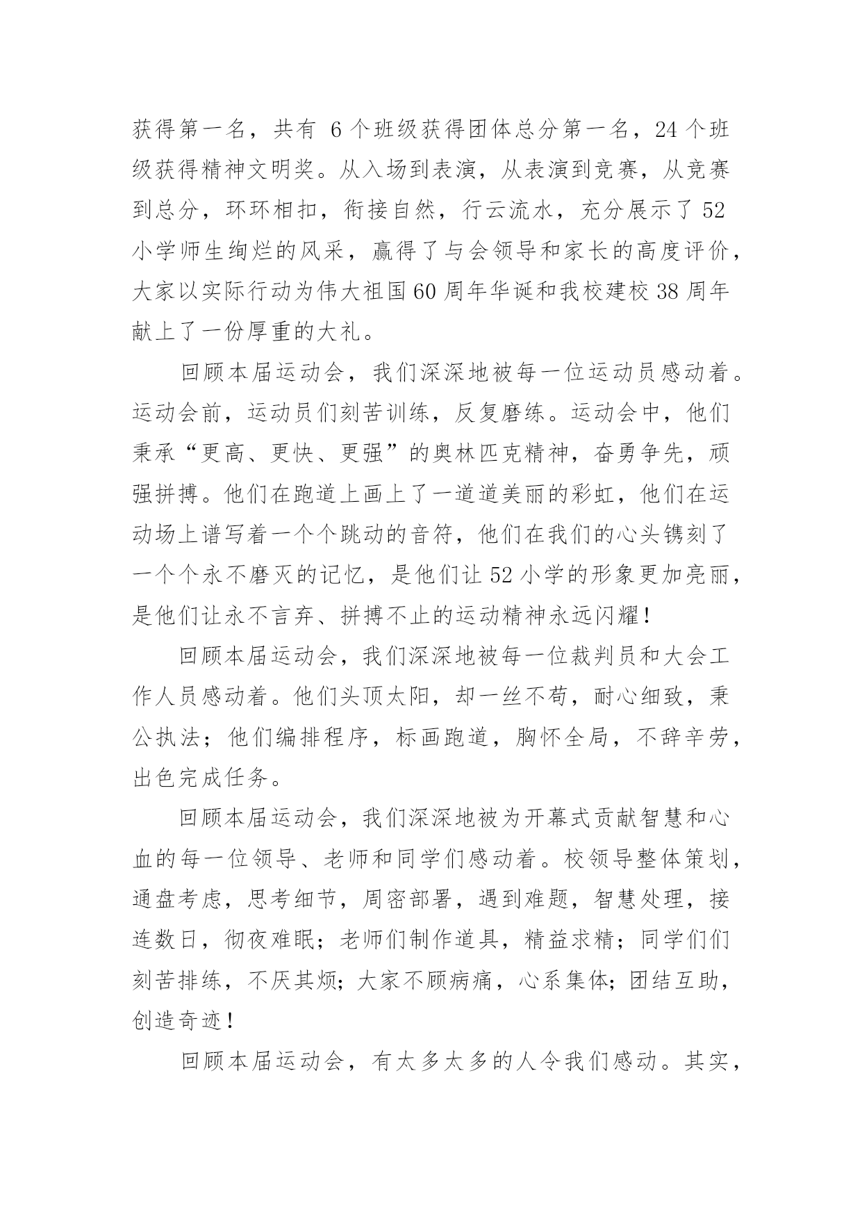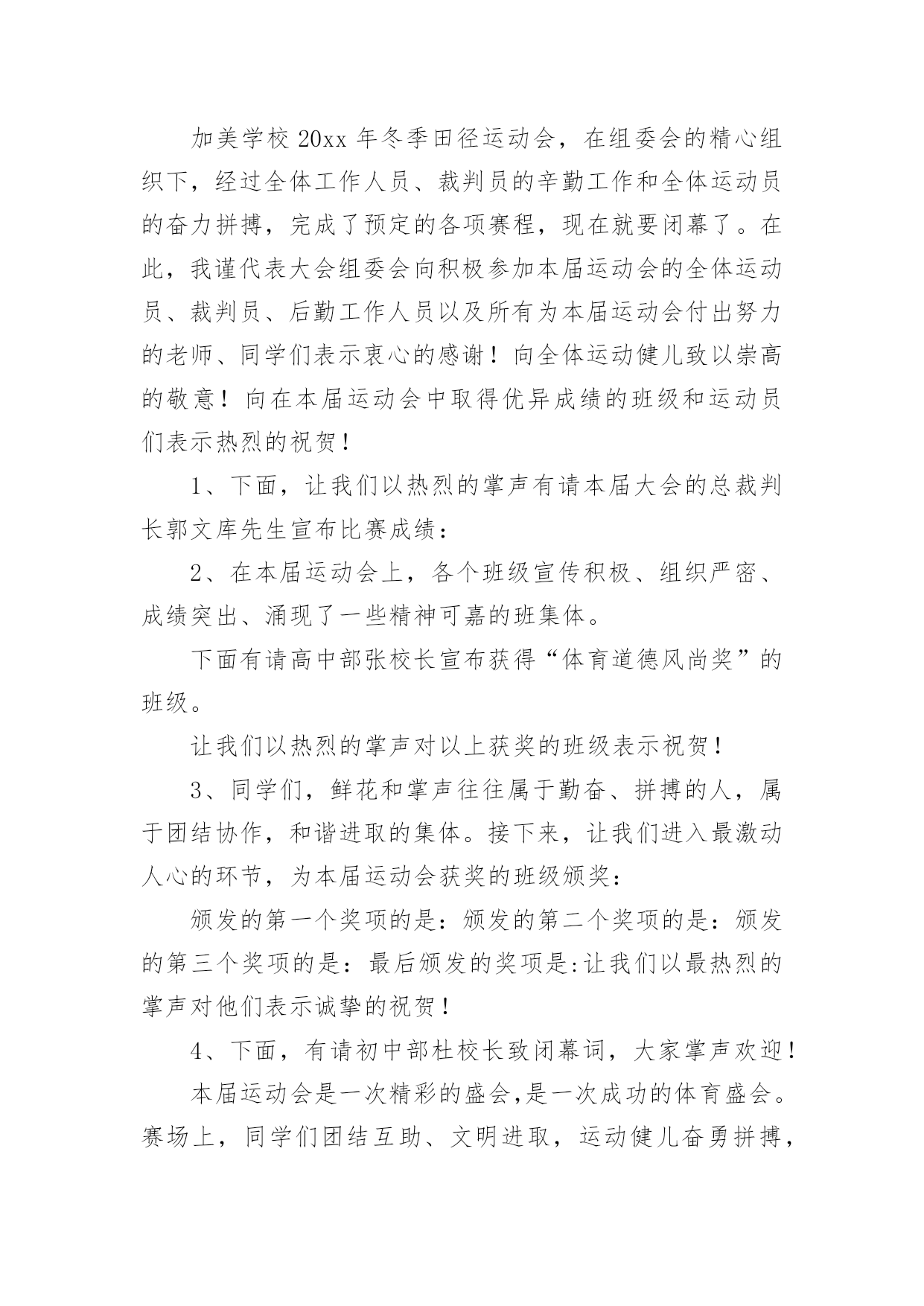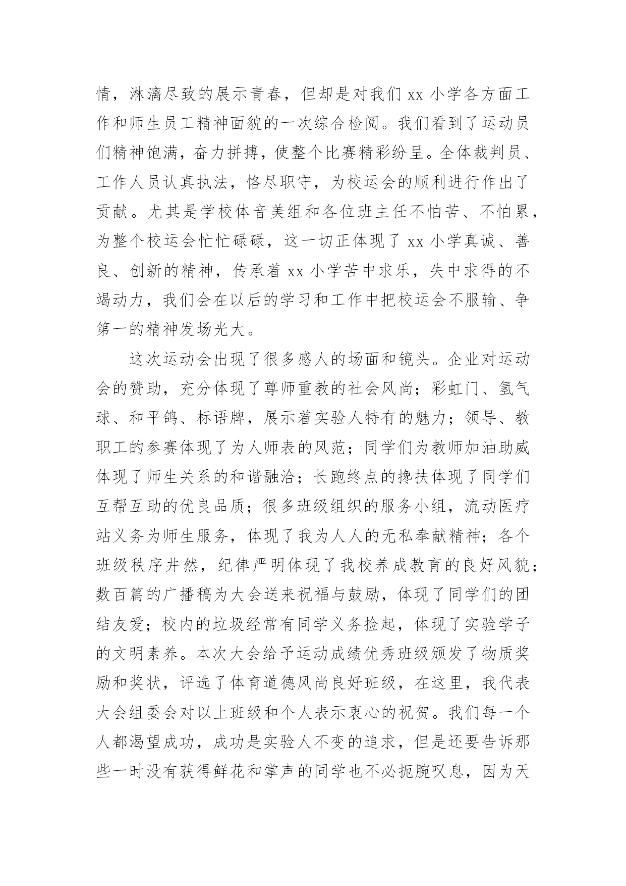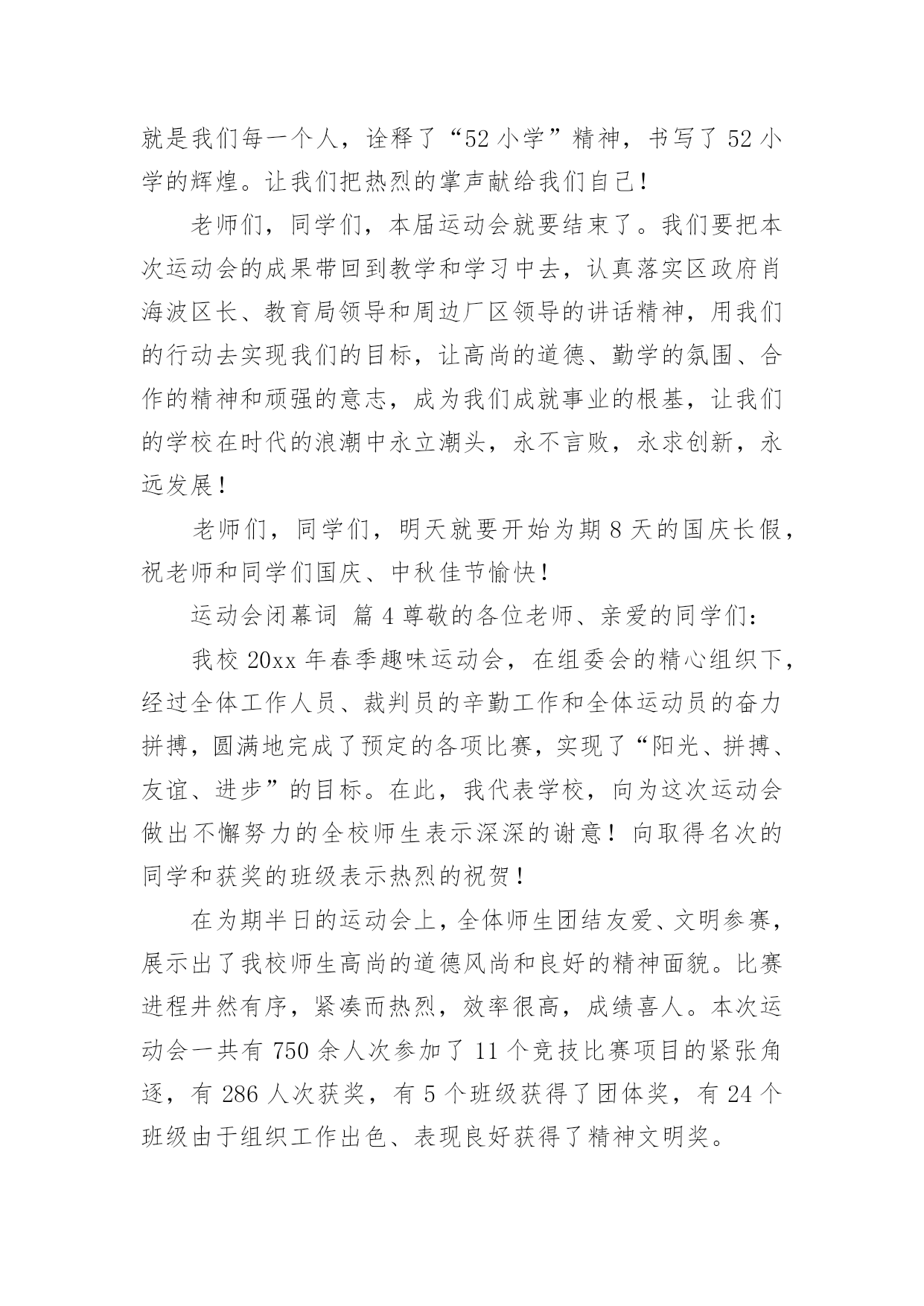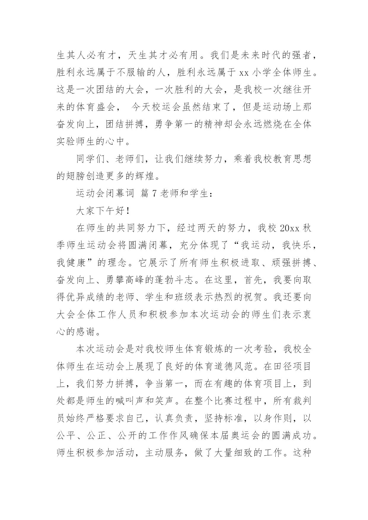 运动会闭幕词运动会闭幕词(通用23篇)运动会是展现团结友爱的运动风采的,那运动会结束后的闭幕词怎么说呢?下面是小编收集整理的相关内容,希望可以帮助到您!运动会闭幕词篇1各位领导、各位来宾、老师们、同学们:xx镇20xx年“幸福教育杯”中小学春季田径运动会,在组委会的精心组织下,经过全体工作人员、裁判员的辛勤工作和全体运动员的奋力拼搏,圆满地完成了预定的各项比赛任务,顺利落下了帷幕。在此,我代表xx镇教育办公室,向在运动会上取得优异成绩的同学和获奖的单位表示热烈的祝贺!向为这次运动会做出不懈努力的大会工作人员、裁判员、教练员和运动员表示衷心的感谢!本次运动会上,全镇师生表现出了良好的体育道德风范和集体主义精神。全镇师生团结协作、挥洒激情。中心小学、初级中学和200多名教师展演的集体操、广场舞,既表现了我镇全体师生积极昂扬的精神风貌,也象征了我镇教育工作改革创新、永争第一的工作作风;赛场上运动员精神饱满,发扬“更高、更快、更强”的体育运动精神,奋力拼搏,屡创佳绩;赛场下同学们摇旗呐喊,加油鼓劲,体现了团队精神;全体裁判员严格执行竞赛规则,认真履行自己的裁判职责,维护了比赛的公平、公正;后勤工作人员恪尽职守,默默奉献,为运动会提供了优质的服务,确保了运动会的顺利进行。老师们,同学们,运动会已结束,但“更高、更快、更强”的体育运动精神不能丢,希望全镇师生在今后的工作和学习中继续发扬这次运动会的拼搏精神,团结协作,携手共进,为继续推进xx镇“幸福教育工程”而努力拼搏、再创佳绩!运动会闭幕词篇2尊敬的各位老师、各位同学:在全校师生的共同努力下,我校14届秋季田径运动会经过一天半的奋力拼搏,现即将胜利落下帷幕。这是一次团结和胜利的大会,是我校在新建塑胶跑道后举行的一次体育盛会,这是对最好的献礼!这次大会,充分体现了我校团结、和谐、进步这一主题,展现了全校师生积极进取、顽强拼搏、奋发向上、勇攀高峰的旺盛斗志!在此,向取得优异成绩的班集体和运动员们表示最诚挚的祝贺!并向全体大会工作人员,积极参与本次运动会的老师、同学们表示衷心的感谢!这次运动会是对我校师生体能和精神文明的一次重大检验,你们在本次运动会上表现出了较高的体育道德风范!两天的运动会如期顺利地完成了各项任务,在这背后,蕴涵着三位体育教师和大会工作人员的辛勤汗水,你们为筹备这次运动会精心策划,积极训练运动员,认真布置体育场地,默默无闻的做了大量的工作;蕴涵着班主任、科任教师的不懈努力,你们精心挑选运动员、认真组织学生参赛,精心布置队列,一丝不苟地做好裁判、宣传和安保等工作!本次运动会更彰显全体运动员顽强的意志、坚韧的品格,你们积极参与,出色发挥,努力为班级和学校增添光彩!这次运动会,锻炼了我们的运动员,增强了全校师生的凝聚力,各项工作都达到了预期目的。最后,我们希望XXXX的全体师生,在今后的工作和学习中能够继续发扬这次运动会的拼搏精神,让团结奋进的旗帜高高飘扬在学校的上空,飘扬在我们每一个人的心中。让我们紧密团结,携手同行,为学校的各项工作迈上一个新台阶而不懈努力!谢谢大家!运动会闭幕词篇3各位运动员、裁判员,老师们、同学们:燃烧拼搏的激情,迸发少年的活力。历时一天的我校第20届秋季田径运动会在大家的共同努力下,圆满结束,即将闭幕。在此,我代表组委会向全体运动员、裁判员和大会工作人员表示衷心的感谢!即将过去的本届运动会,是一次规模空前的盛会,团结的盛会,友谊的盛会,成功的盛会。开幕式隆重热烈,阵势庞大。来自市、区及周边专业厂(单位)的领导来宾共50余人出席大会,特别是茅箭区政府、市教育局等政府机关的领导首次出席我们的盛会,让我们幸福无比。入场式上,24个方阵队构思新颖,各具特色,精神抖擞,神采飞扬。开幕式上教师们的太极拳表演刚柔相济,整齐划一;400人的武术操表演气势磅礴,喊声震天。运动会上,共有648人次参加了6个年级、12个组别、13个大项的角逐,共有48人次获得第一名,共有6个班级获得团体总分第一名,24个班级获得精神文明奖。从入场到表演,从表演到竞赛,从竞赛到总分,环环相扣,衔接自然,行云流水,充分展示了52小学师生绚烂的风采,赢得了与会领导和家长的高度评价,大家以实际行动为伟大祖国60周年华诞和我校建校38周年献上了一份厚重的大礼。回顾本届运动会,我们深深地被每一位运动员感动着。运动会前,运动员们刻苦训练,反复磨练。运动会中,他们秉承“更高、更快、更强”的奥林匹克精神,奋勇争先,顽强拼搏。他们在跑道上画上了一道道美丽的彩虹,他们在运动场上谱写着一个个跳动的音符,他们在我们的心头镌刻了一个个永不磨灭的记忆,是他们让52小学的形象更加亮丽,是他们让永不言弃、拼搏不止的运动精神永远闪耀!回顾本届运动会,我们深深地被每一位裁判员和大会工作人员感动着。他们头顶太阳,却一丝不苟,耐心