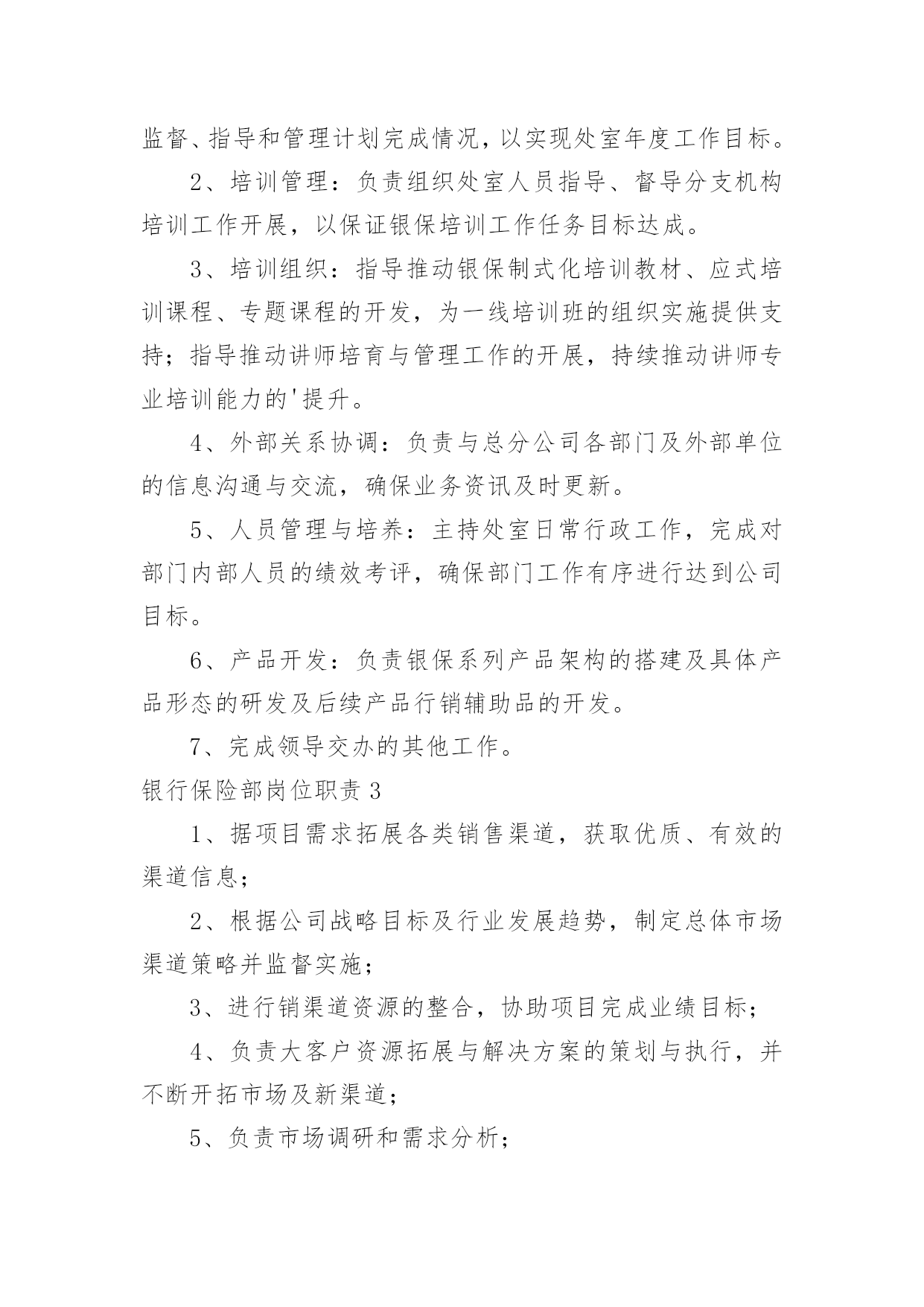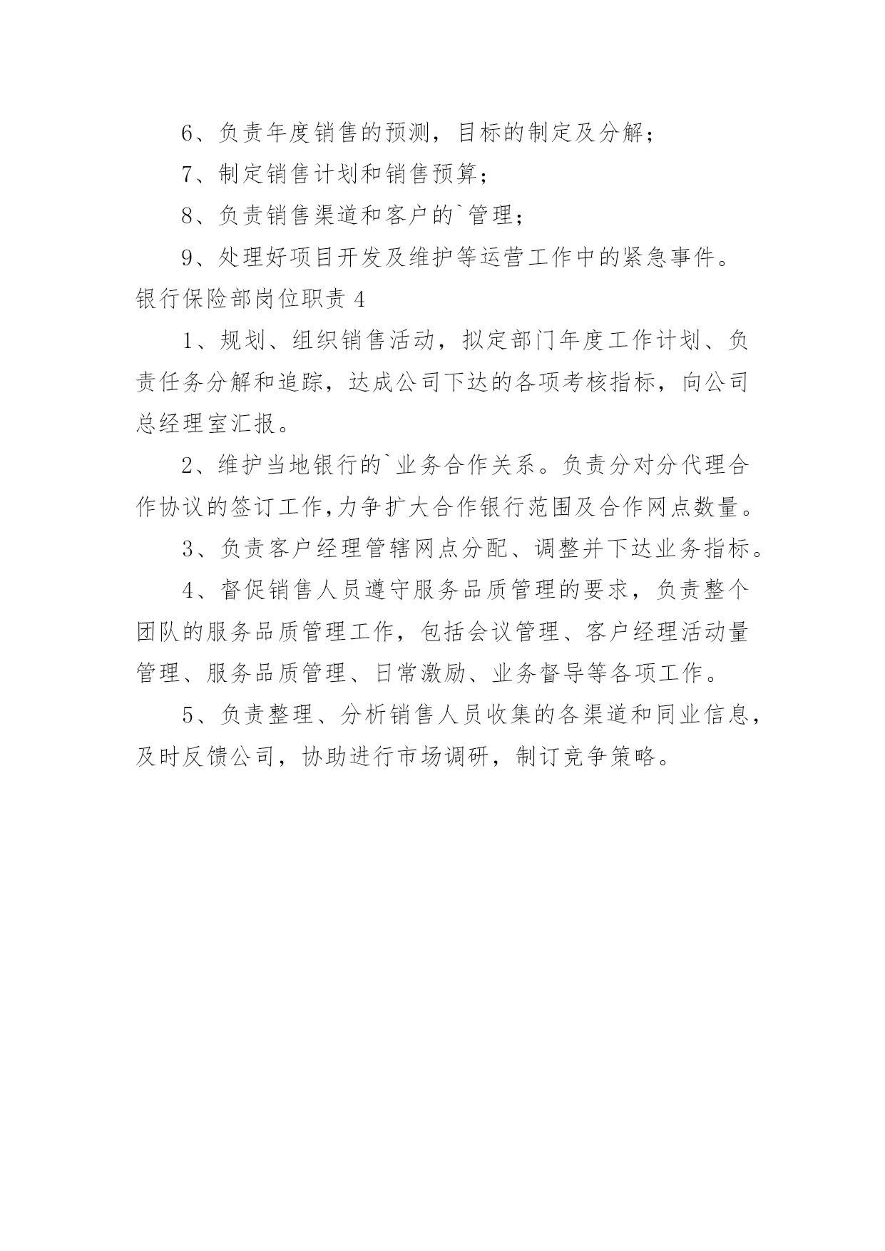 银行保险部岗位职责银行保险部岗位职责在学习、工作、生活中,我们每个人都可能会接触到岗位职责,岗位职责是指一个岗位所需要去完成的工作内容以及应当承担的责任范围,职责是职务与责任的统一,由授权范围和相应的责任两部分组成。那么什么样的岗位职责才是有效的呢?下面是小编为大家收集的银行保险部岗位职责,欢迎大家分享。银行保险部岗位职责1(一)经营网点日常销售活动、维护关系、进行培训和业务辅导,按时达成业务及考核指标;(二)负责网点各项配套服务工作,包括单证资料的.配送、收集及初审;(三)做好客户服务工作,包括业务咨询、投保、保单取送以及保全变更、给付、退保、理赔等各项手续的协助办理;(四)收集网点信息、健全网点经营档案、检视网点经营效果和业务风险,及时上报并落实改善措施;(五)完成公司交办的其他工作。银行保险部岗位职责21、业务规划和督导:负责组织制定处室年度工作计划,监督、指导和管理计划完成情况,以实现处室年度工作目标。2、培训管理:负责组织处室人员指导、督导分支机构培训工作开展,以保证银保培训工作任务目标达成。3、培训组织:指导推动银保制式化培训教材、应式培训课程、专题课程的开发,为一线培训班的组织实施提供支持;指导推动讲师培育与管理工作的开展,持续推动讲师专业培训能力的'提升。4、外部关系协调:负责与总分公司各部门及外部单位的信息沟通与交流,确保业务资讯及时更新。5、人员管理与培养:主持处室日常行政工作,完成对部门内部人员的绩效考评,确保部门工作有序进行达到公司目标。6、产品开发:负责银保系列产品架构的搭建及具体产品形态的研发及后续产品行销辅助品的开发。7、完成领导交办的其他工作。银行保险部岗位职责31、据项目需求拓展各类销售渠道,获取优质、有效的渠道信息;2、根据公司战略目标及行业发展趋势,制定总体市场渠道策略并监督实施;3、进行销渠道资源的整合,协助项目完成业绩目标;4、负责大客户资源拓展与解决方案的策划与执行,并不断开拓市场及新渠道;5、负责市场调研和需求分析;6、负责年度销售的预测,目标的制定及分解;7、制定销售计划和销售预算;8、负责销售渠道和客户的`管理;9、处理好项目开发及维护等运营工作中的紧急事件。银行保险部岗位职责41、规划、组织销售活动,拟定部门年度工作计划、负责任务分解和追踪,达成公司下达的各项考核指标,向公司总经理室汇报。2、维护当地银行的`业务合作关系。负责分对分代理合作协议的签订工作,力争扩大合作银行范围及合作网点数量。3、负责客户经理管辖网点分配、调整并下达业务指标。4、督促销售人员遵守服务品质管理的要求,负责整个团队的服务品质管理工作,包括会议管理、客户经理活动量管理、服务品质管理、日常激励、业务督导等各项工作。5、负责整理、分析销售人员收集的各渠道和同业信息,及时反馈公司,协助进行市场调研,制订竞争策略。