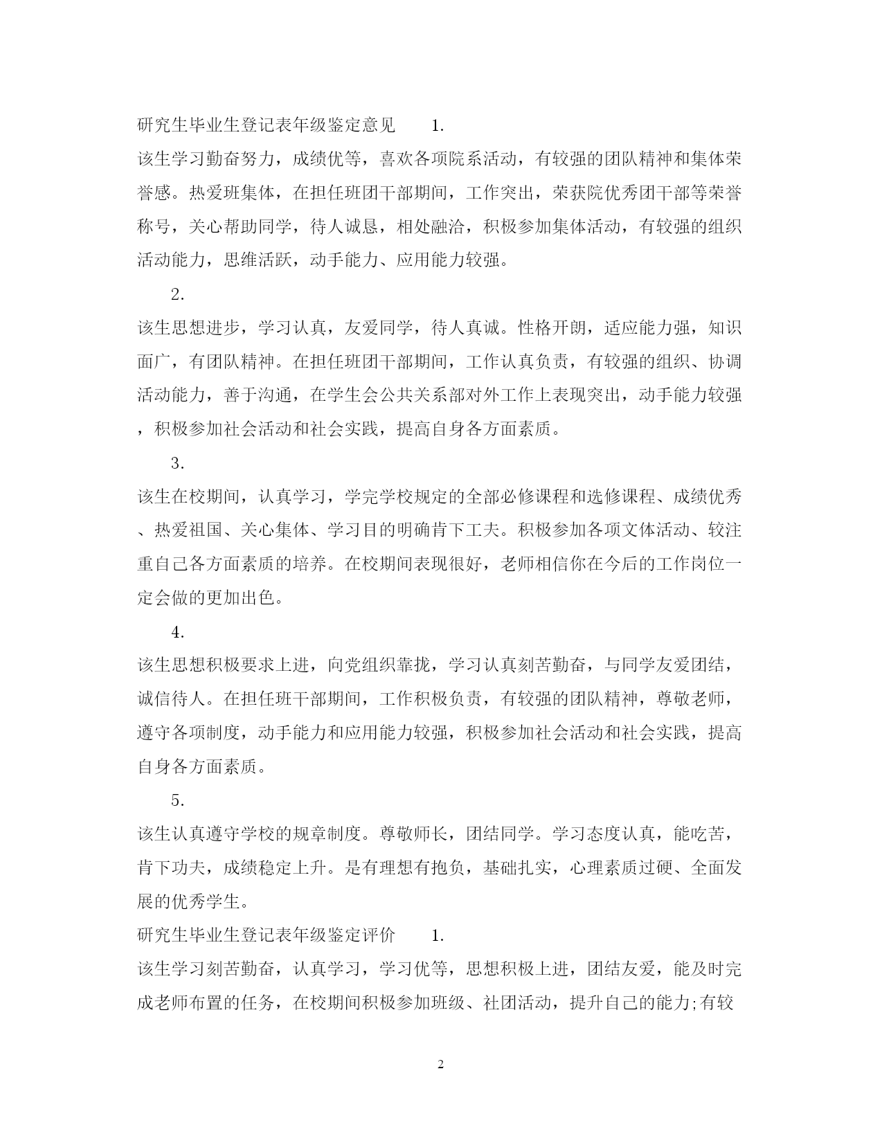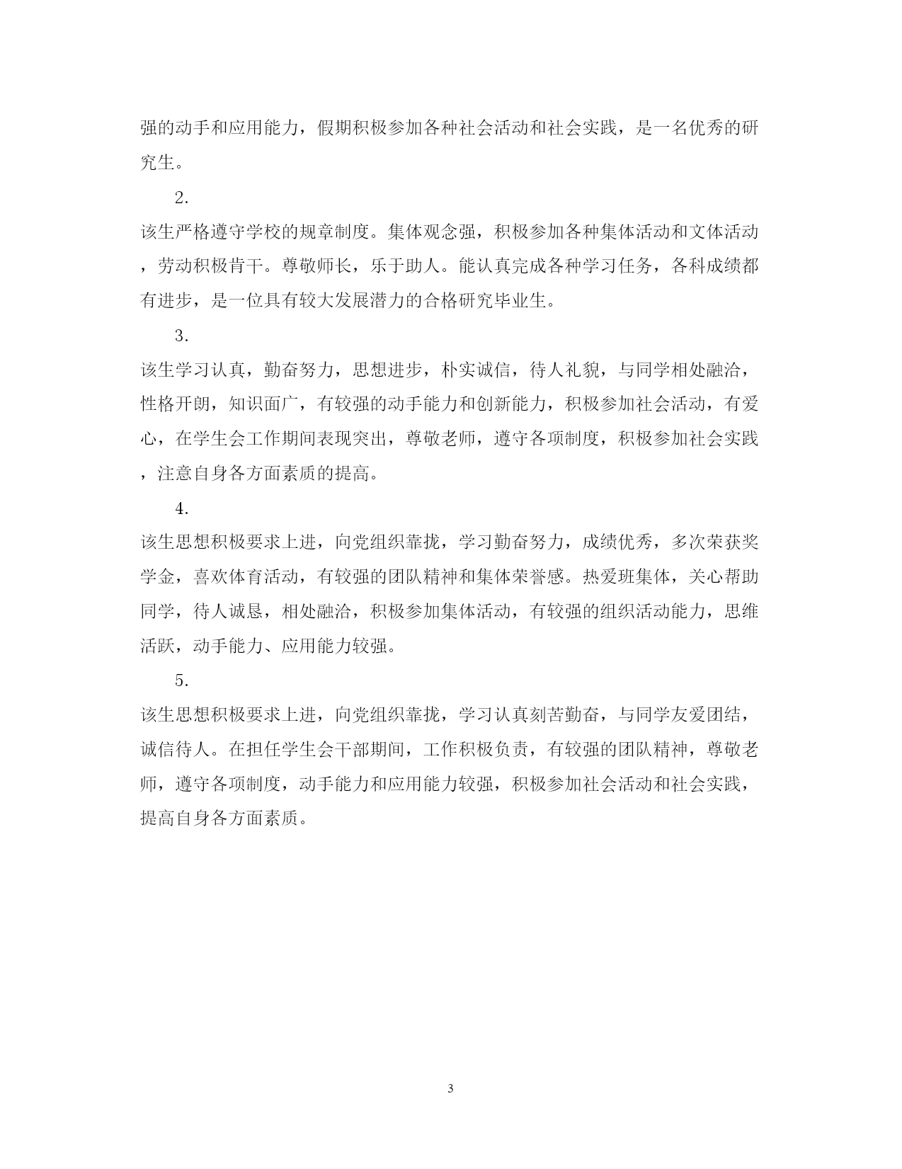 此资料由网络收集而来,如有侵权请告知上传者立即删除。资料共分享,我们负责传递知识。PAGEPAGE3研究生毕业生登记表年级鉴定评语时间过得真快,研究生毕业的日子也快到了,那么你要怎么去写研究生毕业生登记表年级鉴定评语呢?下面由本小编精心整理的研究生毕业生登记表年级鉴定评语,希望可以帮到你哦!研究生毕业生登记表年级鉴定评语1.该生思想进步,学习认真,成绩优秀,友爱同学,待人真诚。性格开朗,适应能力强,知识面广,有团队精神。在担任班团干部期间,工作认真负责,有较强的组织、协调活动能力,尊敬老师,遵守各项规章制度,动手能力较强,积极参加社会活动和社会实践,提高自身各方面素质。2.该生在校期间,认真学习,学完学校规定的全部必修课程和选修课程、成绩优良、热爱祖国、关心集体、政治上要求进步、自觉遵守学校的各项规章制度、学习目的明确肯下工夫。积极参加各项文体活动、较注重自己各方面素质的培养。3.该生能以校规班规严格要求自己。尊敬师长,团结同学。集体观念强,劳动收集整理积极肯干。积极参加各种集体活动和社会实践活动。学习目的明确,刻苦认真,是位综合素质高的学生。4.该同学开朗自信,学习认真,团结同学,能经常参加校内外的各项活动和暑期实践;能熟练掌握专业知识;有良好的心理素质和应变能力,勇于进去,不怕挫折,是一名优秀的研究生;老师相信你在今后的岗位上一定会表线的更加突出。5.该生严格遵守学校的规章制度。学习态度认真刻苦,能较好地完成各种学习任务,成绩稳定。集体观念强,积极参加各种集体活动和社会实践活动。尊敬师长,团结同学,上进心强,有理想抱负,是个全面发展的好学生。研究生毕业生登记表年级鉴定意见1.该生学习勤奋努力,成绩优等,喜欢各项院系活动,有较强的团队精神和集体荣誉感。热爱班集体,在担任班团干部期间,工作突出,荣获院优秀团干部等荣誉称号,关心帮助同学,待人诚恳,相处融洽,积极参加集体活动,有较强的组织活动能力,思维活跃,动手能力、应用能力较强。2.该生思想进步,学习认真,友爱同学,待人真诚。性格开朗,适应能力强,知识面广,有团队精神。在担任班团干部期间,工作认真负责,有较强的组织、协调活动能力,善于沟通,在学生会公共关系部对外工作上表现突出,动手能力较强,积极参加社会活动和社会实践,提高自身各方面素质。3.该生在校期间,认真学习,学完学校规定的全部必修课程和选修课程、成绩优秀、热爱祖国、关心集体、学习目的明确肯下工夫。积极参加各项文体活动、较注重自己各方面素质的培养。在校期间表现很好,老师相信你在今后的工作岗位一定会做的更加出色。4.该生思想积极要求上进,向党组织靠拢,学习认真刻苦勤奋,与同学友爱团结,诚信待人。在担任班干部期间,工作积极负责,有较强的团队精神,尊敬老师,遵守各项制度,动手能力和应用能力较强,积极参加社会活动和社会实践,提高自身各方面素质。5.该生认真遵守学校的规章制度。尊敬师长,团结同学。学习态度认真,能吃苦,肯下功夫,成绩稳定上升。是有理想有抱负,基础扎实,心理素质过硬、全面发展的优秀学生。研究生毕业生登记表年级鉴定评价1.该生学习刻苦勤奋,认真学习,学习优等,思想积极上进,团结友爱,能及时完成老师布置的任务,在校期间积极参加班级、社团活动,提升自己的能力;有较强的动手和应用能力,假期积极参加各种社会活动和社会实践,是一名优秀的研究生。2.该生严格遵守学校的规章制度。集体观念强,积极参加各种集体活动和文体活动,劳动积极肯干。尊敬师长,乐于助人。能认真完成各种学习任务,各科成绩都有进步,是一位具有较大发展潜力的合格研究毕业生。3.该生学习认真,勤奋努力,思想进步,朴实诚信,待人礼貌,与同学相处融洽,性格开朗,知识面广,有较强的动手能力和创新能力,积极参加社会活动,有爱心,在学生会工作期间表现突出,尊敬老师,遵守各项制度,积极参加社会实践,注意自身各方面素质的提高。4.该生思想积极要求上进,向党组织靠拢,学习勤奋努力,成绩优秀,多次荣获奖学金,喜欢体育活动,有较强的团队精神和集体荣誉感。热爱班集体,关心帮助同学,待人诚恳,相处融洽,积极参加集体活动,有较强的组织活动能力,思维活跃,动手能力、应用能力较强。5.该生思想积极要求上进,向党组织靠拢,学习认真刻苦勤奋,与同学友爱团结,诚信待人。在担任学生会干部期间,工作积极负责,有较强的团队精神,尊敬老师,遵守各项制度,动手能力和应用能力较强,积极参加社会活动和社会实践,提高自身各方面素质。