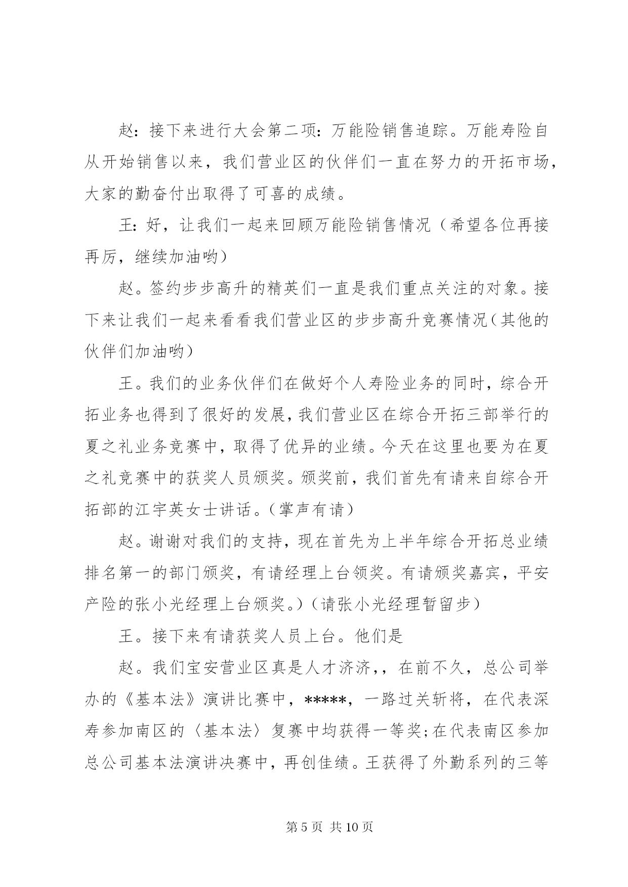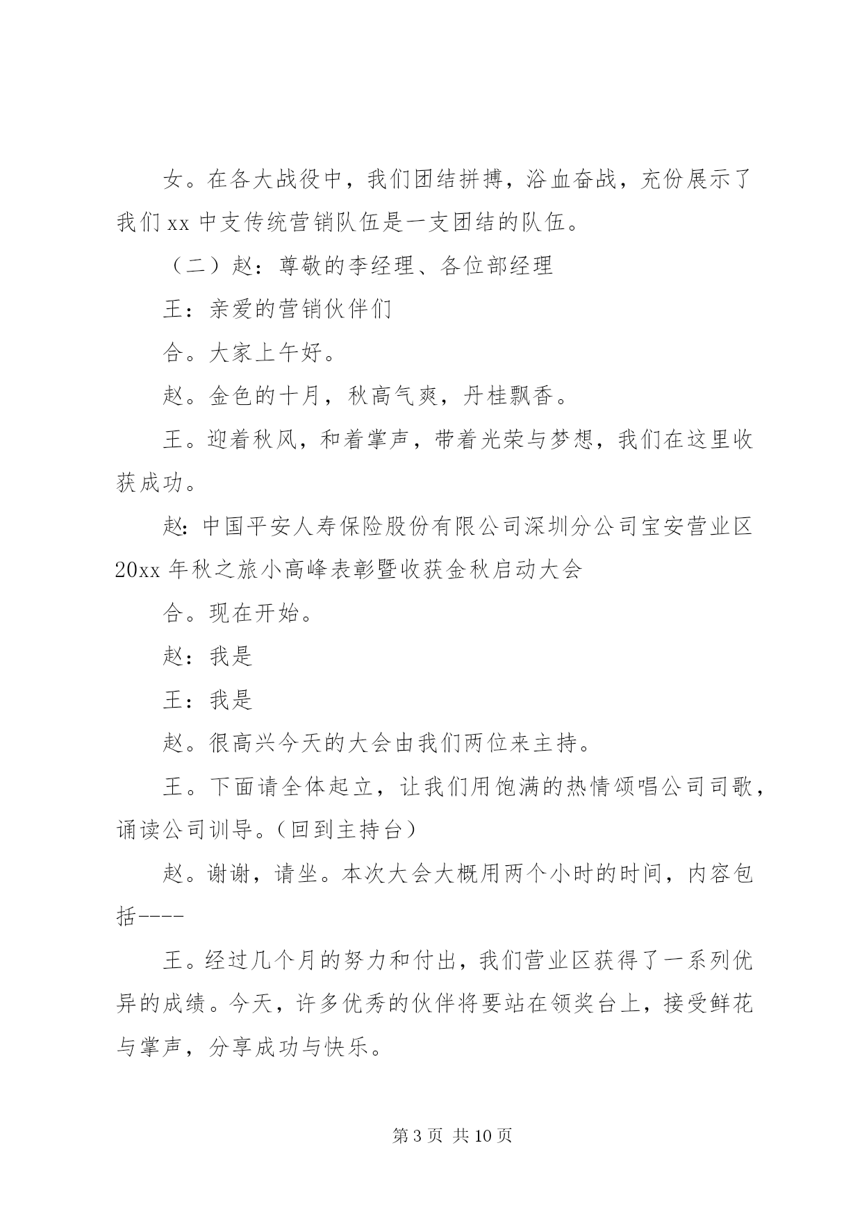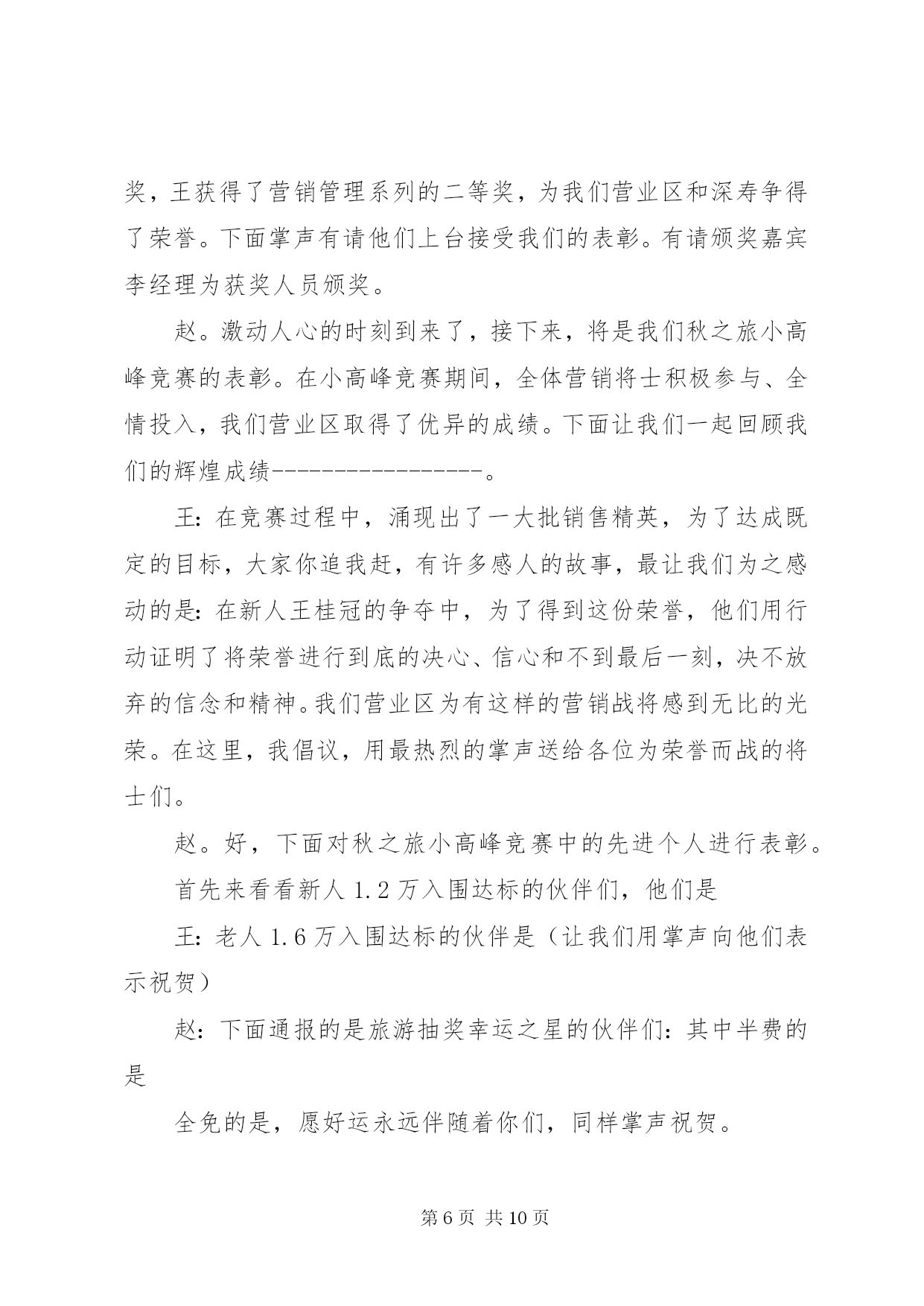 第PAGE\*Arabic\*MERGEFORMAT10页共NUMPAGES\*MERGEFORMAT10页保险表彰大会主持词快要到年末了,对于表现优秀的员工我们要给予表扬。那么表彰大会主持词该怎么写呢。下面随小编一起来看看吧。(一)男:有请各位全体起立,掌声欢迎领导入场……男:xx人寿保险股份有限公司女:xx人寿保险股份有限公司男:尊敬的各位领导,各位同仁女:亲爱的各位太保的精英们合。大家早上好。男。很荣幸担任“xx分公司xx中支传统营销20xx年度总结暨20xx年度开门红启动盛典”的主持人。大家好,我是xxx。女。大家好,我是xxx。男:勤羊辞旧千家同喜顽猴闹春万户皆福女:羊随新风辞旧岁,猴节正气报新春男。听那锣鼓震天,是在庆祝今天xx保险喜庆的日子。女。看那彩蝶纷飞,是在翘首迎接xx保险的寿险精英。男:请欣赏开场舞合:开门红男。歌声、掌声永不停息,因为你们我们永远骄傲。女。努力、成功永无止尽,因为你们我们永远自豪。男。回眸20xx,寿险路上,洒下我们辛勤的汗水,留下我们飒爽的英姿。女。回眸20xx,营销途中,回荡我们炫烂的欢笑,汇聚我们竞技的热情。男。今天,我们相聚于此,用欢乐的歌声,共同回首20xx的光荣。女。今天,我们相聚于此,用庆贺的掌声,共同揭开20xx的梦想。男:现在我宣布xx分公司xx中支传统营销20xx年度总结暨20xx年度开门红启动盛典合。正式开始。男。本次表彰会,我们还请到了一些尊贵的客人,他们将和我们一起分享喜悦,见证精英们的光荣时刻。女:请容许我为大家一一介绍,参加本次大会的领导有:xx分公司副总经理xxx先生男:xx分公司xx中支个险条线总经理xx女士女。让我们对领导们的xx表示最衷心的感谢。参加表彰会的还有各支公司的经理、组训,获得20xx年度荣誉表彰的销售精英、优秀主管、业务部经理、以及来自全区的优秀营销伙伴们,欢迎你们的到来。男。亲爱的伙伴们,20xx年,又是不平凡的一年,在这一年里,营业部市内外十四家机构你追我赶,均取得了卓越的成绩。女。在各大战役中,我们团结拼搏,浴血奋战,充份展示了我们xx中支传统营销队伍是一支团结的队伍。(二)赵:尊敬的李经理、各位部经理王:亲爱的营销伙伴们合。大家上午好。赵。金色的十月,秋高气爽,丹桂飘香。王。迎着秋风,和着掌声,带着光荣与梦想,我们在这里收获成功。赵:中国平安人寿保险股份有限公司深圳分公司宝安营业区20xx年秋之旅小高峰表彰暨收获金秋启动大会合。现在开始。赵:我是王:我是赵。很高兴今天的大会由我们两位来主持。王。下面请全体起立,让我们用饱满的热情颂唱公司司歌,诵读公司训导。(回到主持台)赵。谢谢,请坐。本次大会大概用两个小时的时间,内容包括----王。经过几个月的努力和付出,我们营业区获得了一系列优异的成绩。今天,许多优秀的伙伴将要站在领奖台上,接受鲜花与掌声,分享成功与快乐。赵。这是一个充满喜悦、洋溢着激动,让人沸腾的时刻,就让我们用喜悦去拥抱丰收的果实,让我们用激情来高唱成功的凯歌。王:首先进行大会第一项:为三季度晋升的主任颁奖。赵。在我们营业区,有这样一群优秀的业务同人,不仅业绩做得好,还借助基本法不断发展和壮大组织,在他们的努力和拼搏下,终于在三季度顺利晋升了。王:三季度晋升的业务主任是(念到名字请走上台来)行销主任是赵。掌声有请经理为以上晋升主任颁奖。努力的耕作,辛勤的付出,用卓越的才华、用饱满的热情投入到寿险事业中,努力竞争,奋力拼搏,持续奋斗是我们不变的追求。(有请合影留念)王:(掌声请回坐)三季度晋升的高级主任是资深主任是(掌声有请到前台来)赵。有请颁奖嘉宾经理上台颁奖。王。回首昨天,我们用自己的心血,用自己的汗水,用自己的青春热情,迈出了坚实的步伐。只有发展才是硬道理,衷心的恭喜你们。让我们用热烈的掌声向以上主任们表示祝贺。(有请合影留念)(有请各位主任回到座位)赵:接下来进行大会第二项:万能险销售追踪。万能寿险自从开始销售以来,我们营业区的伙伴们一直在努力的开拓市场,大家的勤奋付出取得了可喜的成绩。王:好,让我们一起来回顾万能险销售情况(希望各位再接再厉,继续加油哟)赵。签约步步高升的精英们一直是我们重点关注的对象。接下来让我们一起来看看我们营业区的步步高升竞赛情况(其他的伙伴们加油哟)王。我们的业务伙伴们在做好个人寿险业务的同时,综合开拓业务也得到了很好的发展,我们营业区在综合开拓三部举行的夏之礼业务竞赛中,取得了优异的业绩。今天在这里也要为在夏之礼竞赛中的获奖人员颁奖。颁奖前,我们首先有请来自综合开拓部的江宇英女士讲话。(掌声有请)赵。谢谢对我们的支持,现在首先为上半年综合开拓总业绩排名第一的部门颁奖,有请经理上台领奖。有请颁奖嘉宾,平安产险的张小光经理上台颁奖。)(请张小光经理暂留步)王。接下来有