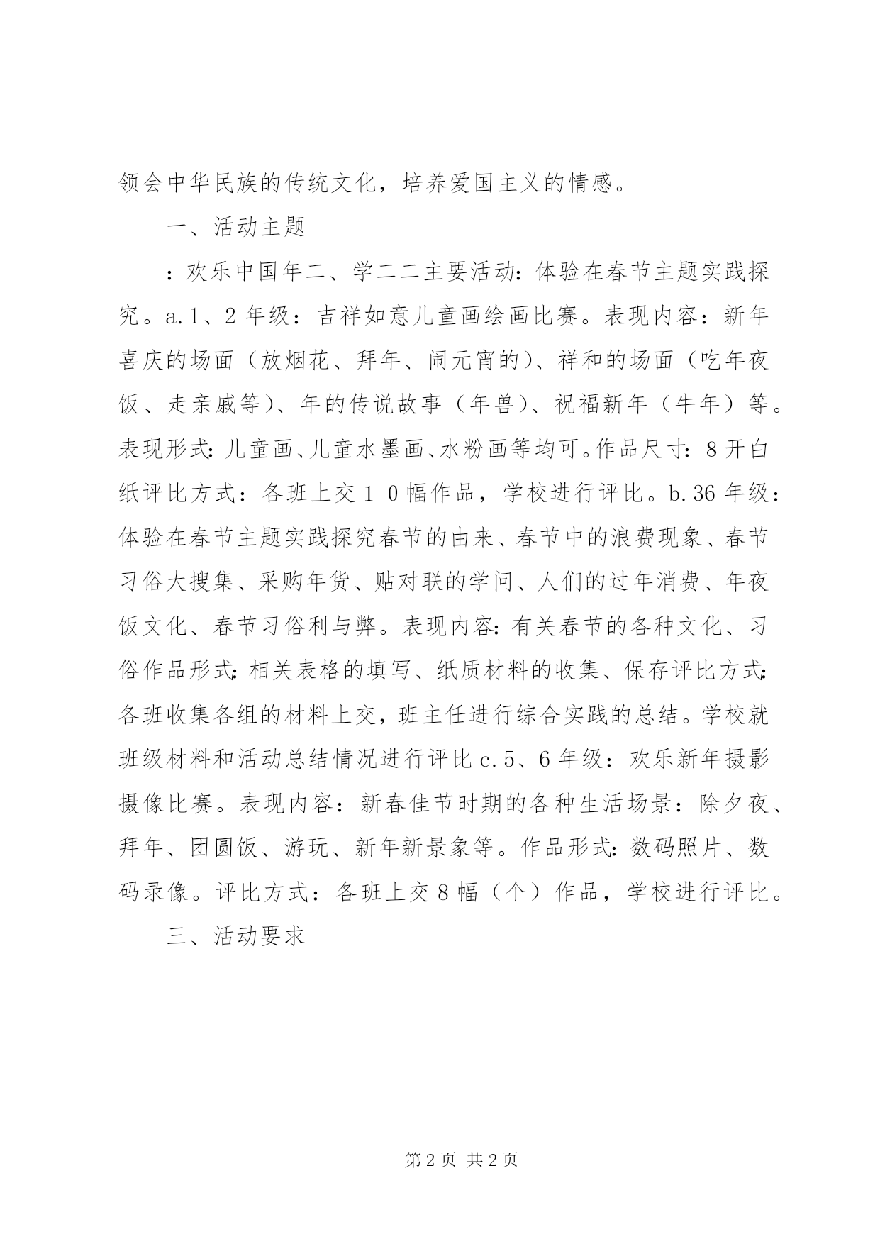 第PAGE\*Arabic\*MERGEFORMAT2页共NUMPAGES\*MERGEFORMAT2页小学春节活动方案小学春节活动方案一。为了贯彻落实《全民健身条例》和《学校体育工作条例》,丰富校园文化生活,不断提高师生的健身意识和健康水平,进一步推动学校体育和全民健身活动的深入开展,切实将学生每天锻炼一小时的活动落到实处。特制订2012年冬季学校体育活动实施方案。一、实施办法1、时间:2012年1月上旬;2、项目:男子篮球、乒乓球、羽毛球、越野赛、跳绳、踢毽子、拔河等趣味性项目中任选一项或多项;3、以各中学、小学为单位组织开展竞赛活动;活动秉承全面参与的宗旨,尽可能让更多的学生参与到活动中去;二、其他事宜:1、活动中切实做好师生的安全防范工作,确保活动安全万无一失;2、所选项目一定要适合本校学生的年龄特征和本校的场地器材等实际情况;3、各校活动结束后,于2014年3月15日前将活动材料上报文体股,小学以学区为单位上报,材料包括活动方案、活动总结、图片及影像资料。小学春节活动方案二:为使孩子们度过一个欢乐、祥和而富有意义的春节,河北小学特组织和推广德育综合实践活动走进春节,通过了解节日,体验节日,更好的认识和领会中华民族的传统文化,培养爱国主义的情感。一、活动主题:欢乐中国年二、学二二主要活动:体验在春节主题实践探究。a.1、2年级:吉祥如意儿童画绘画比赛。表现内容:新年喜庆的场面(放烟花、拜年、闹元宵的)、祥和的场面(吃年夜饭、走亲戚等)、年的传说故事(年兽)、祝福新年(牛年)等。表现形式:儿童画、儿童水墨画、水粉画等均可。作品尺寸:8开白纸评比方式:各班上交10幅作品,学校进行评比。b.36年级:体验在春节主题实践探究春节的由来、春节中的浪费现象、春节习俗大搜集、采购年货、贴对联的学问、人们的过年消费、年夜饭文化、春节习俗利与弊。表现内容:有关春节的各种文化、习俗作品形式:相关表格的填写、纸质材料的收集、保存评比方式:各班收集各组的材料上交,班主任进行综合实践的总结。学校就班级材料和活动总结情况进行评比c.5、6年级:欢乐新年摄影摄像比赛。表现内容:新春佳节时期的各种生活场景:除夕夜、拜年、团圆饭、游玩、新年新景象等。作品形式:数码照片、数码录像。评比方式:各班上交8幅(个)作品,学校进行评比。三、活动要求