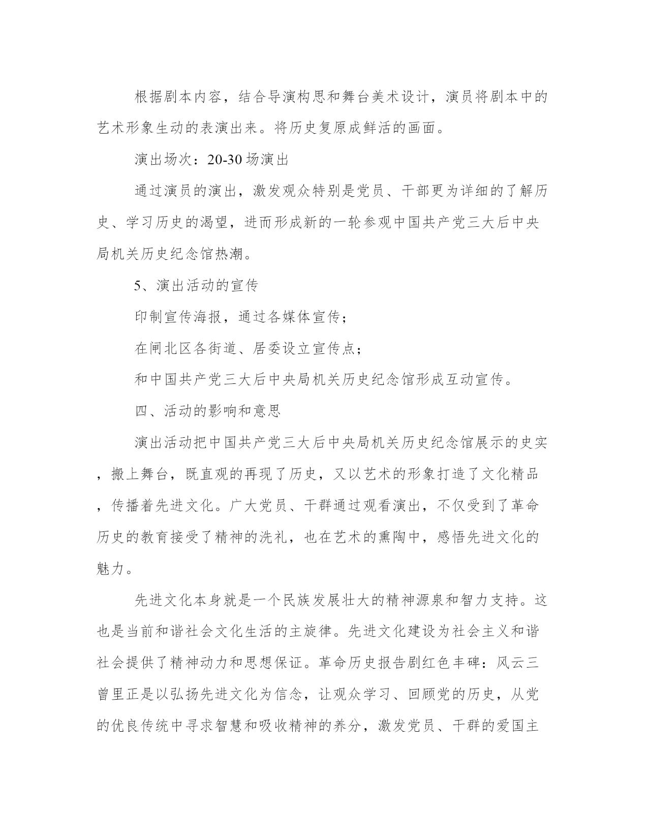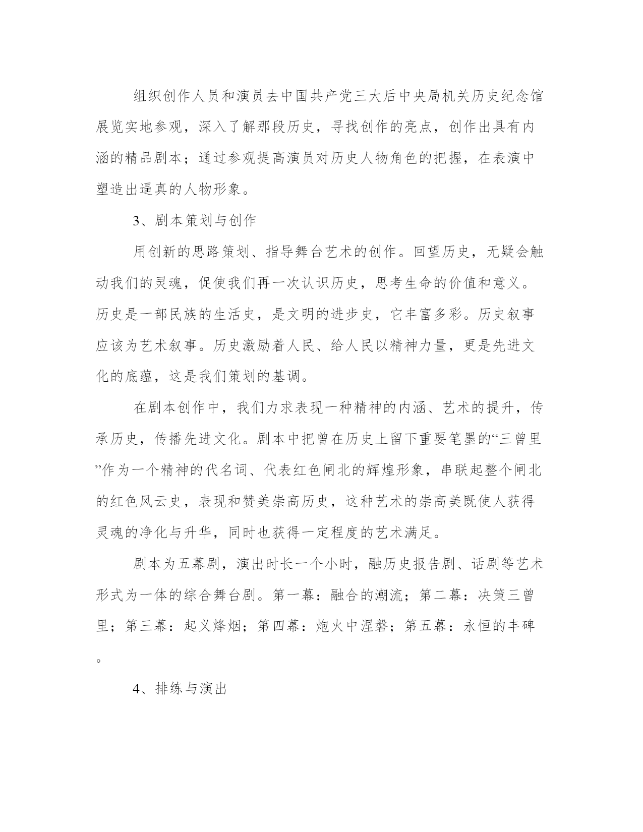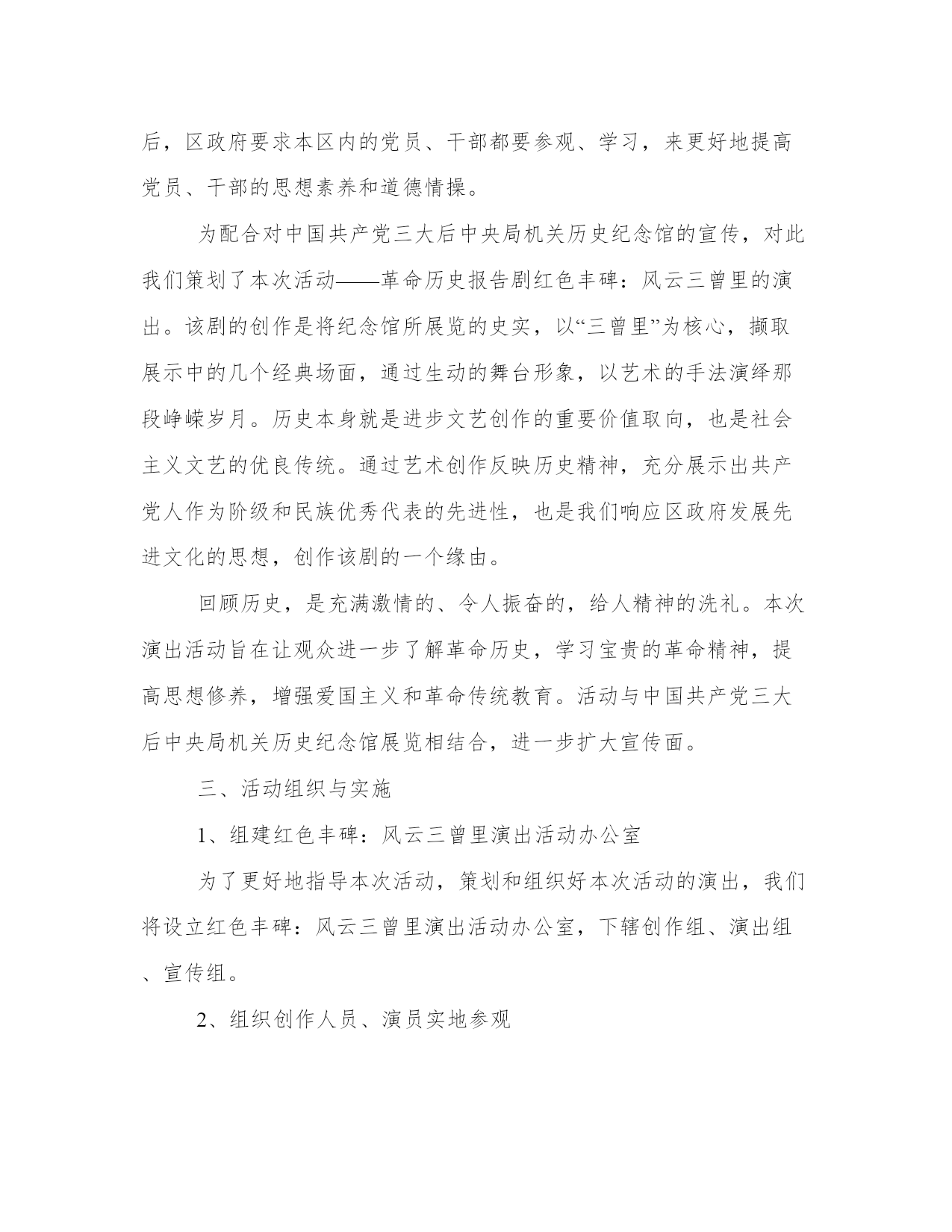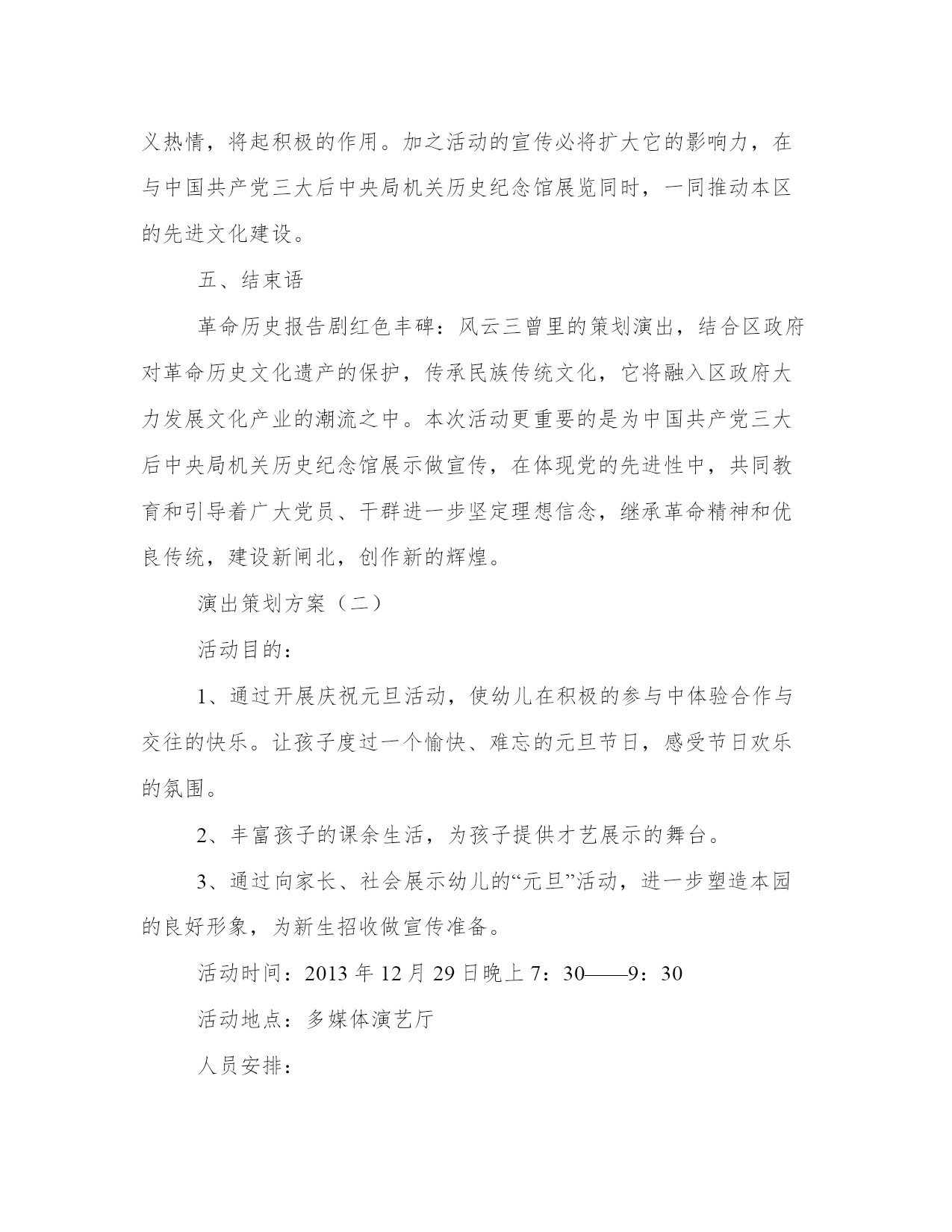 演出策划方案推荐演出策划方案(一)闸北曾是一块革命热土,有着光荣的革命传统。它是中国共产党创建时期和大革命时期党和工人运动最主要的活动地之一,也是全民抗战的前哨阵地之一。在这块红色的土地上,上海大学闸北校舍遗址、湖州会馆上海总工会遗址、上海工人第三次武装起义工人纠察队总指挥部遗址、四行仓库旧址……,铭刻着一段段英雄的史迹。其中,一直给人种种神秘之感的“三曾里”,随着由原闸北史料馆改建而成的中国共产党三大后中央局机关历史纪念馆的落成,揭开了面纱,纪念馆通过大量影像资料和近千件历史照片、实物复制件,生动再现了中国共产党三大之后,中央局机关在上海开展工作的情况。“以史为镜、可以知兴替”。闸北区政府一直以来,传承以“红色闸北”为内涵的人文精神,保护开发区域特色文化遗产,并通过这一扇扇了解红色革命史的窗口,对广大党员、干群进行爱国主义教育和政治思想教育。在重温党的成长历程中,把我们党艰苦卓绝的奋斗史、波澜壮阔的革命史、可歌可泣的光荣史,深深扎根于人民心中。二、活动宗旨闸北区政府历来将“弘扬民族精神、了解党的历史、加强广大党员干部党性锻炼”落得实处,通过对党的历史学习,不断加强对党员、干部的作风建设。这次中国共产党三大后中央局机关历史纪念馆落成后,区政府要求本区内的党员、干部都要参观、学习,来更好地提高党员、干部的思想素养和道德情操。为配合对中国共产党三大后中央局机关历史纪念馆的宣传,对此我们策划了本次活动——革命历史报告剧红色丰碑:风云三曾里的演出。该剧的创作是将纪念馆所展览的史实,以“三曾里”为核心,撷取展示中的几个经典场面,通过生动的舞台形象,以艺术的手法演绎那段峥嵘岁月。历史本身就是进步文艺创作的重要价值取向,也是社会主义文艺的优良传统。通过艺术创作反映历史精神,充分展示出共产党人作为阶级和民族优秀代表的先进性,也是我们响应区政府发展先进文化的思想,创作该剧的一个缘由。回顾历史,是充满激情的、令人振奋的,给人精神的洗礼。本次演出活动旨在让观众进一步了解革命历史,学习宝贵的革命精神,提高思想修养,增强爱国主义和革命传统教育。活动与中国共产党三大后中央局机关历史纪念馆展览相结合,进一步扩大宣传面。三、活动组织与实施1、组建红色丰碑:风云三曾里演出活动办公室为了更好地指导本次活动,策划和组织好本次活动的演出,我们将设立红色丰碑:风云三曾里演出活动办公室,下辖创作组、演出组、宣传组。2、组织创作人员、演员实地参观组织创作人员和演员去中国共产党三大后中央局机关历史纪念馆展览实地参观,深入了解那段历史,寻找创作的亮点,创作出具有内涵的精品剧本;通过参观提高演员对历史人物角色的把握,在表演中塑造出逼真的人物形象。3、剧本策划与创作用创新的思路策划、指导舞台艺术的创作。回望历史,无疑会触动我们的灵魂,促使我们再一次认识历史,思考生命的价值和意义。历史是一部民族的生活史,是文明的进步史,它丰富多彩。历史叙事应该为艺术叙事。历史激励着人民、给人民以精神力量,更是先进文化的底蕴,这是我们策划的基调。在剧本创作中,我们力求表现一种精神的内涵、艺术的提升,传承历史,传播先进文化。剧本中把曾在历史上留下重要笔墨的“三曾里”作为一个精神的代名词、代表红色闸北的辉煌形象,串联起整个闸北的红色风云史,表现和赞美崇高历史,这种艺术的崇高美既使人获得灵魂的净化与升华,同时也获得一定程度的艺术满足。剧本为五幕剧,演出时长一个小时,融历史报告剧、话剧等艺术形式为一体的综合舞台剧。第一幕:融合的潮流;第二幕:决策三曾里;第三幕:起义烽烟;第四幕:炮火中涅磐;第五幕:永恒的丰碑。4、排练与演出根据剧本内容,结合导演构思和舞台美术设计,演员将剧本中的艺术形象生动的表演出来。将历史复原成鲜活的画面。演出场次:20-30场演出通过演员的演出,激发观众特别是党员、干部更为详细的了解历史、学习历史的渴望,进而形成新的一轮参观中国共产党三大后中央局机关历史纪念馆热潮。5、演出活动的宣传印制宣传海报,通过各媒体宣传;在闸北区各街道、居委设立宣传点;和中国共产党三大后中央局机关历史纪念馆形成互动宣传。四、活动的影响和意思演出活动把中国共产党三大后中央局机关历史纪念馆展示的史实,搬上舞台,既直观的再现了历史,又以艺术的形象打造了文化精品,传播着先进文化。广大党员、干群通过观看演出,不仅受到了革命历史的教育接受了精神的洗礼,也在艺术的熏陶中,感悟先进文化的魅力。先进文化本身就是一个民族发展壮大的精神源泉和智力支持。这也是当前和谐社会文化生活的主旋律。先进文化建设为社会主义和谐社会提供了精神动力和思想保证。革命历史报告剧红色丰碑:风云三曾里正是以弘扬先进文化为信念,让观众学习、回顾党的历史,从党的优良传统中寻求智慧和吸收精神的养分,激发党员、