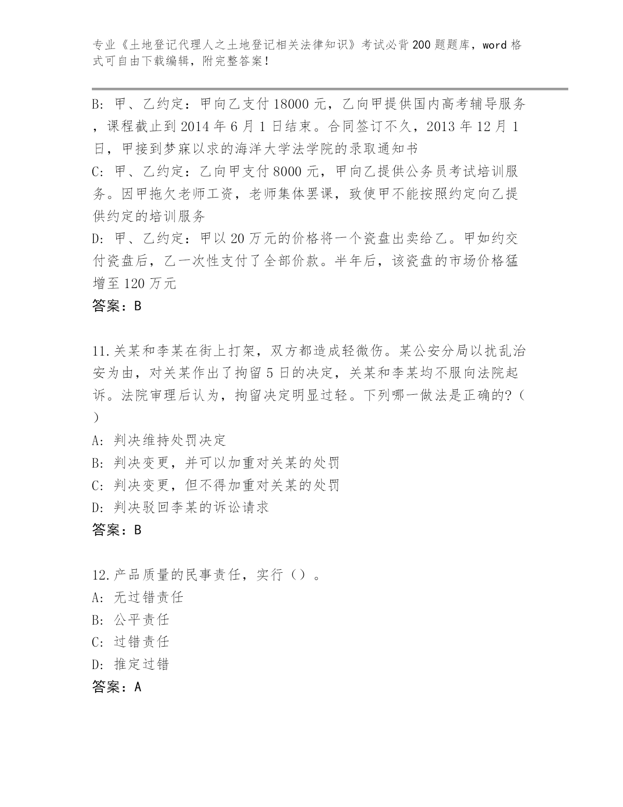 2024黑龙江省泰来县《土地登记代理人之土地登记相关法律知识》资格考试必刷200题真题(网校专用)