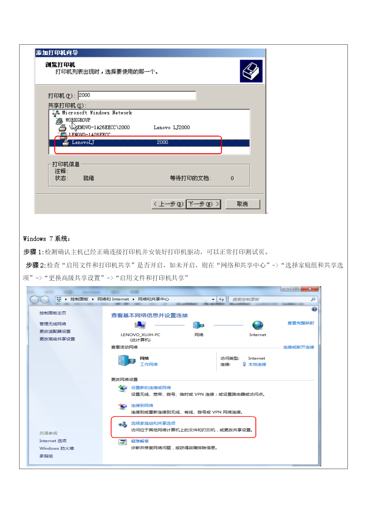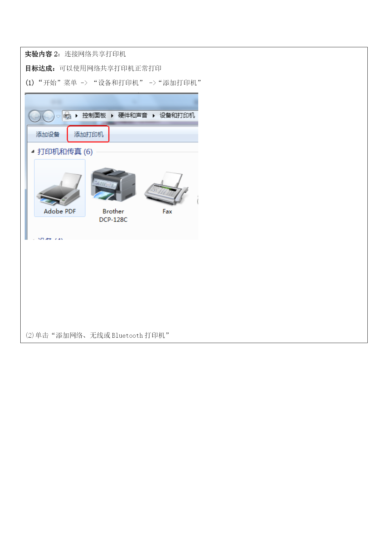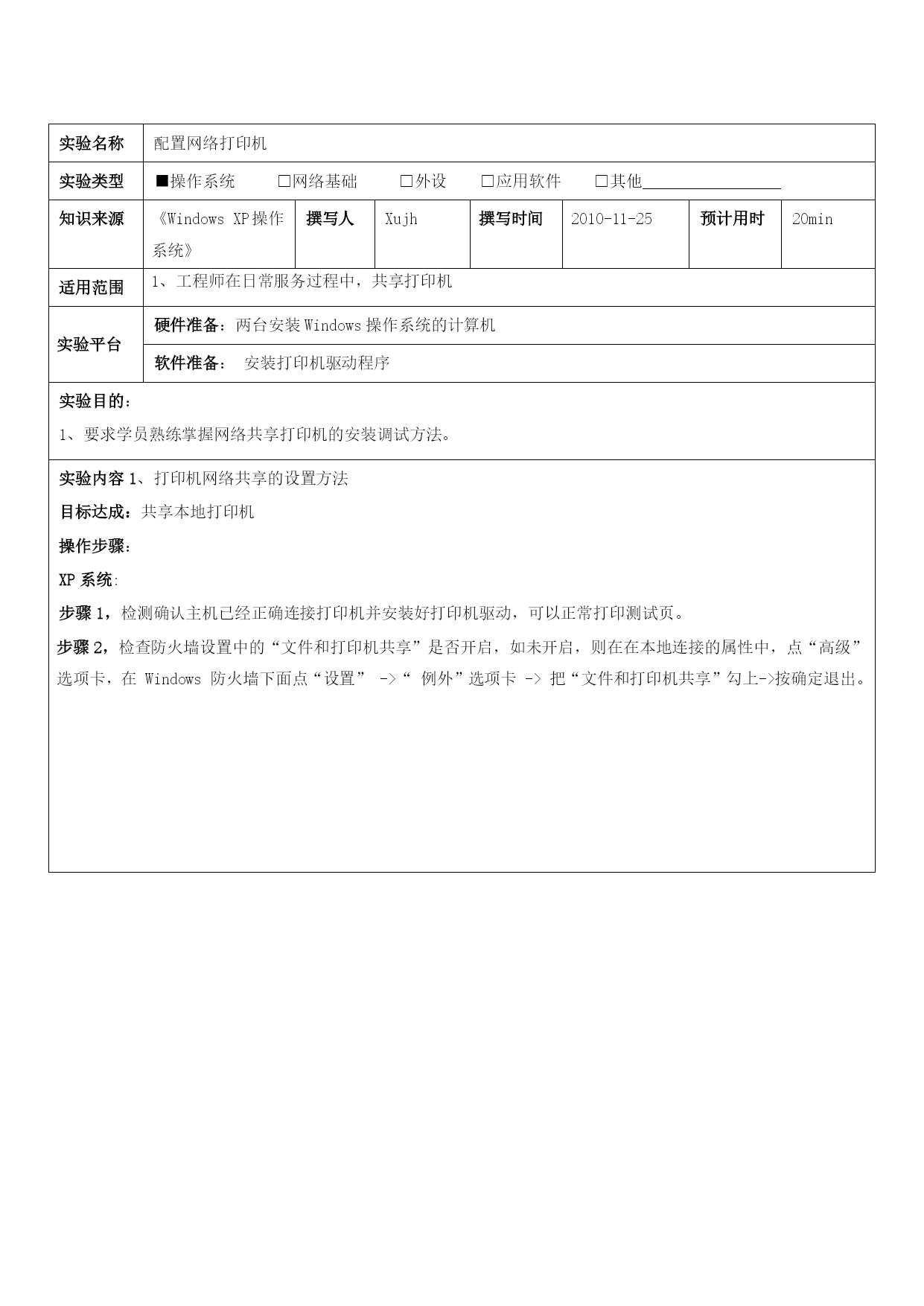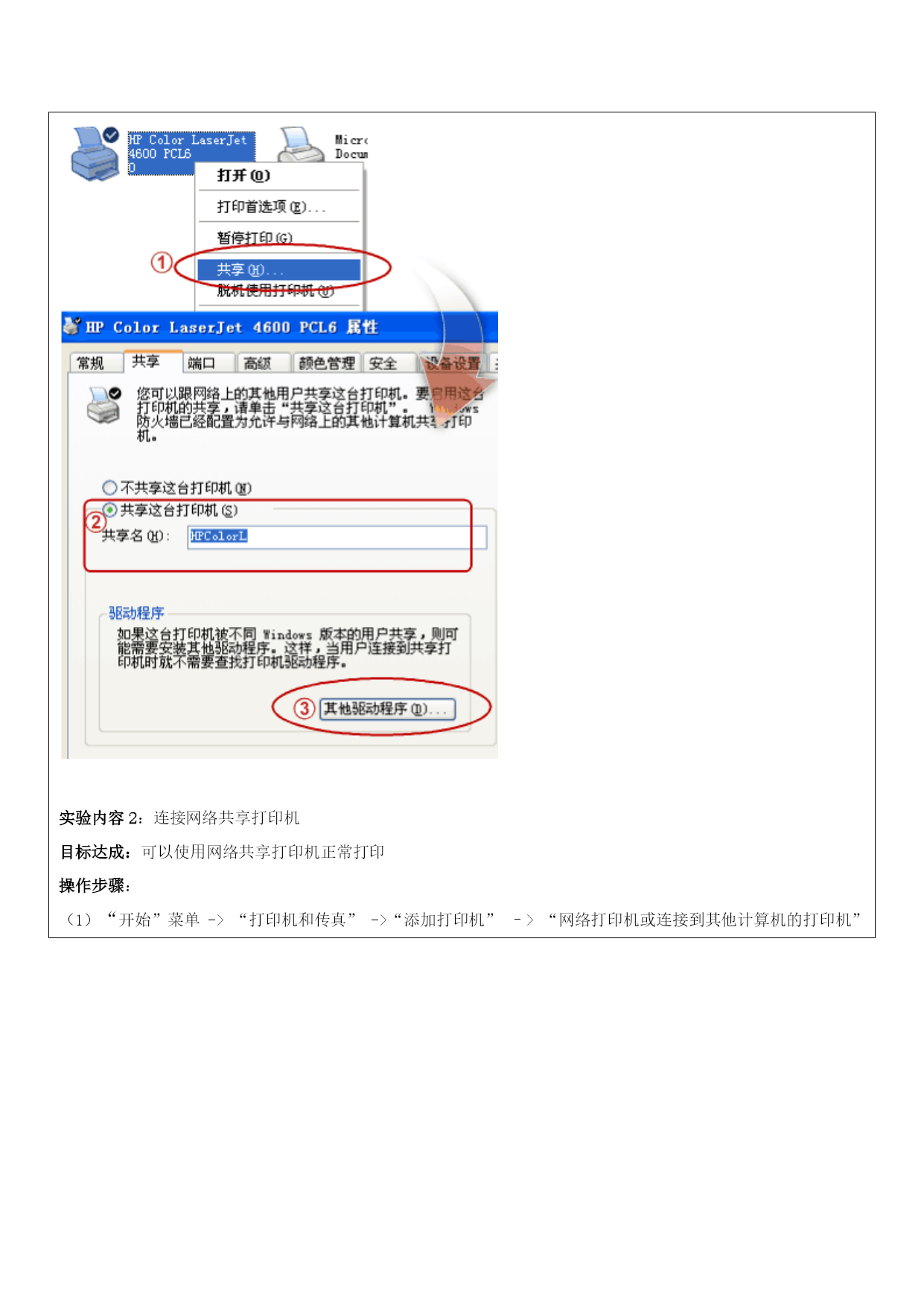 实验名称配置网络打印机实验类型■操作系统□网络基础□外设□应用软件□其他知识来源《WindowsXP操作系统》撰写人Xujh撰写时间2010-11-25预计用时20min适用范围1、工程师在日常服务过程中,共享打印机实验平台硬件准备:两台安装Windows操作系统的计算机软件准备:安装打印机驱动程序实验目的:1、要求学员熟练掌握网络共享打印机的安装调试方法。实验内容1、打印机网络共享的设置方法目标达成:共享本地打印机操作步骤:XP系统:步骤1,检测确认主机已经正确连接打印机并安装好打印机驱动,可以正常打印测试页。步骤2,检查防火墙设置中的“文件和打印机共享”是否开启,如未开启,则在在本地连接的属性中,点“高级”选项卡,在Windows防火墙下面点“设置”->“例外”选项卡->把“文件和打印机共享”勾上->按确定退出。步骤3,“开始”菜单->“打印机和传真”->右键单击需要共享的打印机->“共享”。点共享这台打印机->共享名可以不去改它(默认是你的打印机型号)->点其他驱动程序->如果其他要用打印机的机器不是WindowsXP的,需要把相应的系统型号勾上(默认情况下WindowsXP已经勾上了)->按确定退出。实验内容2:连接网络共享打印机目标达成:可以使用网络共享打印机正常打印操作步骤:(1)“开始”菜单->“打印机和传真”->“添加打印机”–>“网络打印机或连接到其他计算机的打印机”(2)选择“浏览打印机”,单击下一步。(3)选择需要安装的共享打印机,根据提示添加完成。Windows7系统:步骤1:检测确认主机已经正确连接打印机并安装好打印机驱动,可以正常打印测试页。步骤2:检查“启用文件和打印机共享”是否开启,如未开启,则在“网络和共享中心”->“选择家庭组和共享选项”->“更换高级共享设置”->“启用文件和打印机共享”步骤3:“开始”菜单->“打印机和传真”->右键单击需要共享的打印机->单击“打印机属性”->单击“共享”选项卡->选择“共享打印机”–>单击“确定”。结论1:通过以上操作,可以实现对本地打印机的共享。实验内容2:连接网络共享打印机目标达成:可以使用网络共享打印机正常打印(1)“开始”菜单->“设备和打印机”->“添加打印机”(2)单击“添加网络、无线或Bluetooth打印机”(3)单击需要安装的网络打印机,点击下一步,按照提示完成即可。(4)如果系统找不到所需要的打印机,可以点击“我需要的打印机不在列表中”,然后点击“下一步”(5)选择“浏览打印机”,点击“下一步”,(6)找到连接着打印机的计算机,点击“选择”,如下图:(7)选择目标打印机,点击“选择”,按照提示完成即可。结论1:通过以上操作,可以连接到局域网内共享的打印机。特例说明: