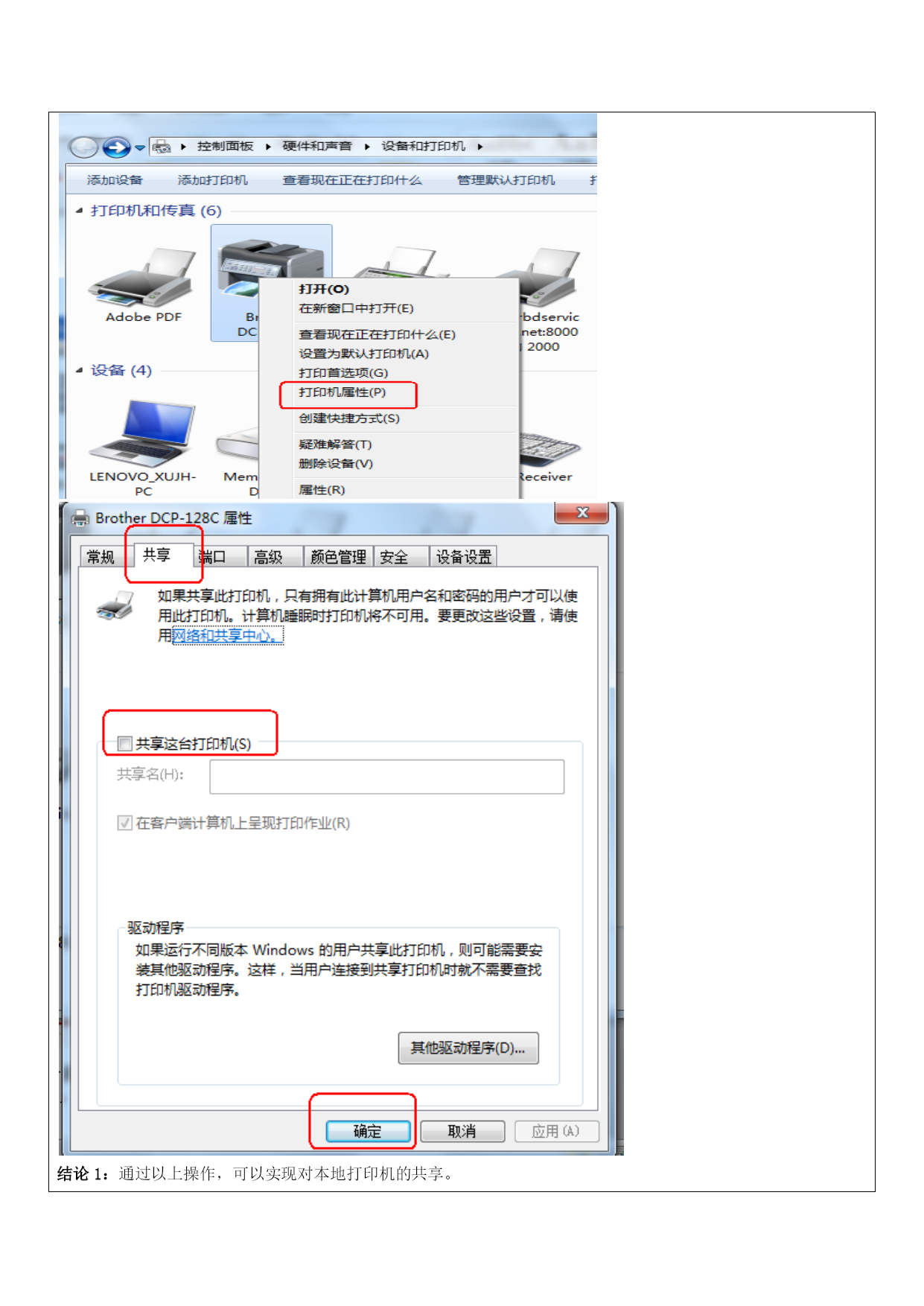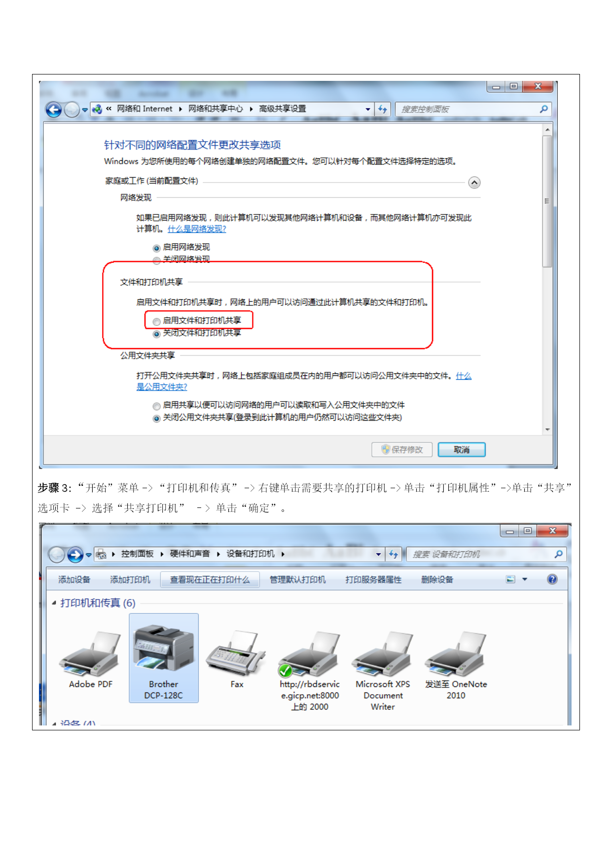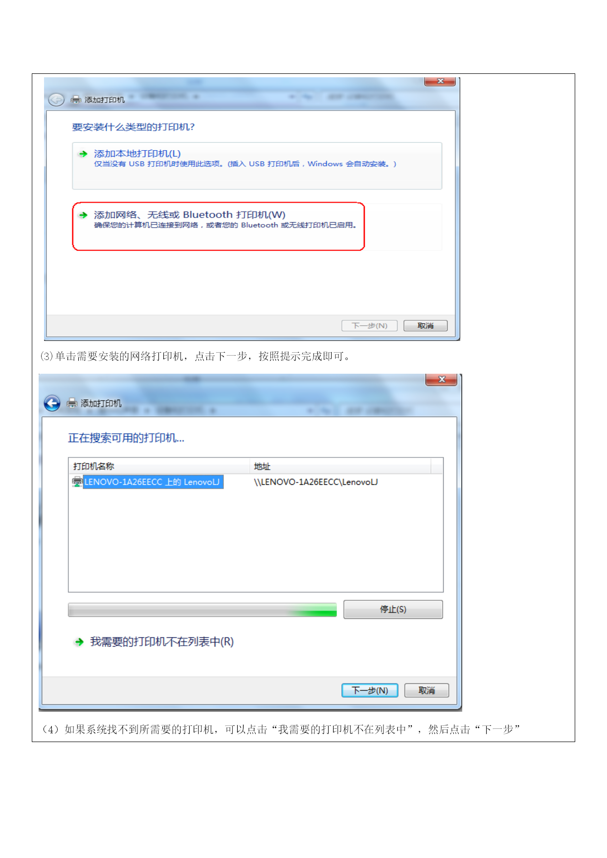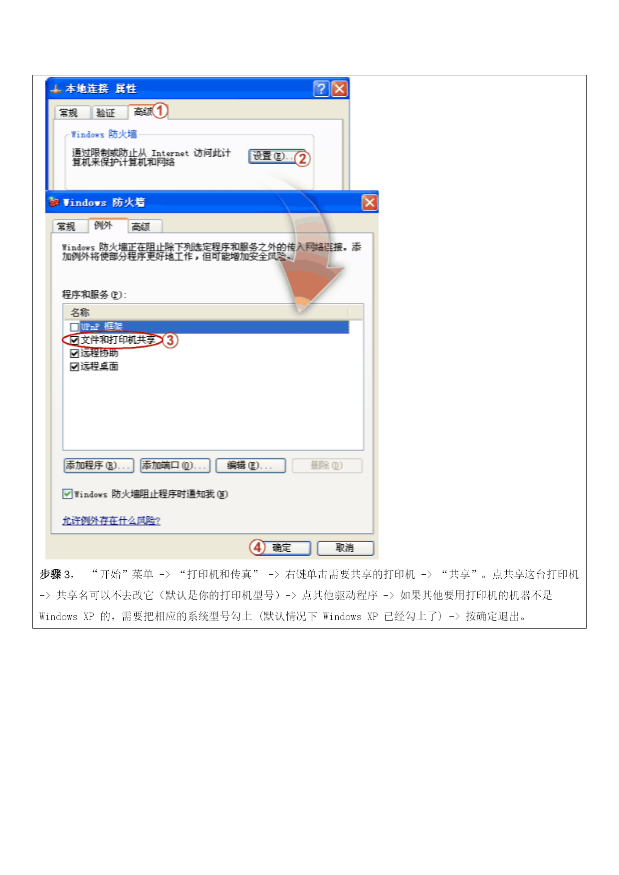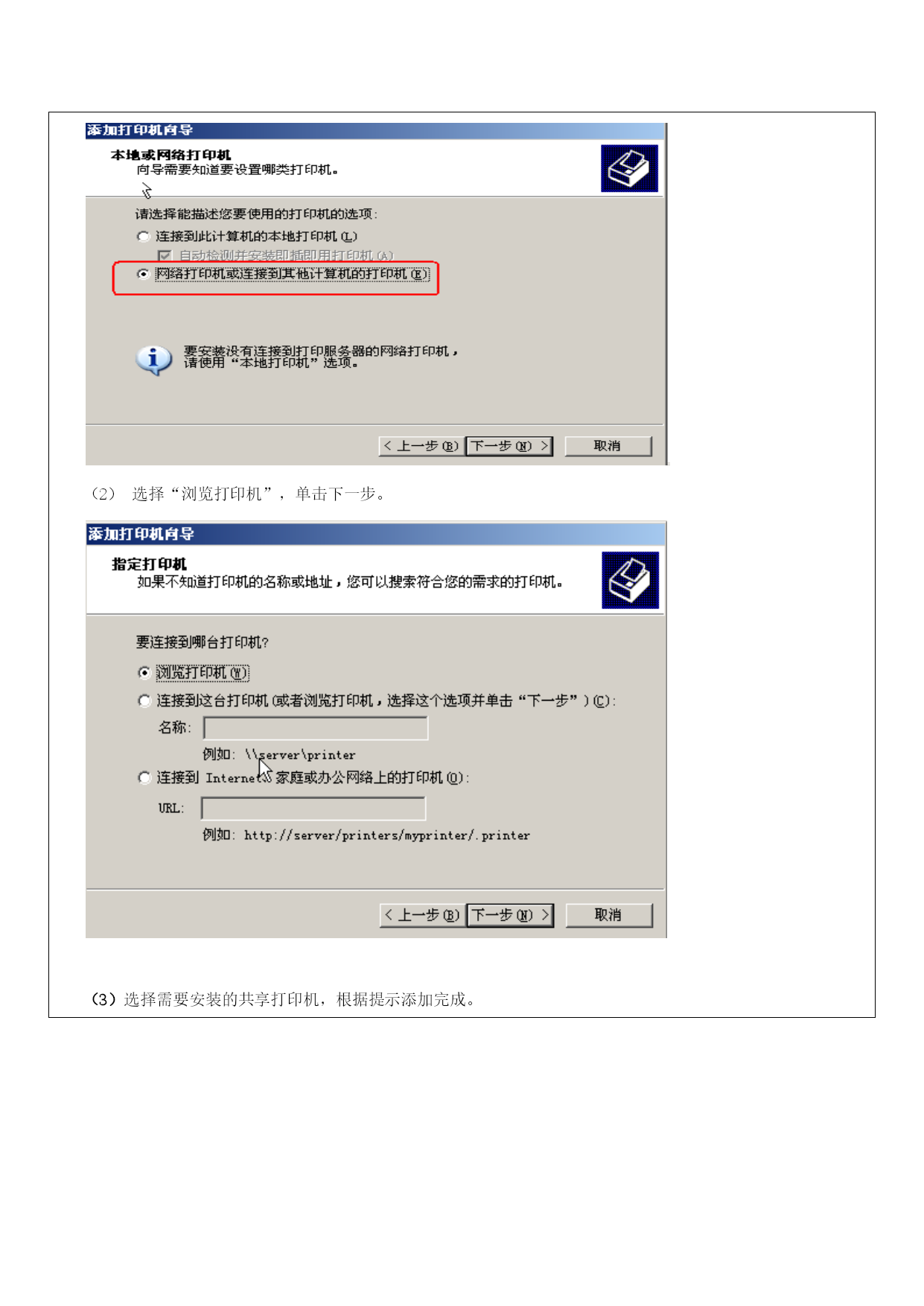 实验名称配置网络打印机实验类型■操作系统□网络基础□外设□应用软件□其他知识来源《WindowsXP操作系统》撰写人Xujh撰写时间2010-11-25预计用时20min适用范围1、工程师在日常服务过程中,共享打印机实验平台硬件准备:两台安装Windows操作系统的计算机软件准备:安装打印机驱动程序实验目的:1、要求学员熟练掌握网络共享打印机的安装调试方法。实验内容1、打印机网络共享的设置方法目标达成:共享本地打印机操作步骤:XP系统:步骤1,检测确认主机已经正确连接打印机并安装好打印机驱动,可以正常打印测试页。步骤2,检查防火墙设置中的“文件和打印机共享”是否开启,如未开启,则在在本地连接的属性中,点“高级”选项卡,在Windows防火墙下面点“设置”->“例外”选项卡->把“文件和打印机共享”勾上->按确定退出。步骤3,“开始”菜单->“打印机和传真”->右键单击需要共享的打印机->“共享”。点共享这台打印机->共享名可以不去改它(默认是你的打印机型号)->点其他驱动程序->如果其他要用打印机的机器不是WindowsXP的,需要把相应的系统型号勾上(默认情况下WindowsXP已经勾上了)->按确定退出。实验内容2:连接网络共享打印机目标达成:可以使用网络共享打印机正常打印操作步骤:(1)“开始”菜单->“打印机和传真”->“添加打印机”–>“网络打印机或连接到其他计算机的打印机”(2)选择“浏览打印机”,单击下一步。(3)选择需要安装的共享打印机,根据提示添加完成。Windows7系统:步骤1:检测确认主机已经正确连接打印机并安装好打印机驱动,可以正常打印测试页。步骤2:检查“启用文件和打印机共享”是否开启,如未开启,则在“网络和共享中心”->“选择家庭组和共享选项”->“更换高级共享设置”->“启用文件和打印机共享”步骤3:“开始”菜单->“打印机和传真”->右键单击需要共享的打印机->单击“打印机属性”->单击“共享”选项卡->选择“共享打印机”–>单击“确定”。结论1:通过以上操作,可以实现对本地打印机的共享。实验内容2:连接网络共享打印机目标达成:可以使用网络共享打印机正常打印(1)“开始”菜单->“设备和打印机”->“添加打印机”(2)单击“添加网络、无线或Bluetooth打印机”(3)单击需要安装的网络打印机,点击下一步,按照提示完成即可。(4)如果系统找不到所需要的打印机,可以点击“我需要的打印机不在列表中”,然后点击“下一步”(5)选择“浏览打印机”,点击“下一步”,(6)找到连接着打印机的计算机,点击“选择”,如下图:(7)选择目标打印机,点击“选择”,按照提示完成即可。结论1:通过以上操作,可以连接到局域网内共享的打印机。特例说明: