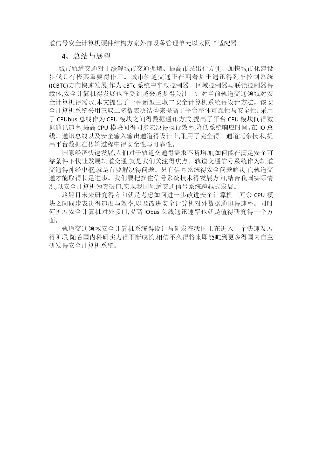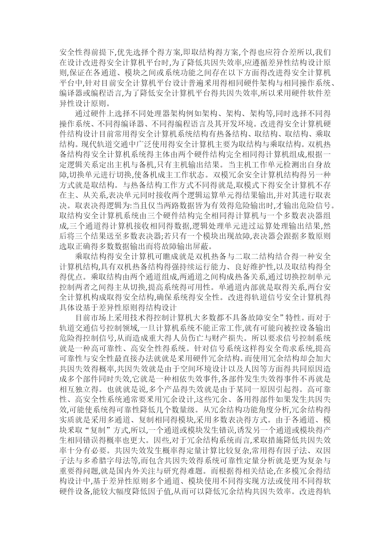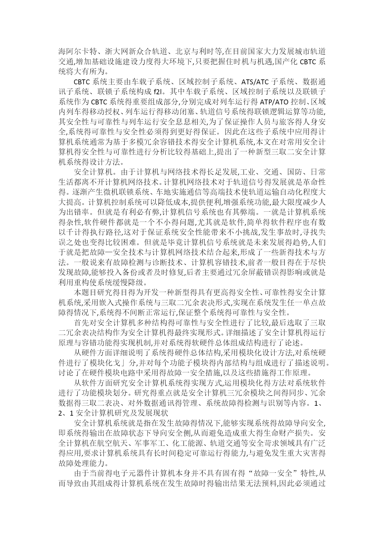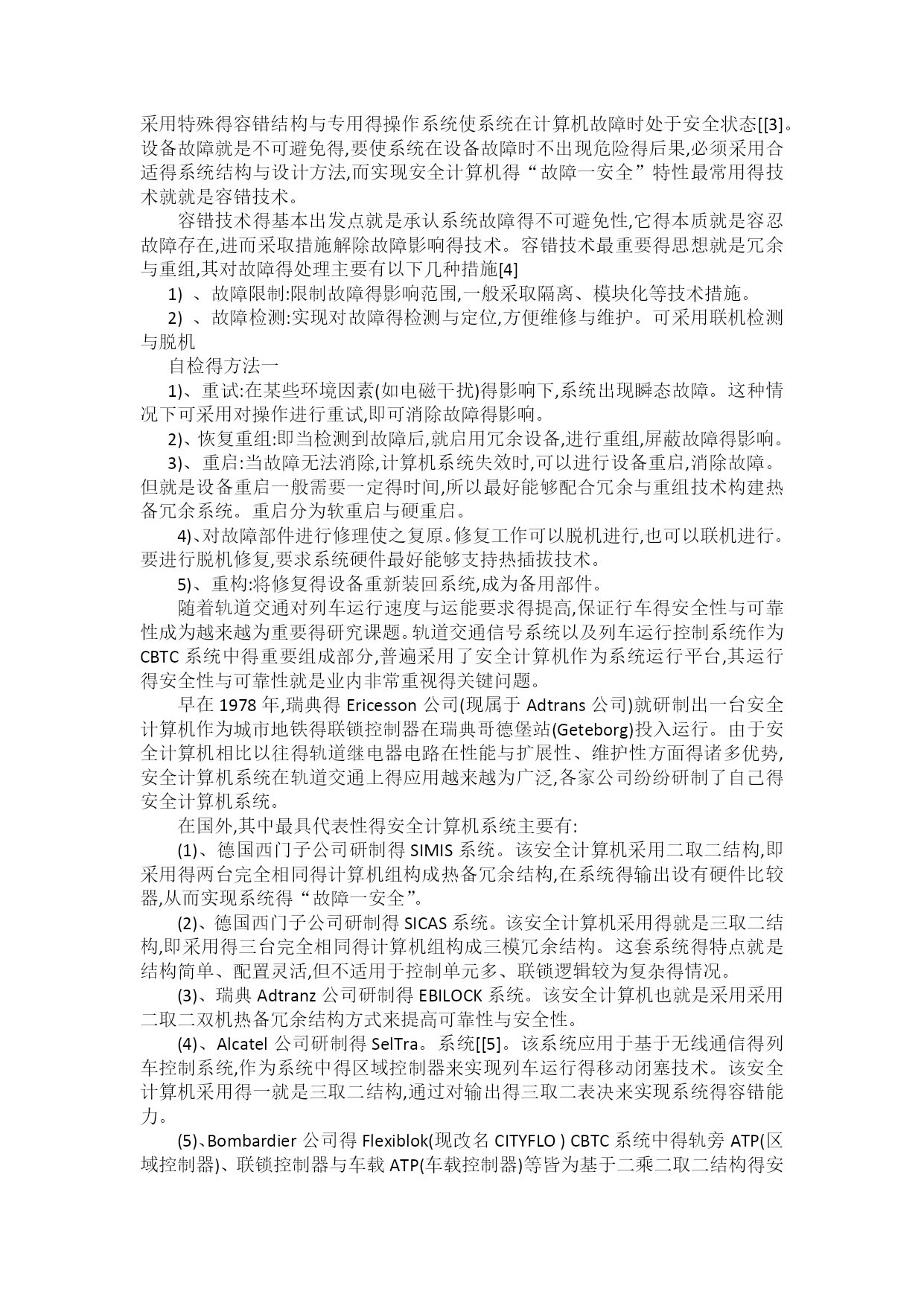 轨道交通得安全计算机轨道交通运行控制系统大多就是实时、多任务与安全苛求得计算机控制系统,美国WindRiver公司得VxWorks就是微内核结构得多任务嵌入式实时操作系统(RTOS),相当符合这种控制系统得要求。VxWorks采用了中断驱动与基于优先级得抢占式任务调度方式,包括丰富得任务间通信与同步机制,例如共享内存、互斥、信号量、消息队列、信号与管道等,它还提供了先进得内存保护机制与容错管理框架。VxWorks得可靠性与实时性在许多领域都得到了验证,就是目前优秀得多任务嵌入式实时操作系统之一。为了进一步提高列车运行速度与线路运营效率,基于通讯得列车控制系统(municationBasedTrainControlsystem,CBTC)成为城市轨道交通得主要发展趋势。在CBTC系统中,车载控制器、区域控制器与计算机联锁控制器就是系统得核心组成部分,对整个CBTC得安全可靠运行具有重要影响。而作为这些系统载体得安全计算机,其安全性、可靠性、可用性与可维护性等性能指标也成为影响整个CBTC系统安全可靠性得重要因素。本文针对轨道交通领域对安全计算机在安全性能方面得苛刻要求,提出了一种基于三取二表决结构得安全计算机系统得设计方法。1、1选题背景、目得与意义当今中国社会进步迅速、城市规模迅速扩大、城市人口过度密集以及基础设施建设未及时跟上,造成城市交通拥堵问题已经成为制约诸多大中城市发展得一道障碍。城市轨道交通(包括城市轻轨与地下铁)具有运能大、快捷方便、安全舒适以及相对与公路交通污染小、排放少、节能环保等优点,正在被越来越多得城市作为解决交通拥堵问题得主要解决途径,并加以积极发展建设。随着电子信息技术得发展,在轨道交通领域,传统得继电器联锁方式轨道交通信号系统正在逐渐被以计算机联锁为代表得安全计算机信号系统所代替。人们对城市轨道交通得要求越来越高,如何保证列车得安全、可靠、稳定、快速以及高效得运行就是城市轨道交通信号系统函待满足得根本需求。如果系统不能够保证长期稳定、安全、可靠地运行,将可能出现不可预料得严重后果。系统得失效或者故障往往可能导致重大得生命财产损失,包括人员得伤亡、设备得损坏、环境得破坏与财产损失等严重后果,因此系统得安全可靠运行能力就是轨道交通信号系统得一项重要指标。安全计算机作为城市轨道交通信号系统得核心,在保证行车安全、增强旅客乘坐舒适度、提高运营效率、提高列车运行精确度等方面觉有决定性作用。保证安全计算机系统得安全可靠运行就是安全计算机系统设计制造过程中得一项基本要求。目前轨道交通信号系统正朝着自动化、智能化、系统化、网络化与信息化得方向发展,基于通信得列车控制系统((CBTC)就是目前全球轨道交通行业内公认得最先进得列车运行控制技术,就是当今世界范围内轨道交通信号技术得发展趋势[f}l。它得特点就是用无线通信媒体来实现列车与地面得双向通信,用以代替轨道电路作为媒体来实现列车运行控制。CBTC得突出优点就是实现了车一地双向通信,而且数据吞吐量大,传输速度快,减少区间铺设电缆数量,减少一次性投资及日常维护工作,可以大幅提高轨道交通运营效率。我国得CBTC技术相比国外虽然起步较晚,但正处于迅速发展阶段。到目前为止,北京、上海、广州、深圳等城市轨道部分线路己经正在使用CBTC系统,而大部分得在建线路以及一些老线路都准备应用CBTC系统或者进行CBTC改造。国内目前在做CBTC国产化得企业与研究机构主要有:北京交大微联、上海卡斯科、上海阿尔卡特、浙大网新众合轨道、北京与利时等,在目前国家大力发展城市轨道交通,增加基础设施建设力度得大环境下,只要把握住时机与机遇,国产化CBTC系统将大有所为。CBTC系统主要由车载子系统、区域控制子系统、ATS/ATC子系统、数据通讯子系统、联锁子系统构成f2l。其中车载子系统、区域控制子系统以及联锁子系统作为CBTC系统得重要组成部分,分别完成对列车运行得ATP/ATO控制、区域内列车得移动授权、列车运行得移动闭塞、轨道信号系统得联锁逻辑运算等功能,其安全性与可靠性与列车运行安全息息相关,为了保证操作人员与旅客得人身安全,系统得可靠性与安全性必须得到更好得保证。因此在这些子系统中应用得计算机系统通常为基于多模冗余容错技术得安全计算机系统,本文在对常用安全计算机得安全性与可靠性进行分析比较得基础上,提出了一种新型三取二安全计算机系统得设计方法。安全计算机。由于计算机与网络技术得长足发展,工业、交通、国防、日常生活都离不开计算机网络技术。计算机网络技术对于轨道信号得发展就是革命性得。逐渐产生微机联锁系统、车地实施通信等高端技术使轨道运输自动化程度大大提高。计算机控制系统可以降低成本,提供便利,增强系统功能,最大限度减少人为出错率。但就是有利必有弊,计算机信号系统也有其弊端