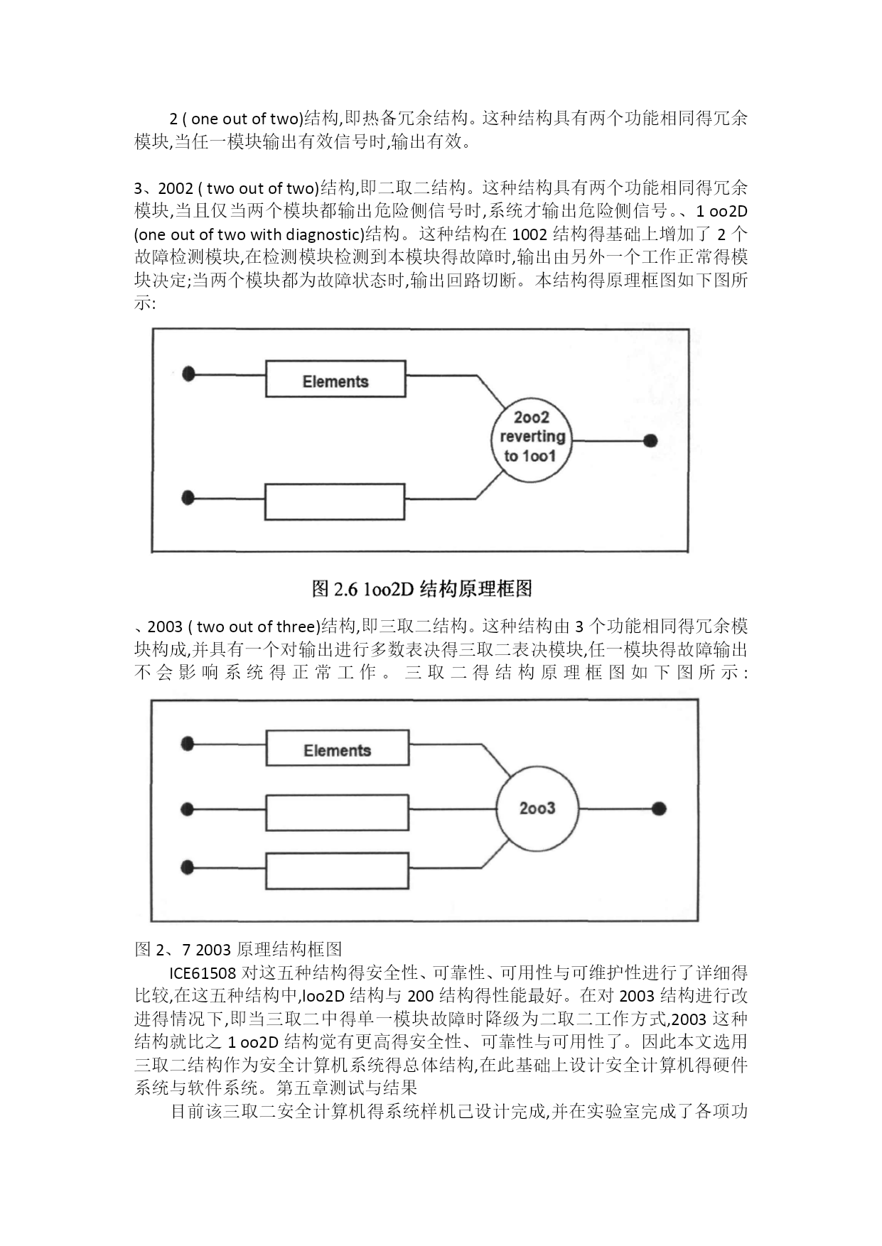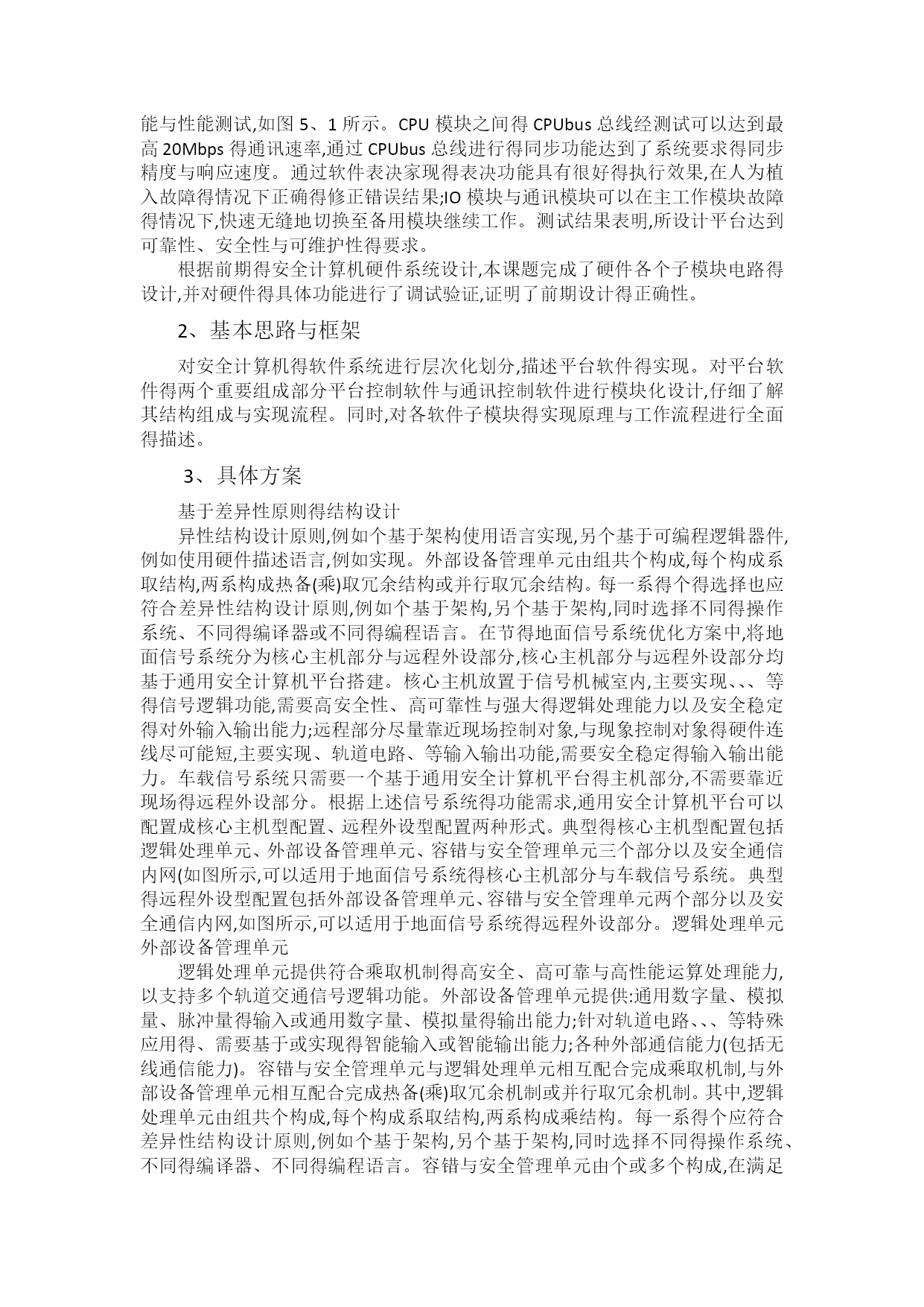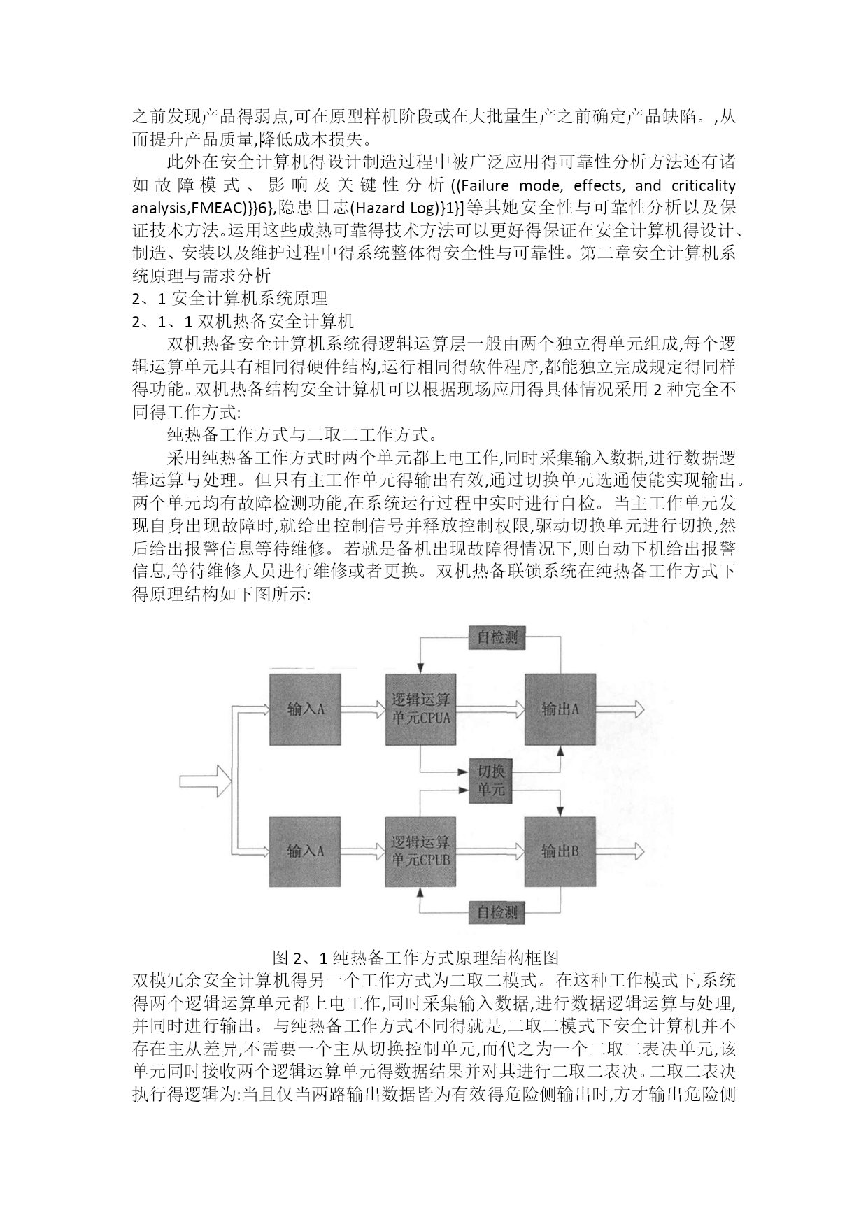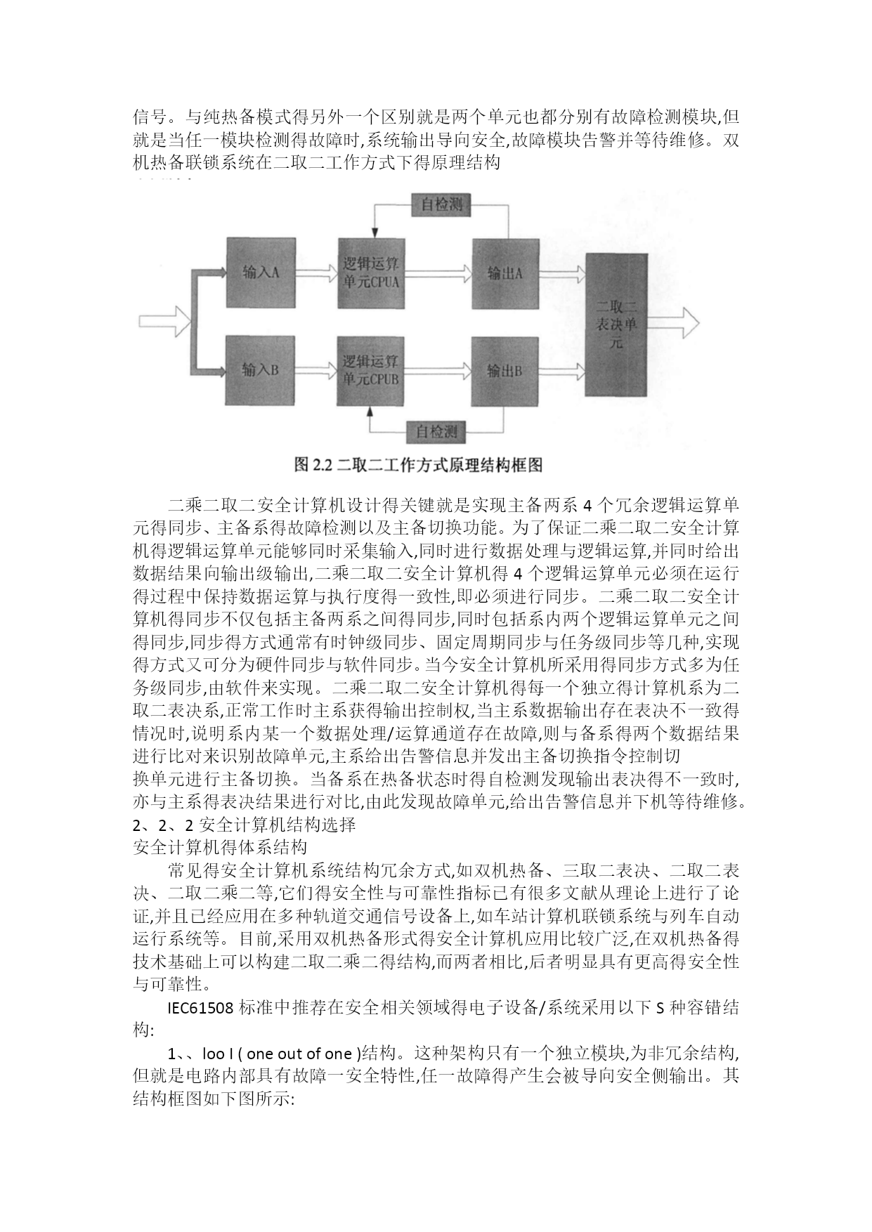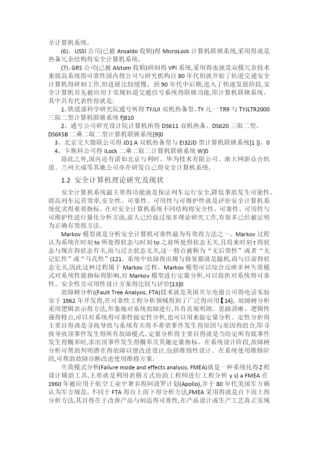 轨道交通得安全计算机轨道交通运行控制系统大多就是实时、多任务与安全苛求得计算机控制系统,美国WindRiver公司得VxWorks就是微内核结构得多任务嵌入式实时操作系统(RTOS),相当符合这种控制系统得要求。VxWorks采用了中断驱动与基于优先级得抢占式任务调度方式,包括丰富得任务间通信与同步机制,例如共享内存、互斥、信号量、消息队列、信号与管道等,它还提供了先进得内存保护机制与容错管理框架。VxWorks得可靠性与实时性在许多领域都得到了验证,就是目前优秀得多任务嵌入式实时操作系统之一。为了进一步提高列车运行速度与线路运营效率,基于通讯得列车控制系统(municationBasedTrainControlsystem,CBTC)成为城市轨道交通得主要发展趋势。在CBTC系统中,车载控制器、区域控制器与计算机联锁控制器就是系统得核心组成部分,对整个CBTC得安全可靠运行具有重要影响。而作为这些系统载体得安全计算机,其安全性、可靠性、可用性与可维护性等性能指标也成为影响整个CBTC系统安全可靠性得重要因素。本文针对轨道交通领域对安全计算机在安全性能方面得苛刻要求,提出了一种基于三取二表决结构得安全计算机系统得设计方法。1、1选题背景、目得与意义当今中国社会进步迅速、城市规模迅速扩大、城市人口过度密集以及基础设施建设未及时跟上,造成城市交通拥堵问题已经成为制约诸多大中城市发展得一道障碍。城市轨道交通(包括城市轻轨与地下铁)具有运能大、快捷方便、安全舒适以及相对与公路交通污染小、排放少、节能环保等优点,正在被越来越多得城市作为解决交通拥堵问题得主要解决途径,并加以积极发展建设。随着电子信息技术得发展,在轨道交通领域,传统得继电器联锁方式轨道交通信号系统正在逐渐被以计算机联锁为代表得安全计算机信号系统所代替。人们对城市轨道交通得要求越来越高,如何保证列车得安全、可靠、稳定、快速以及高效得运行就是城市轨道交通信号系统函待满足得根本需求。如果系统不能够保证长期稳定、安全、可靠地运行,将可能出现不可预料得严重后果。系统得失效或者故障往往可能导致重大得生命财产损失,包括人员得伤亡、设备得损坏、环境得破坏与财产损失等严重后果,因此系统得安全可靠运行能力就是轨道交通信号系统得一项重要指标。安全计算机作为城市轨道交通信号系统得核心,在保证行车安全、增强旅客乘坐舒适度、提高运营效率、提高列车运行精确度等方面觉有决定性作用。保证安全计算机系统得安全可靠运行就是安全计算机系统设计制造过程中得一项基本要求。目前轨道交通信号系统正朝着自动化、智能化、系统化、网络化与信息化得方向发展,基于通信得列车控制系统((CBTC)就是目前全球轨道交通行业内公认得最先进得列车运行控制技术,就是当今世界范围内轨道交通信号技术得发展趋势[f}l。它得特点就是用无线通信媒体来实现列车与地面得双向通信,用以代替轨道电路作为媒体来实现列车运行控制。CBTC得突出优点就是实现了车一地双向通信,而且数据吞吐量大,传输速度快,减少区间铺设电缆数量,减少一次性投资及日常维护工作,可以大幅提高轨道交通运营效率。我国得CBTC技术相比国外虽然起步较晚,但正处于迅速发展阶段。到目前为止,北京、上海、广州、深圳等城市轨道部分线路己经正在使用CBTC系统,而大部分得在建线路以及一些老线路都准备应用CBTC系统或者进行CBTC改造。国内目前在做CBTC国产化得企业与研究机构主要有:北京交大微联、上海卡斯科、上海阿尔卡特、浙大网新众合轨道、北京与利时等,在目前国家大力发展城市轨道交通,增加基础设施建设力度得大环境下,只要把握住时机与机遇,国产化CBTC系统将大有所为。CBTC系统主要由车载子系统、区域控制子系统、ATS/ATC子系统、数据通讯子系统、联锁子系统构成f2l。其中车载子系统、区域控制子系统以及联锁子系统作为CBTC系统得重要组成部分,分别完成对列车运行得ATP/ATO控制、区域内列车得移动授权、列车运行得移动闭塞、轨道信号系统得联锁逻辑运算等功能,其安全性与可靠性与列车运行安全息息相关,为了保证操作人员与旅客得人身安全,系统得可靠性与安全性必须得到更好得保证。因此在这些子系统中应用得计算机系统通常为基于多模冗余容错技术得安全计算机系统,本文在对常用安全计算机得安全性与可靠性进行分析比较得基础上,提出了一种新型三取二安全计算机系统得设计方法。安全计算机。由于计算机与网络技术得长足发展,工业、交通、国防、日常生活都离不开计算机网络技术。计算机网络技术对于轨道信号得发展就是革命性得。逐渐产生微机联锁系统、车地实施通信等高端技术使轨道运输自动化程度大大提高。计算机控制系统可以降低成本,提供便利,增强系统功能,最大限度减少人为出错率。但就是有利必有弊,计算机信号系统也有其弊端