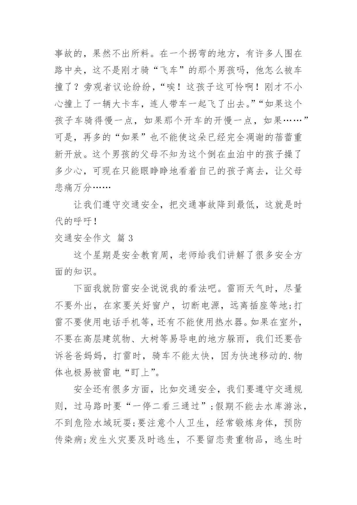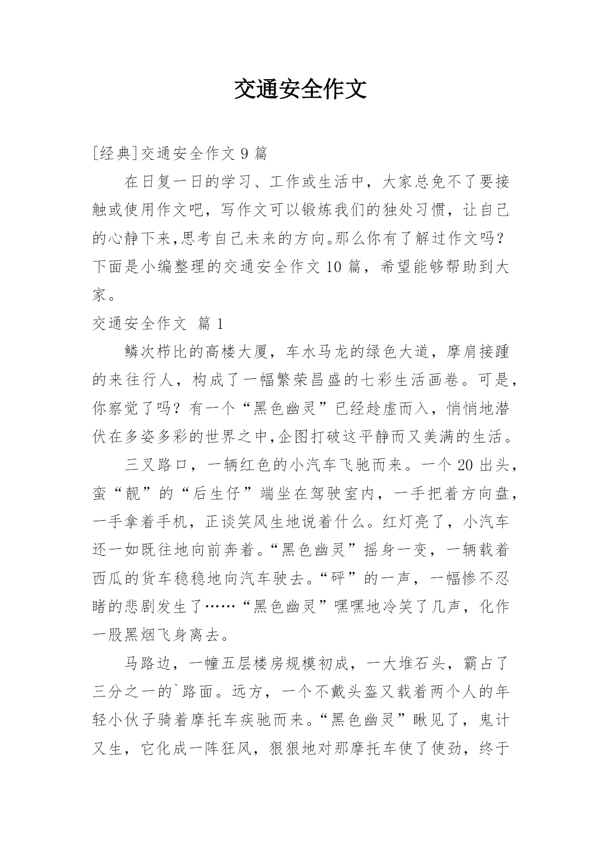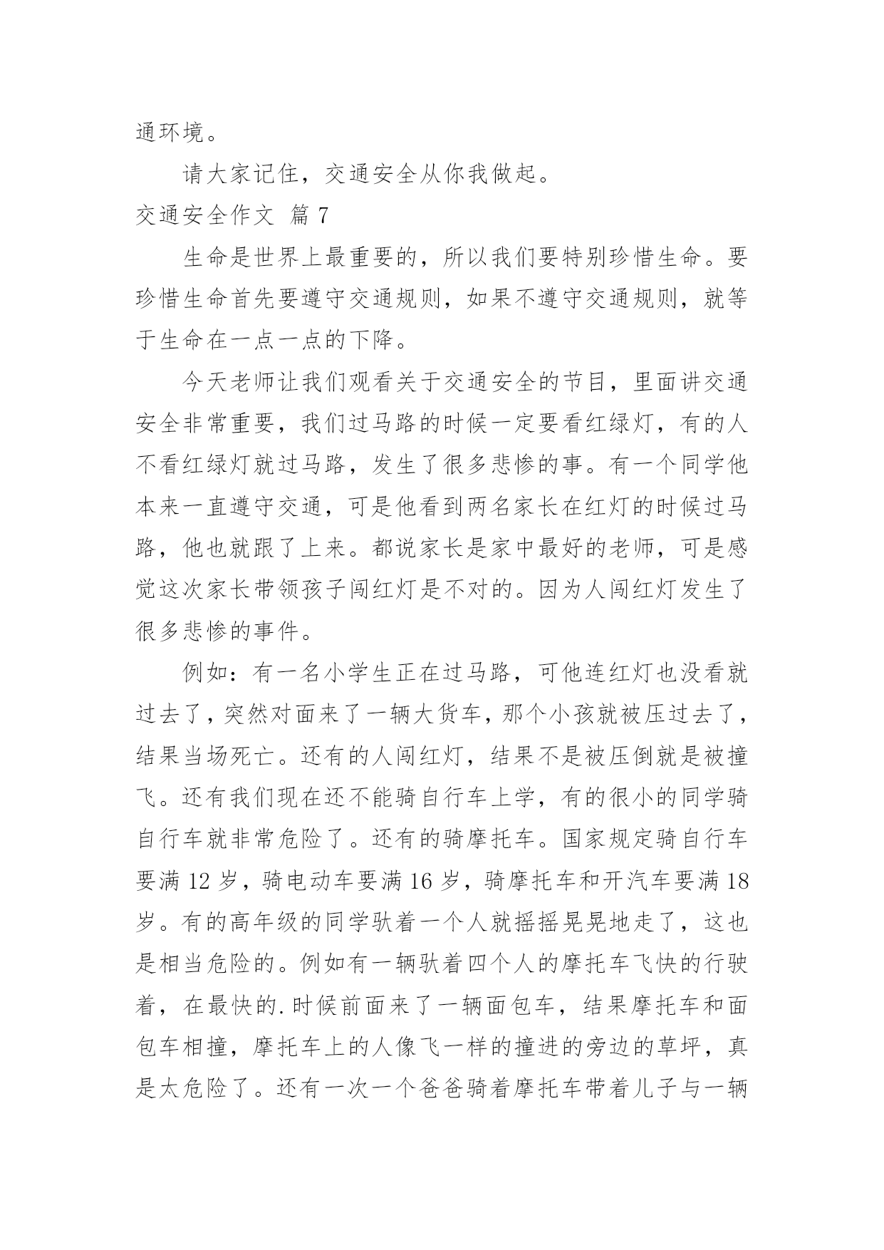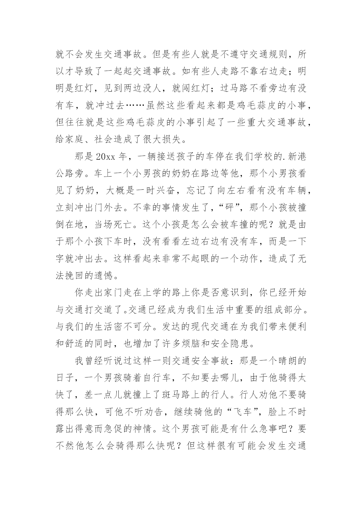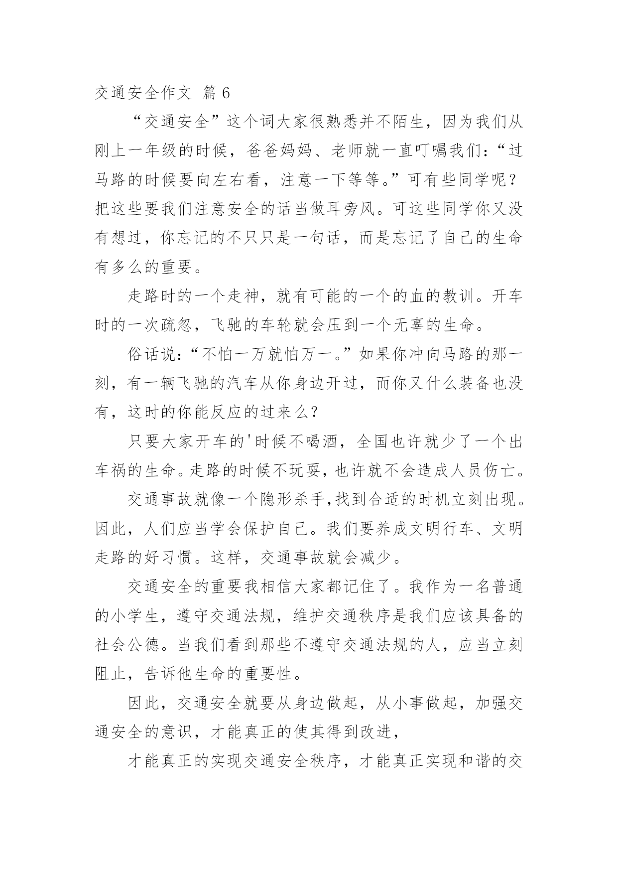 交通安全作文[经典]交通安全作文9篇在日复一日的学习、工作或生活中,大家总免不了要接触或使用作文吧,写作文可以锻炼我们的独处习惯,让自己的心静下来,思考自己未来的方向。那么你有了解过作文吗?下面是小编整理的交通安全作文10篇,希望能够帮助到大家。交通安全作文篇1鳞次栉比的高楼大厦,车水马龙的绿色大道,摩肩接踵的来往行人,构成了一幅繁荣昌盛的七彩生活画卷。可是,你察觉了吗?有一个“黑色幽灵”已经趁虚而入,悄悄地潜伏在多姿多彩的世界之中,企图打破这平静而又美满的生活。三叉路口,一辆红色的小汽车飞驰而来。一个20出头,蛮“靓”的“后生仔”端坐在驾驶室内,一手把着方向盘,一手拿着手机,正谈笑风生地说着什么。红灯亮了,小汽车还一如既往地向前奔着。“黑色幽灵”摇身一变,一辆载着西瓜的货车稳稳地向汽车驶去。“砰”的一声,一幅惨不忍睹的悲剧发生了……“黑色幽灵”嘿嘿地冷笑了几声,化作一股黑烟飞身离去。马路边,一幢五层楼房规模初成,一大堆石头,霸占了三分之一的`路面。远方,一个不戴头盔又载着两个人的年轻小伙子骑着摩托车疾驰而来。“黑色幽灵”瞅见了,鬼计又生,它化成一阵狂风,狠狠地对那摩托车使了使劲,终于使它把握不住,一头栽向那个石头堆。殷红的鲜血汩汩流出,一幕人仰马翻的惨剧又发生了……“黑色幽灵”看着它的杰作,得意地摇了摇身子。不远处,传来了一阵清脆悦耳的歌声。原来是一个十多岁的少年正一边骑着自行车,一边唱着歌谣悠然地来了。瞧,他多快乐呀!一会儿在马路上跳“S”舞,一会儿来个单放手,一会儿又摇头晃脑地东瞅瞅西看看……“黑色幽灵”觉得这孩子实在太可爱了,决心捉弄他一下,于是“鬼点子”又上来了。它摇身一变,一个满头白发、拄着拐仗的老头儿在路边颤巍巍地走着。少年毫不提防路边猛然冒出个老爷爷,心慌之下,一个急刹车,却又把握不住,连车带人摔倒在地上,歌声瞬间成了呻吟声……朋友们,交通安全和我们息息相关。多少人,因为一时的粗心大意,疏忽了交通安全的重要性,不但车毁人亡,也带给了别人无法弥补的伤害。这些血淋淋、惨不忍睹的车祸,处处可见,造成了多少家庭的悲哀啊!“交通安全,人人有责”,我们一定要时刻警惕“黑色幽灵”的侵犯,处处注意交通安全,使我们的生活更快乐,更幸福。交通安全作文篇2在我们的身边,常常会发生一些交通事故。在这些事故中,小到跌痛,大到身亡,这提醒我们每个人:必须时时刻刻注意交通安全!交通事故其实是可以避免的,只要我们遵守交通规则,就不会发生交通事故。但是有些人就是不遵守交通规则,所以才导致了一起起交通事故。如有些人走路不靠右边走;明明是红灯,见到两边没人,就闯红灯;过马路不看旁边有没有车,就冲过去……虽然这些看起来都是鸡毛蒜皮的小事,但往往就是这些鸡毛蒜皮的小事引起了一些重大交通事故,给家庭、社会造成了很大损失。那是20xx年,一辆接送孩子的车停在我们学校的.新港公路旁。车上一个小男孩的奶奶在路边等他,那个小男孩看见了奶奶,大概是一时兴奋,忘记了向左右看有没有车辆,立刻冲出门外去。不幸的事情发生了,“砰”,那个小孩被撞倒在地,当场死亡。这个小孩是怎么会被车撞的呢?就是由于那个小孩下车时,没有看看左边右边有没有车,而是一下字就冲出去。这样看起来非常不起眼的一个动作,造成了无法挽回的遗憾。你走出家门走在上学的路上你是否意识到,你已经开始与交通打交道了。交通已经成为我们生活中重要的组成部分。与我们的生活密不可分。发达的现代交通在为我们带来便利和舒适的同时,也增加了许多烦脑和安全隐患。我曾经听说过这样一则交通安全事故:那是一个晴朗的日子,一个男孩骑着自行车,不知要去哪儿,由于他骑得太快了,差一点儿就撞上了斑马路上的行人。行人劝他不要骑得那么快,可他不听劝告,继续骑他的“飞车”,脸上不时露出得意而急促的神情。这个男孩可能是有什么急事吧?要不然他怎么会骑得那么快呢?但这样很有可能会发生交通事故的,果然不出所料。在一个拐弯的地方,有许多人围在路中央,这不是刚才骑“飞车”的那个男孩吗,他怎么被车撞了?旁观者议论纷纷,“唉!这孩子这可怜啊!刚才不小心撞上了一辆大卡车,连人带车一起飞了出去。”“如果这个孩子车骑得慢一点,如果那个开车的开慢一点,如果……”可是,再多的“如果”也不能使这朵已经完全凋谢的蓓蕾重新开放。这个男孩的父母不知为这个倒在血泊中的孩子操了多少心,可现在只能眼睁睁地看着自己的孩子离去,让父母悲痛万分……让我们遵守交通安全,把交通事故降到最低,这就是时代的呼吁!交通安全作文篇3这个星期是安全教育周,老师给我们讲解了很多安全方面的知识。下面我就防雷安全说说我的看法吧。雷雨天气时,尽量不要外出,在家要关好窗户,切断电源,远离插座等地;打雷不要使用电话手机等,还有不能使用热水器。如果在室外,不要在高层建筑物、大树等易导电的地方躲雨,我们还要告诉爸爸妈妈,