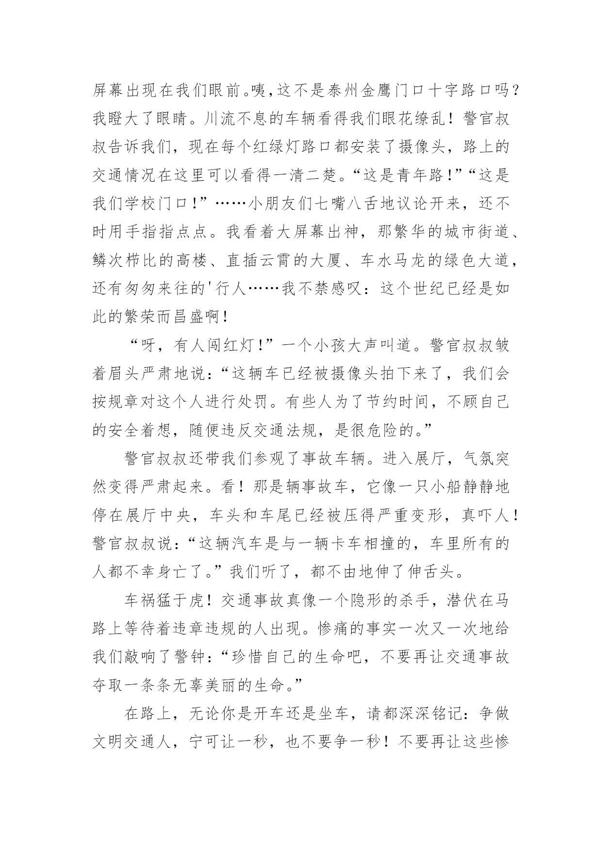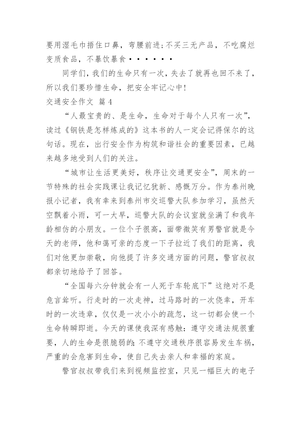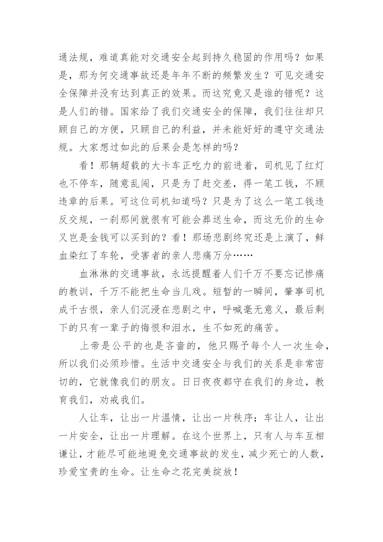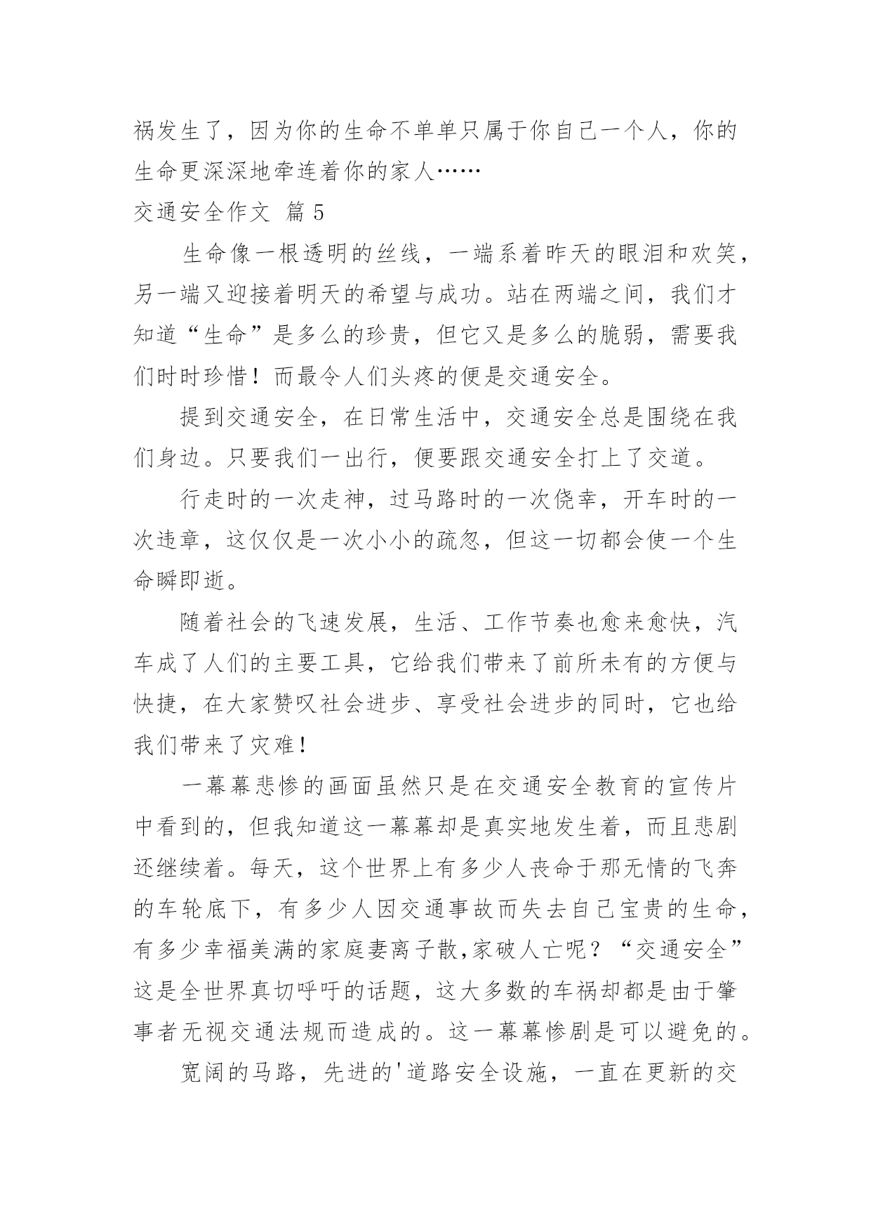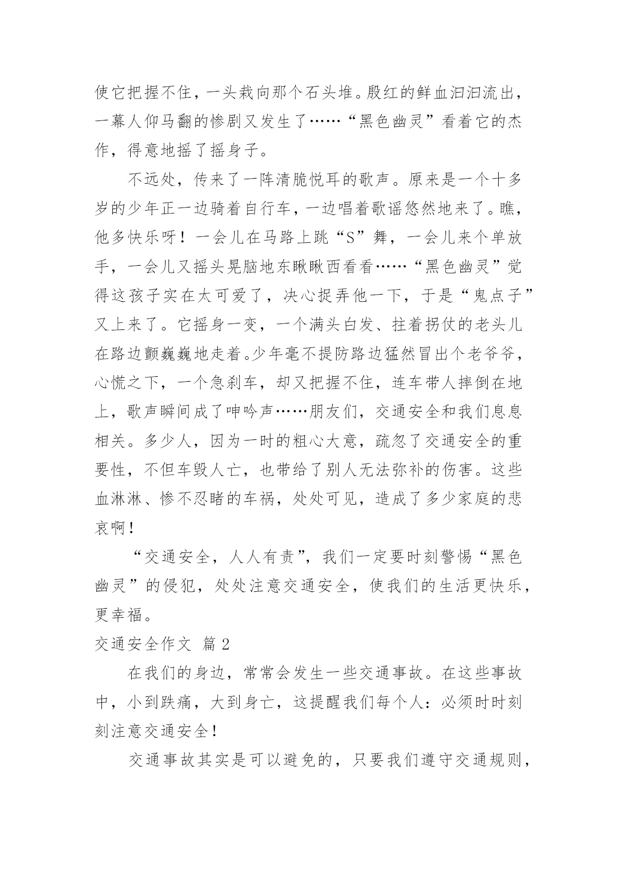 交通安全作文[经典]交通安全作文9篇在日复一日的学习、工作或生活中,大家总免不了要接触或使用作文吧,写作文可以锻炼我们的独处习惯,让自己的心静下来,思考自己未来的方向。那么你有了解过作文吗?下面是小编整理的交通安全作文10篇,希望能够帮助到大家。交通安全作文篇1鳞次栉比的高楼大厦,车水马龙的绿色大道,摩肩接踵的来往行人,构成了一幅繁荣昌盛的七彩生活画卷。可是,你察觉了吗?有一个“黑色幽灵”已经趁虚而入,悄悄地潜伏在多姿多彩的世界之中,企图打破这平静而又美满的生活。三叉路口,一辆红色的小汽车飞驰而来。一个20出头,蛮“靓”的“后生仔”端坐在驾驶室内,一手把着方向盘,一手拿着手机,正谈笑风生地说着什么。红灯亮了,小汽车还一如既往地向前奔着。“黑色幽灵”摇身一变,一辆载着西瓜的货车稳稳地向汽车驶去。“砰”的一声,一幅惨不忍睹的悲剧发生了……“黑色幽灵”嘿嘿地冷笑了几声,化作一股黑烟飞身离去。马路边,一幢五层楼房规模初成,一大堆石头,霸占了三分之一的`路面。远方,一个不戴头盔又载着两个人的年轻小伙子骑着摩托车疾驰而来。“黑色幽灵”瞅见了,鬼计又生,它化成一阵狂风,狠狠地对那摩托车使了使劲,终于使它把握不住,一头栽向那个石头堆。殷红的鲜血汩汩流出,一幕人仰马翻的惨剧又发生了……“黑色幽灵”看着它的杰作,得意地摇了摇身子。不远处,传来了一阵清脆悦耳的歌声。原来是一个十多岁的少年正一边骑着自行车,一边唱着歌谣悠然地来了。瞧,他多快乐呀!一会儿在马路上跳“S”舞,一会儿来个单放手,一会儿又摇头晃脑地东瞅瞅西看看……“黑色幽灵”觉得这孩子实在太可爱了,决心捉弄他一下,于是“鬼点子”又上来了。它摇身一变,一个满头白发、拄着拐仗的老头儿在路边颤巍巍地走着。少年毫不提防路边猛然冒出个老爷爷,心慌之下,一个急刹车,却又把握不住,连车带人摔倒在地上,歌声瞬间成了呻吟声……朋友们,交通安全和我们息息相关。多少人,因为一时的粗心大意,疏忽了交通安全的重要性,不但车毁人亡,也带给了别人无法弥补的伤害。这些血淋淋、惨不忍睹的车祸,处处可见,造成了多少家庭的悲哀啊!“交通安全,人人有责”,我们一定要时刻警惕“黑色幽灵”的侵犯,处处注意交通安全,使我们的生活更快乐,更幸福。交通安全作文篇2在我们的身边,常常会发生一些交通事故。在这些事故中,小到跌痛,大到身亡,这提醒我们每个人:必须时时刻刻注意交通安全!交通事故其实是可以避免的,只要我们遵守交通规则,就不会发生交通事故。但是有些人就是不遵守交通规则,所以才导致了一起起交通事故。如有些人走路不靠右边走;明明是红灯,见到两边没人,就闯红灯;过马路不看旁边有没有车,就冲过去……虽然这些看起来都是鸡毛蒜皮的小事,但往往就是这些鸡毛蒜皮的小事引起了一些重大交通事故,给家庭、社会造成了很大损失。那是20xx年,一辆接送孩子的车停在我们学校的.新港公路旁。车上一个小男孩的奶奶在路边等他,那个小男孩看见了奶奶,大概是一时兴奋,忘记了向左右看有没有车辆,立刻冲出门外去。不幸的事情发生了,“砰”,那个小孩被撞倒在地,当场死亡。这个小孩是怎么会被车撞的呢?就是由于那个小孩下车时,没有看看左边右边有没有车,而是一下字就冲出去。这样看起来非常不起眼的一个动作,造成了无法挽回的遗憾。你走出家门走在上学的路上你是否意识到,你已经开始与交通打交道了。交通已经成为我们生活中重要的组成部分。与我们的生活密不可分。发达的现代交通在为我们带来便利和舒适的同时,也增加了许多烦脑和安全隐患。我曾经听说过这样一则交通安全事故:那是一个晴朗的日子,一个男孩骑着自行车,不知要去哪儿,由于他骑得太快了,差一点儿就撞上了斑马路上的行人。行人劝他不要骑得那么快,可他不听劝告,继续骑他的“飞车”,脸上不时露出得意而急促的神情。这个男孩可能是有什么急事吧?要不然他怎么会骑得那么快呢?但这样很有可能会发生交通事故的,果然不出所料。在一个拐弯的地方,有许多人围在路中央,这不是刚才骑“飞车”的那个男孩吗,他怎么被车撞了?旁观者议论纷纷,“唉!这孩子这可怜啊!刚才不小心撞上了一辆大卡车,连人带车一起飞了出去。”“如果这个孩子车骑得慢一点,如果那个开车的开慢一点,如果……”可是,再多的“如果”也不能使这朵已经完全凋谢的蓓蕾重新开放。这个男孩的父母不知为这个倒在血泊中的孩子操了多少心,可现在只能眼睁睁地看着自己的孩子离去,让父母悲痛万分……让我们遵守交通安全,把交通事故降到最低,这就是时代的呼吁!交通安全作文篇3这个星期是安全教育周,老师给我们讲解了很多安全方面的知识。下面我就防雷安全说说我的看法吧。雷雨天气时,尽量不要外出,在家要关好窗户,切断电源,远离插座等地;打雷不要使用电话手机等,还有不能使用热水器。如果在室外,不要在高层建筑物、大树等易导电的地方躲雨,我们还要告诉爸爸妈妈,