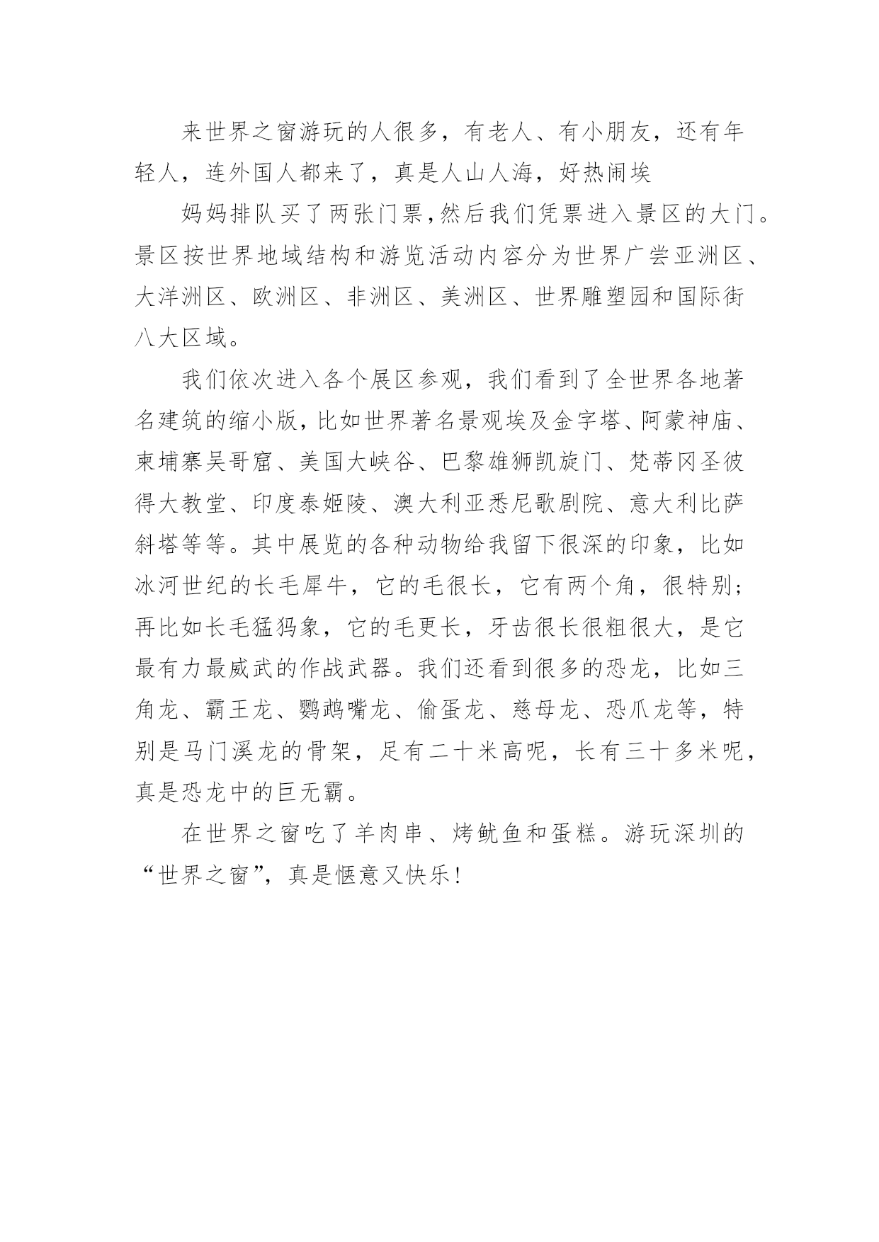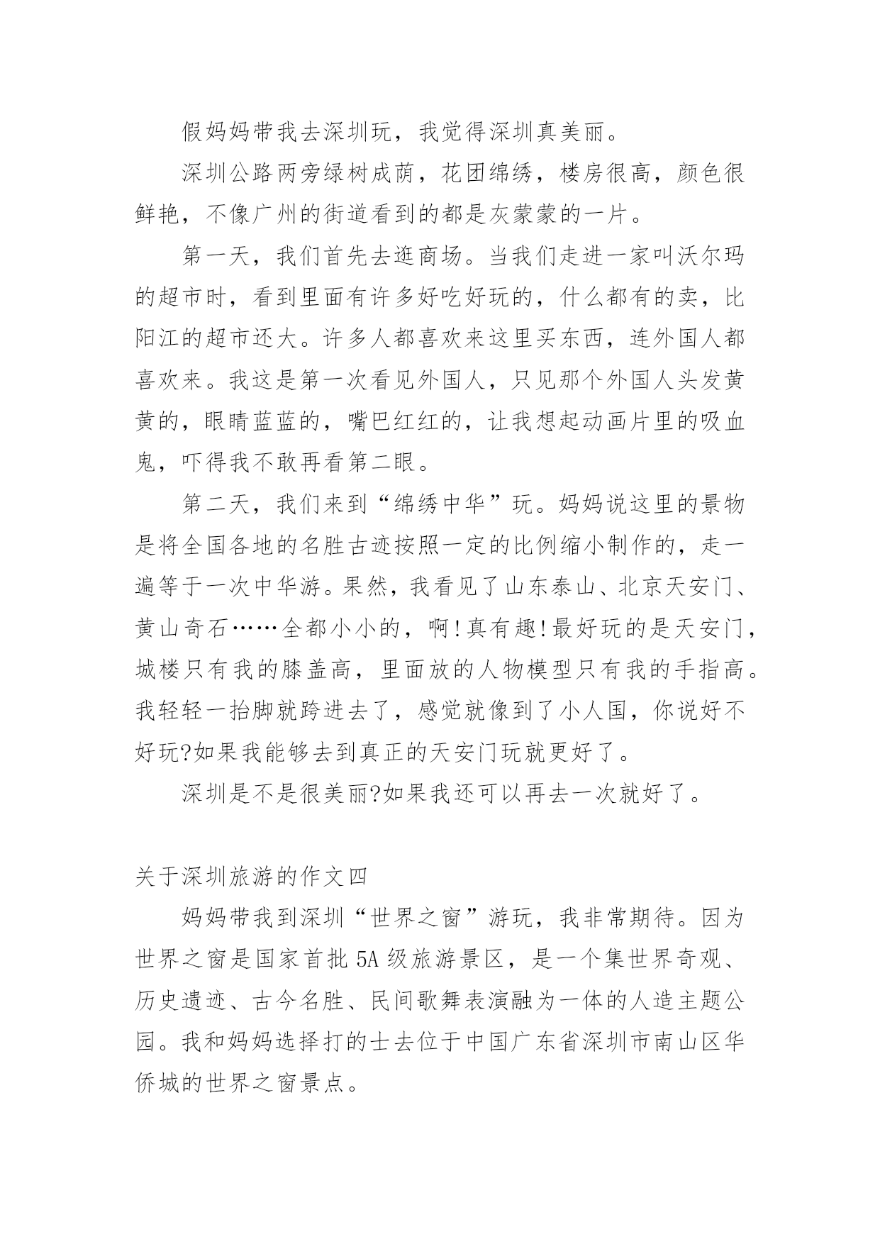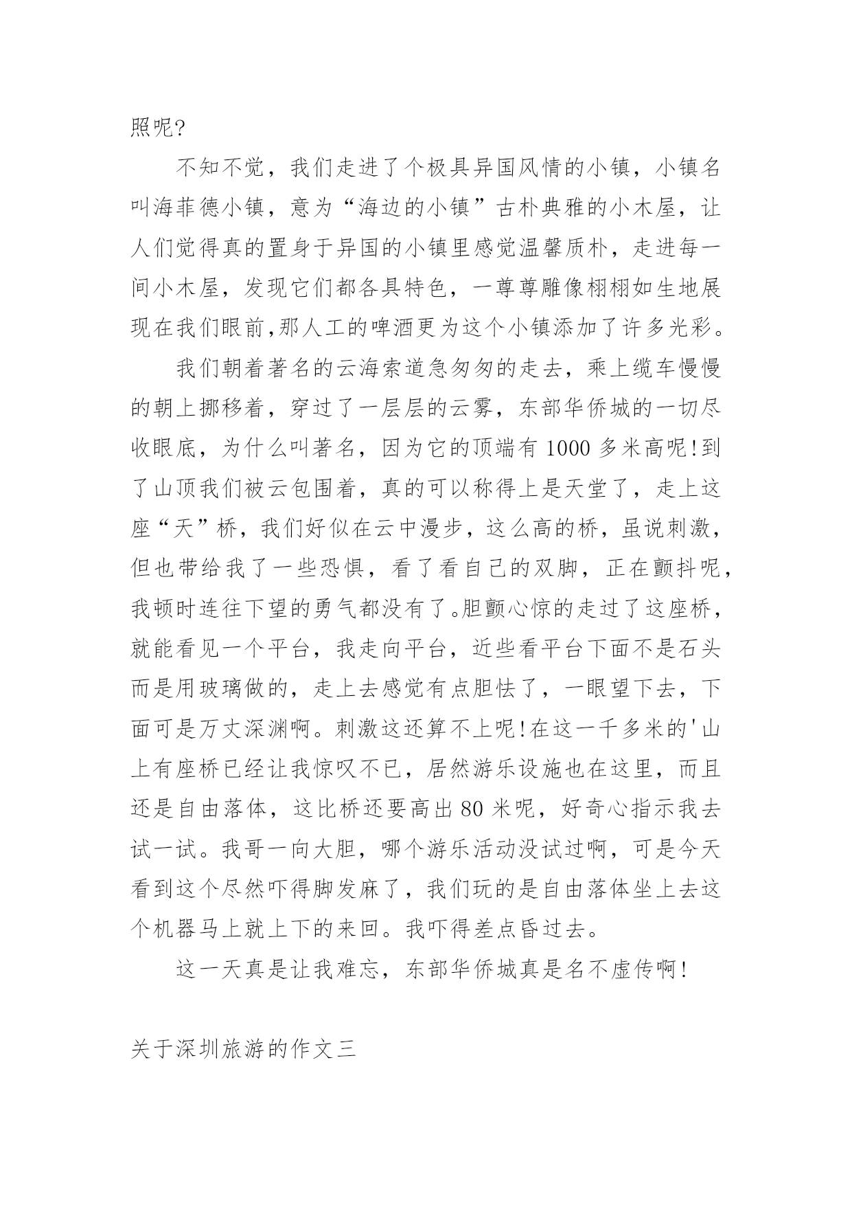 于到深圳旅游的作文有关于到深圳旅游的作文关于深圳旅游的作文一“深圳又称“鹏城”,位于中国南方珠江三角洲东岸,隶属中华人民共和国广东省,是中国第一个经济特区……”听着爸爸绘声绘色的介绍,我对深圳充满了无限的向往。带着期盼与欢乐,我们来到了深圳!到达深圳后,我们游玩的第一个景点是:锦绣中华民俗村来到这儿,给我的第一印象便是:人多。还未进门,熙熙攘攘的人群已将道路堵得水泄不通。我们费了九牛二虎之力才得入内。不过,里边的景点却没令我失望,你瞧!“北京故宫”、“杭州西湖”等世界名景接撞而至,令我眼花缭乱,可以说,这里是一个“世界名迹博物馆”。还等什么,快进去瞧瞧吧!我们漫步在小道上,欣赏着“微缩版”的世界名迹。走着走着,我看到了美不胜收的“杭州西湖”我迫不及待的走上前去,细细观赏着:一朵娇艳美丽的荷花在碧绿的荷叶中站立,彰显出亭亭玉立的身姿。再看看湖面,一片片浮萍漂浮在水面上,给湖面增添了几分美感。岸上,一簇簇小草青翠欲滴,像是被西湖的美景所熏陶。我沉浸其中,不禁陷入美好的幻境中:坐在岸边的亭子上,呼吸新鲜空气,品尝醇厚的茶香,倾听优雅的乐曲,该是多么惬意呀!我沉浸其中,不是爸爸提醒我,我还没回过神。“欲把西湖比西子,浓妆淡抹总相宜。”没错,西湖宛如一位江南美少女,气质娴雅,精神灵秀,给人一种婀娜多姿而又不失娇柔的美感。这样的景色,怎能不令人流连忘返呢?关于深圳旅游的作文二这个暑假,我来到了美丽的城市深圳。据说这里有个著名的旅游景点——东部华侨城。乘着车,一边欣赏着一旁的风景,一边怀着对东部华侨城的遐想,无比悠闲。闭着眼睛就能感受到树木给你带来的新鲜空气。转瞬即逝东部华侨城五个大字就在我的眼前了,买好门票走入其中。进入园区内,远远就看到一条巨大的、宏伟的瀑布,号称中国海滨世界第一大瀑布,非常壮观。瀑布的水飞泻下来,白花花的水溅成一朵朵的“白莲花”,一串串“珍珠”飞流而下,只见水滴在炙热的阳光下闪着银光,犹如天上的星星一般耀眼,令人神往,心旷神怡……瀑布非常温柔,水缓缓地流下来,尽情展现它那婀娜的舞姿,我们站在近处,细细地听它那“哗……哗……哗”的水流声。深呼吸,清凉的气息透过全身,立即觉神清气爽。不愧被称为大峡谷瀑布!真可以和黄国山瀑布相媲美在如此号的美景之下,怎么能不拍照呢?不知不觉,我们走进了个极具异国风情的小镇,小镇名叫海菲德小镇,意为“海边的小镇”古朴典雅的小木屋,让人们觉得真的置身于异国的小镇里感觉温馨质朴,走进每一间小木屋,发现它们都各具特色,一尊尊雕像栩栩如生地展现在我们眼前,那人工的啤酒更为这个小镇添加了许多光彩。我们朝着著名的云海索道急匆匆的走去,乘上缆车慢慢的朝上挪移着,穿过了一层层的云雾,东部华侨城的一切尽收眼底,为什么叫著名,因为它的顶端有1000多米高呢!到了山顶我们被云包围着,真的可以称得上是天堂了,走上这座“天”桥,我们好似在云中漫步,这么高的桥,虽说刺激,但也带给我了一些恐惧,看了看自己的双脚,正在颤抖呢,我顿时连往下望的勇气都没有了。胆颤心惊的走过了这座桥,就能看见一个平台,我走向平台,近些看平台下面不是石头而是用玻璃做的,走上去感觉有点胆怯了,一眼望下去,下面可是万丈深渊啊。刺激这还算不上呢!在这一千多米的'山上有座桥已经让我惊叹不已,居然游乐设施也在这里,而且还是自由落体,这比桥还要高出80米呢,好奇心指示我去试一试。我哥一向大胆,哪个游乐活动没试过啊,可是今天看到这个尽然吓得脚发麻了,我们玩的是自由落体坐上去这个机器马上就上下的来回。我吓得差点昏过去。这一天真是让我难忘,东部华侨城真是名不虚传啊!关于深圳旅游的作文三假妈妈带我去深圳玩,我觉得深圳真美丽。深圳公路两旁绿树成荫,花团绵绣,楼房很高,颜色很鲜艳,不像广州的街道看到的都是灰蒙蒙的一片。第一天,我们首先去逛商场。当我们走进一家叫沃尔玛的超市时,看到里面有许多好吃好玩的,什么都有的卖,比阳江的超市还大。许多人都喜欢来这里买东西,连外国人都喜欢来。我这是第一次看见外国人,只见那个外国人头发黄黄的,眼睛蓝蓝的,嘴巴红红的,让我想起动画片里的吸血鬼,吓得我不敢再看第二眼。第二天,我们来到“绵绣中华”玩。妈妈说这里的景物是将全国各地的名胜古迹按照一定的比例缩小制作的,走一遍等于一次中华游。果然,我看见了山东泰山、北京天安门、黄山奇石……全都小小的,啊!真有趣!最好玩的是天安门,城楼只有我的膝盖高,里面放的人物模型只有我的手指高。我轻轻一抬脚就跨进去了,感觉就像到了小人国,你说好不好玩?如果我能够去到真正的天安门玩就更好了。深圳是不是很美丽?如果我还可以再去一次就好了。关于深圳旅游的作文四妈妈带我到深圳“世界之窗”游玩,我非常期待。因为世界之窗是国家首批5A级旅游景区,是一个集世界奇观、历史遗迹、古今名胜、民间歌舞表演融为一体的人造主题公园。我和妈