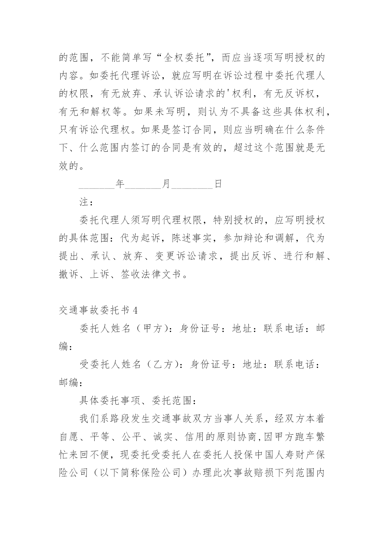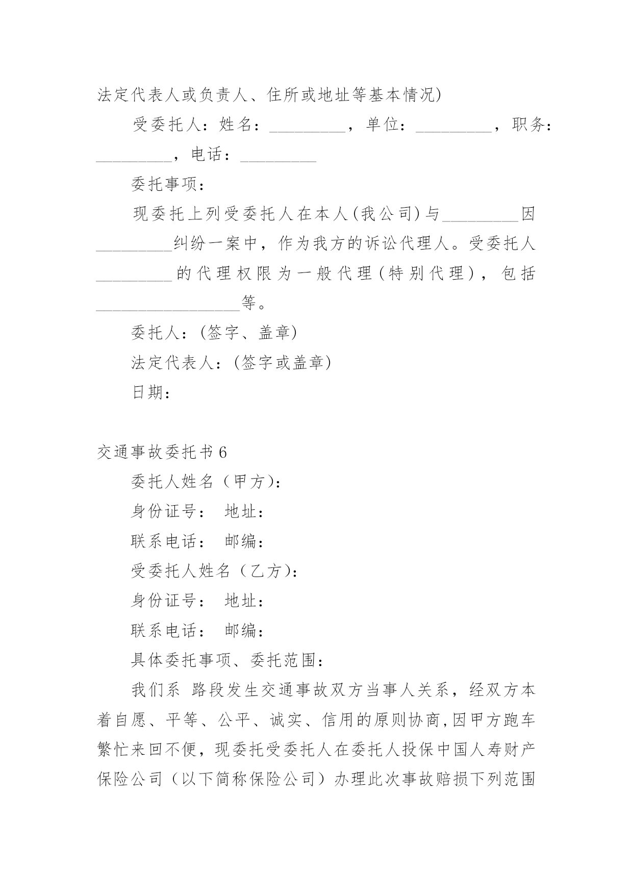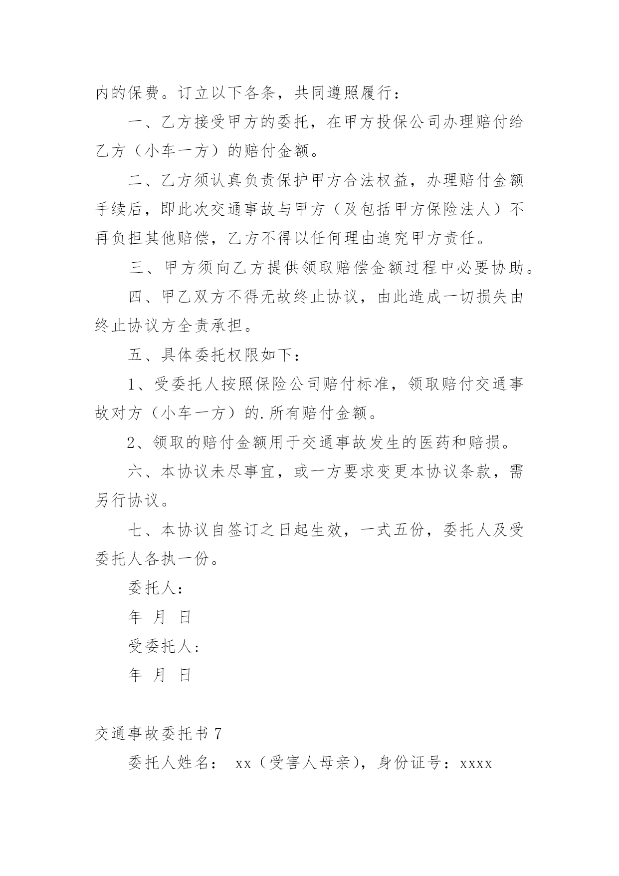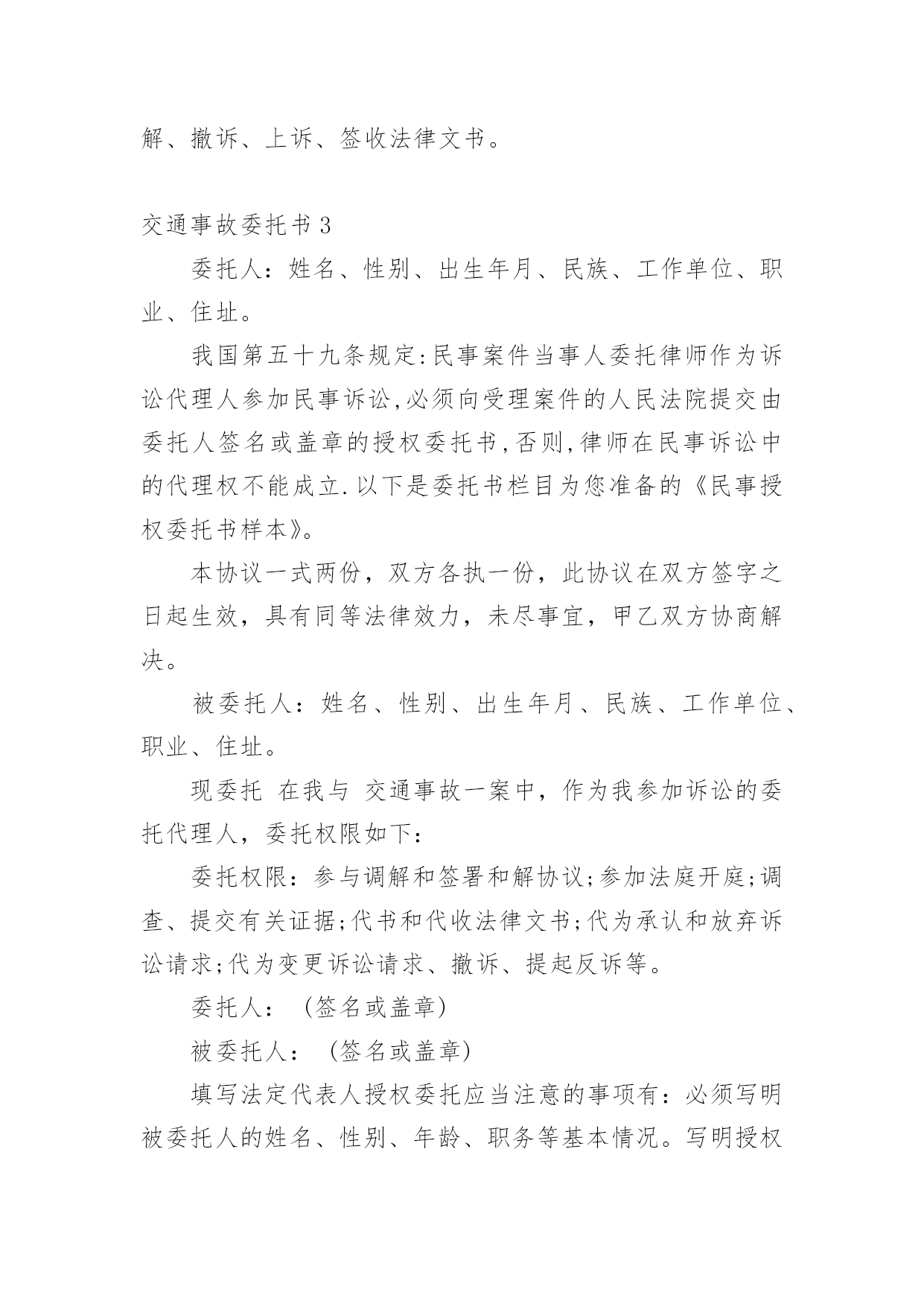 交通事故委托书交通事故委托书(集锦15篇)被委托人如果没有做出违背国家法律的任何权益,被委托人在行使权力时委托人不得以任何理由反悔。在充满活力,日益开放的今天,委托书应用范围愈来愈广泛,那么,怎么去写委托书呢?以下是小编整理的交通事故委托书,仅供参考,大家一起来看看吧。交通事故委托书1委托人姓名:xx(受害人母亲),身份证号:xxxx;地址:xxx联系电话:xx邮编:xxx受委托人姓名:xx,男,身份证号:xx;地址:xxxx,联系电话:xx邮编:xxx具体委托事项、委托范围:委托人委托上列受委托人在xxxxxxxx路段发生交通事故死亡一事由xxxx其代理权限为全权代理。委托人:受委托人:年月日年月日交通事故委托书2委托人:姓名:_______________、性别:_______________、出生年月:_______________、民族:_______________、工作单位:_______________、职业:_______________、住址:_______________。被委托人:姓名:_______________、性别:_______________、出生年月:_______________、民族:_______________、工作单位:_______________、职业:_______________、住址:_______________。现委托在我与交通事故一案中,作为我参加诉讼的.委托代理人,委托权限如下:1、______________________________2、______________________________委托人:(签名或盖章)______________________________被委托人:(签名或盖章)_____________________________________年_______月________日注:委托代理人须写明代理权限,特别授权的,应写明授权的具体范围:代为起诉,陈述事实,参加辩论和调解,代为提出、承认、放弃、变更诉讼请求,提出反诉、进行和解、撤诉、上诉、签收法律文书。交通事故委托书3委托人:姓名、性别、出生年月、民族、工作单位、职业、住址。我国第五十九条规定:民事案件当事人委托律师作为诉讼代理人参加民事诉讼,必须向受理案件的人民法院提交由委托人签名或盖章的授权委托书,否则,律师在民事诉讼中的代理权不能成立.以下是委托书栏目为您准备的《民事授权委托书样本》。本协议一式两份,双方各执一份,此协议在双方签字之日起生效,具有同等法律效力,未尽事宜,甲乙双方协商解决。被委托人:姓名、性别、出生年月、民族、工作单位、职业、住址。现委托在我与交通事故一案中,作为我参加诉讼的委托代理人,委托权限如下:委托权限:参与调解和签署和解协议;参加法庭开庭;调查、提交有关证据;代书和代收法律文书;代为承认和放弃诉讼请求;代为变更诉讼请求、撤诉、提起反诉等。委托人:(签名或盖章)被委托人:(签名或盖章)填写法定代表人授权委托应当注意的事项有:必须写明被委托人的姓名、性别、年龄、职务等基本情况。写明授权的范围,不能简单写“全权委托”,而应当逐项写明授权的内容。如委托代理诉讼,就应写明在诉讼过程中委托代理人的权限,有无放弃、承认诉讼请求的'权利,有无反诉权,有无和解权等。如果未写明,则认为不具备这些具体权利,只有诉讼代理权。如果是签订合同,则应当明确在什么条件下、什么范围内签订的合同是有效的,超过这个范围就是无效的。_______年_______月________日注:委托代理人须写明代理权限,特别授权的,应写明授权的具体范围:代为起诉,陈述事实,参加辩论和调解,代为提出、承认、放弃、变更诉讼请求,提出反诉、进行和解、撤诉、上诉、签收法律文书。交通事故委托书4委托人姓名(甲方):身份证号:地址:联系电话:邮编:受委托人姓名(乙方):身份证号:地址:联系电话:邮编:具体委托事项、委托范围:我们系路段发生交通事故双方当事人关系,经双方本着自愿、平等、公平、诚实、信用的原则协商,因甲方跑车繁忙来回不便,现委托受委托人在委托人投保中国人寿财产保险公司(以下简称保险公司)办理此次事故赔损下列范围内的保费。订立以下各条,共同遵照履行:一、乙方接受甲方的委托,在甲方投保公司办理赔付给乙方(小车一方)的.赔付金额。二、乙方须认真负责保护甲方合法权益,办理赔付金额手续后,即此次交通事故与甲方(及包括甲方保险法人)不再负担其他赔偿,乙方不得以任何理由追究甲方责任。三、甲方须向乙方提供领取赔偿金额过程中必要协助。四、甲乙双方不得无故终止协议,由此造成一切损失由终止协议方全责承担。五、具体委托权限如下:1、受委托人按照保险公司赔付标准,领取赔付交通事故对方(小车一方)的所有赔付金额。2、