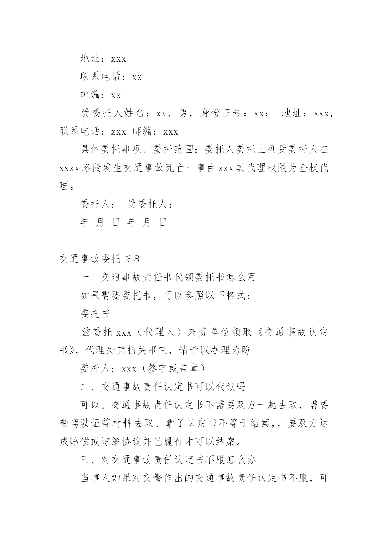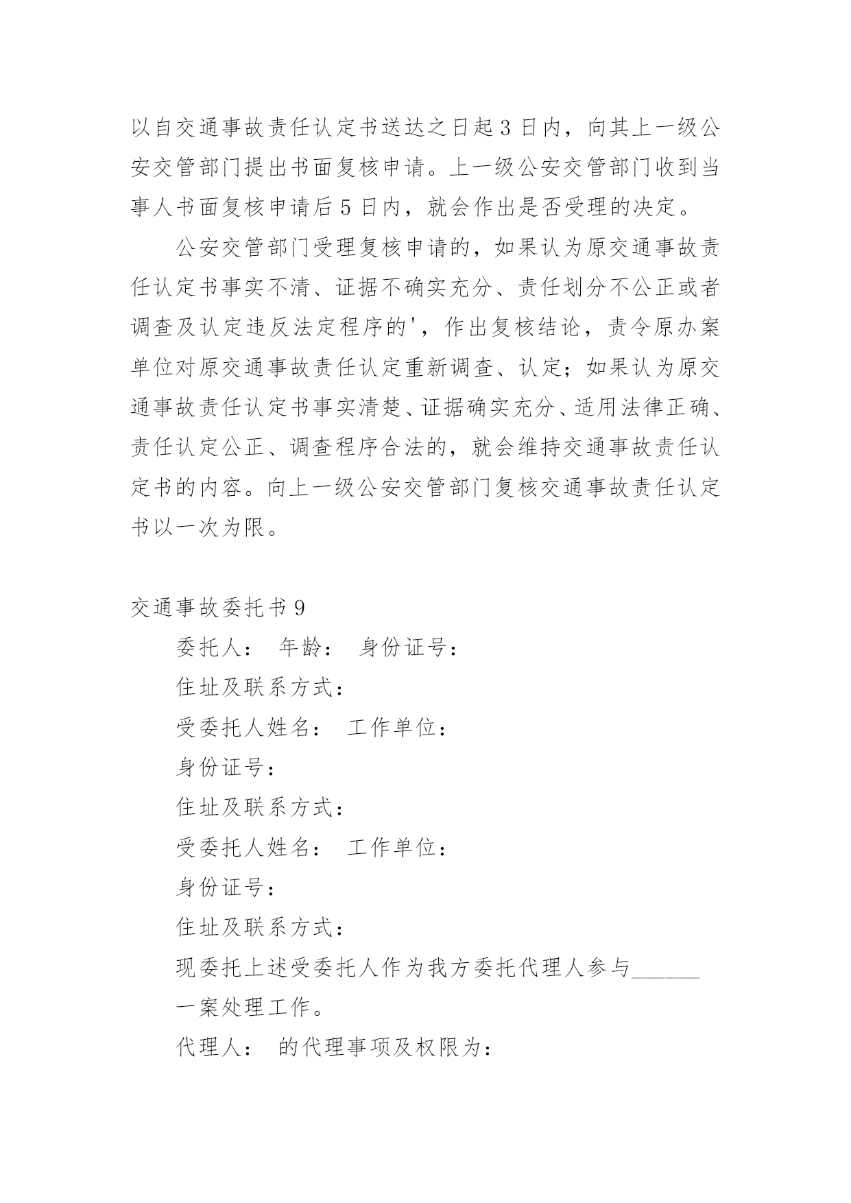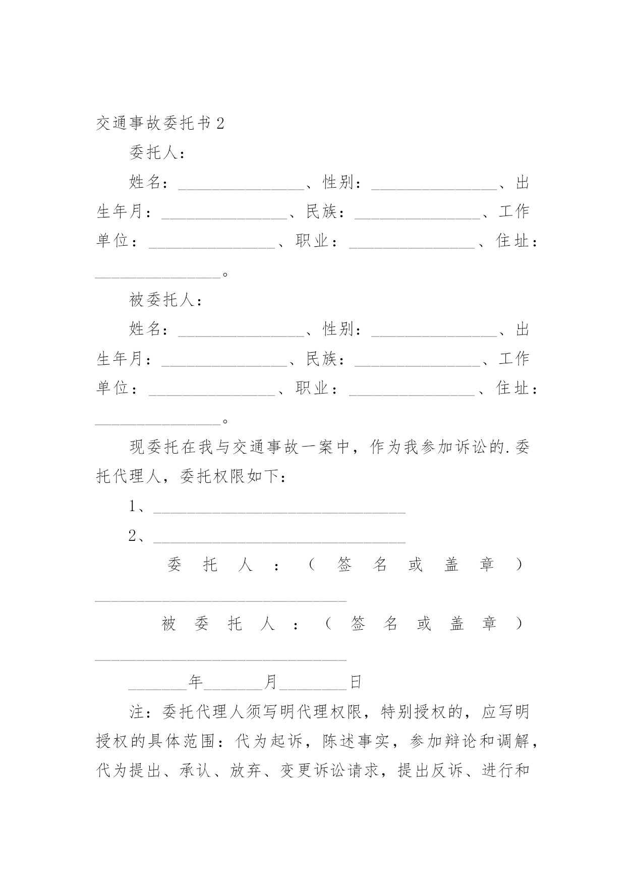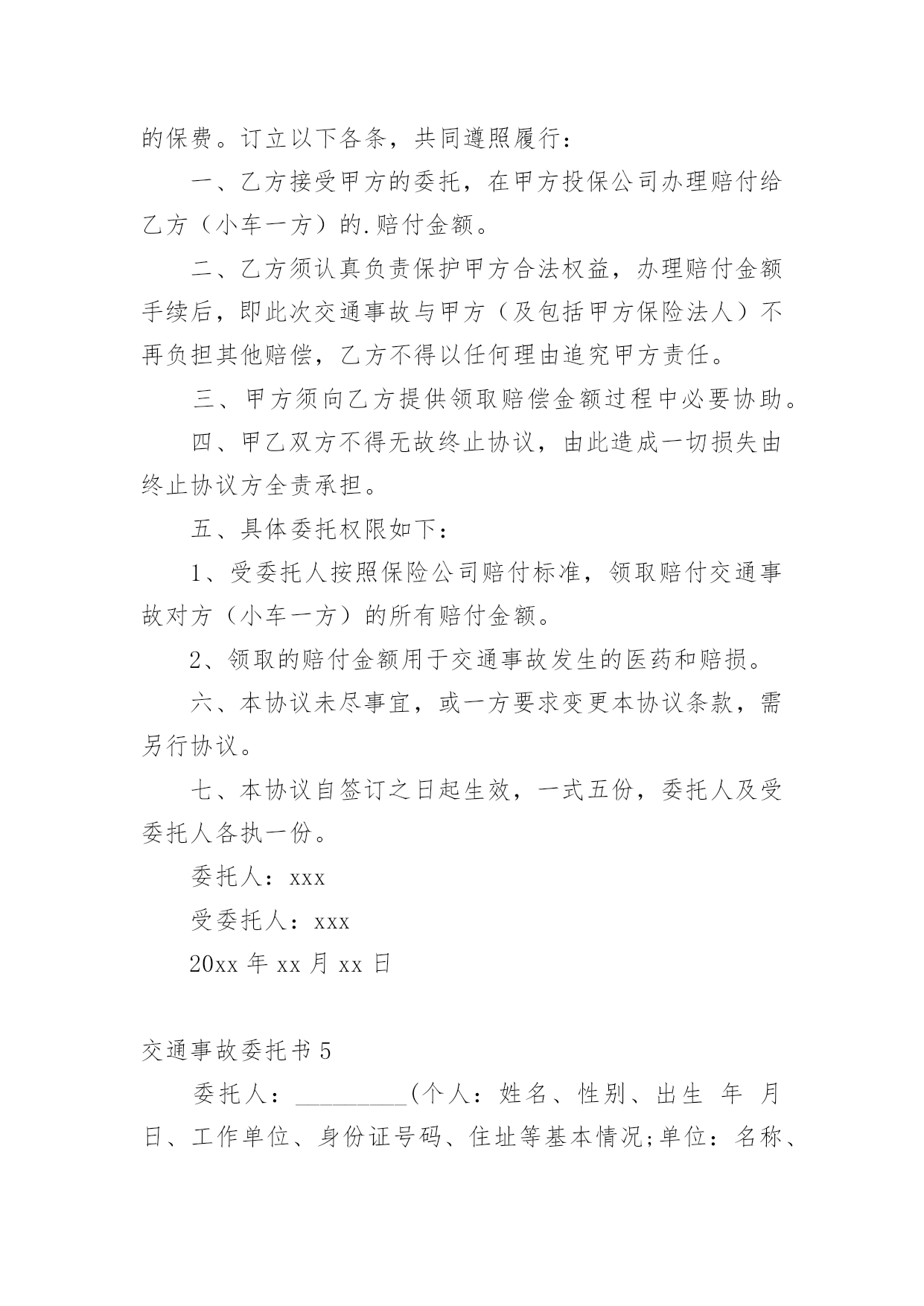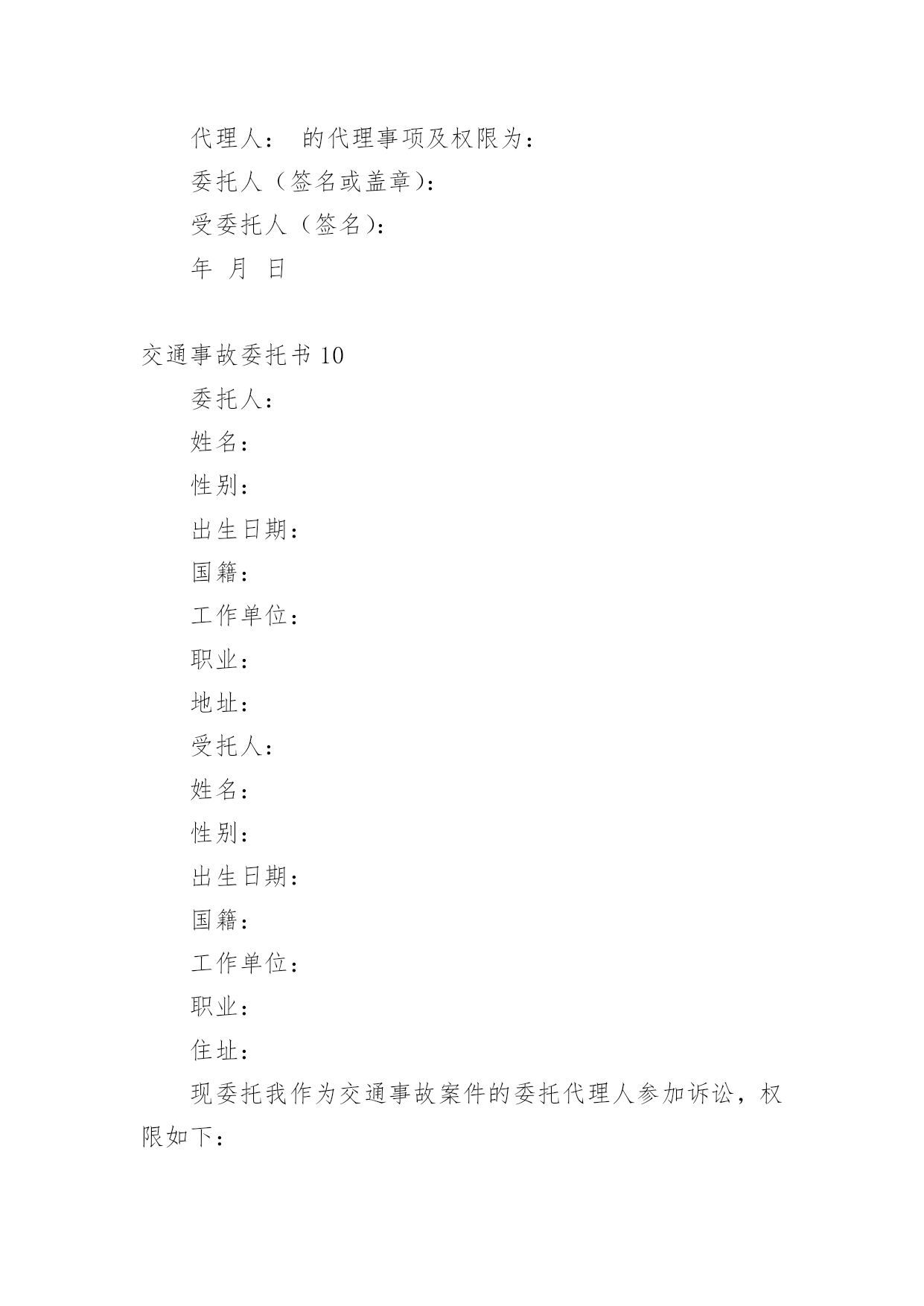 交通事故委托书交通事故委托书(集锦15篇)被委托人如果没有做出违背国家法律的任何权益,被委托人在行使权力时委托人不得以任何理由反悔。在充满活力,日益开放的今天,委托书应用范围愈来愈广泛,那么,怎么去写委托书呢?以下是小编整理的交通事故委托书,仅供参考,大家一起来看看吧。交通事故委托书1委托人姓名:xx(受害人母亲),身份证号:xxxx;地址:xxx联系电话:xx邮编:xxx受委托人姓名:xx,男,身份证号:xx;地址:xxxx,联系电话:xx邮编:xxx具体委托事项、委托范围:委托人委托上列受委托人在xxxxxxxx路段发生交通事故死亡一事由xxxx其代理权限为全权代理。委托人:受委托人:年月日年月日交通事故委托书2委托人:姓名:_______________、性别:_______________、出生年月:_______________、民族:_______________、工作单位:_______________、职业:_______________、住址:_______________。被委托人:姓名:_______________、性别:_______________、出生年月:_______________、民族:_______________、工作单位:_______________、职业:_______________、住址:_______________。现委托在我与交通事故一案中,作为我参加诉讼的.委托代理人,委托权限如下:1、______________________________2、______________________________委托人:(签名或盖章)______________________________被委托人:(签名或盖章)_____________________________________年_______月________日注:委托代理人须写明代理权限,特别授权的,应写明授权的具体范围:代为起诉,陈述事实,参加辩论和调解,代为提出、承认、放弃、变更诉讼请求,提出反诉、进行和解、撤诉、上诉、签收法律文书。交通事故委托书3委托人:姓名、性别、出生年月、民族、工作单位、职业、住址。我国第五十九条规定:民事案件当事人委托律师作为诉讼代理人参加民事诉讼,必须向受理案件的人民法院提交由委托人签名或盖章的授权委托书,否则,律师在民事诉讼中的代理权不能成立.以下是委托书栏目为您准备的《民事授权委托书样本》。本协议一式两份,双方各执一份,此协议在双方签字之日起生效,具有同等法律效力,未尽事宜,甲乙双方协商解决。被委托人:姓名、性别、出生年月、民族、工作单位、职业、住址。现委托在我与交通事故一案中,作为我参加诉讼的委托代理人,委托权限如下:委托权限:参与调解和签署和解协议;参加法庭开庭;调查、提交有关证据;代书和代收法律文书;代为承认和放弃诉讼请求;代为变更诉讼请求、撤诉、提起反诉等。委托人:(签名或盖章)被委托人:(签名或盖章)填写法定代表人授权委托应当注意的事项有:必须写明被委托人的姓名、性别、年龄、职务等基本情况。写明授权的范围,不能简单写“全权委托”,而应当逐项写明授权的内容。如委托代理诉讼,就应写明在诉讼过程中委托代理人的权限,有无放弃、承认诉讼请求的'权利,有无反诉权,有无和解权等。如果未写明,则认为不具备这些具体权利,只有诉讼代理权。如果是签订合同,则应当明确在什么条件下、什么范围内签订的合同是有效的,超过这个范围就是无效的。_______年_______月________日注:委托代理人须写明代理权限,特别授权的,应写明授权的具体范围:代为起诉,陈述事实,参加辩论和调解,代为提出、承认、放弃、变更诉讼请求,提出反诉、进行和解、撤诉、上诉、签收法律文书。交通事故委托书4委托人姓名(甲方):身份证号:地址:联系电话:邮编:受委托人姓名(乙方):身份证号:地址:联系电话:邮编:具体委托事项、委托范围:我们系路段发生交通事故双方当事人关系,经双方本着自愿、平等、公平、诚实、信用的原则协商,因甲方跑车繁忙来回不便,现委托受委托人在委托人投保中国人寿财产保险公司(以下简称保险公司)办理此次事故赔损下列范围内的保费。订立以下各条,共同遵照履行:一、乙方接受甲方的委托,在甲方投保公司办理赔付给乙方(小车一方)的.赔付金额。二、乙方须认真负责保护甲方合法权益,办理赔付金额手续后,即此次交通事故与甲方(及包括甲方保险法人)不再负担其他赔偿,乙方不得以任何理由追究甲方责任。三、甲方须向乙方提供领取赔偿金额过程中必要协助。四、甲乙双方不得无故终止协议,由此造成一切损失由终止协议方全责承担。五、具体委托权限如下:1、受委托人按照保险公司赔付标准,领取赔付交通事故对方(小车一方)的所有赔付金额。2、
