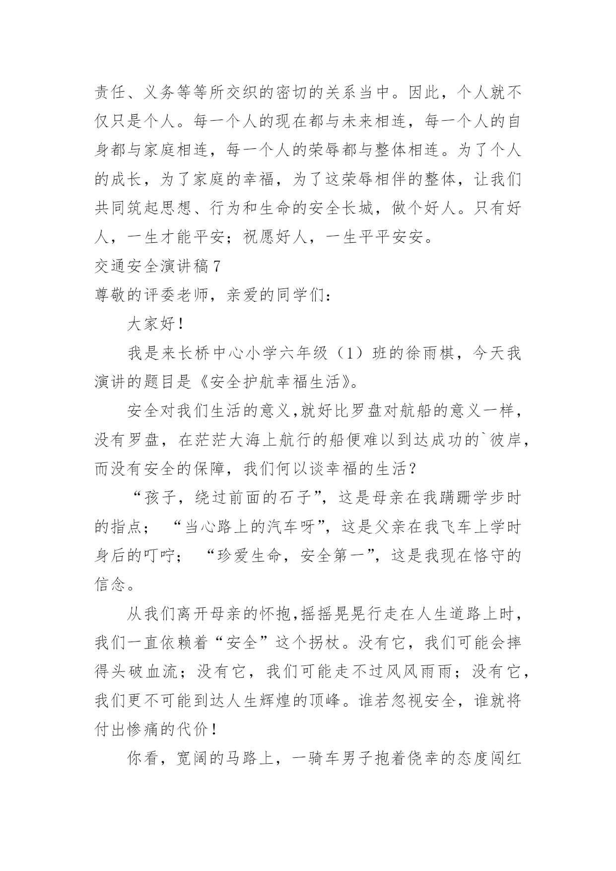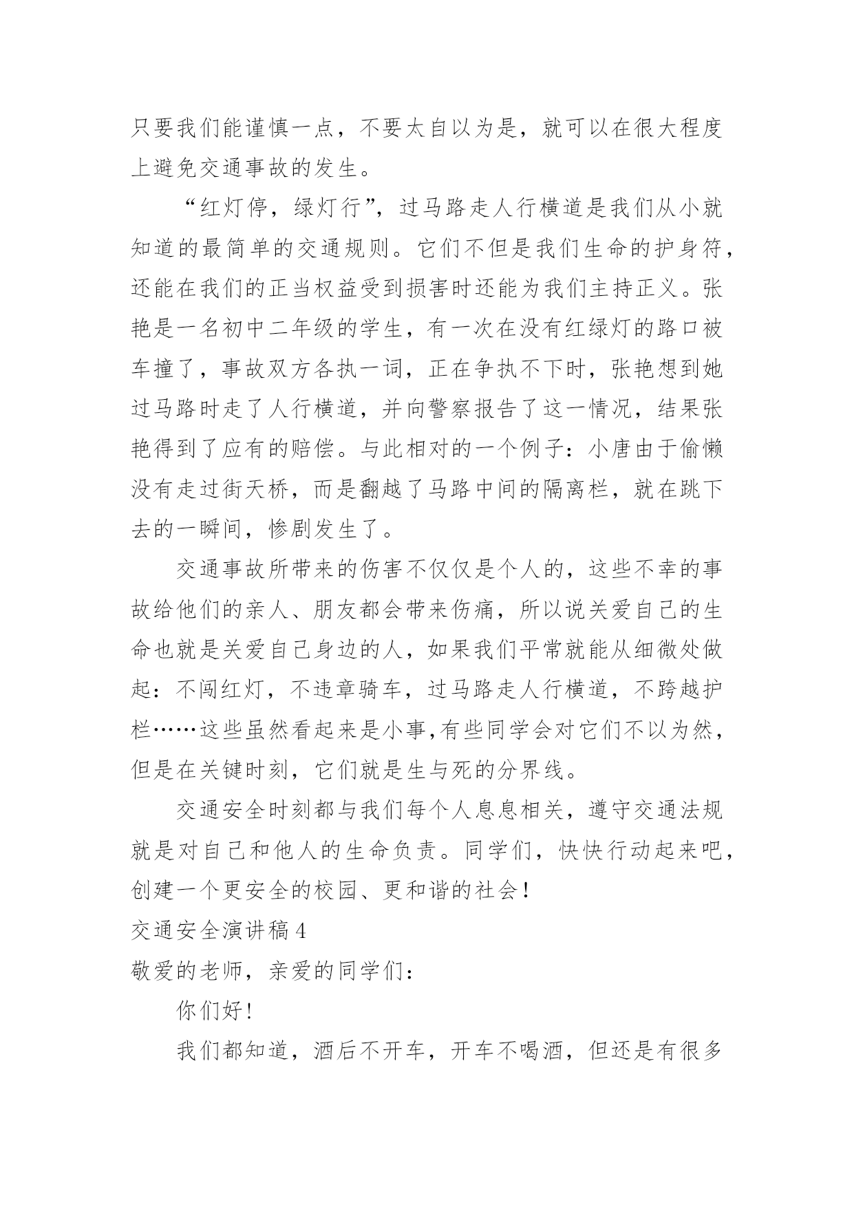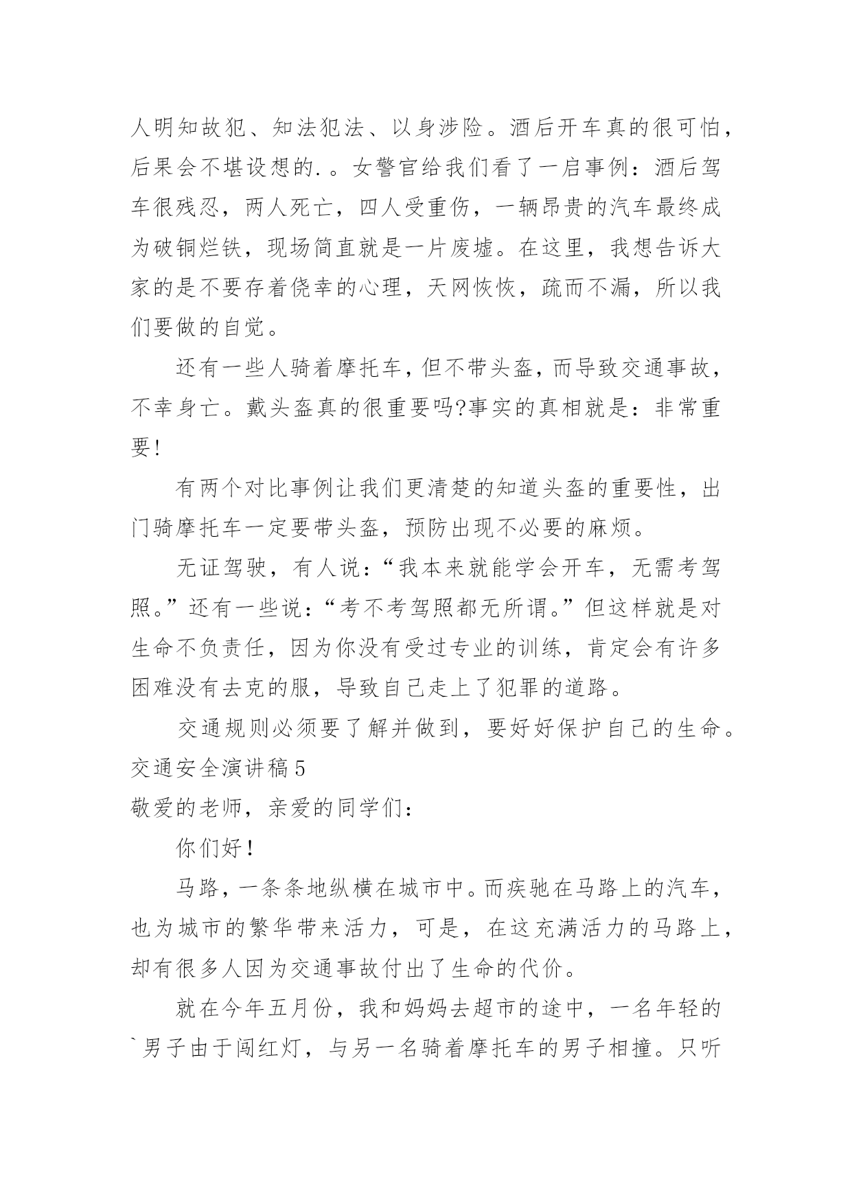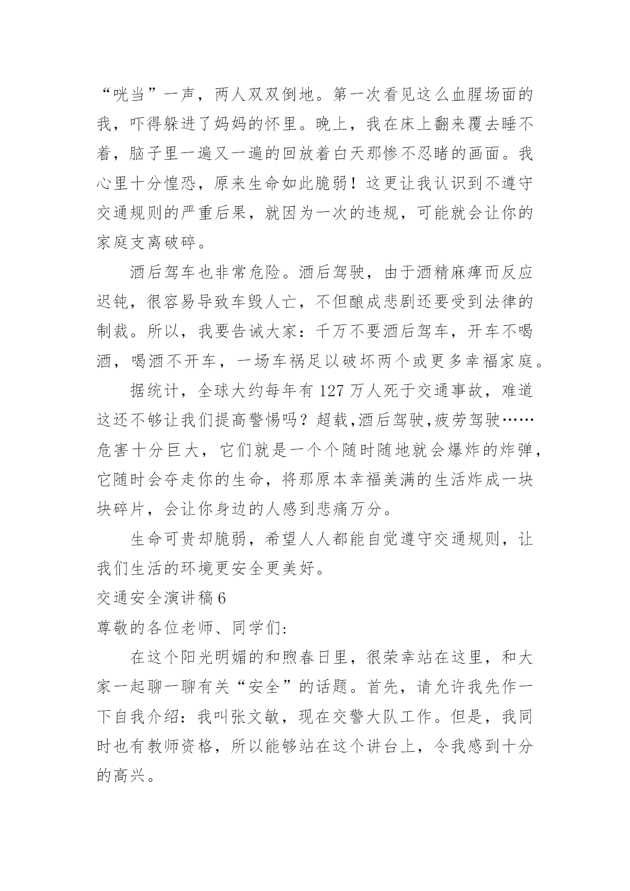 交通安全演讲稿(精选)交通安全演讲稿演讲稿的写法比较灵活,可以根据会议的内容、一件事事后的感想、需要等情况而有所区别。在现在的社会生活中,演讲稿与我们的生活息息相关,如何写一份恰当的演讲稿呢?以下是小编为大家收集的交通安全演讲稿,仅供参考,希望能够帮助到大家。交通安全演讲稿1各位老师,同学们大家好!我们不管是上学,还是放学时,马路上的车辆总是川流不息。这时都牵动着每一位爸爸、妈妈的心,马路上随时都有可能上演一幕幕惨剧。一个个鲜活的生命就消失在车轮之下,一阵阵欢声笑语埋没在刺耳的喇叭声中,一幅幅惨不忍睹的画面,一个个痛苦挣扎的表情,一声声呼天喊地的哭声,一句句引人深思的话语,唯独剩下的是人类的痛惜!导致这悲剧发生的重要原因就是人们缺乏自我保护意识和交通安全知识,一起交通事故都在间接的拆散一个幸福的`家庭,如果是我们再多加强交通防范意识,很多事故就可以避免发生,甚至不再发生。俗话说:安全在于提高警惕,事故出于麻痹大意。在人们的眼中,造成悲剧的发生,就是开车不谨慎,不然就是不遵守交通规则,的确如此。如果人们不在酒后驾车,不再技术上逞能,不在驾驶时横穿马路,每一个行人都遵守交通规则,那么社会不就没有令人因失去亲人而伤心欲绝的交通事故了吗?每个人的生命都是父母给与我们的,一个人不会有第二次生命,所以我们应该倍加珍惜,有了生命的存在才能成就我们一个个五彩的梦。我们是祖国的花朵,是未来的建设者和主宰者。作为一名小学生更加应该有自我保护意识,从我做起,从小做起,做一个遵守交通规则的小学生。可爱的校园我们的家,交通安全靠大家,人人身处自律手,校园开遍和谐花。小朋友们让我们把平安的种子播撒向大地,让它发芽生长、开花结果之时,你收获的将是更多的幸福与安宁。交通安全演讲稿2亲爱的老师、同学们:大家好!今天我国旗下讲话的题目是《交通安全记我心中》。安全是什么?安全是忠实的保护神,日日夜夜守护在我们身边,让生命之树挺拔青翠;安全是警钟,时时刻刻提醒我们珍爱生命,注意安全!每天来上学,父母总不忘提醒我们:安全第一!上课时,老师常常教导我们:学校内外要注意安全。我们却常常把他们的话当做耳旁风,而这所谓的耳旁风,正是对我们的爱的叮咛!每当上学放学的路上,放眼望去,好多同学不遵守交通规则,比如走在机动车道上、横穿马路、走逆行道,更有甚者还在车流不息的马路上打闹,多么危险的行为啊!我在此倡议:尽量请家长接送上下学,保护我们的`安全;遵守《道路交通安全法实施条例》和《小学生守则》规定,不满十二周岁的同学坚决不骑自行车上路;在马路上步行时一定要走人行横道,并且靠右行;横穿马路时,要走斑马线,注意往来车辆。生命只有一次,只有珍爱生命,时时刻刻注意安全,我们才能平平安安的度过一生,在此希望大家能共同遵守交通规则,享受幸福人生。我的讲话到此结束,谢谢大家!交通安全演讲稿3亲爱的老师和同学们:大家好!交通与我们的生活息息相关。无论是走在路上,还是乘坐各种交通工具,安全永远是第一位的。近年来,我们中学生周围交通事故频发,很多是由于我们自身安全意识和知识的缺乏,不注意遵守交通和骑行规则,这是不应该发生的。交通法规需要大家自觉遵守,这样才能尽可能避免交通事故。年轻人大多生性好动,注意力不易集中。有些同学在骑车时戴着随身听,或者在街上追逐嬉戏,以至于不能辨明当时的`情况而作出及时的反应。还有很多同学心存侥幸,以为自己能够在发生事故前躲避危险,或者抱着“他们不敢撞我”的想法,这些都是造成交通事故中不必要伤亡的原因。只要我们能谨慎一点,不要太自以为是,就可以在很大程度上避免交通事故的发生。“红灯停,绿灯行”,过马路走人行横道是我们从小就知道的最简单的交通规则。它们不但是我们生命的护身符,还能在我们的正当权益受到损害时还能为我们主持正义。张艳是一名初中二年级的学生,有一次在没有红绿灯的路口被车撞了,事故双方各执一词,正在争执不下时,张艳想到她过马路时走了人行横道,并向警察报告了这一情况,结果张艳得到了应有的赔偿。与此相对的一个例子:小唐由于偷懒没有走过街天桥,而是翻越了马路中间的隔离栏,就在跳下去的一瞬间,惨剧发生了。交通事故所带来的伤害不仅仅是个人的,这些不幸的事故给他们的亲人、朋友都会带来伤痛,所以说关爱自己的生命也就是关爱自己身边的人,如果我们平常就能从细微处做起:不闯红灯,不违章骑车,过马路走人行横道,不跨越护栏……这些虽然看起来是小事,有些同学会对它们不以为然,但是在关键时刻,它们就是生与死的分界线。交通安全时刻都与我们每个人息息相关,遵守交通法规就是对自己和他人的生命负责。同学们,快快行动起来吧,创建一个更安全的校园、更和谐的社会!交通安全演讲稿4敬爱的老师,亲爱的同学们:你们好!我们都知道,酒后不开车,开车不喝酒,但还是有很多人明知故犯、知法犯法、以身涉险。酒后开车真的很