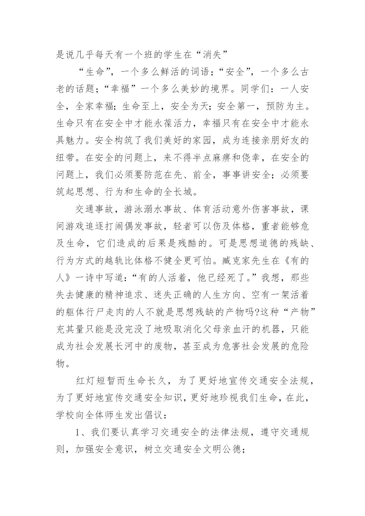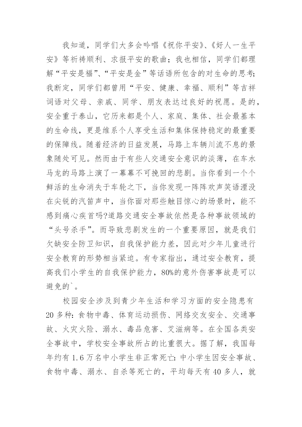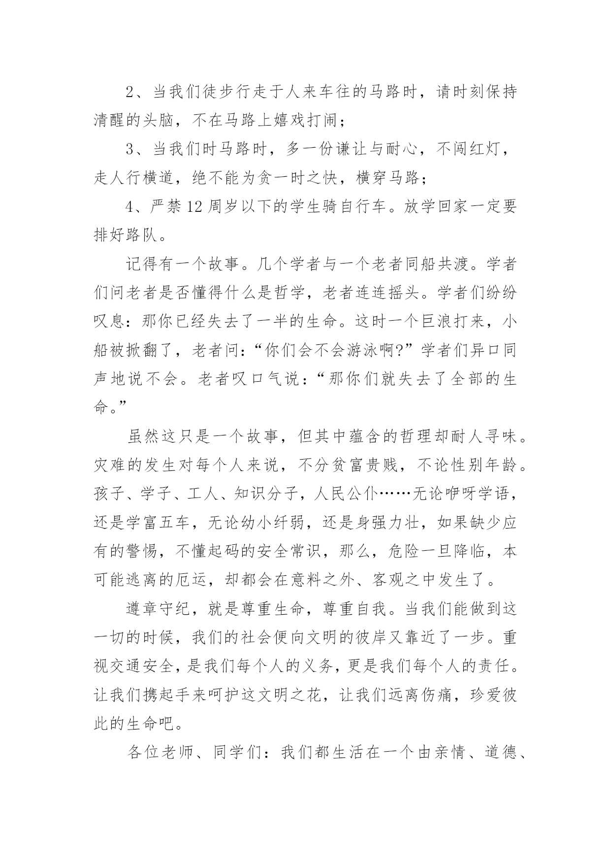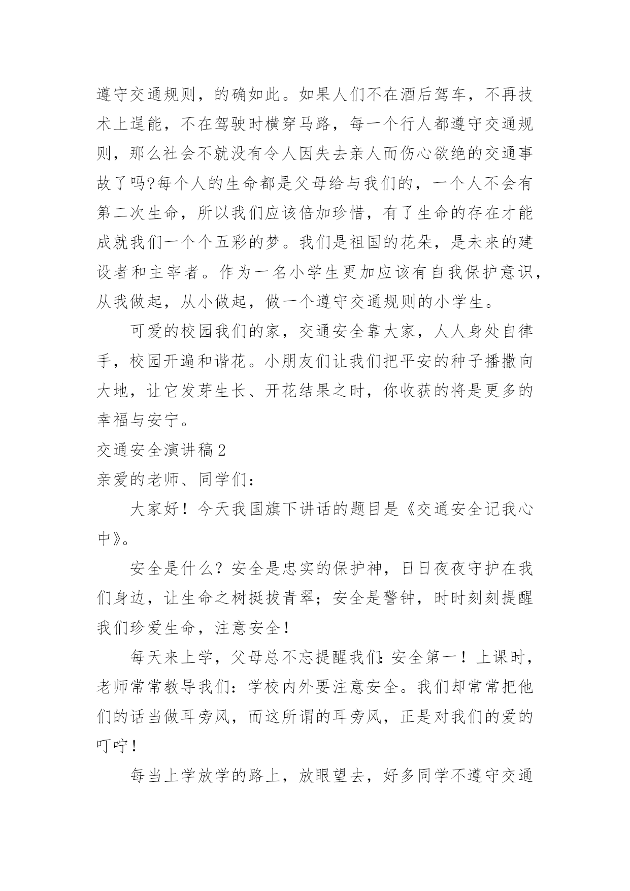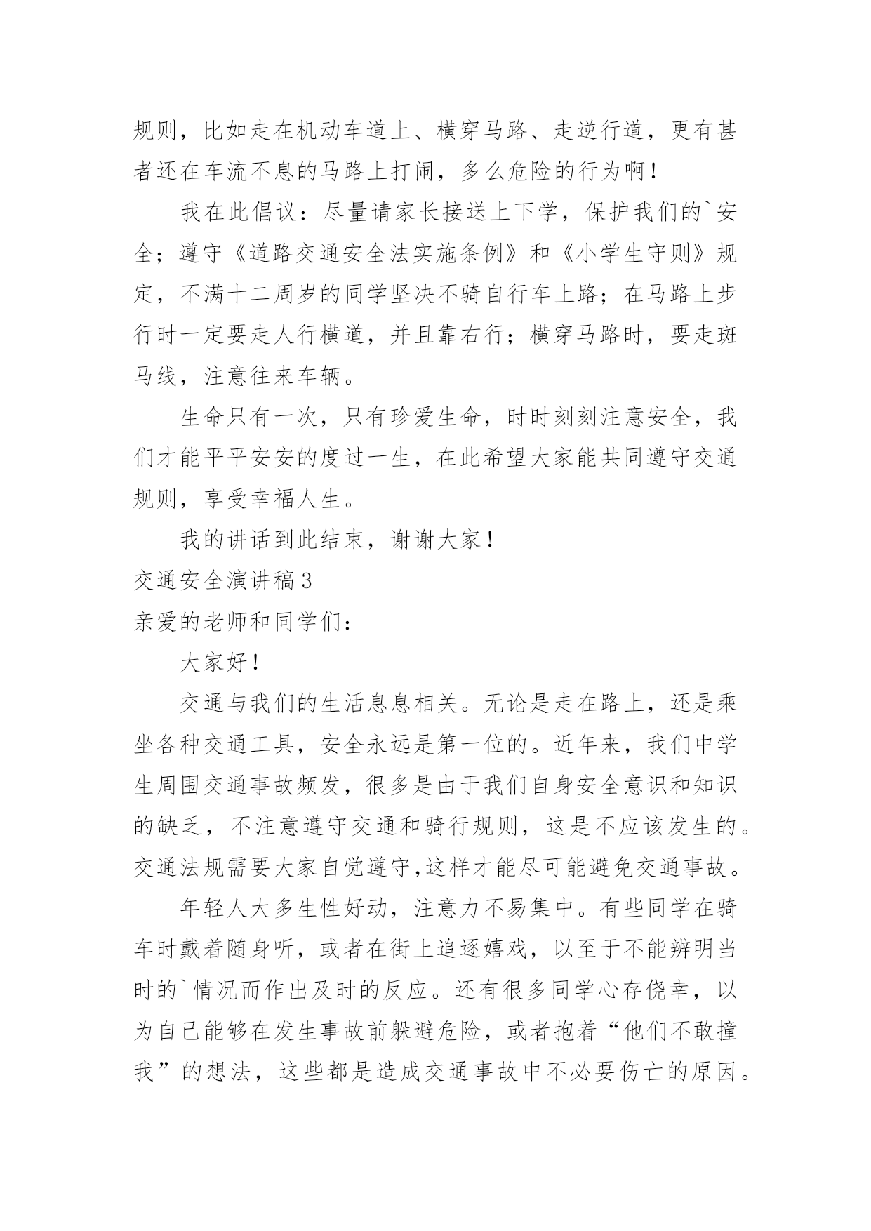 交通安全演讲稿(精选)交通安全演讲稿演讲稿的写法比较灵活,可以根据会议的内容、一件事事后的感想、需要等情况而有所区别。在现在的社会生活中,演讲稿与我们的生活息息相关,如何写一份恰当的演讲稿呢?以下是小编为大家收集的交通安全演讲稿,仅供参考,希望能够帮助到大家。交通安全演讲稿1各位老师,同学们大家好!我们不管是上学,还是放学时,马路上的车辆总是川流不息。这时都牵动着每一位爸爸、妈妈的心,马路上随时都有可能上演一幕幕惨剧。一个个鲜活的生命就消失在车轮之下,一阵阵欢声笑语埋没在刺耳的喇叭声中,一幅幅惨不忍睹的画面,一个个痛苦挣扎的表情,一声声呼天喊地的哭声,一句句引人深思的话语,唯独剩下的是人类的痛惜!导致这悲剧发生的重要原因就是人们缺乏自我保护意识和交通安全知识,一起交通事故都在间接的拆散一个幸福的`家庭,如果是我们再多加强交通防范意识,很多事故就可以避免发生,甚至不再发生。俗话说:安全在于提高警惕,事故出于麻痹大意。在人们的眼中,造成悲剧的发生,就是开车不谨慎,不然就是不遵守交通规则,的确如此。如果人们不在酒后驾车,不再技术上逞能,不在驾驶时横穿马路,每一个行人都遵守交通规则,那么社会不就没有令人因失去亲人而伤心欲绝的交通事故了吗?每个人的生命都是父母给与我们的,一个人不会有第二次生命,所以我们应该倍加珍惜,有了生命的存在才能成就我们一个个五彩的梦。我们是祖国的花朵,是未来的建设者和主宰者。作为一名小学生更加应该有自我保护意识,从我做起,从小做起,做一个遵守交通规则的小学生。可爱的校园我们的家,交通安全靠大家,人人身处自律手,校园开遍和谐花。小朋友们让我们把平安的种子播撒向大地,让它发芽生长、开花结果之时,你收获的将是更多的幸福与安宁。交通安全演讲稿2亲爱的老师、同学们:大家好!今天我国旗下讲话的题目是《交通安全记我心中》。安全是什么?安全是忠实的保护神,日日夜夜守护在我们身边,让生命之树挺拔青翠;安全是警钟,时时刻刻提醒我们珍爱生命,注意安全!每天来上学,父母总不忘提醒我们:安全第一!上课时,老师常常教导我们:学校内外要注意安全。我们却常常把他们的话当做耳旁风,而这所谓的耳旁风,正是对我们的爱的叮咛!每当上学放学的路上,放眼望去,好多同学不遵守交通规则,比如走在机动车道上、横穿马路、走逆行道,更有甚者还在车流不息的马路上打闹,多么危险的行为啊!我在此倡议:尽量请家长接送上下学,保护我们的`安全;遵守《道路交通安全法实施条例》和《小学生守则》规定,不满十二周岁的同学坚决不骑自行车上路;在马路上步行时一定要走人行横道,并且靠右行;横穿马路时,要走斑马线,注意往来车辆。生命只有一次,只有珍爱生命,时时刻刻注意安全,我们才能平平安安的度过一生,在此希望大家能共同遵守交通规则,享受幸福人生。我的讲话到此结束,谢谢大家!交通安全演讲稿3亲爱的老师和同学们:大家好!交通与我们的生活息息相关。无论是走在路上,还是乘坐各种交通工具,安全永远是第一位的。近年来,我们中学生周围交通事故频发,很多是由于我们自身安全意识和知识的缺乏,不注意遵守交通和骑行规则,这是不应该发生的。交通法规需要大家自觉遵守,这样才能尽可能避免交通事故。年轻人大多生性好动,注意力不易集中。有些同学在骑车时戴着随身听,或者在街上追逐嬉戏,以至于不能辨明当时的`情况而作出及时的反应。还有很多同学心存侥幸,以为自己能够在发生事故前躲避危险,或者抱着“他们不敢撞我”的想法,这些都是造成交通事故中不必要伤亡的原因。只要我们能谨慎一点,不要太自以为是,就可以在很大程度上避免交通事故的发生。“红灯停,绿灯行”,过马路走人行横道是我们从小就知道的最简单的交通规则。它们不但是我们生命的护身符,还能在我们的正当权益受到损害时还能为我们主持正义。张艳是一名初中二年级的学生,有一次在没有红绿灯的路口被车撞了,事故双方各执一词,正在争执不下时,张艳想到她过马路时走了人行横道,并向警察报告了这一情况,结果张艳得到了应有的赔偿。与此相对的一个例子:小唐由于偷懒没有走过街天桥,而是翻越了马路中间的隔离栏,就在跳下去的一瞬间,惨剧发生了。交通事故所带来的伤害不仅仅是个人的,这些不幸的事故给他们的亲人、朋友都会带来伤痛,所以说关爱自己的生命也就是关爱自己身边的人,如果我们平常就能从细微处做起:不闯红灯,不违章骑车,过马路走人行横道,不跨越护栏……这些虽然看起来是小事,有些同学会对它们不以为然,但是在关键时刻,它们就是生与死的分界线。交通安全时刻都与我们每个人息息相关,遵守交通法规就是对自己和他人的生命负责。同学们,快快行动起来吧,创建一个更安全的校园、更和谐的社会!交通安全演讲稿4敬爱的老师,亲爱的同学们:你们好!我们都知道,酒后不开车,开车不喝酒,但还是有很多人明知故犯、知法犯法、以身涉险。酒后开车真的很