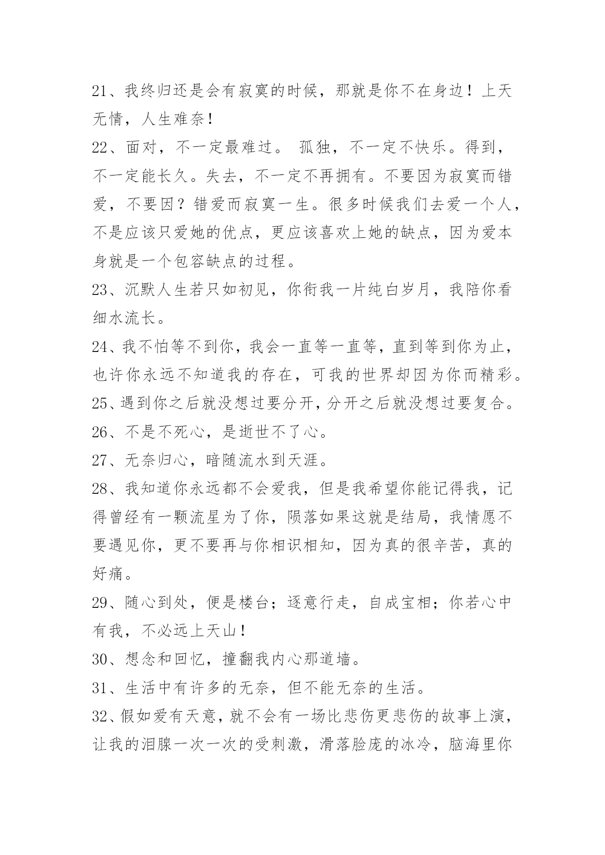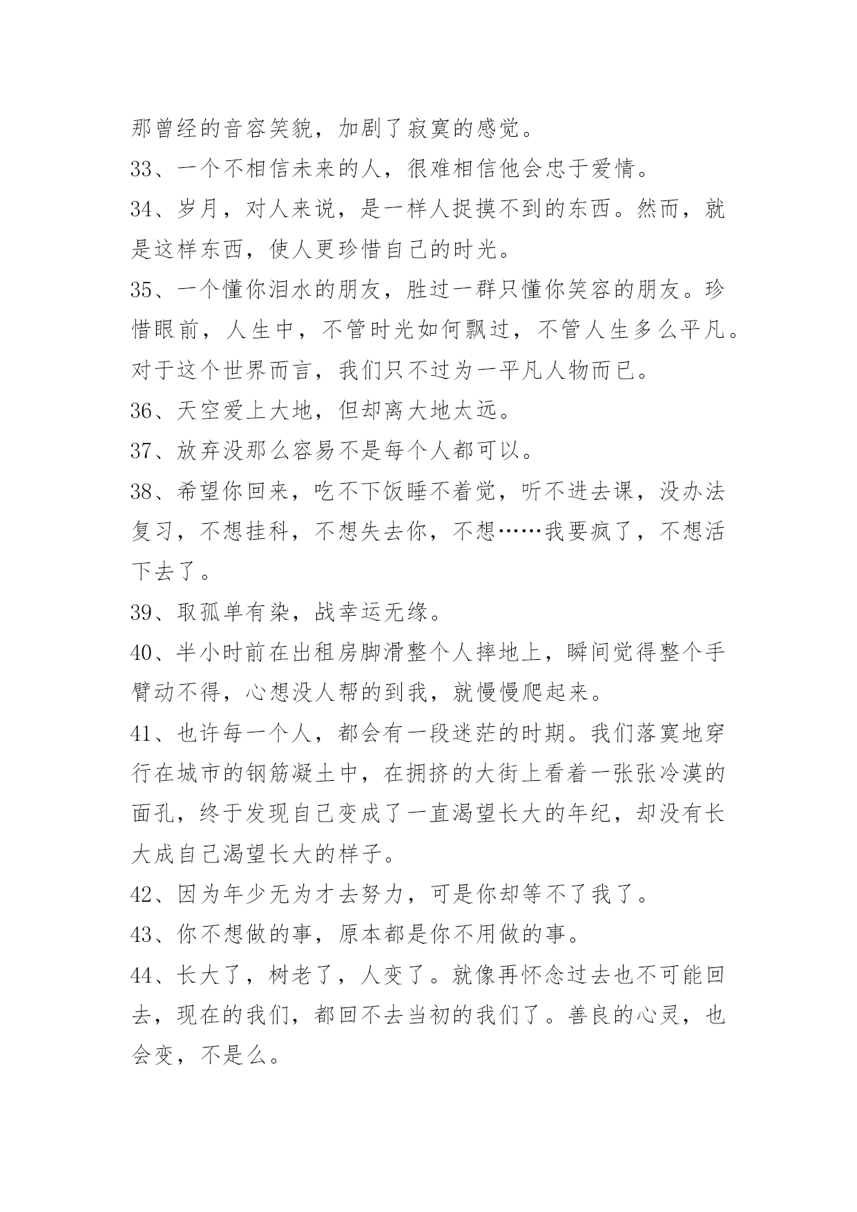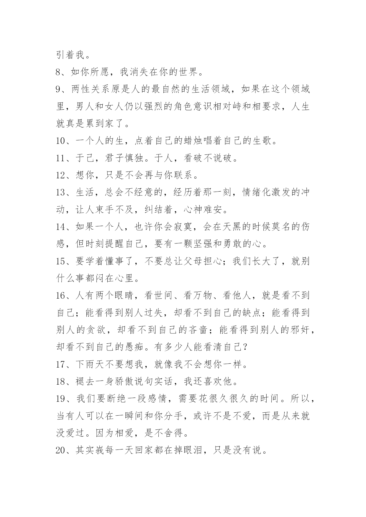 文艺伤感句子48条【推荐】文艺伤感句子48条你会迷路那么我当你的眼,让你觉得安全你的心我才能看得见。以下是小编收集整理的文艺伤感句子48条,欢迎阅读与收藏。1、如人生不曾相遇,我还是我,你依然是你,只是错过了人生较绚丽的奇遇!2、往事再美好,都已经尘封,人生是一种选择,亦是一种放弃。在有的时候我们的放弃,迫于无奈,含泪转身,走远了依旧频频地回望。所以,有些过去,关于幸福或伤痛,就只能深埋心底;有些希冀,关于现在的或将来,只能慢慢遗忘。3、我不想只是让你觉得倍感失落,我不想只是让你觉得爱情是一层厚壳。4、滴落的是眼泪,散裂的是心。5、原来,是我从来就不曾看透。是我从来就不曾明白。6、时光如伤,清泪两行,回忆过往心绪涌动,过往的种种参杂着忧伤的情愫,肆意飞翔,突然间沉默了,我知道,我想你了,亲,你还好吗?7、那是很久以前,也许是前世吧,也是秋风扫落叶的季节。在村外的小河边,一个书生模样的人出现在我的世界里。他不是英俊潇洒,风流倜傥,但是他身上有一种特有的气质吸引着我。8、如你所愿,我消失在你的世界。9、两性关系原是人的最自然的生活领域,如果在这个领域里,男人和女人仍以强烈的角色意识相对峙和相要求,人生就真是累到家了。10、一个人的生,点着自己的蜡烛唱着自己的生歌。11、于己,君子慎独。于人,看破不说破。12、想你,只是不会再与你联系。13、生活,总会不经意的,经历着那一刻,情绪化激发的冲动,让人束手不及,纠结着,心神难安。14、如果一个人,也许你会寂寞,会在天黑的时候莫名的伤感,但时刻提醒自己,要有一颗坚强和勇敢的心。15、要学着懂事了,不要总让父母担心;我们长大了,就别什么事都闷在心里。16、人有两个眼睛,看世间、看万物、看他人,就是看不到自己;能看得到别人过失,却看不到自己的缺点;能看得到别人的贪欲,却看不到自己的吝啬;能看得到别人的邪奸,却看不到自己的愚痴。有多少人能看清自己?17、下雨天不要想我,就像我不会想你一样。18、褪去一身骄傲说句实话,我还喜欢他。19、我们要断绝一段感情,需要花很久很久的时间。所以,当有人可以在一瞬间和你分手,或许不是不爱,而是从来就没爱过。因为相爱,是不舍得。20、其实峩每一天回家都在掉眼泪,只是没有说。21、我终归还是会有寂寞的时候,那就是你不在身边!上天无情,人生难奈!22、面对,不一定最难过。孤独,不一定不快乐。得到,不一定能长久。失去,不一定不再拥有。不要因为寂寞而错爱,不要因?错爱而寂寞一生。很多时候我们去爱一个人,不是应该只爱她的优点,更应该喜欢上她的缺点,因为爱本身就是一个包容缺点的过程。23、沉默人生若只如初见,你衔我一片纯白岁月,我陪你看细水流长。24、我不怕等不到你,我会一直等一直等,直到等到你为止,也许你永远不知道我的存在,可我的世界却因为你而精彩。25、遇到你之后就没想过要分开,分开之后就没想过要复合。26、不是不死心,是逝世不了心。27、无奈归心,暗随流水到天涯。28、我知道你永远都不会爱我,但是我希望你能记得我,记得曾经有一颗流星为了你,陨落如果这就是结局,我情愿不要遇见你,更不要再与你相识相知,因为真的很辛苦,真的好痛。29、随心到处,便是楼台;逐意行走,自成宝相;你若心中有我,不必远上天山!30、想念和回忆,撞翻我内心那道墙。31、生活中有许多的无奈,但不能无奈的生活。32、假如爱有天意,就不会有一场比悲伤更悲伤的故事上演,让我的泪腺一次一次的受刺激,滑落脸庞的冰冷,脑海里你那曾经的音容笑貌,加剧了寂寞的感觉。33、一个不相信未来的人,很难相信他会忠于爱情。34、岁月,对人来说,是一样人捉摸不到的东西。然而,就是这样东西,使人更珍惜自己的时光。35、一个懂你泪水的朋友,胜过一群只懂你笑容的朋友。珍惜眼前,人生中,不管时光如何飘过,不管人生多么平凡。对于这个世界而言,我们只不过为一平凡人物而已。36、天空爱上大地,但却离大地太远。37、放弃没那么容易不是每个人都可以。38、希望你回来,吃不下饭睡不着觉,听不进去课,没办法复习,不想挂科,不想失去你,不想……我要疯了,不想活下去了。39、取孤单有染,战幸运无缘。40、半小时前在出租房脚滑整个人摔地上,瞬间觉得整个手臂动不得,心想没人帮的到我,就慢慢爬起来。41、也许每一个人,都会有一段迷茫的时期。我们落寞地穿行在城市的钢筋凝土中,在拥挤的大街上看着一张张冷漠的面孔,终于发现自己变成了一直渴望长大的年纪,却没有长大成自己渴望长大的样子。42、因为年少无为才去努力,可是你却等不了我了。43、你不想做的事,原本都是你不用做的事。44、长大了,树老了,人变了。就像再怀念过去也不可能回去,现在的我们,都回不去当初的我们了。善良的心灵,也会变,不是么。45、有没有这样一种人,被爱伤的遍体鳞伤,却还希望爱的那个他比自己过的的幸福