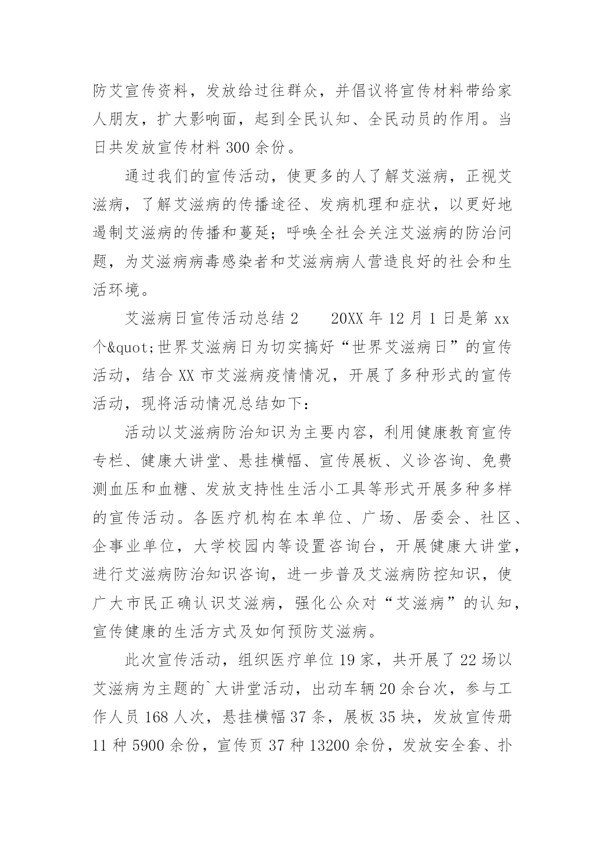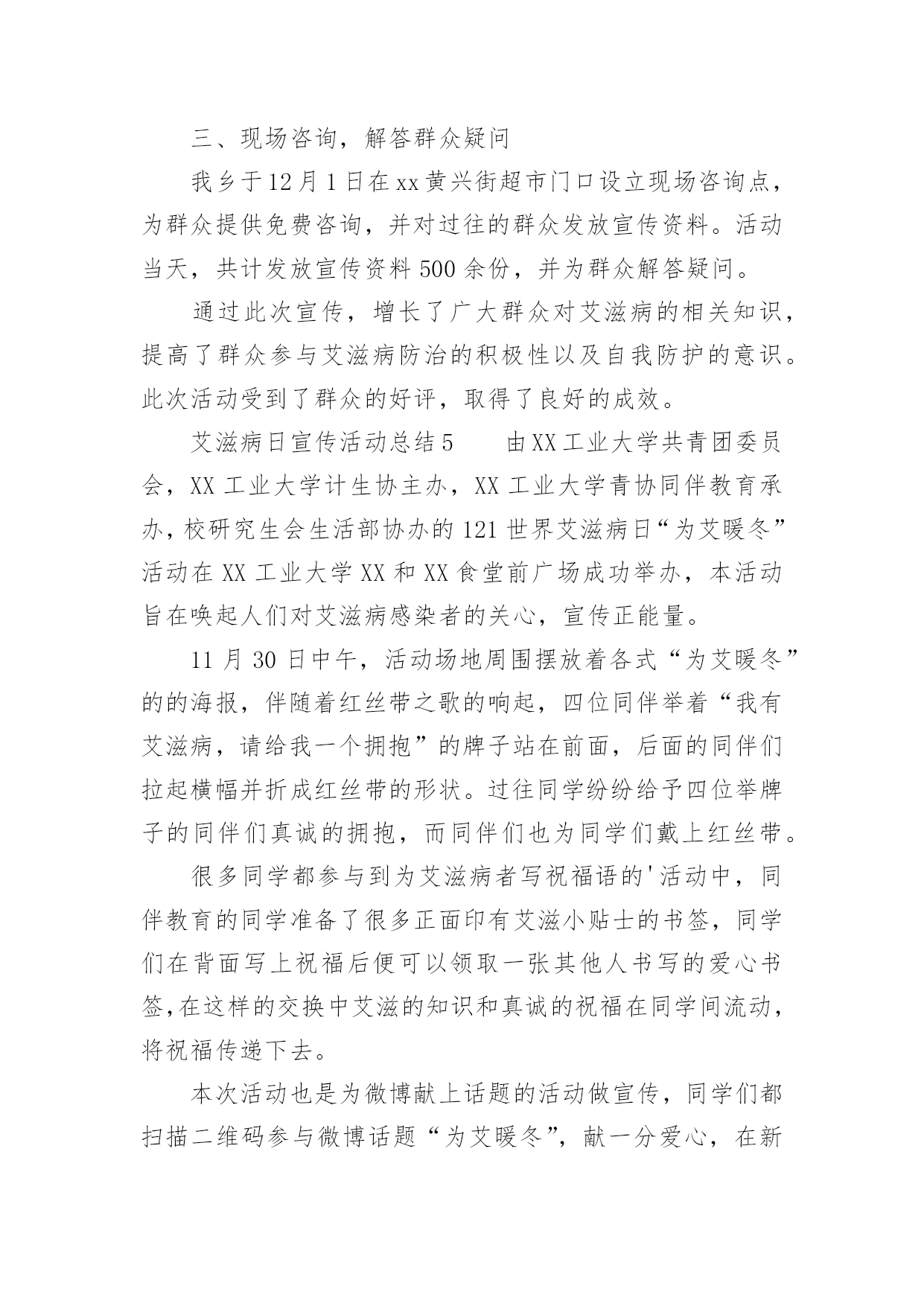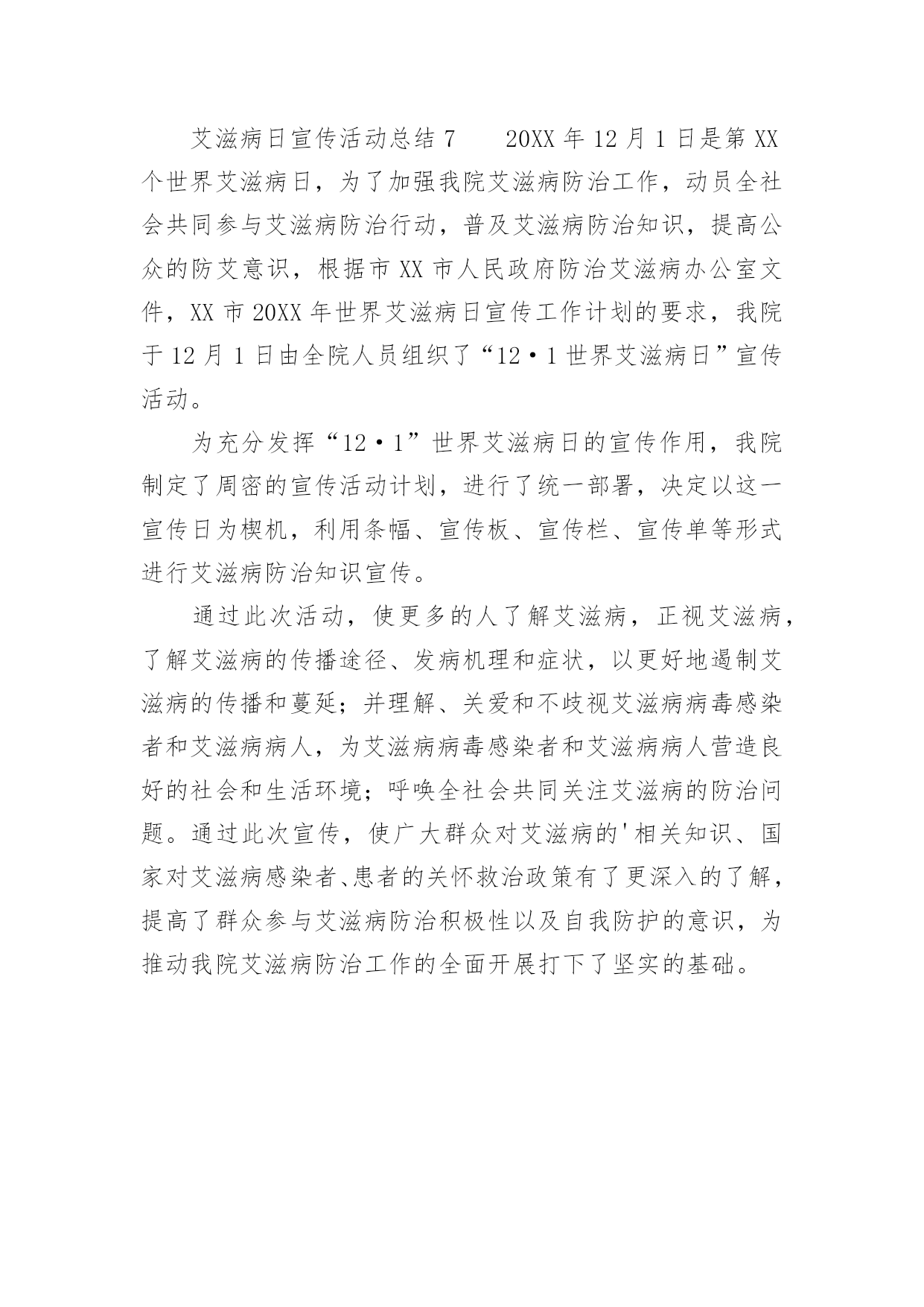艾滋病日宣传活动总结2021年艾滋病日宣传活动总结范文(精选7篇)不经意间,一个有意义的活动又告一段落了,我们一定都增加了不少生阅历,这时候写一份活动总结就很重要了。一起来参考活动总结是怎么写的吧,以下是小编收集整理的2021年艾滋病日宣传活动总结范文(精选7篇),欢迎阅读,希望大家能够喜欢。艾滋病日宣传活动总结1在上级部门的指导和院领导的统一部署下,围绕20XX年世界艾滋病日的主题,我院于12月1日前后开展了一系列的防艾宣传活动,现总结如下:一、突出主题宣传,增强群众意识我院于11月29日至12月1日在院门诊部门口电子屏幕上频繁滚动播出20XX年世界艾滋病日的主题,全面预防,使广大群众能够一目了然、加深印象。二、组织专家义诊,广泛开展咨询12月1日组织输血科、感染科、预防保健科专家在门诊部门口开展义诊活动,宣传防艾知识和艾滋病免费检测。引导大众科学正确的'了解艾滋病,认识艾滋病,消除恐艾心理。接受群众咨询200余次。三、发放宣传材料,扩大影响层面12月1日在义诊台、医院各健康教育资料取阅点摆放有防艾宣传资料,发放给过往群众,并倡议将宣传材料带给家人朋友,扩大影响面,起到全民认知、全民动员的作用。当日共发放宣传材料300余份。通过我们的宣传活动,使更多的人了解艾滋病,正视艾滋病,了解艾滋病的传播途径、发病机理和症状,以更好地遏制艾滋病的传播和蔓延;呼唤全社会关注艾滋病的防治问题,为艾滋病病毒感染者和艾滋病病人营造良好的社会和生活环境。艾滋病日宣传活动总结220XX年12月1日是第xx个"世界艾滋病日为切实搞好“世界艾滋病日”的宣传活动,结合XX市艾滋病疫情情况,开展了多种形式的宣传活动,现将活动情况总结如下:活动以艾滋病防治知识为主要内容,利用健康教育宣传专栏、健康大讲堂、悬挂横幅、宣传展板、义诊咨询、免费测血压和血糖、发放支持性生活小工具等形式开展多种多样的宣传活动。各医疗机构在本单位、广场、居委会、社区、企事业单位,大学校园内等设置咨询台,开展健康大讲堂,进行艾滋病防治知识咨询,进一步普及艾滋病防控知识,使广大市民正确认识艾滋病,强化公众对“艾滋病”的认知,宣传健康的生活方式及如何预防艾滋病。此次宣传活动,组织医疗单位19家,共开展了22场以艾滋病为主题的`大讲堂活动,出动车辆20余台次,参与工作人员168人次,悬挂横幅37条,展板35块,发放宣传册11种5900余份,宣传页37种13200余份,发放安全套、扑克牌、工具袋等支持性工具300余套,参与咨询人数260余人,免费测量血压380余人、血糖230余人,投入资金8240元。通过以上多种形式的宣传活动,让更多的人了解到艾滋病对健康的危害,掌握预防知识,消除对艾滋病患者的歧视,为艾滋病防治工作创造良好的社会环境。艾滋病日宣传活动总结3一、领导重视,认真组织(1)通过讲座、宣传、发放资料等,让市民了解艾滋病的传播途径和非传播途径、预防方法、流行现状等,提高市民预防艾滋病的意识。(2)区疾病控制中心对区直机关干部、社区卫生服务机构负责人、街道、居委会进行一次艾滋病防治知识讲座,使市民重视安全性行为在防治艾滋病方面的.重要性,进一步推行政府部门关于百分之百安全套的防艾政策。(3)根据宣传活动需要各社区卫生服务站至少制作一块宣传展板,其中,综合医院另需制作横幅一条,并准备500份以上宣传材料。每个村卫生室出办一期艾滋病防治宣传板报。二、宣传活动开展情况以“四免一关怀”、艾滋病防病基本知识等为主要内容,分别以宣传展板、悬挂横幅、散发宣传单,设立咨询服务台等方式,广泛开展宣传咨询活动,各乡镇卫生院、村卫生室重点开展了对农村地区群众的宣传,各社区卫生服务站、个体诊所等也分别以宣传栏、黑板报、张贴宣传画,宣传单等方式,深入社区开展宣传活动。活动期间,市卫生局副局长薛惠祥同志和市卫生局相关部门同志在区政府副区长钱士超同志和区卫生局严星根局长的陪同下分别到各宣传站点巡视和督查,并亲自散发宣传单,向群众宣传艾滋病防治知识。艾滋病日宣传活动总结4为改变我乡群众对艾滋病认识上的观念和提高对艾滋病防治意识,普及艾滋病防治知识,激励群众养成健康良好的生活方式,在迎来第xx个世界艾滋病日之际,我乡紧紧围绕以“行动起来,向“零”艾滋迈进”为主题开展宣传活动。现将本次活动的情况汇总如下:一、领导重视在接到上级通知后,我乡党委、政府组织召开专题会议,成立了由乡政府主要领导担任组长,分管卫生工作的党委委员任副组长,宣传、综治、司法、妇联、团委、卫生院、中小学校等相关单位为成员的防治艾滋病宣传教育工作领导小组,并对开展XX年世界艾滋病日宣传工作做周密安排。根据今年的.世界艾滋病日宣传口号制作了宣传横幅,内容为“遏制艾滋,履行承诺”。以鲜明的主题,开展了此次宣传活动。二、宣传形式多样化利用宣传栏、流动
