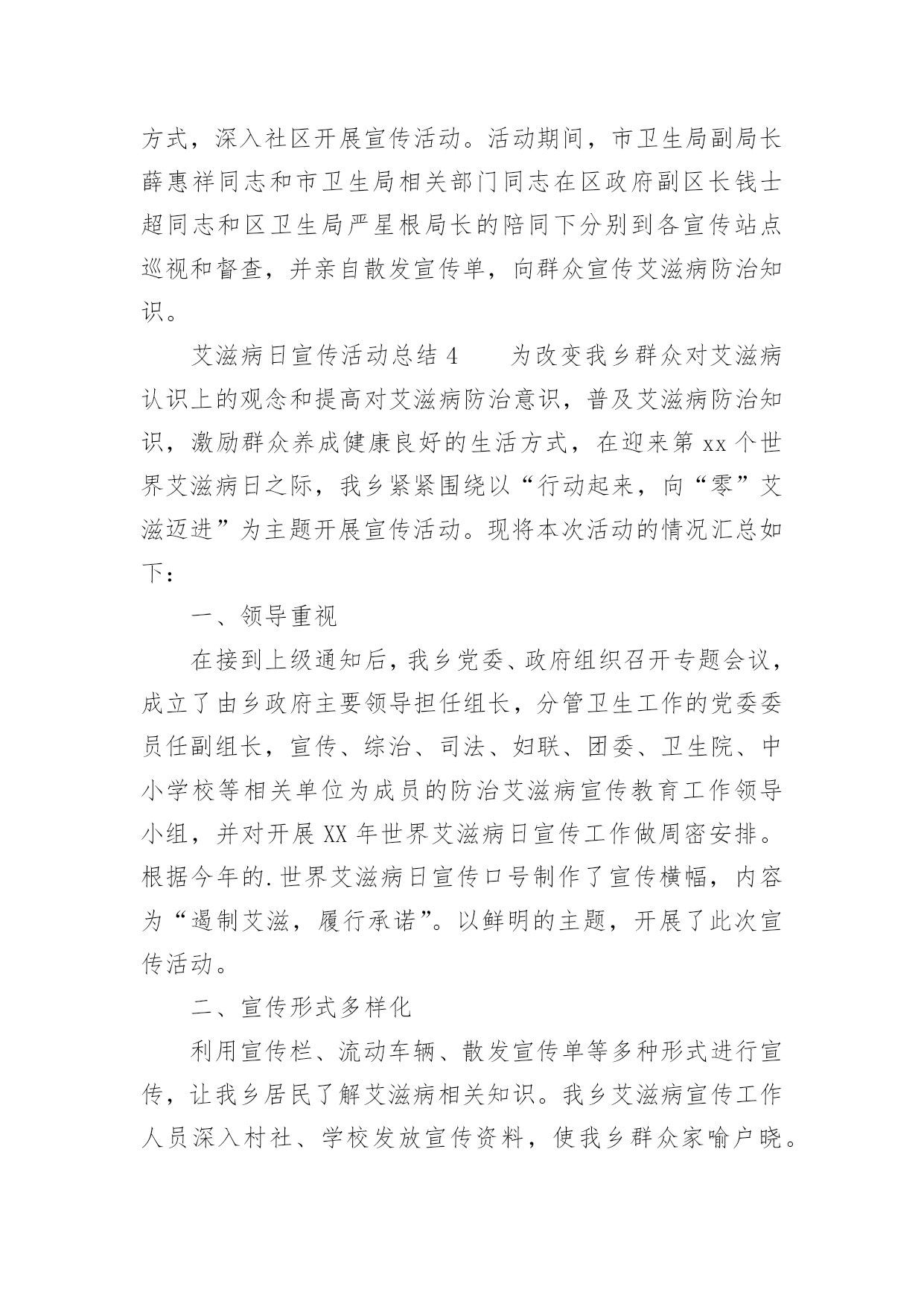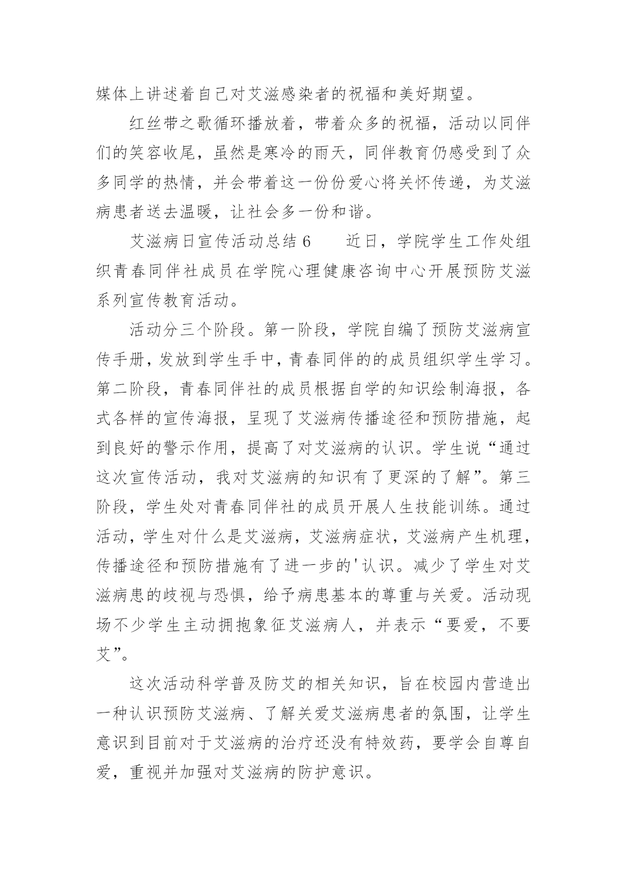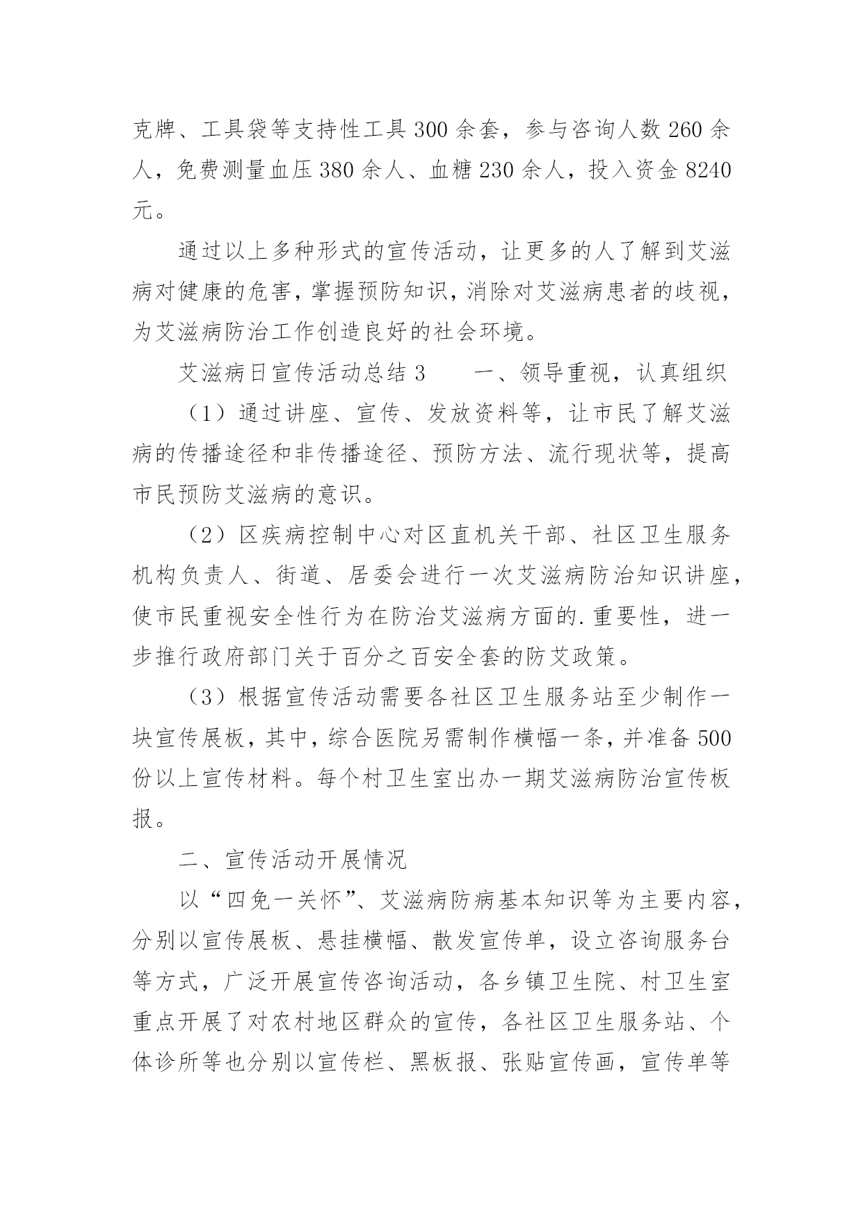 艾滋病日宣传活动总结2021年艾滋病日宣传活动总结范文(精选7篇)不经意间,一个有意义的活动又告一段落了,我们一定都增加了不少生阅历,这时候写一份活动总结就很重要了。一起来参考活动总结是怎么写的吧,以下是小编收集整理的2021年艾滋病日宣传活动总结范文(精选7篇),欢迎阅读,希望大家能够喜欢。艾滋病日宣传活动总结1在上级部门的指导和院领导的统一部署下,围绕20XX年世界艾滋病日的主题,我院于12月1日前后开展了一系列的防艾宣传活动,现总结如下:一、突出主题宣传,增强群众意识我院于11月29日至12月1日在院门诊部门口电子屏幕上频繁滚动播出20XX年世界艾滋病日的主题,全面预防,使广大群众能够一目了然、加深印象。二、组织专家义诊,广泛开展咨询12月1日组织输血科、感染科、预防保健科专家在门诊部门口开展义诊活动,宣传防艾知识和艾滋病免费检测。引导大众科学正确的'了解艾滋病,认识艾滋病,消除恐艾心理。接受群众咨询200余次。三、发放宣传材料,扩大影响层面12月1日在义诊台、医院各健康教育资料取阅点摆放有防艾宣传资料,发放给过往群众,并倡议将宣传材料带给家人朋友,扩大影响面,起到全民认知、全民动员的作用。当日共发放宣传材料300余份。通过我们的宣传活动,使更多的人了解艾滋病,正视艾滋病,了解艾滋病的传播途径、发病机理和症状,以更好地遏制艾滋病的传播和蔓延;呼唤全社会关注艾滋病的防治问题,为艾滋病病毒感染者和艾滋病病人营造良好的社会和生活环境。艾滋病日宣传活动总结220XX年12月1日是第xx个"世界艾滋病日为切实搞好“世界艾滋病日”的宣传活动,结合XX市艾滋病疫情情况,开展了多种形式的宣传活动,现将活动情况总结如下:活动以艾滋病防治知识为主要内容,利用健康教育宣传专栏、健康大讲堂、悬挂横幅、宣传展板、义诊咨询、免费测血压和血糖、发放支持性生活小工具等形式开展多种多样的宣传活动。各医疗机构在本单位、广场、居委会、社区、企事业单位,大学校园内等设置咨询台,开展健康大讲堂,进行艾滋病防治知识咨询,进一步普及艾滋病防控知识,使广大市民正确认识艾滋病,强化公众对“艾滋病”的认知,宣传健康的生活方式及如何预防艾滋病。此次宣传活动,组织医疗单位19家,共开展了22场以艾滋病为主题的`大讲堂活动,出动车辆20余台次,参与工作人员168人次,悬挂横幅37条,展板35块,发放宣传册11种5900余份,宣传页37种13200余份,发放安全套、扑克牌、工具袋等支持性工具300余套,参与咨询人数260余人,免费测量血压380余人、血糖230余人,投入资金8240元。通过以上多种形式的宣传活动,让更多的人了解到艾滋病对健康的危害,掌握预防知识,消除对艾滋病患者的歧视,为艾滋病防治工作创造良好的社会环境。艾滋病日宣传活动总结3一、领导重视,认真组织(1)通过讲座、宣传、发放资料等,让市民了解艾滋病的传播途径和非传播途径、预防方法、流行现状等,提高市民预防艾滋病的意识。(2)区疾病控制中心对区直机关干部、社区卫生服务机构负责人、街道、居委会进行一次艾滋病防治知识讲座,使市民重视安全性行为在防治艾滋病方面的.重要性,进一步推行政府部门关于百分之百安全套的防艾政策。(3)根据宣传活动需要各社区卫生服务站至少制作一块宣传展板,其中,综合医院另需制作横幅一条,并准备500份以上宣传材料。每个村卫生室出办一期艾滋病防治宣传板报。二、宣传活动开展情况以“四免一关怀”、艾滋病防病基本知识等为主要内容,分别以宣传展板、悬挂横幅、散发宣传单,设立咨询服务台等方式,广泛开展宣传咨询活动,各乡镇卫生院、村卫生室重点开展了对农村地区群众的宣传,各社区卫生服务站、个体诊所等也分别以宣传栏、黑板报、张贴宣传画,宣传单等方式,深入社区开展宣传活动。活动期间,市卫生局副局长薛惠祥同志和市卫生局相关部门同志在区政府副区长钱士超同志和区卫生局严星根局长的陪同下分别到各宣传站点巡视和督查,并亲自散发宣传单,向群众宣传艾滋病防治知识。艾滋病日宣传活动总结4为改变我乡群众对艾滋病认识上的观念和提高对艾滋病防治意识,普及艾滋病防治知识,激励群众养成健康良好的生活方式,在迎来第xx个世界艾滋病日之际,我乡紧紧围绕以“行动起来,向“零”艾滋迈进”为主题开展宣传活动。现将本次活动的情况汇总如下:一、领导重视在接到上级通知后,我乡党委、政府组织召开专题会议,成立了由乡政府主要领导担任组长,分管卫生工作的党委委员任副组长,宣传、综治、司法、妇联、团委、卫生院、中小学校等相关单位为成员的防治艾滋病宣传教育工作领导小组,并对开展XX年世界艾滋病日宣传工作做周密安排。根据今年的.世界艾滋病日宣传口号制作了宣传横幅,内容为“遏制艾滋,履行承诺”。以鲜明的主题,开展了此次宣传活动。二、宣传形式多样化利用宣传栏、流动