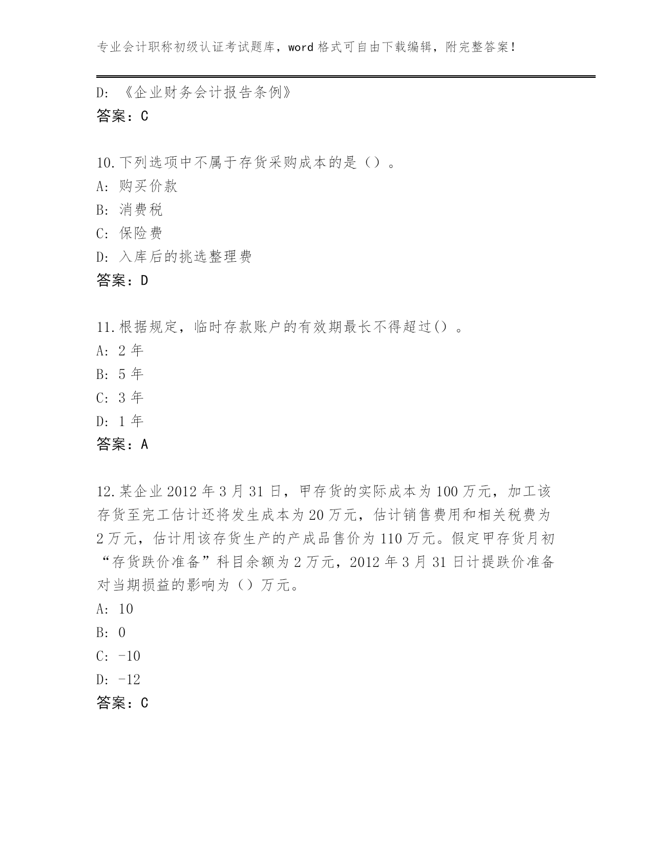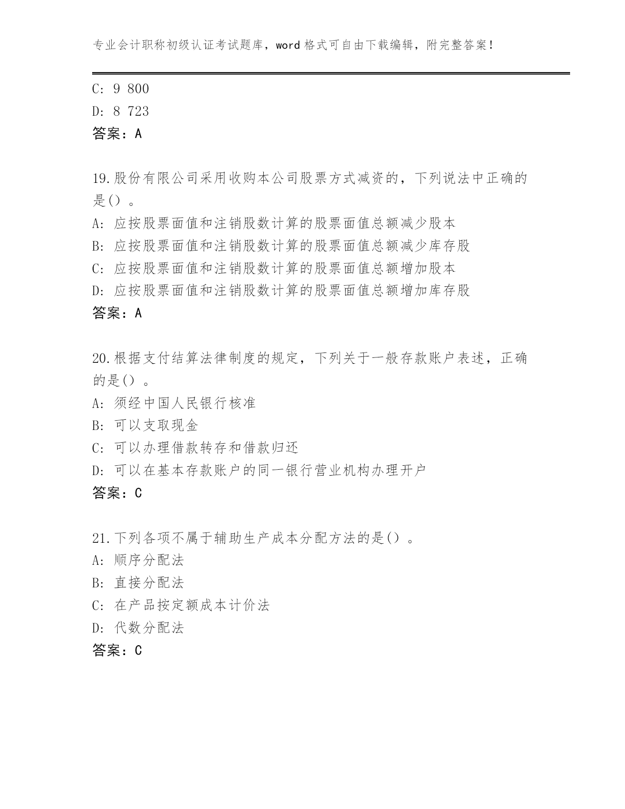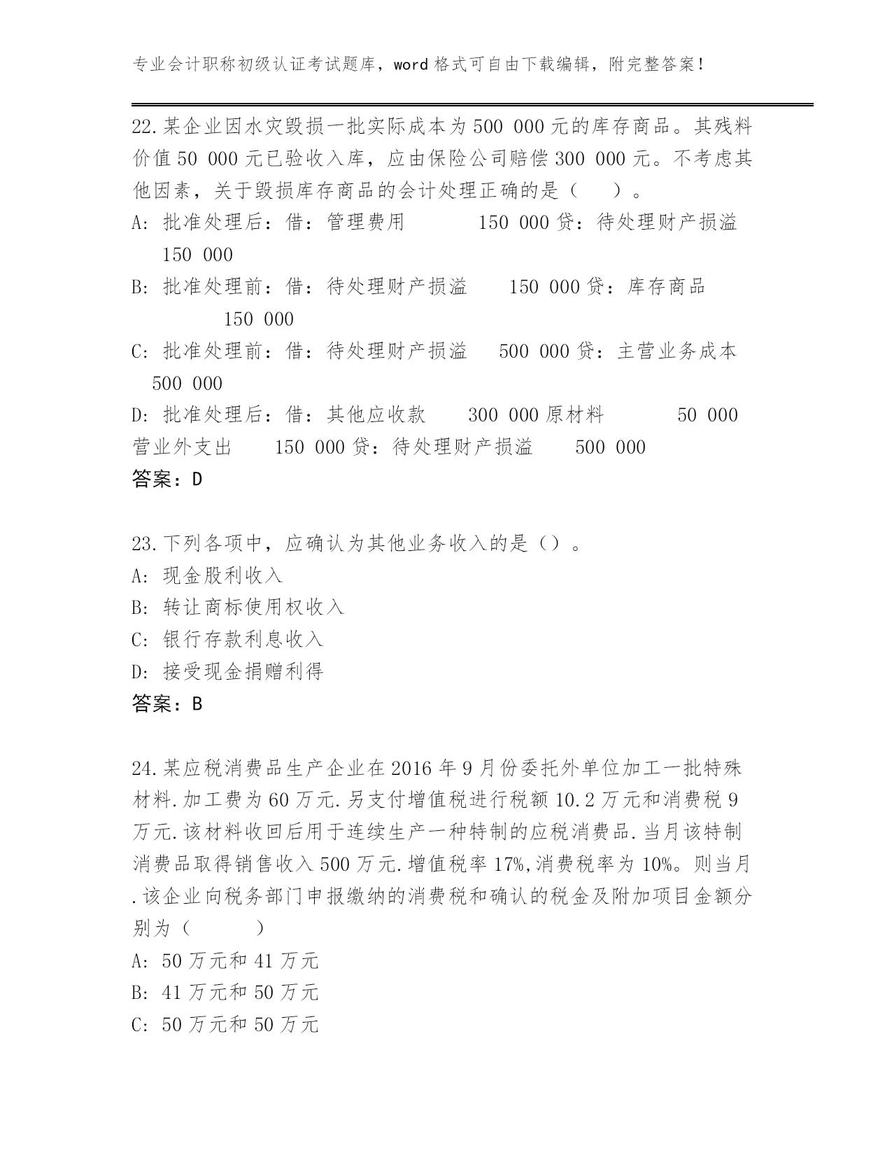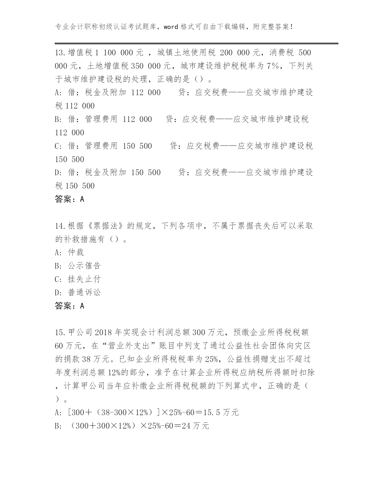 2023-2024年湖北省东西湖区会计职称初级认证考试王牌题库(培优).docx